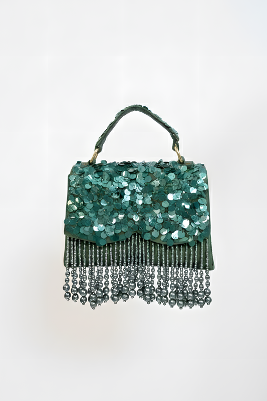 Handcrafted mirror-work bag with sequins and a curved silhouette,gives a luxury feel with its designer...