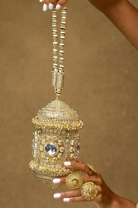 This dazzling crystal potli is a true statement piece, featuring an intricate mosaic of oversized...