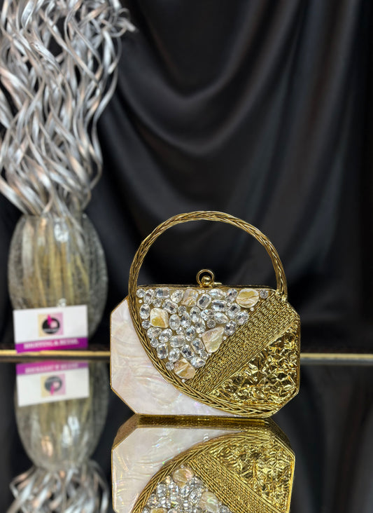 An elegant brass, mother-of-pearl clutch with a chain, embellished with shimmering crystals and sea stones....