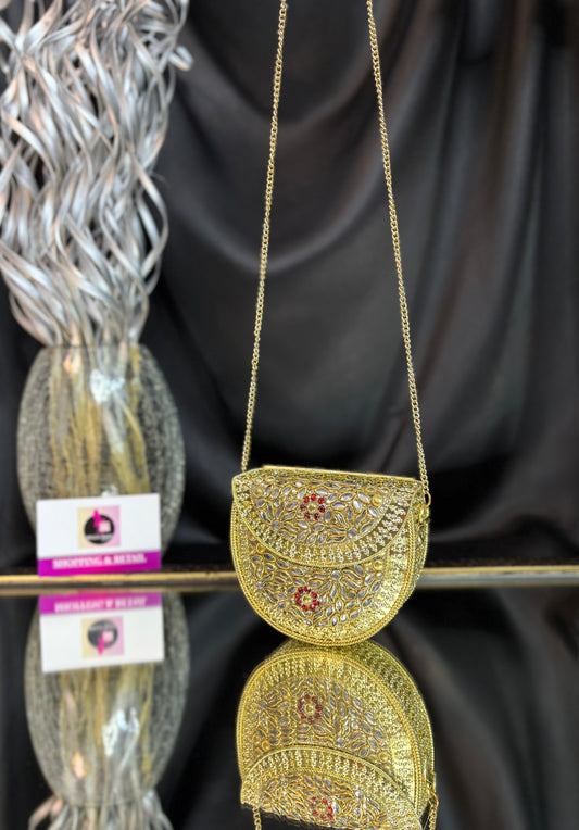 A stunning handcrafted Kundan clutch featuring intricate detailing in gold metalwork, embellished with dazzling white...