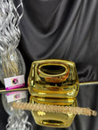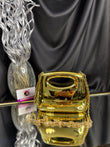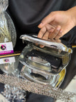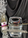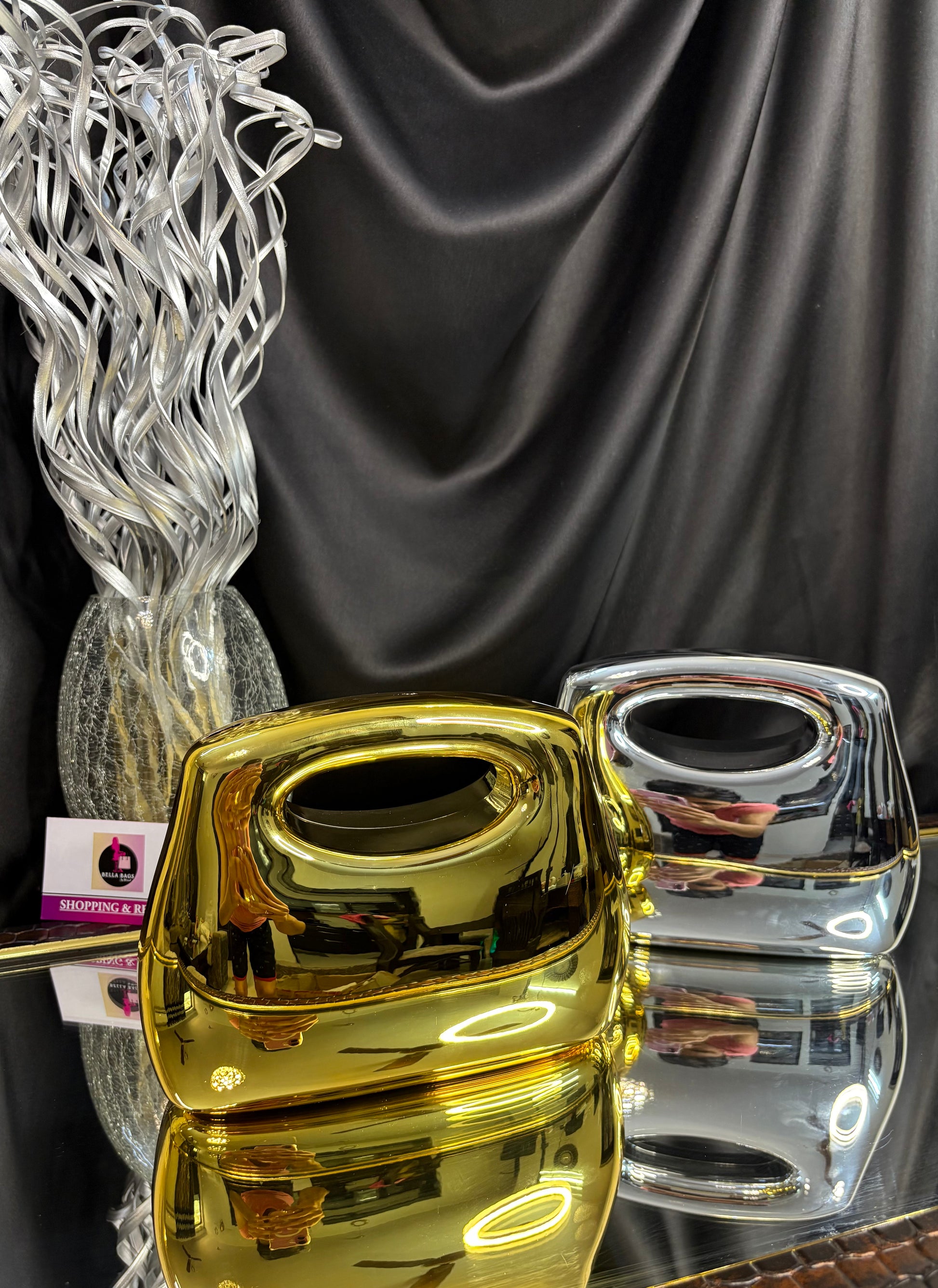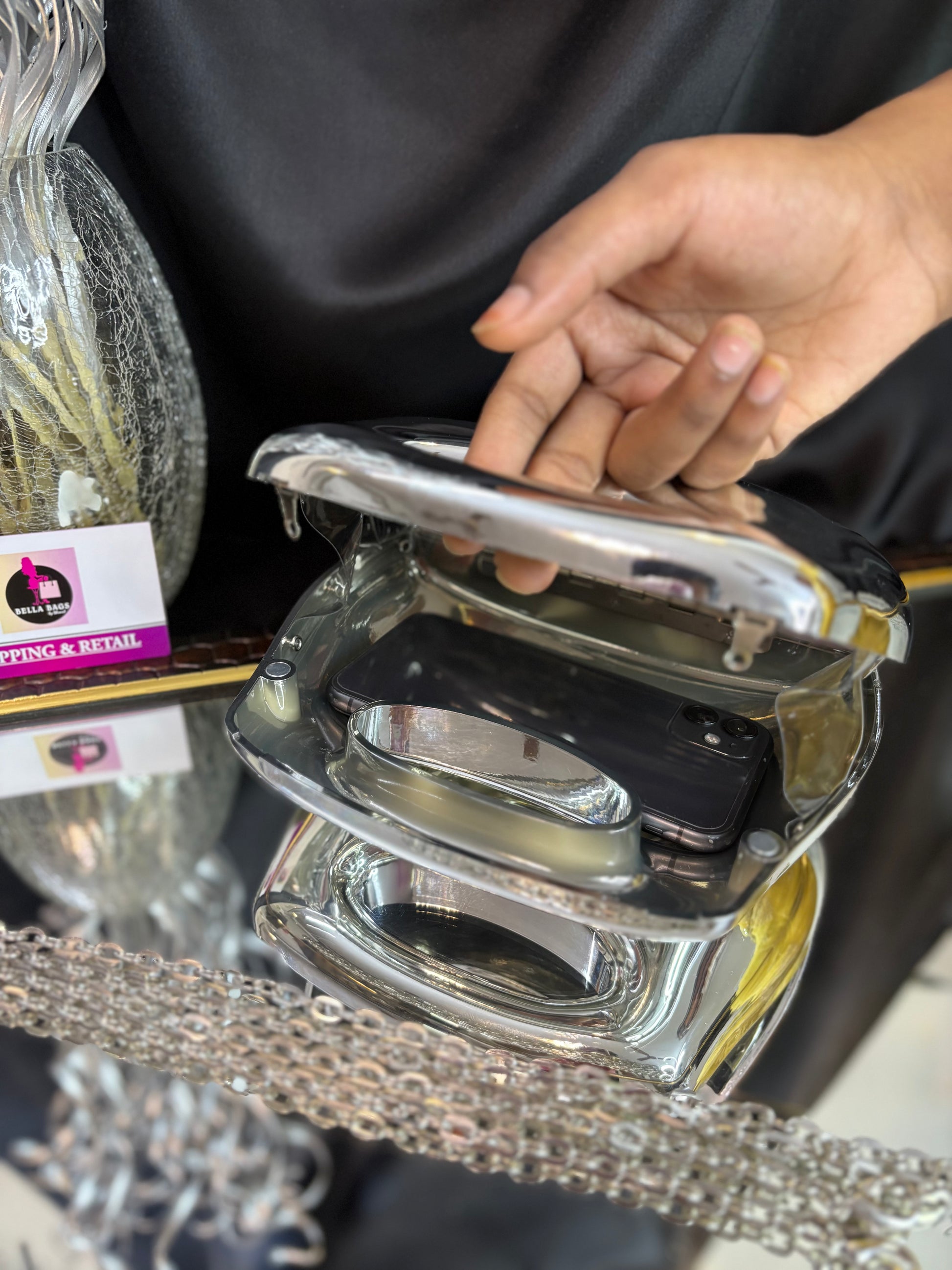 Make a bold statement with this ultra-modern acrylic clutch, featuring a high-shine metallic finish. With its sculptural shape and built-in handle, this bag blends futuristic style with chic minimalism, perfect for fashion-forward events and evening glamour. Outer Material: acrylic. Phone Capacity: Phone will fit in (iPhone 11 shown). Sling: comes with a sling chain. Closure: magnetic enclosure. Pocket: No Pocket. Care Instructions: Keep it in a protective space when not in use and keep it away from moisture. Carry delicately!
