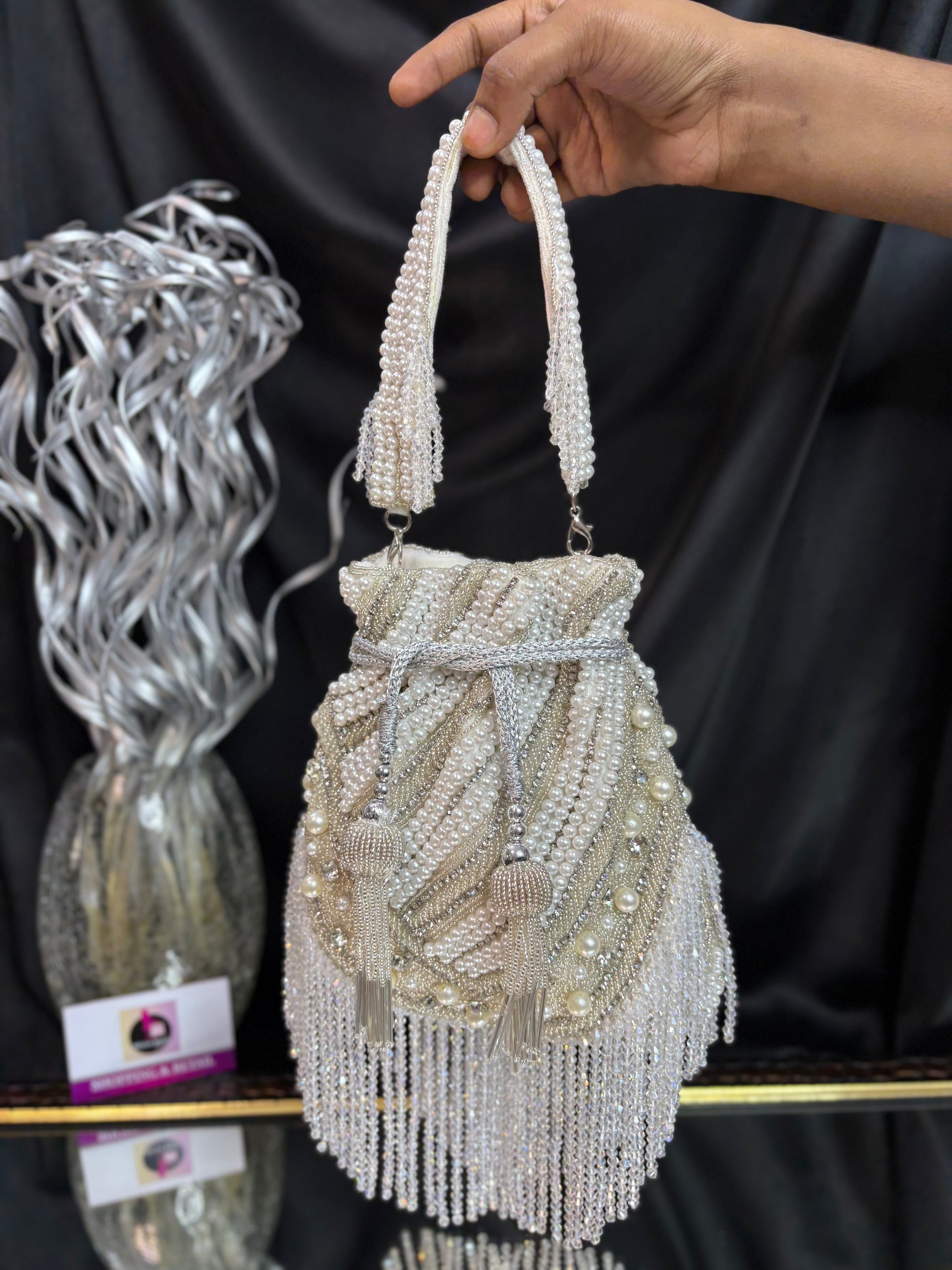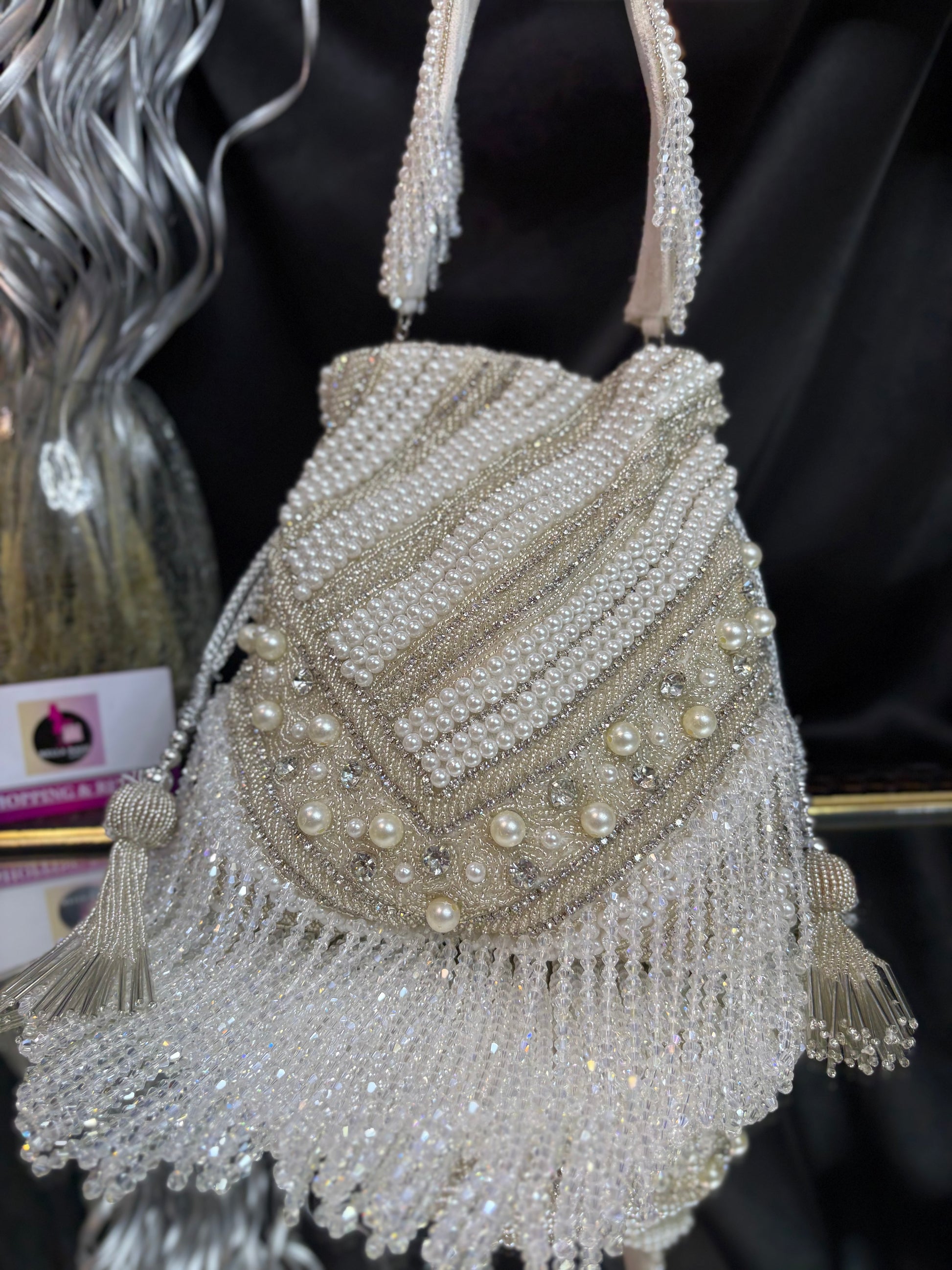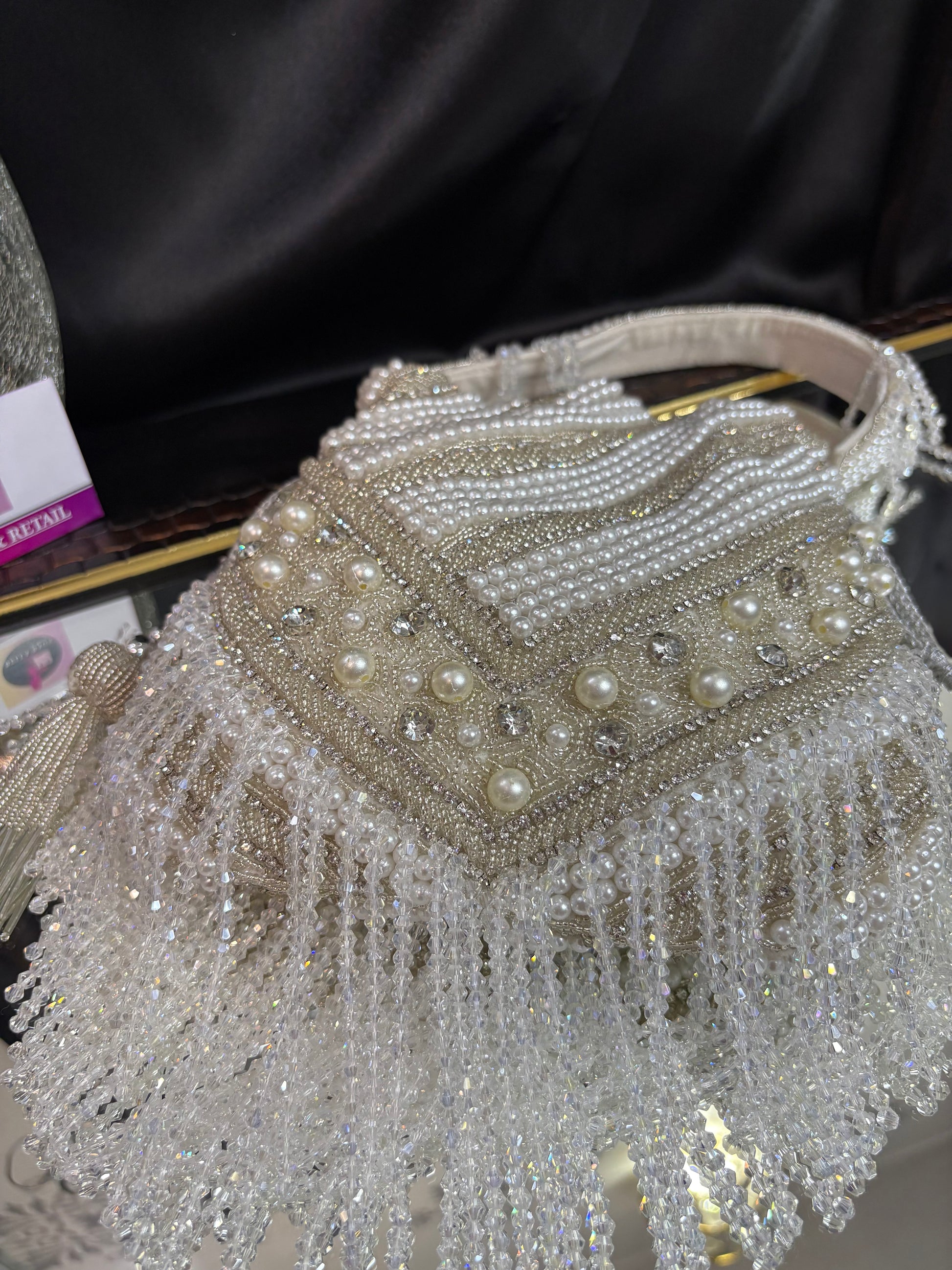 This is a stunning handcrafted pearl and bead potli bag, featuring intricate wave-like beadwork in silver and white. The body is adorned with elegant pearl embellishments and crystals, giving it a rich, regal look. The fringed bottom and pearl-wrapped handle add a touch of vintage glamour, making it a perfect accessory for weddings, festive occasions, or traditional events. outer material: pearl,crystal and beadwork. Phone Capacity: Phone will fit in. Sling: Comes with a detachable handle. Closure: Drawstrings. Pocket: No Pocket. Care Instructions: Keep it in a protective space when not in use and keep it away from moisture. Carry delicately!