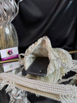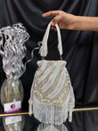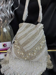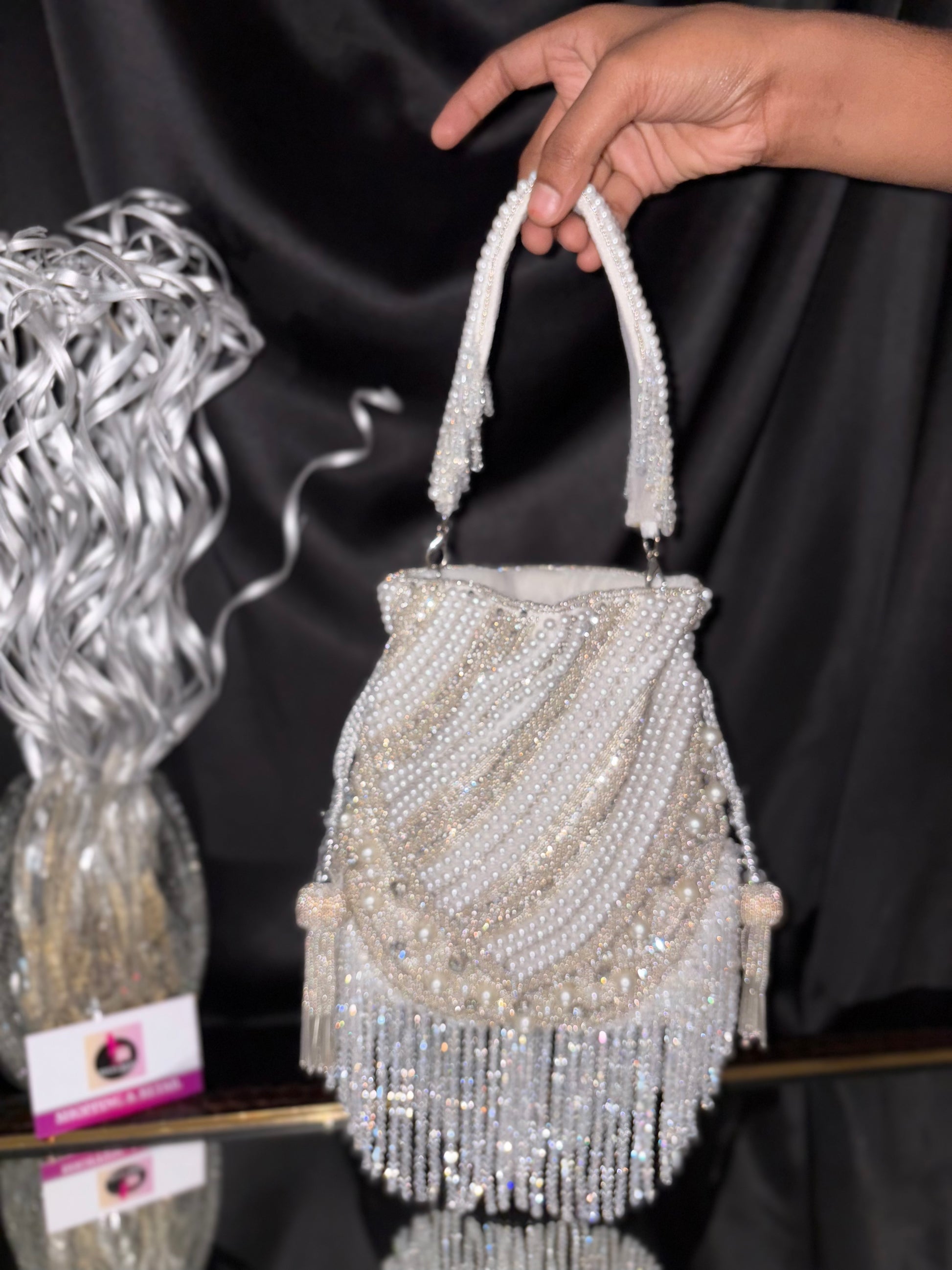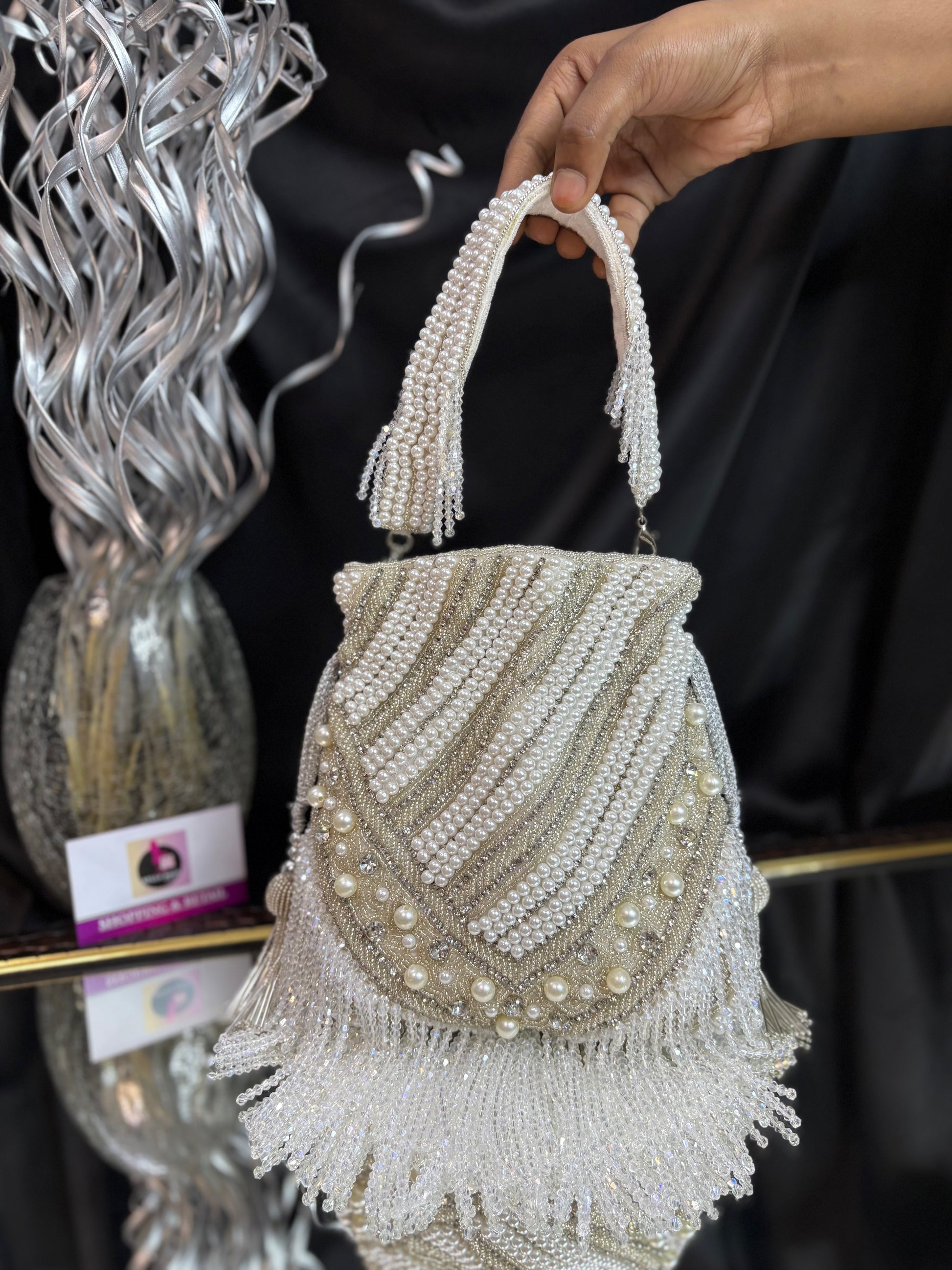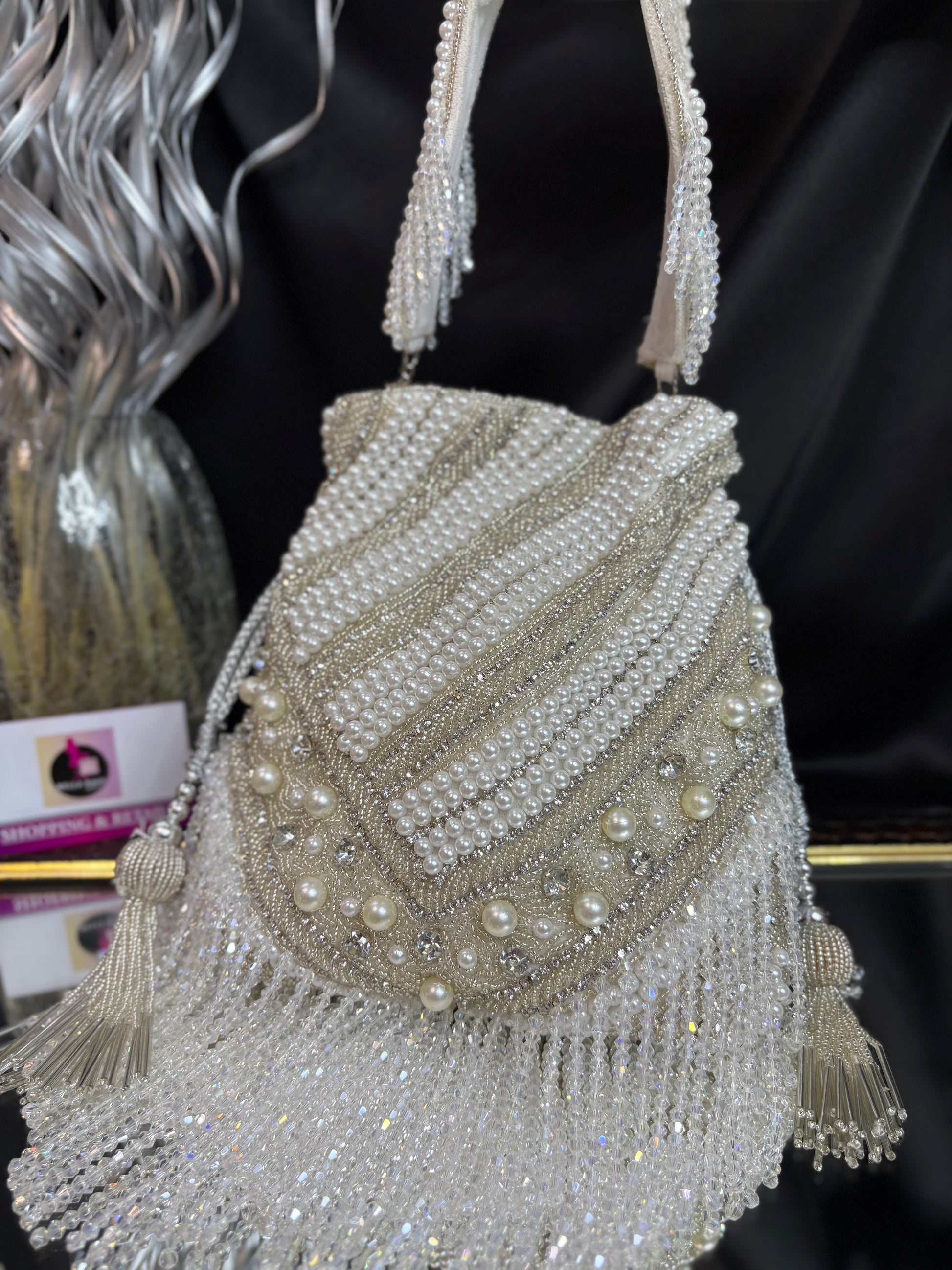 This is a stunning handcrafted pearl and bead potli bag, featuring intricate wave-like beadwork in silver and white. The body is adorned with elegant pearl embellishments and crystals, giving it a rich, regal look. The fringed bottom and pearl-wrapped handle add a touch of vintage glamour, making it a perfect accessory for weddings, festive occasions, or traditional events. outer material: pearl,crystal and beadwork. Phone Capacity: Phone will fit in. Sling: Comes with a detachable handle. Closure: Drawstrings. Pocket: No Pocket. Care Instructions: Keep it in a protective space when not in use and keep it away from moisture. Carry delicately!