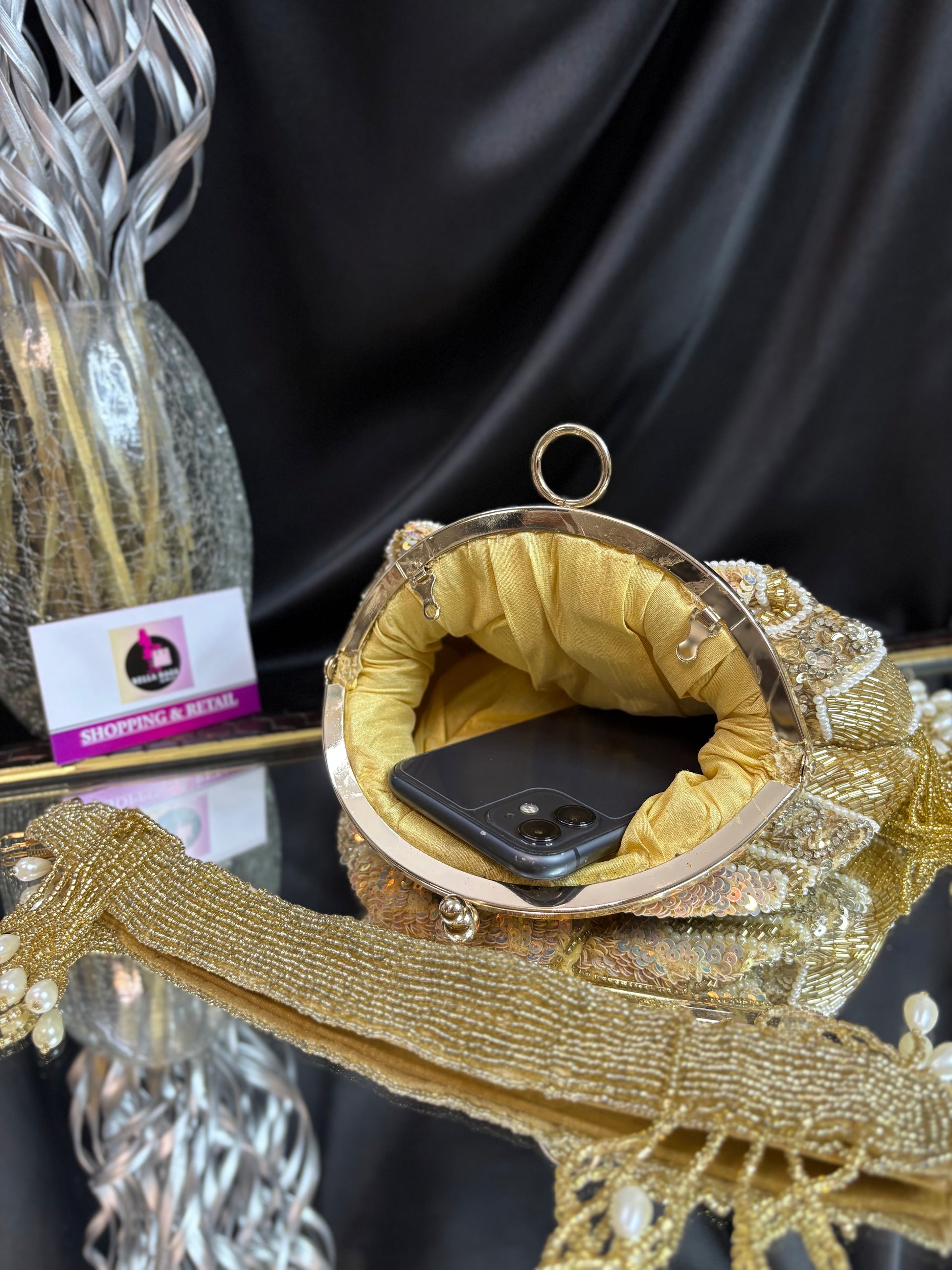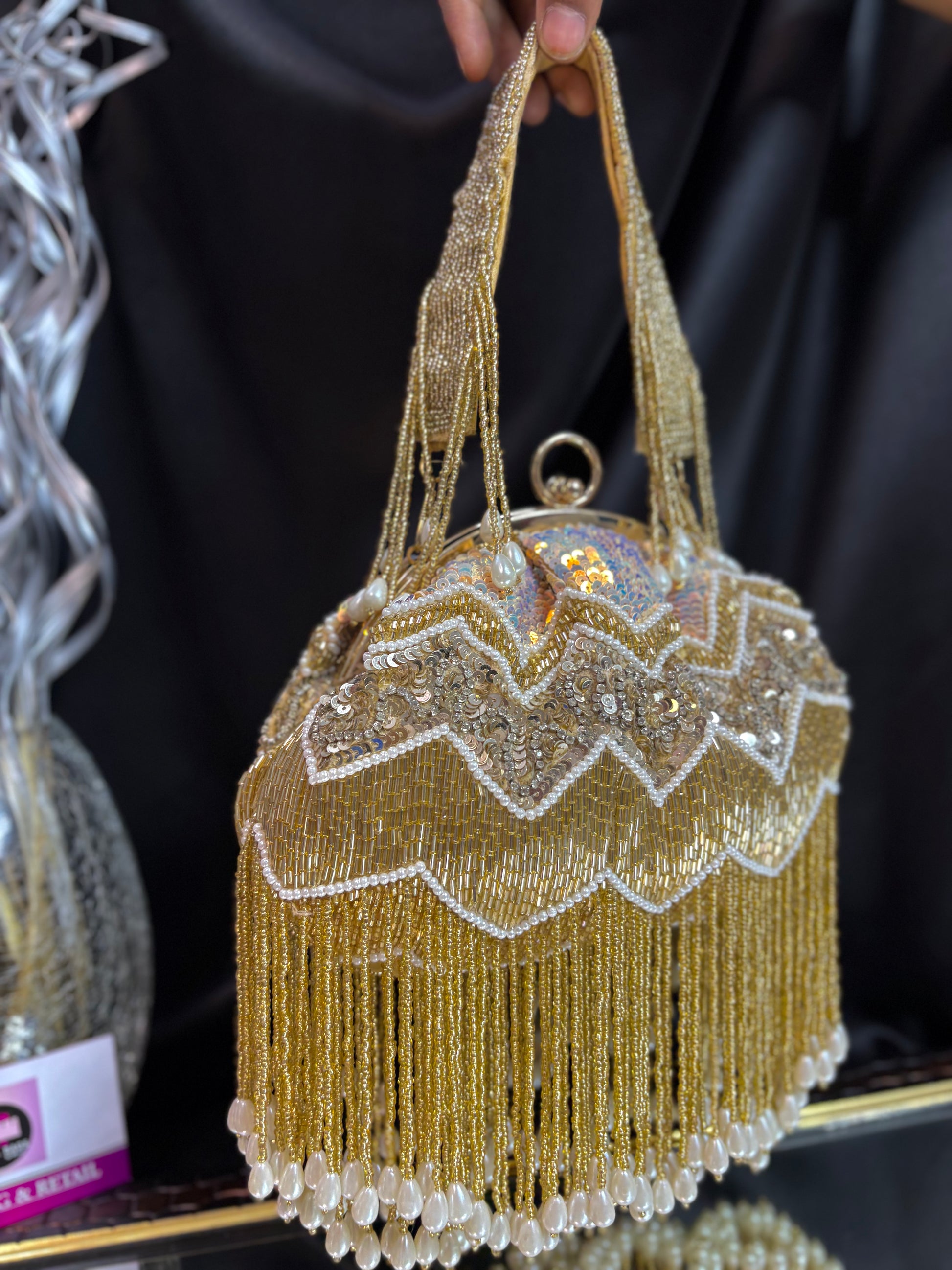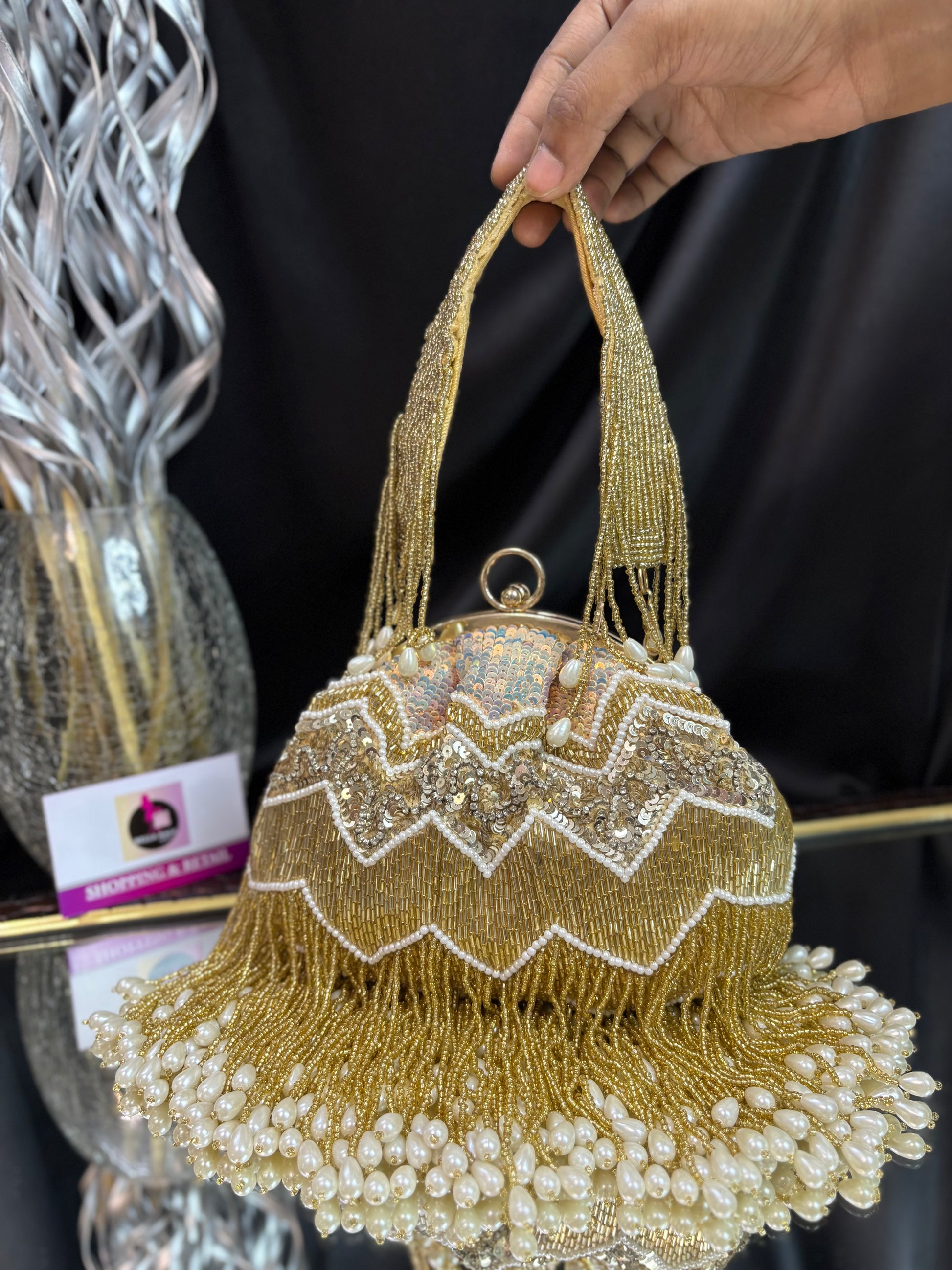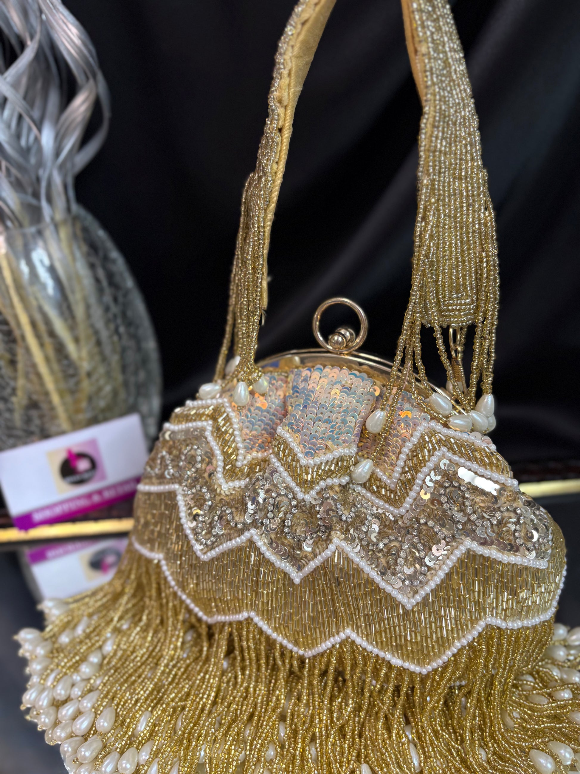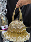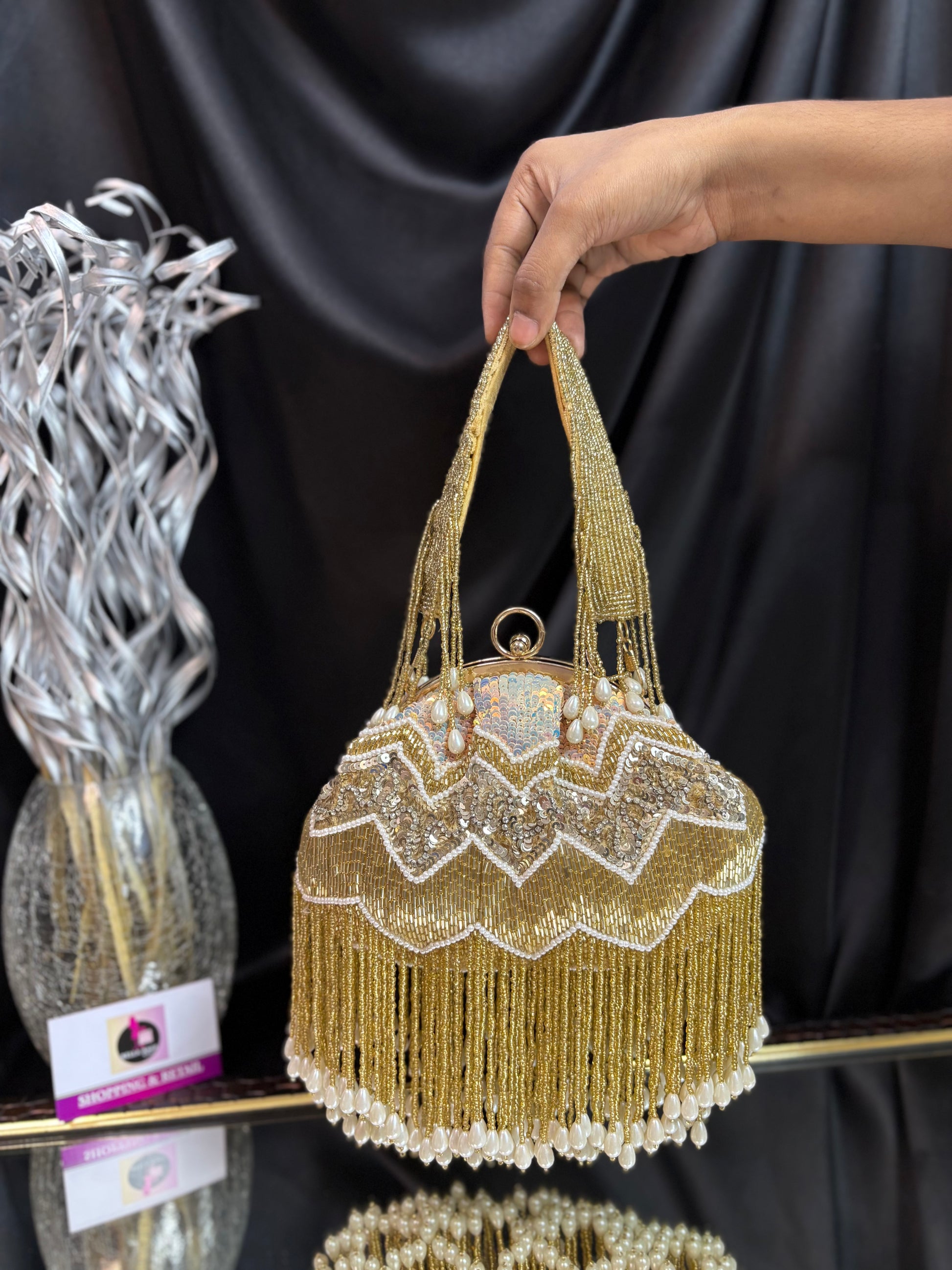 This glamorous batua exudes vintage charm with its sequin and bead embroidery in elegant zigzag patterns. Adorned with layers of fringe and pearl drops, it features a beaded handle and a touch of shimmer-perfect for sangeet nights, receptions, or cocktail soirées. Outer Material: pearls, beads,sequin and cutdana work. Phone Capacity: Phone will fit in (iPhone 11 shown). Sling: Comes with a detachable handle. Closure: Lock enclosure. Pocket: No Pocket. Care Instructions: Keep it in a protective space when not in use and keep it away from moisture. Carry delicately!