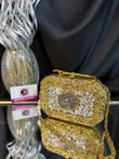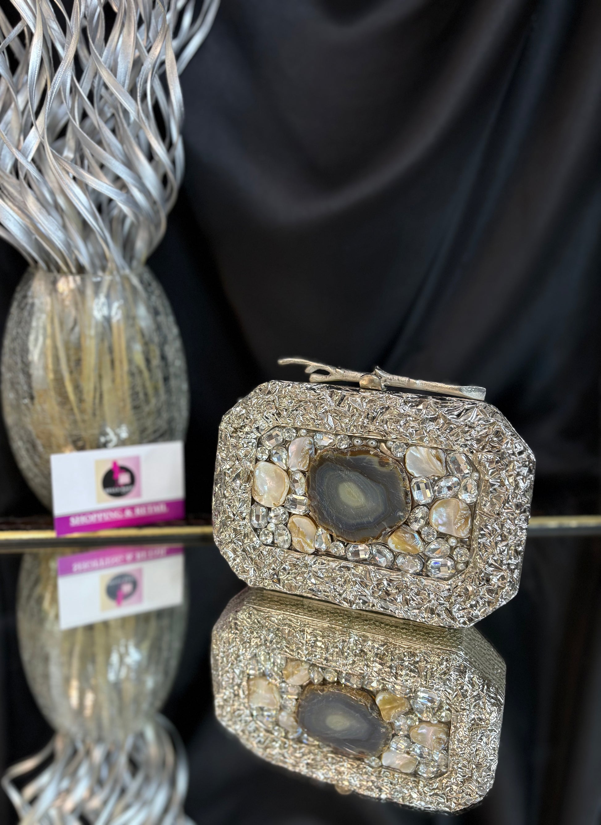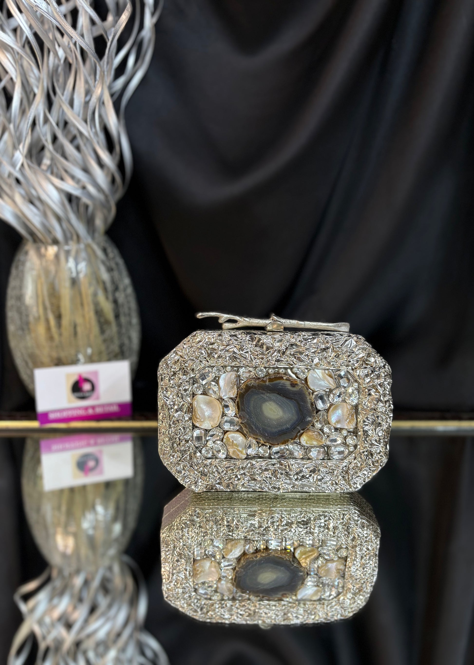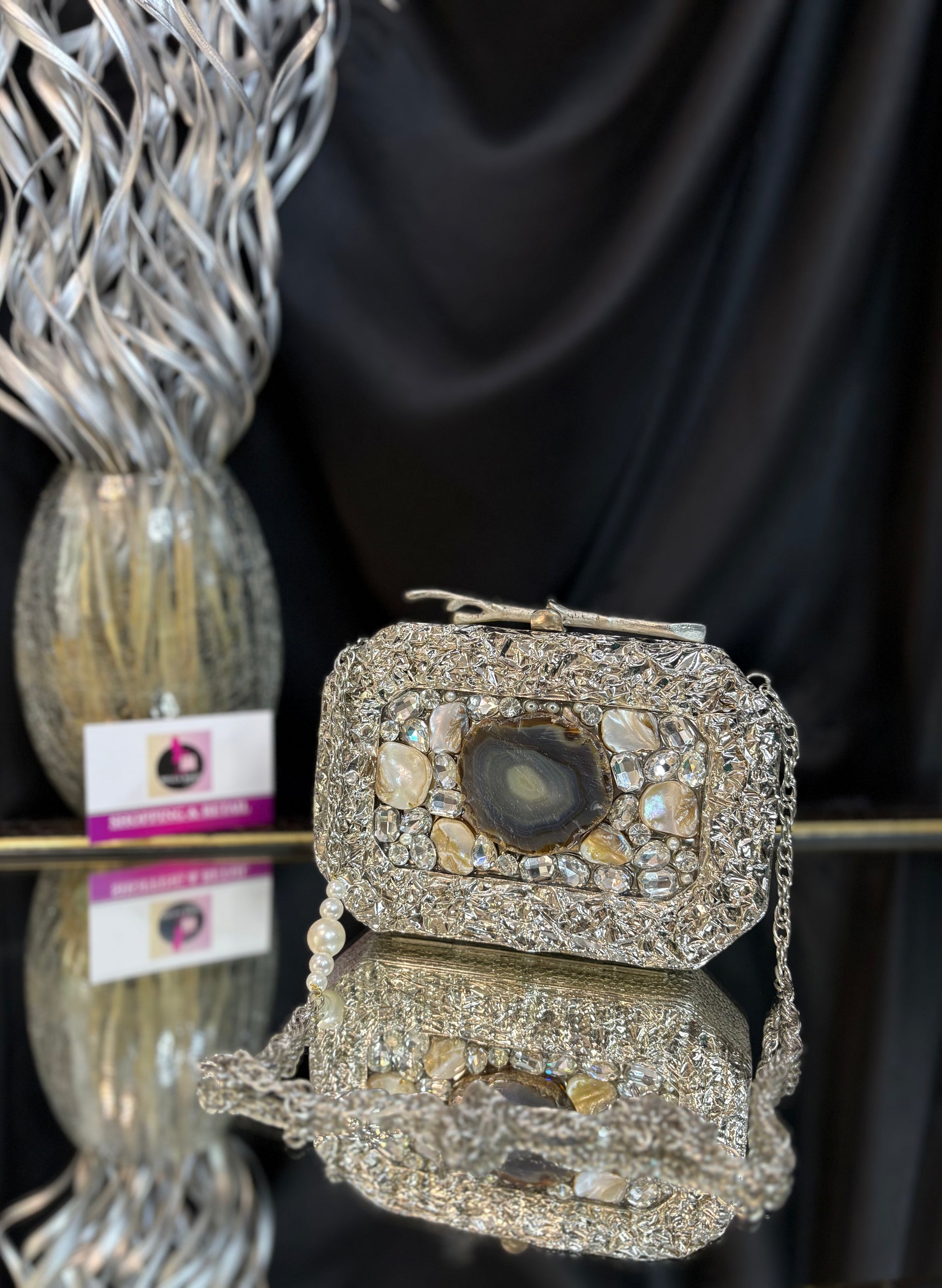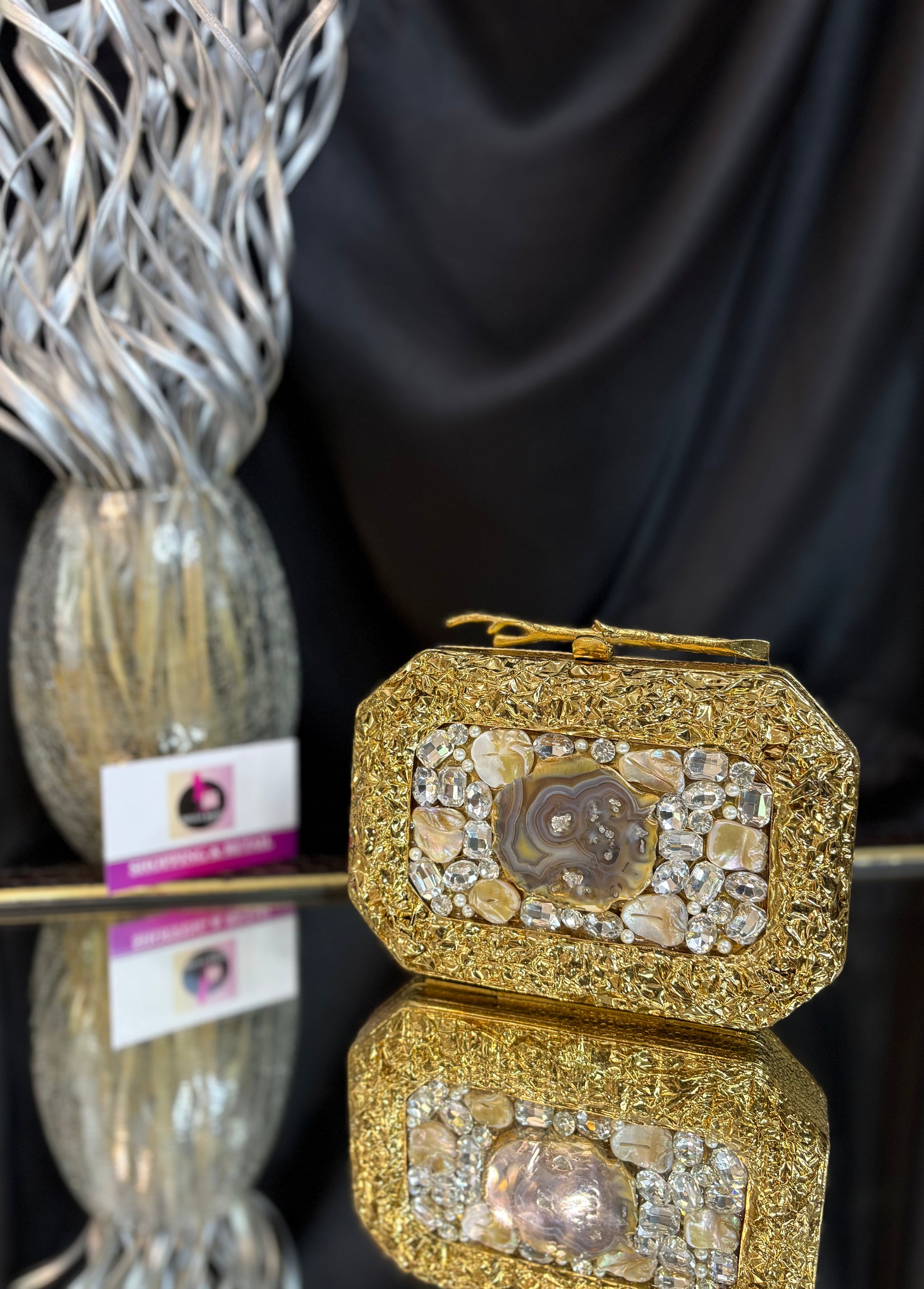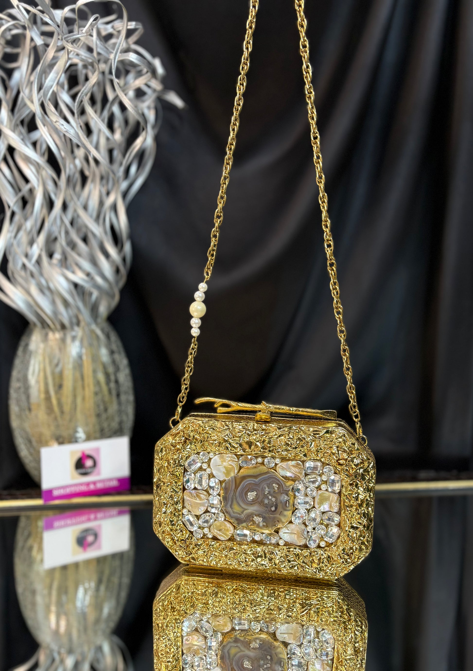 An elegant brass, mother-of-pearl clutch with a chain, embellished with shimmering crystals and sea stones. A statement stone in the middle, also featuring a luxurious handle finish.