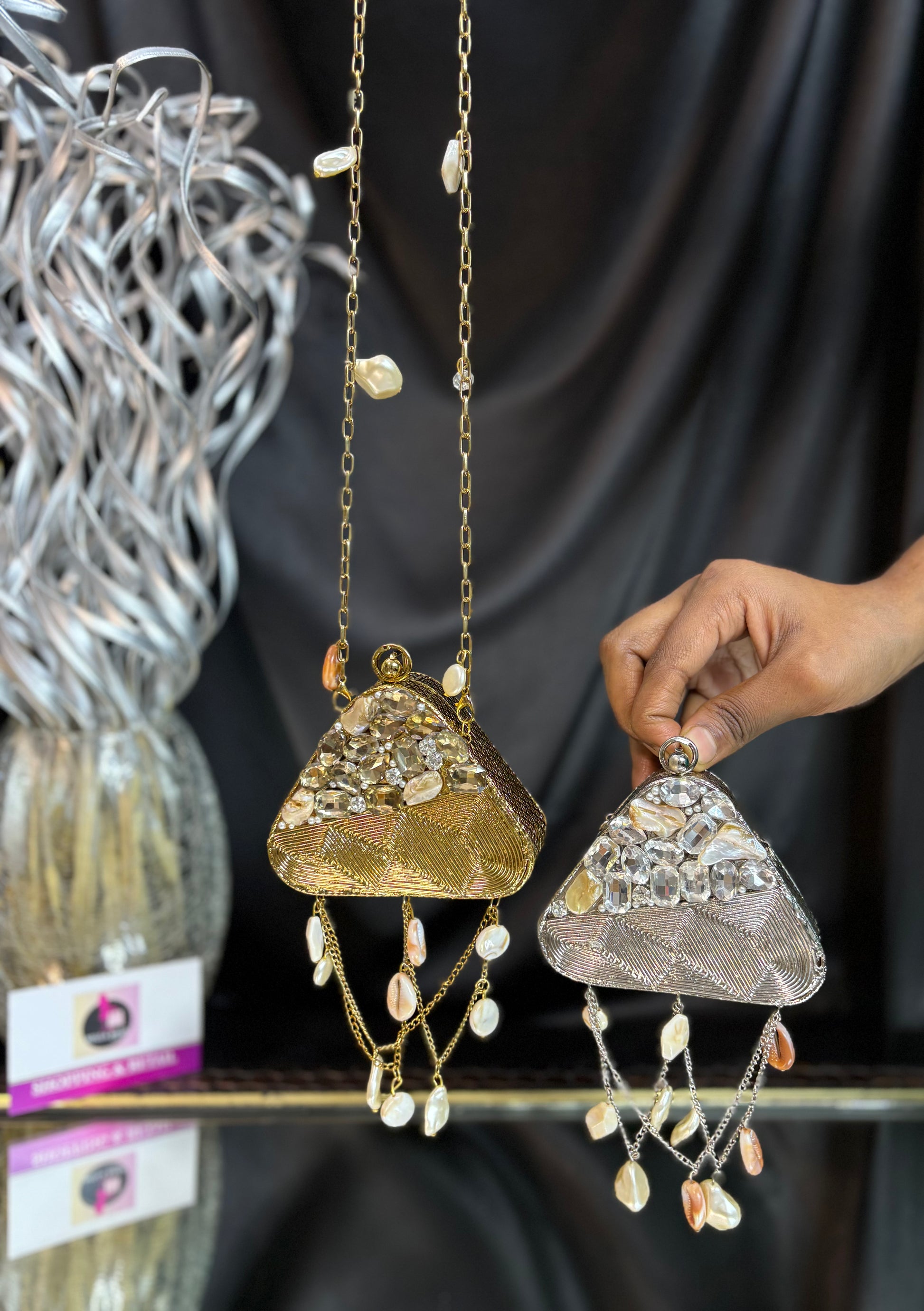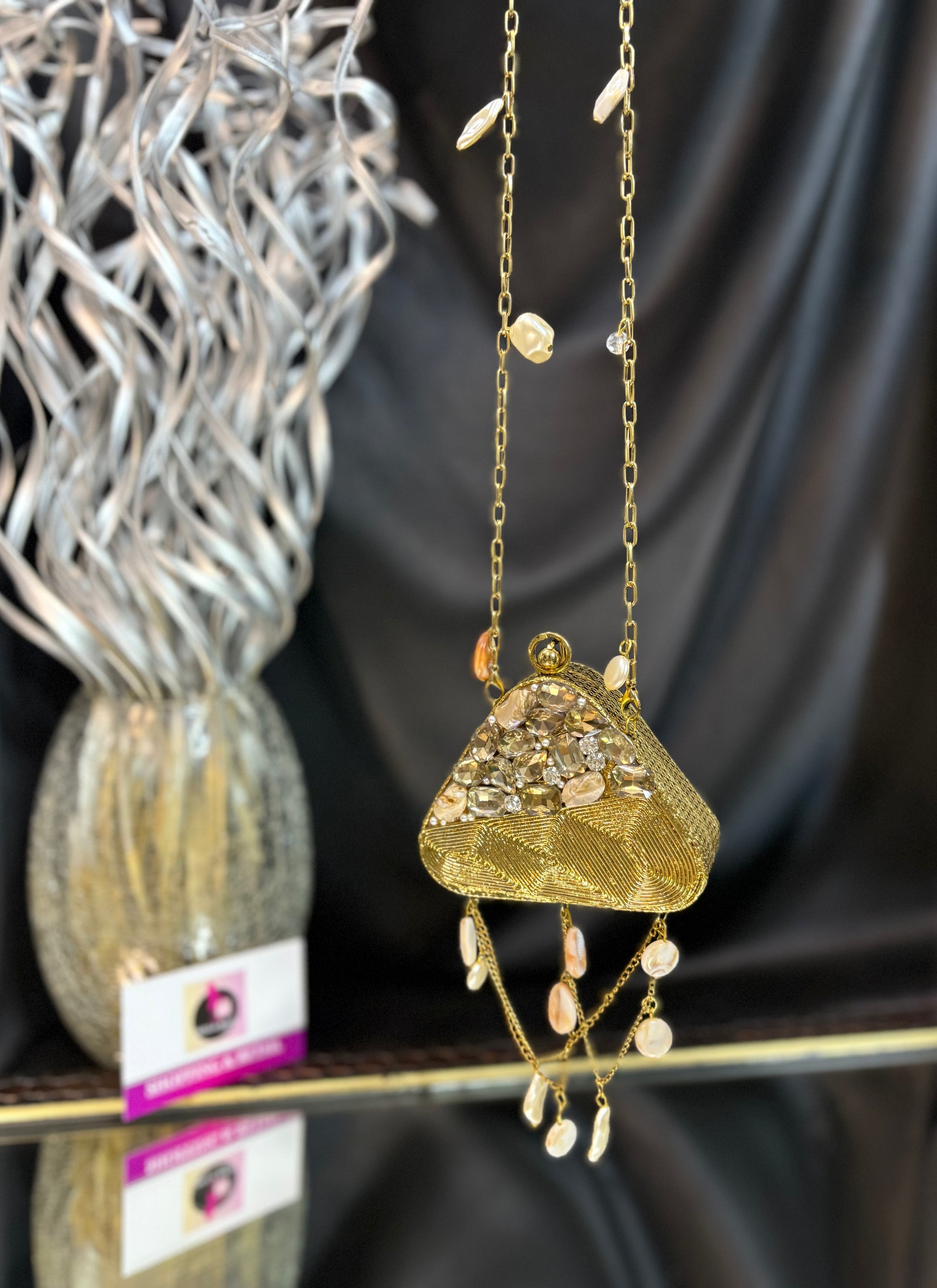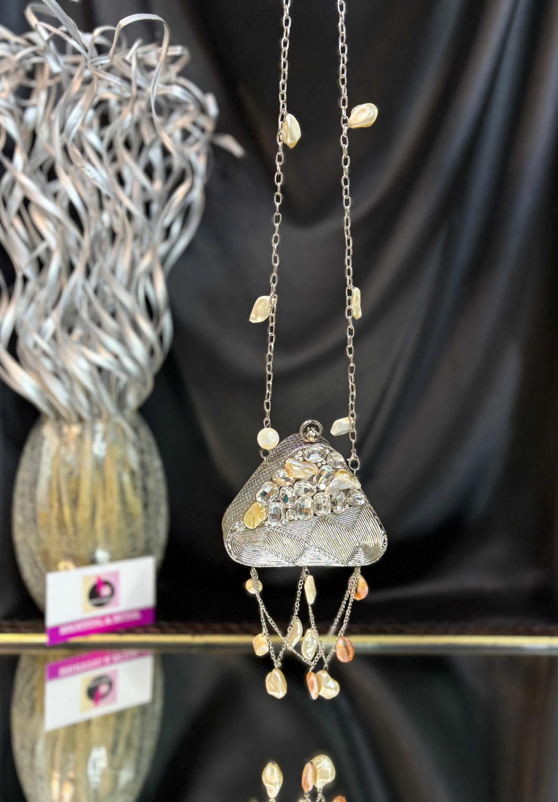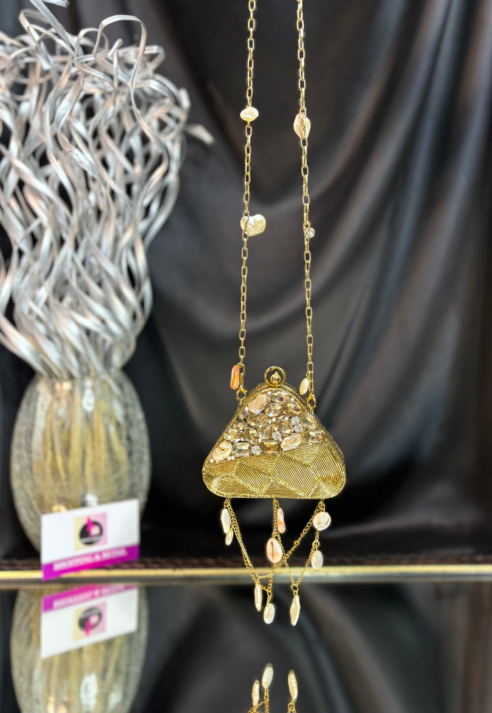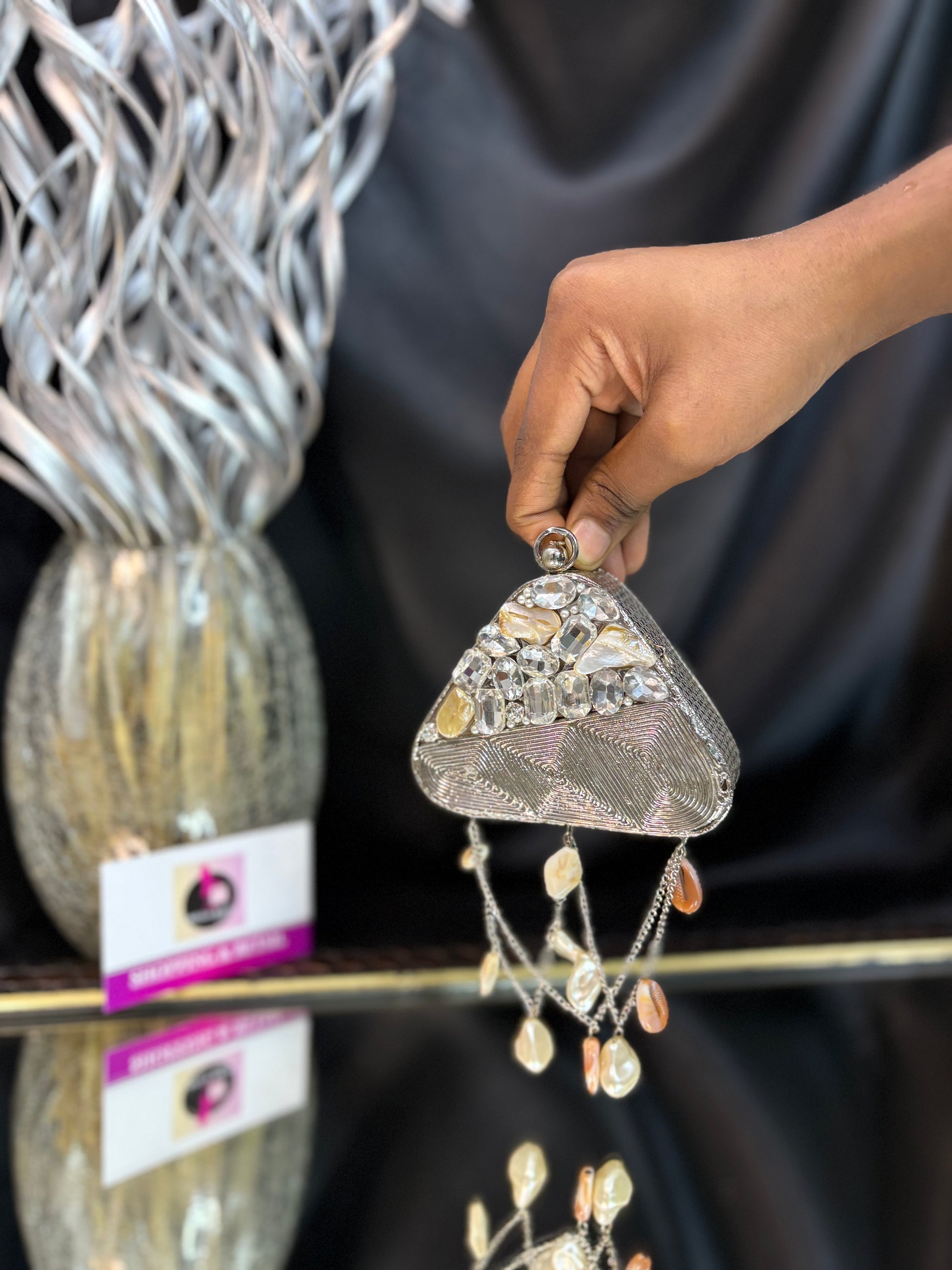 A diamond-detailed beauty that swings with shells and steals every spotlight. It's an embellished mini clutch with elegant details, perfect for weddings, parties, and every slay moment.