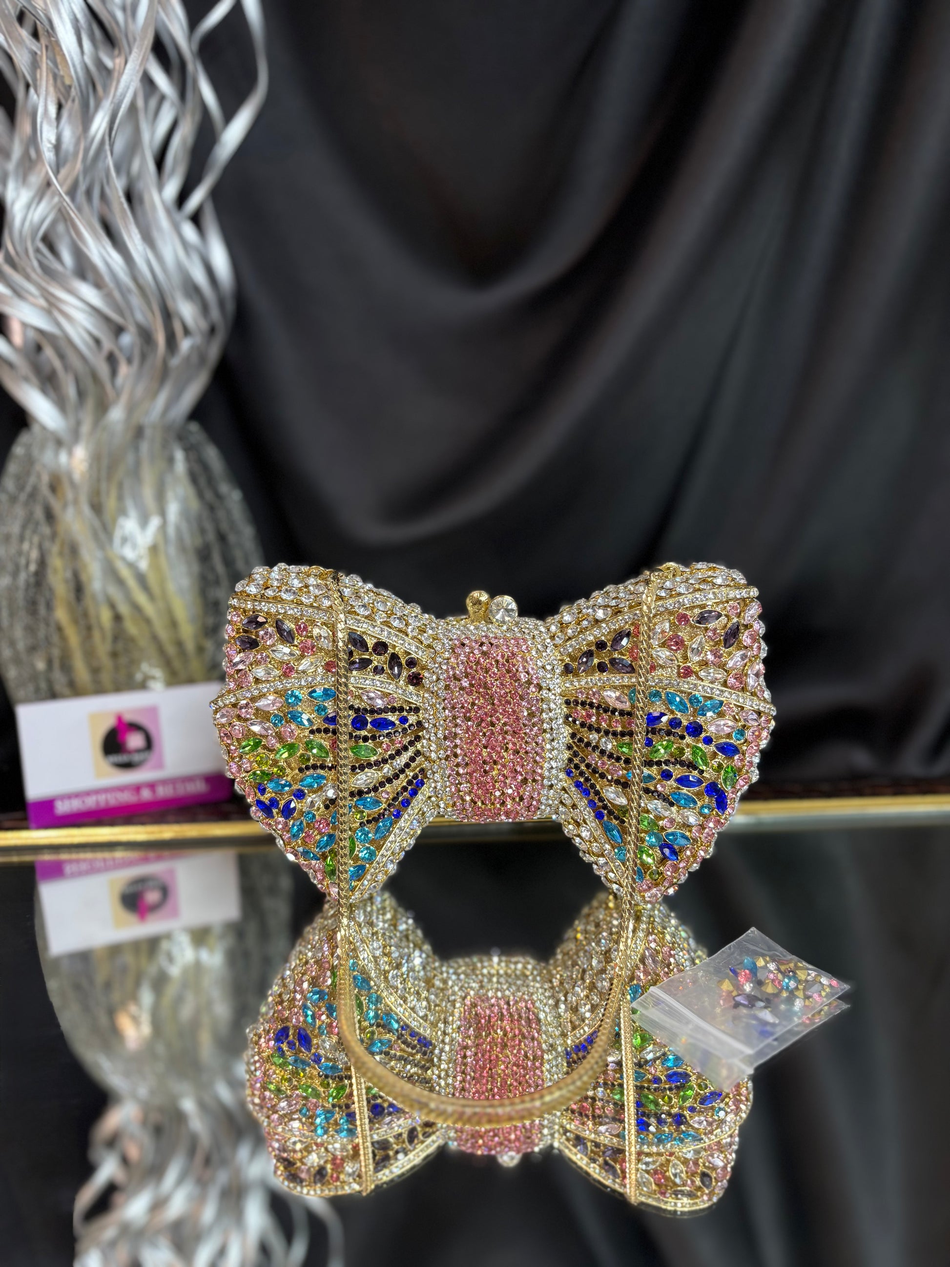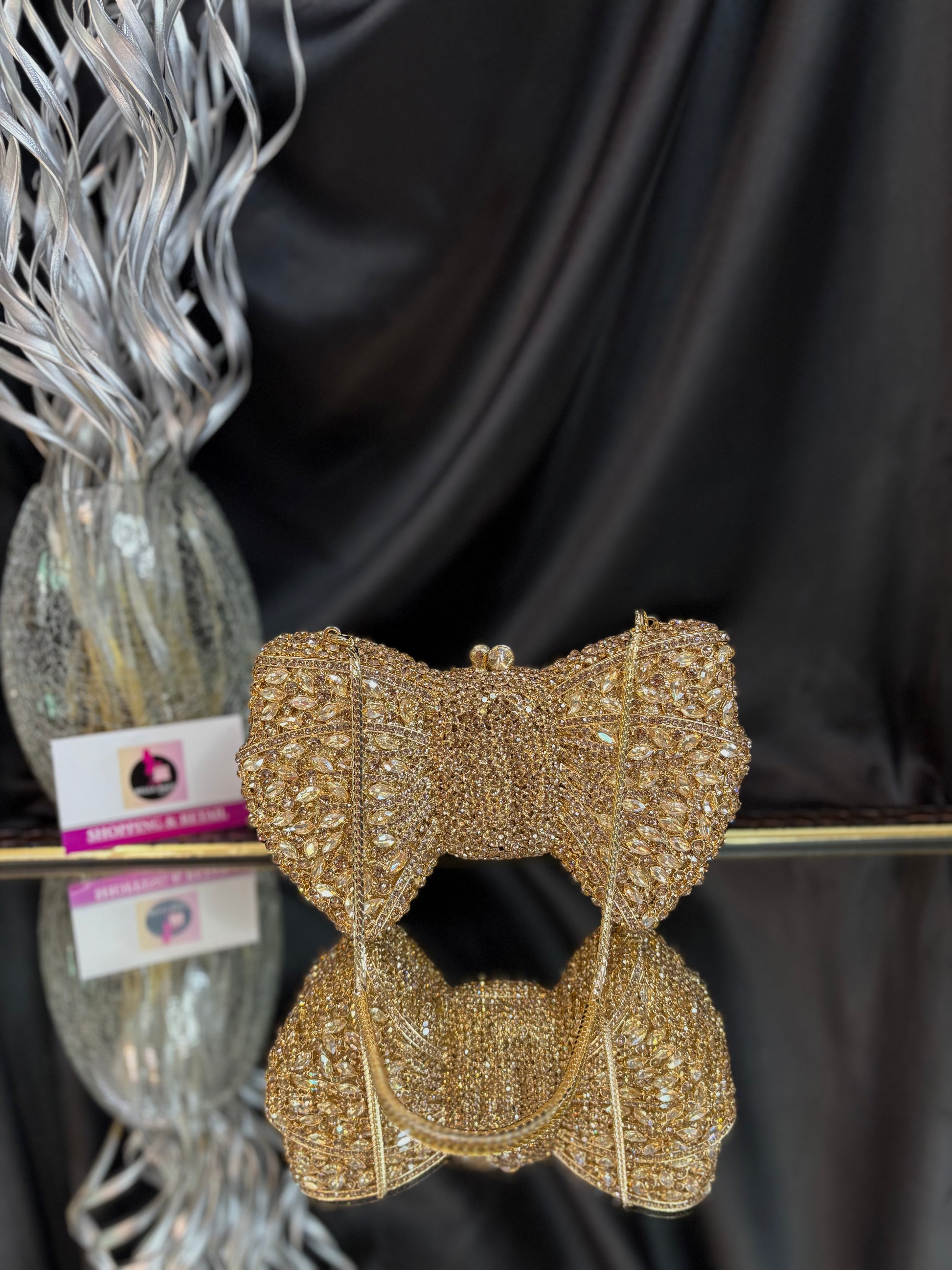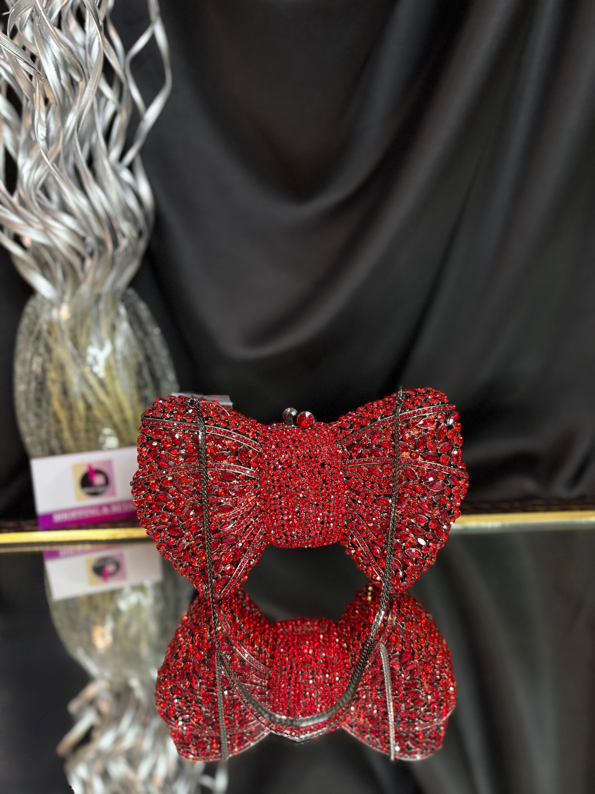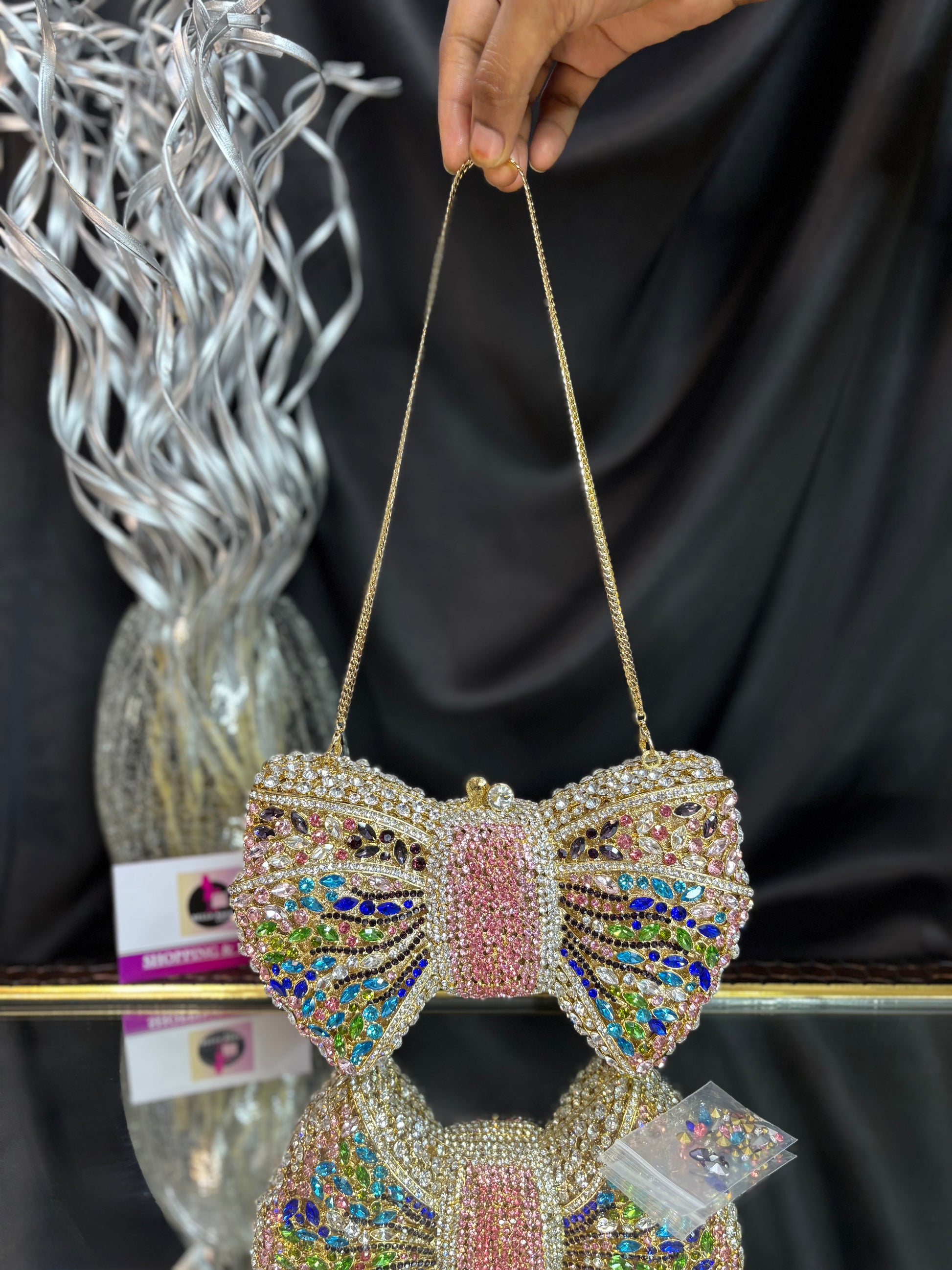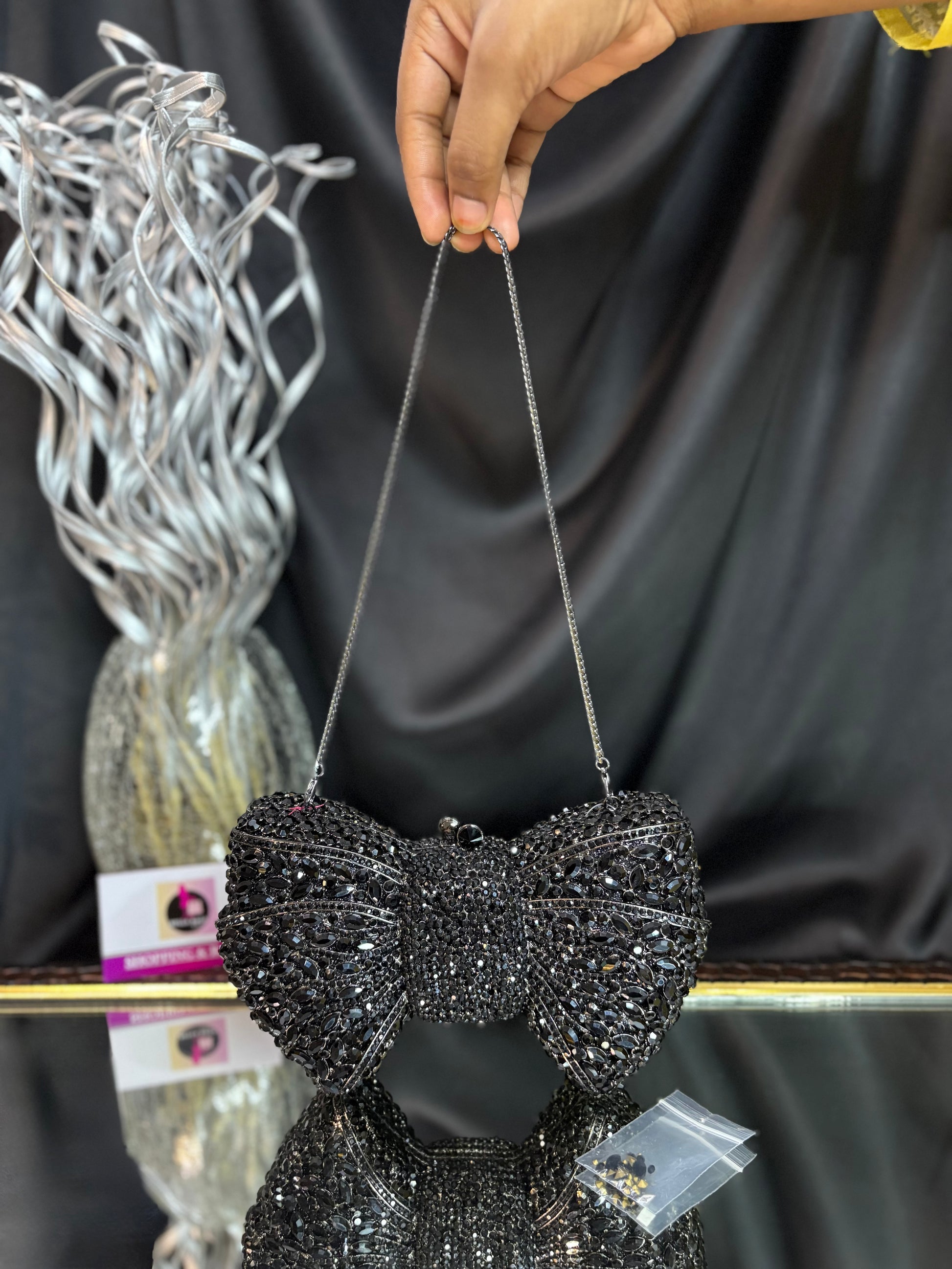 A dazzling bow-shaped clutch encrusted with shimmering crystals, featuring a sleek chain sling — the ultimate showstopper for glamorous evenings. Outer Material: crystals. Phone Capacity: Phone will not fit in. Sling: comes with a sling chain. Closure: magnetic enclosure. Pocket: No Pocket. Care Instructions: Keep it in a protective space when not in use and keep it away from moisture. Carry delicately!.