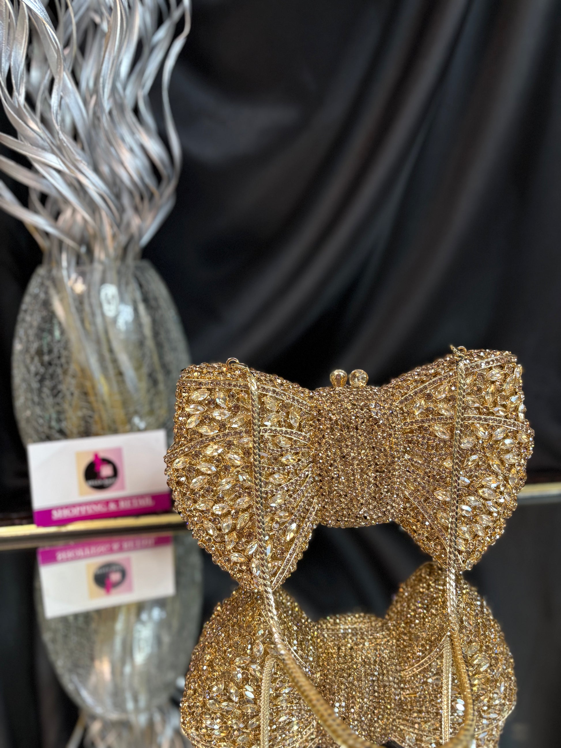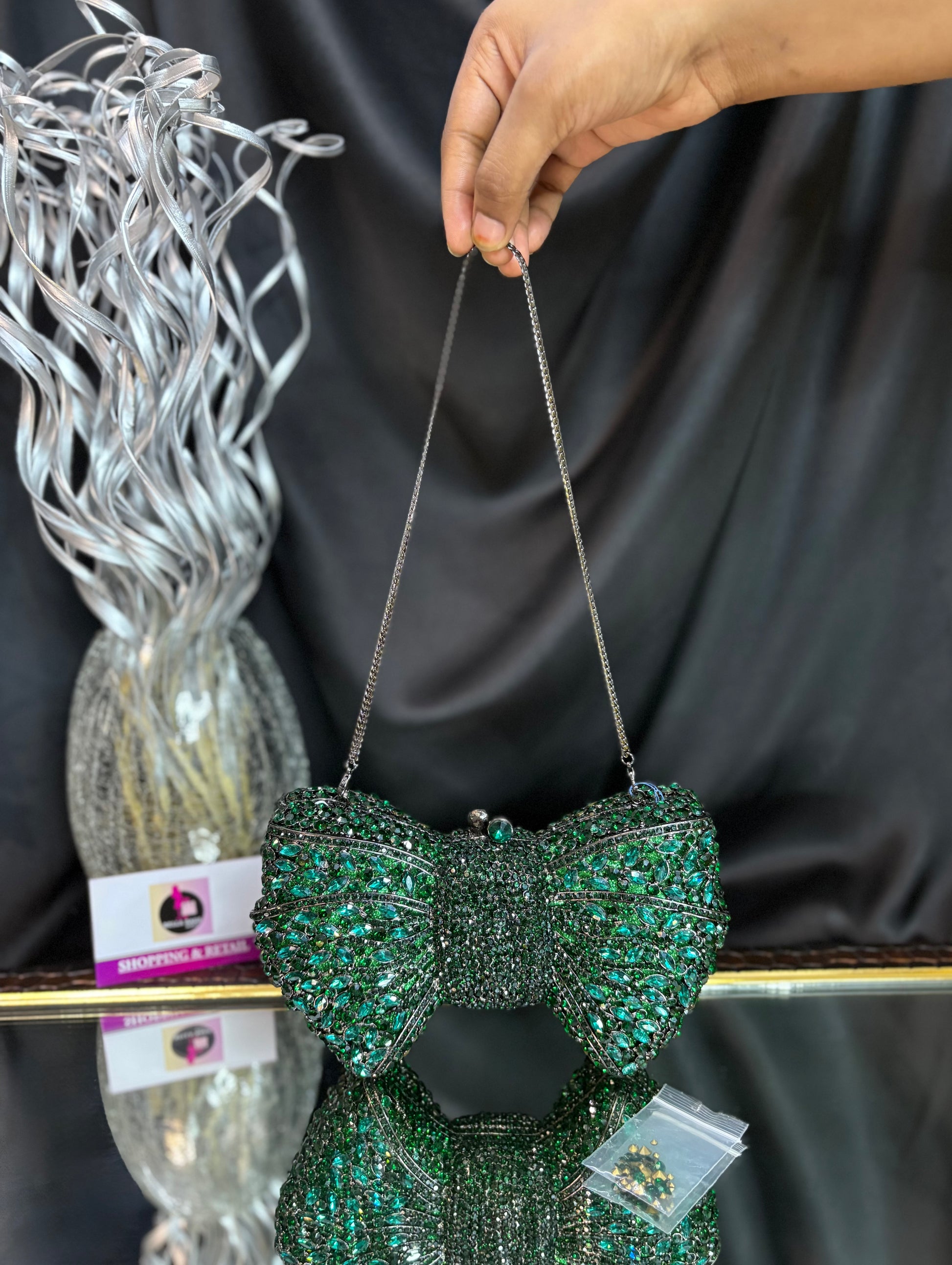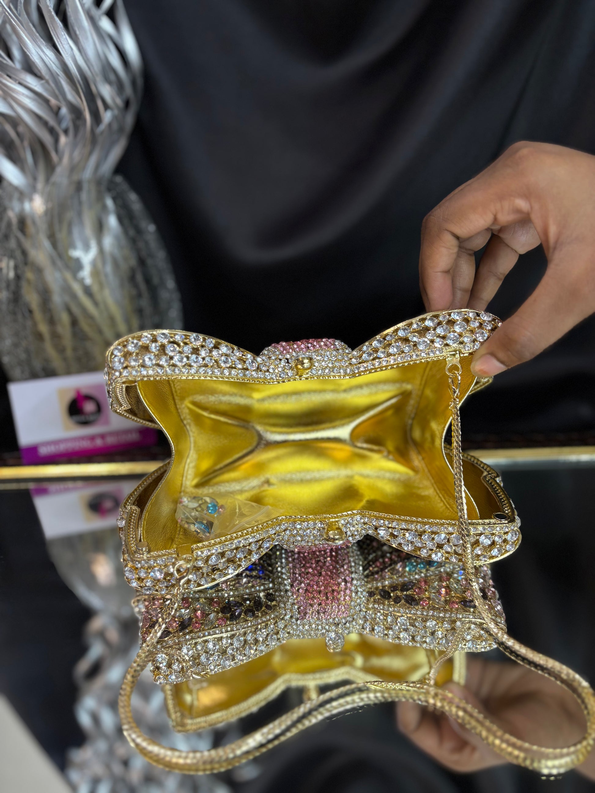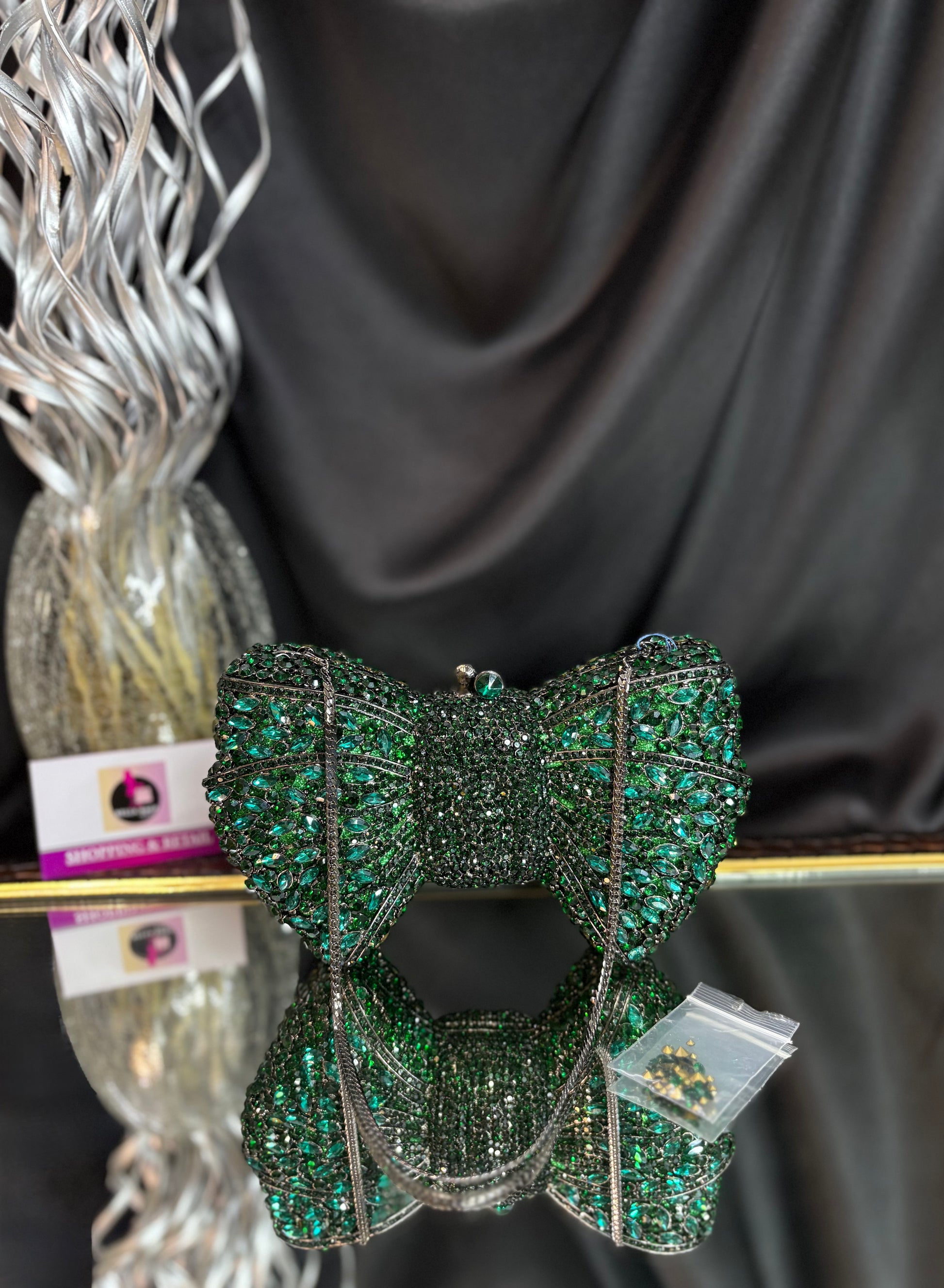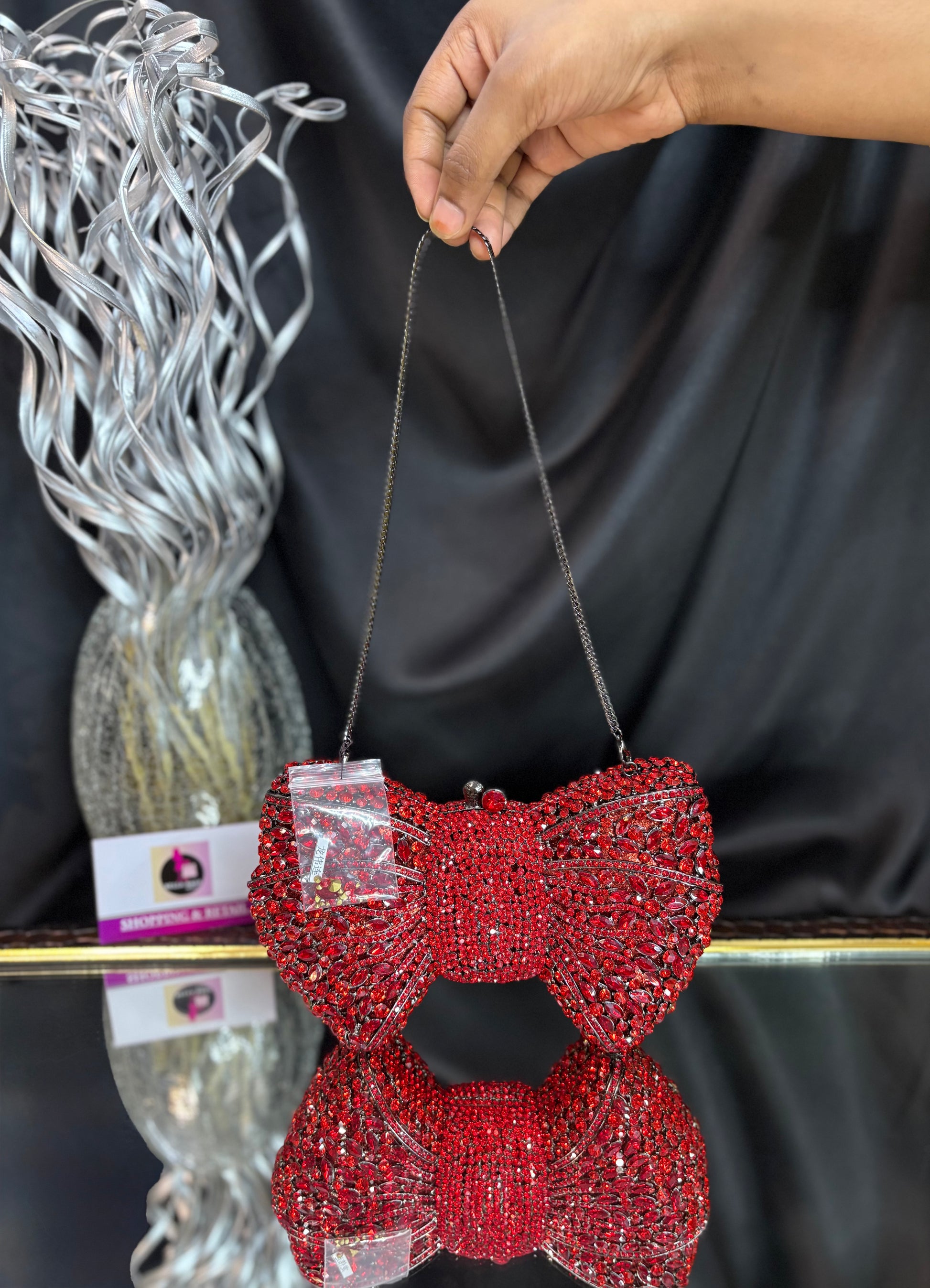 A dazzling bow-shaped clutch encrusted with shimmering crystals, featuring a sleek chain sling — the ultimate showstopper for glamorous evenings. Outer Material: crystals. Phone Capacity: Phone will not fit in. Sling: comes with a sling chain. Closure: magnetic enclosure. Pocket: No Pocket. Care Instructions: Keep it in a protective space when not in use and keep it away from moisture. Carry delicately!.