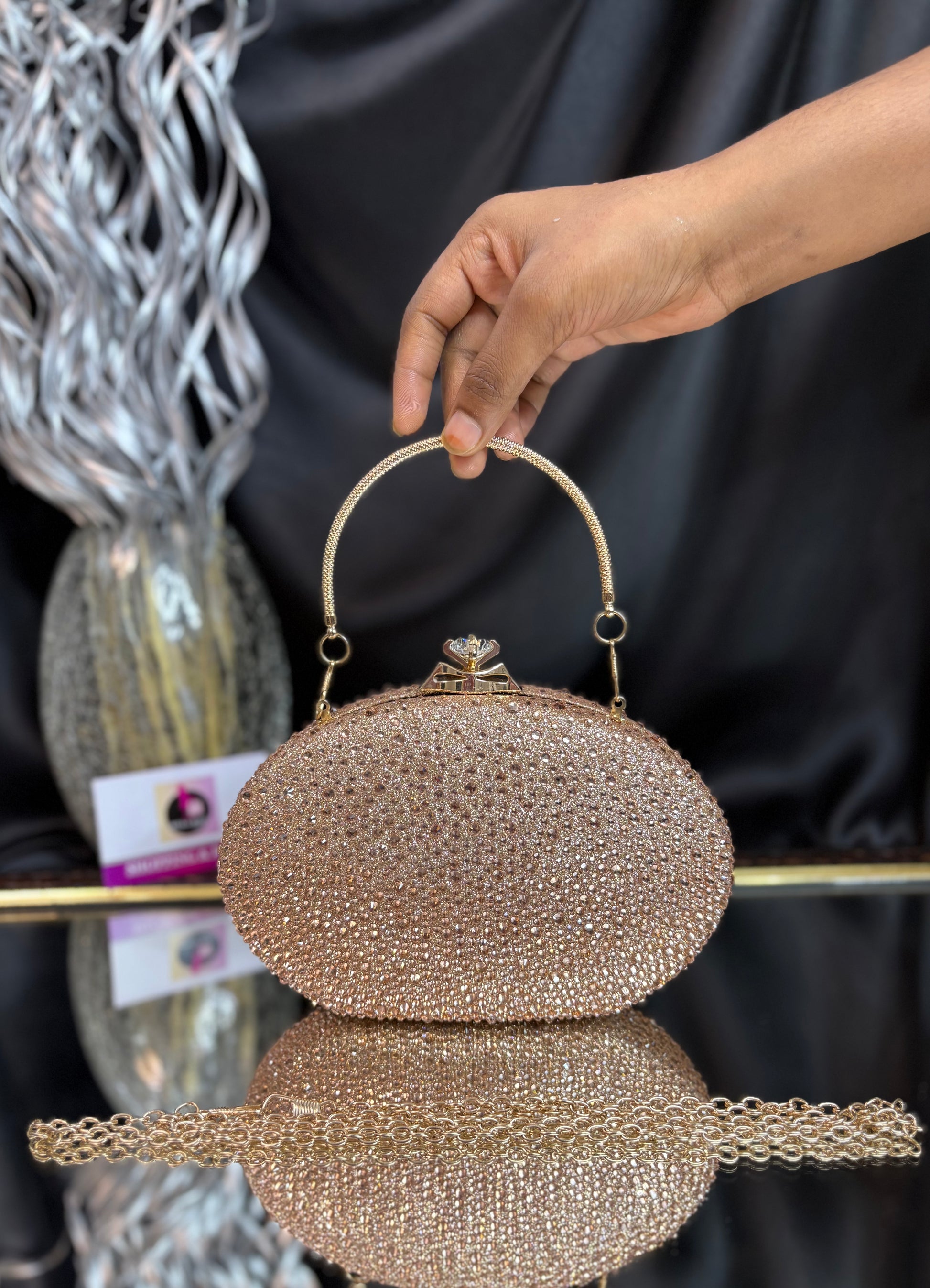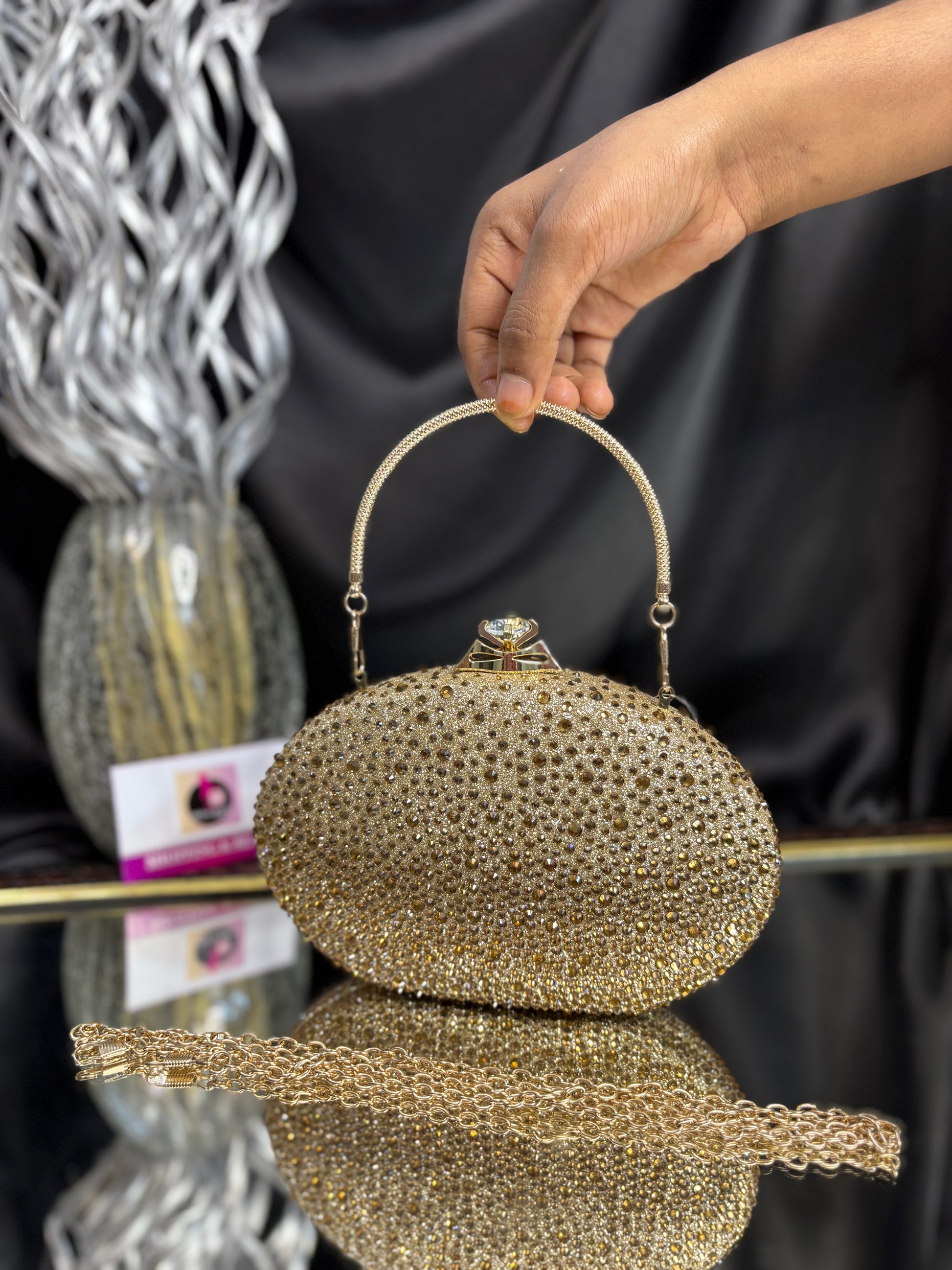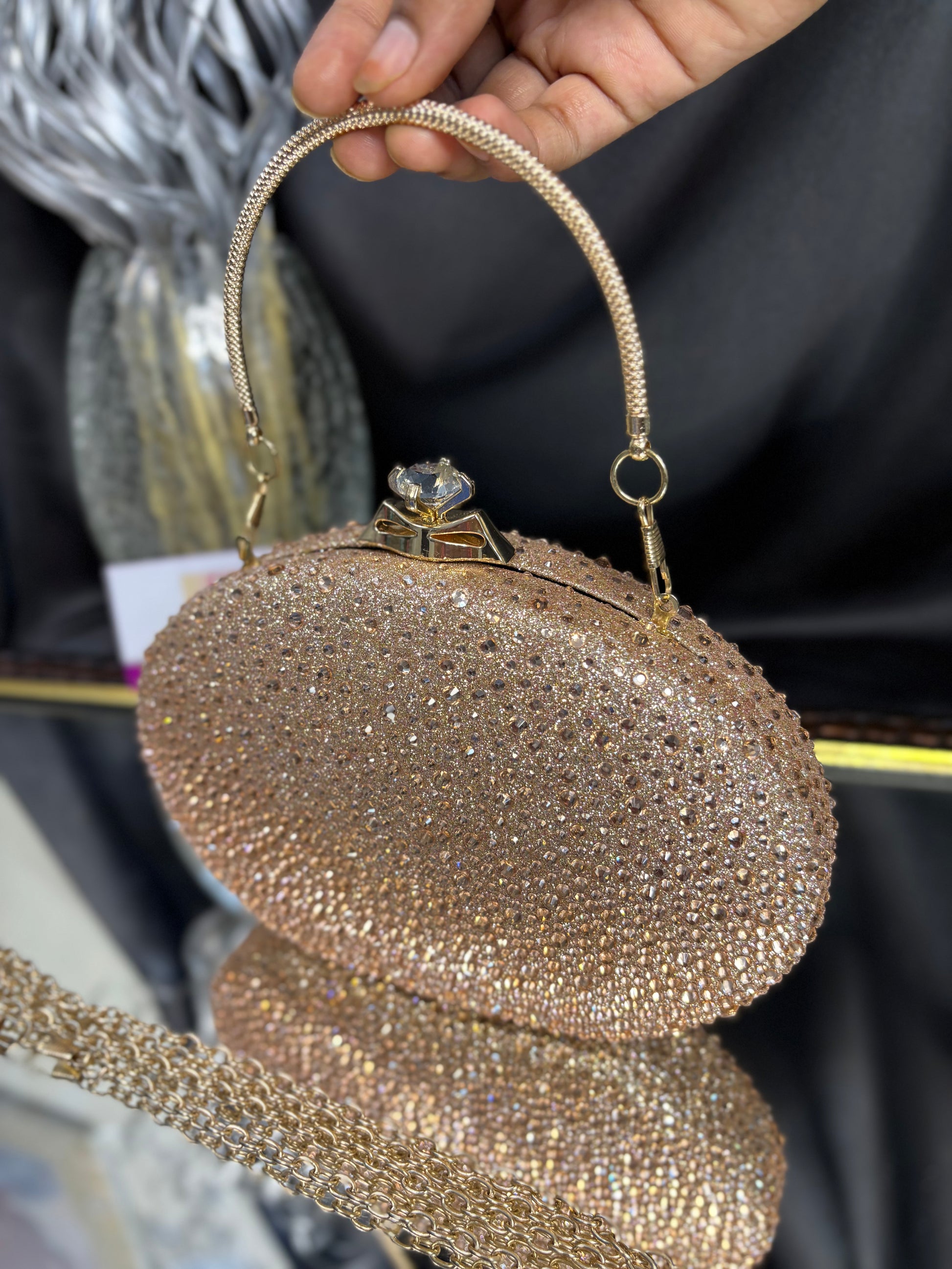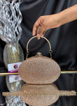 Oval-shaped clutch encrusted with shimmering stones, featuring a chic top handle and a delicate chain strap — perfect for evening glam. Outer Material: stonework. Phone Capacity: Phone will fit in. Sling: Comes with a detachable handle and sling chain. Closure: magnetic closure. Pocket: No Pocket. Care Instructions: Keep it in a protective space when not in use and keep it away from moisture. Carry delicately!