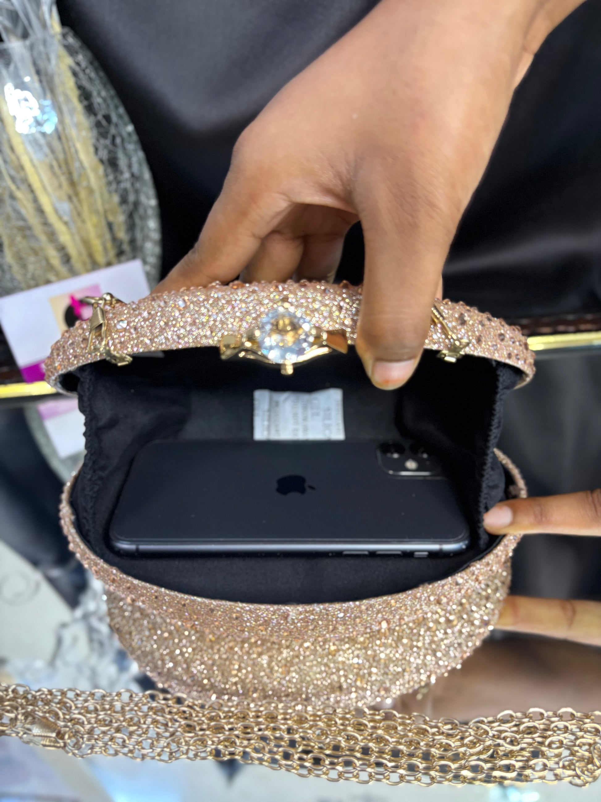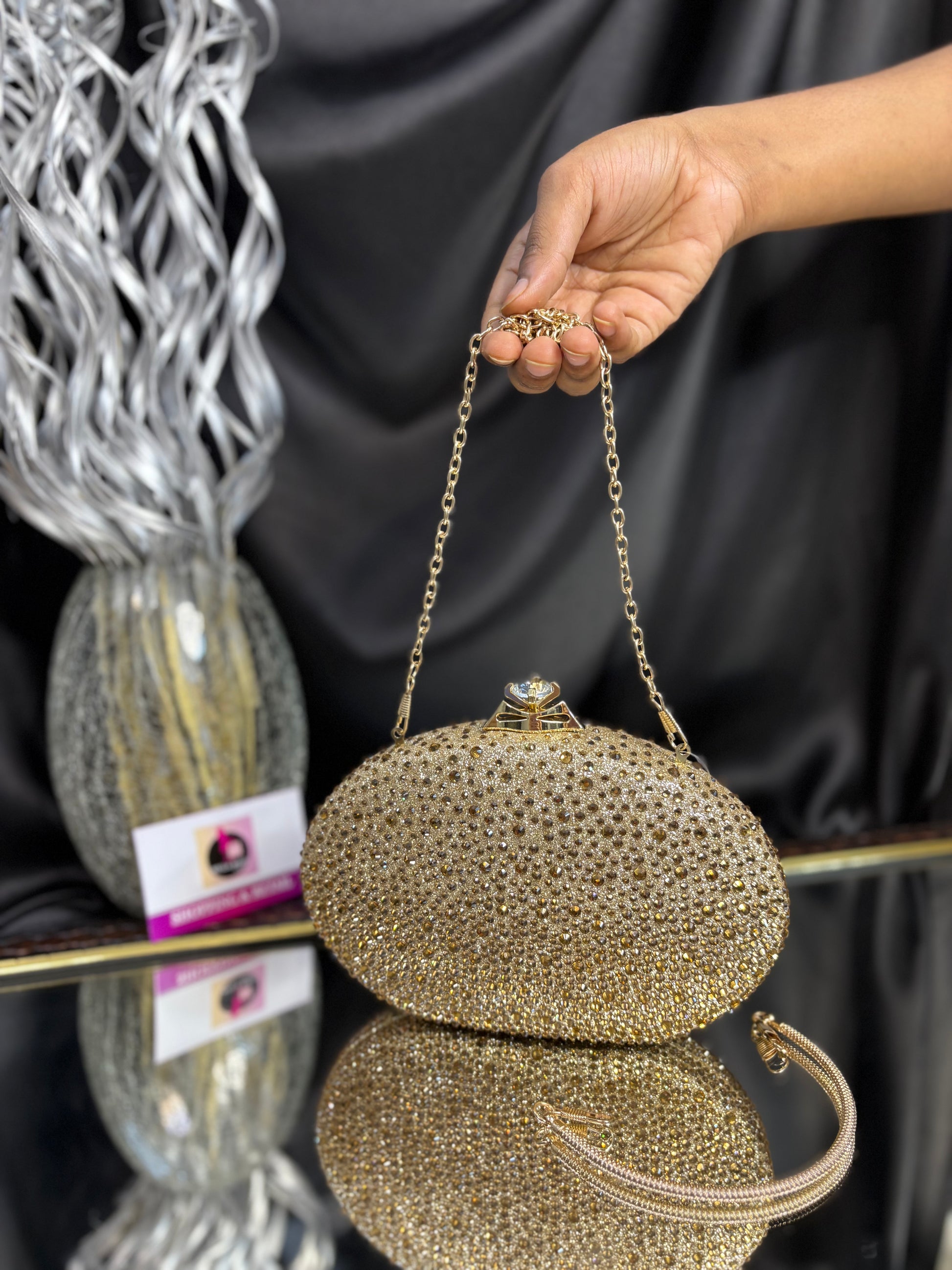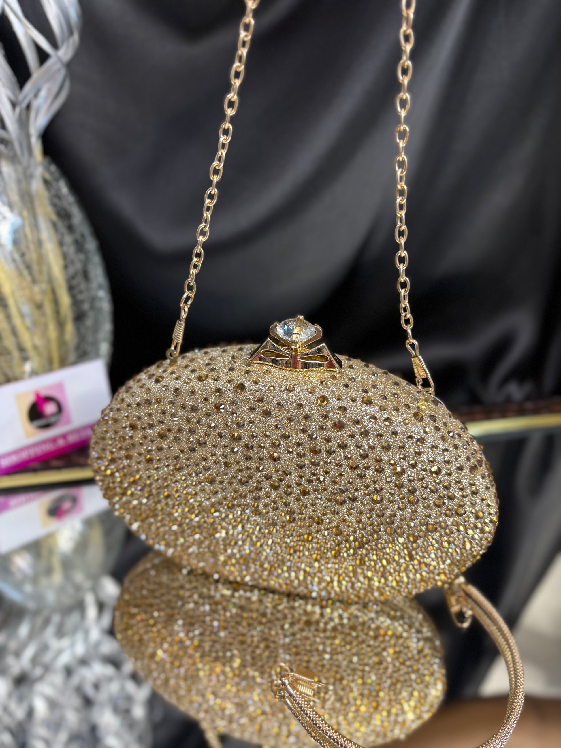Oval-shaped clutch encrusted with shimmering stones, featuring a chic top handle and a delicate chain strap — perfect for evening glam. Outer Material: stonework. Phone Capacity: Phone will fit in. Sling: Comes with a detachable handle and sling chain. Closure: magnetic closure. Pocket: No Pocket. Care Instructions: Keep it in a protective space when not in use and keep it away from moisture. Carry delicately!