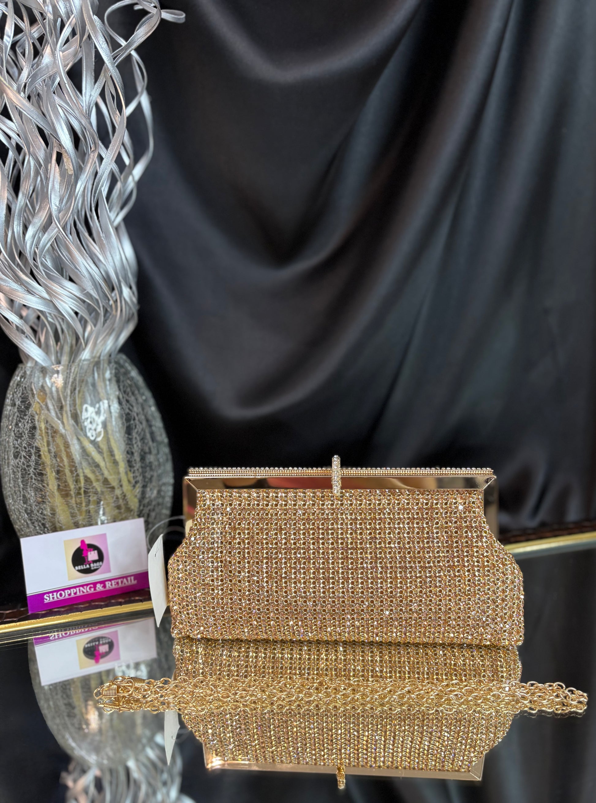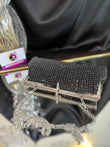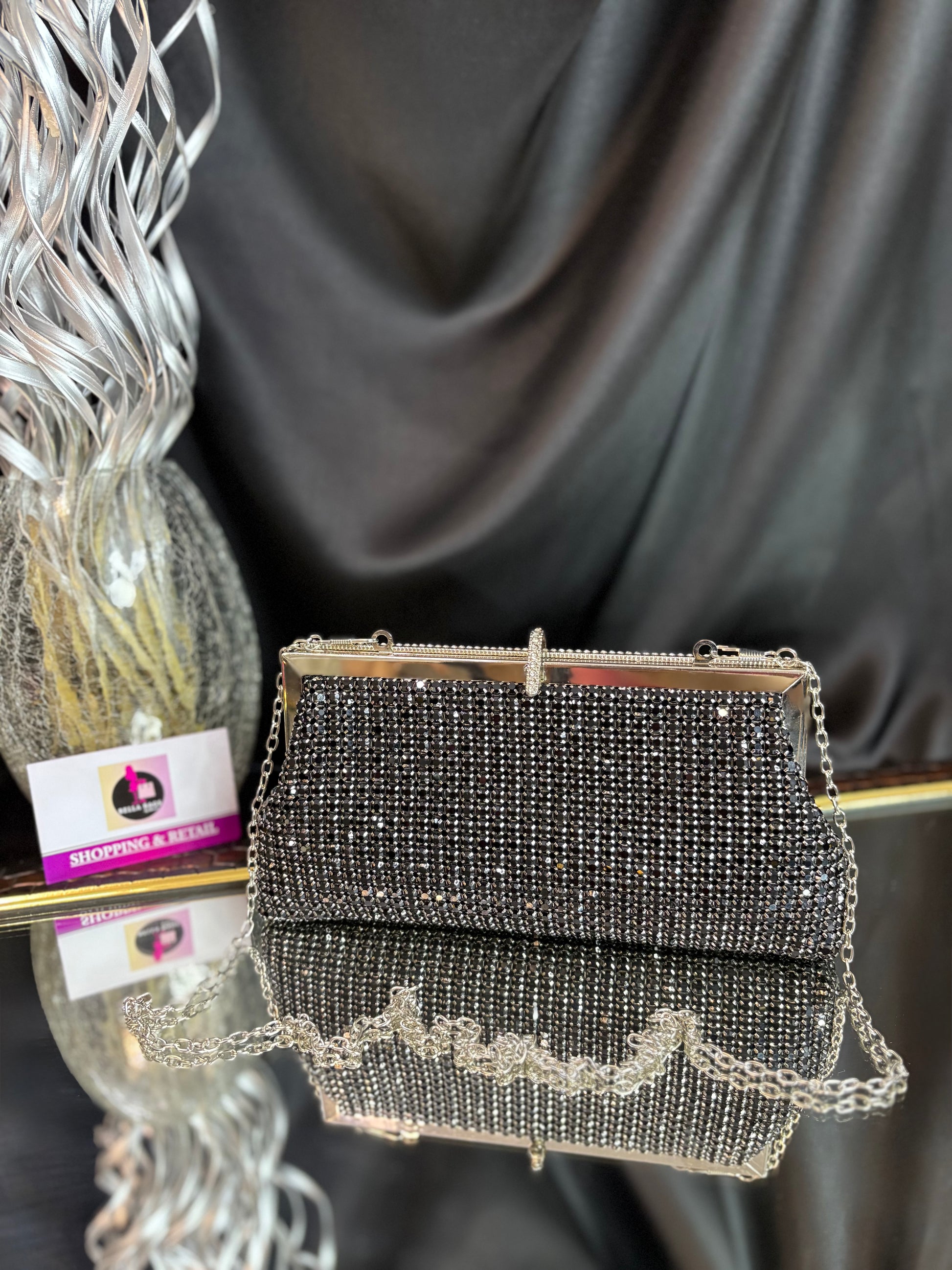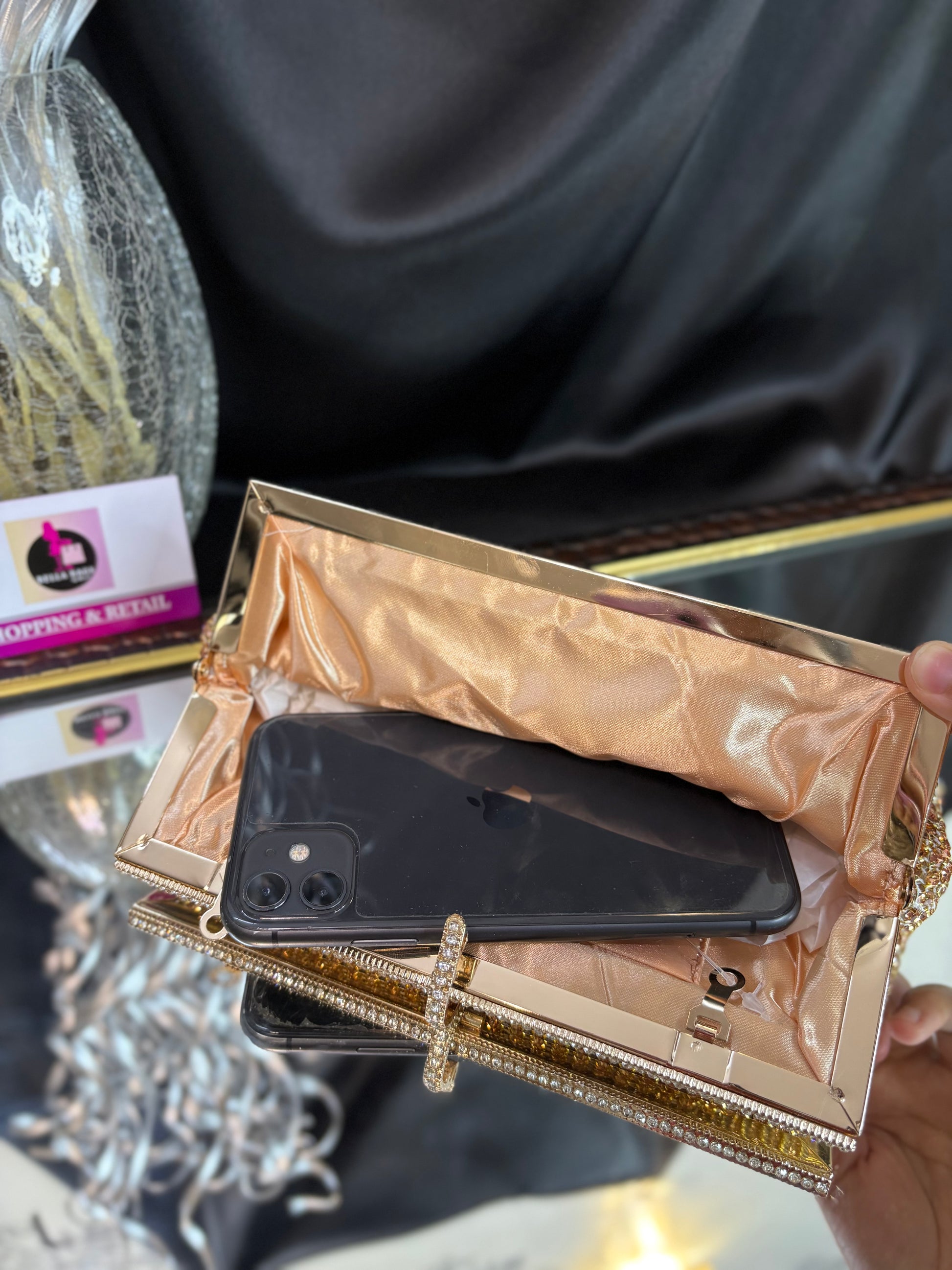 Elevate your look with this elegant clutch, featuring a sleek metal frame and a surface encrusted with sparkling rhinestones. Its structured clutch design and sling chain make it both stylish and functional- perfect for weddings, parties, and festive occasions. Outer Material: rhinestones. Phone Capacity: Phone will fit in (iPhone 11 shown). Sling: comes with a sling chain. Closure: lock enclosure. Pocket: No Pocket. Care Instructions: Keep it in a protective space when not in use and keep it away from moisture. Carry delicately!
