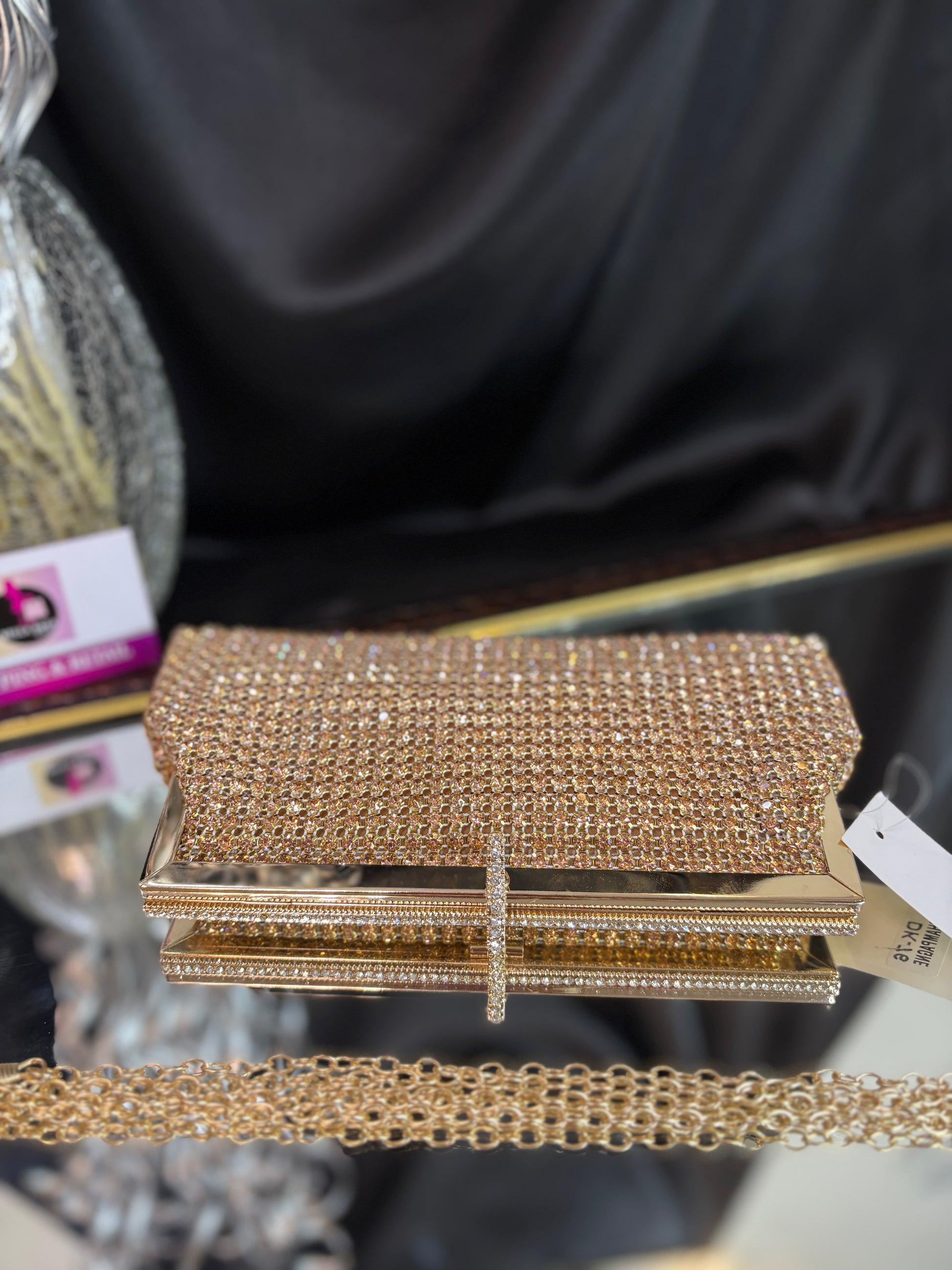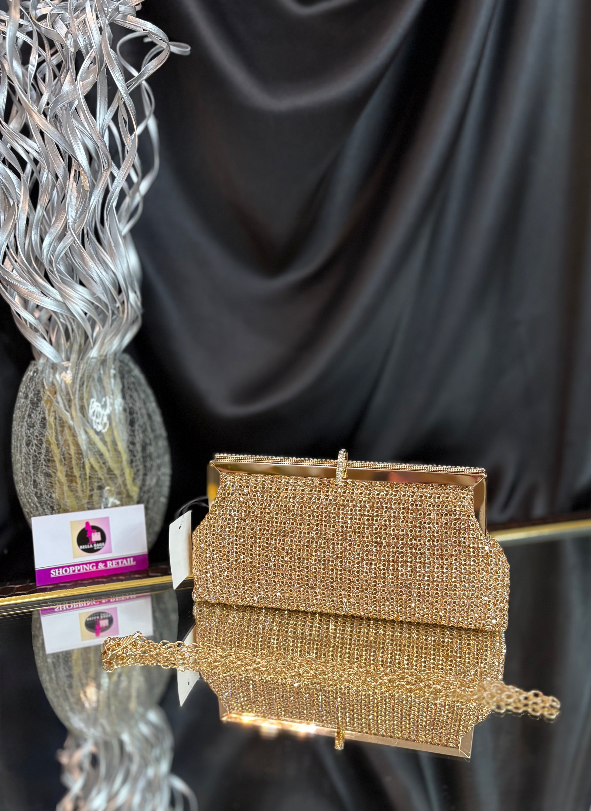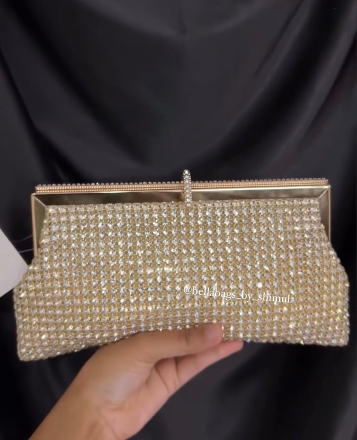 Elevate your look with this elegant clutch, featuring a sleek metal frame and a surface encrusted with sparkling rhinestones. Its structured clutch design and sling chain make it both stylish and functional- perfect for weddings, parties, and festive occasions. Outer Material: rhinestones. Phone Capacity: Phone will fit in (iPhone 11 shown). Sling: comes with a sling chain. Closure: lock enclosure. Pocket: No Pocket. Care Instructions: Keep it in a protective space when not in use and keep it away from moisture. Carry delicately!