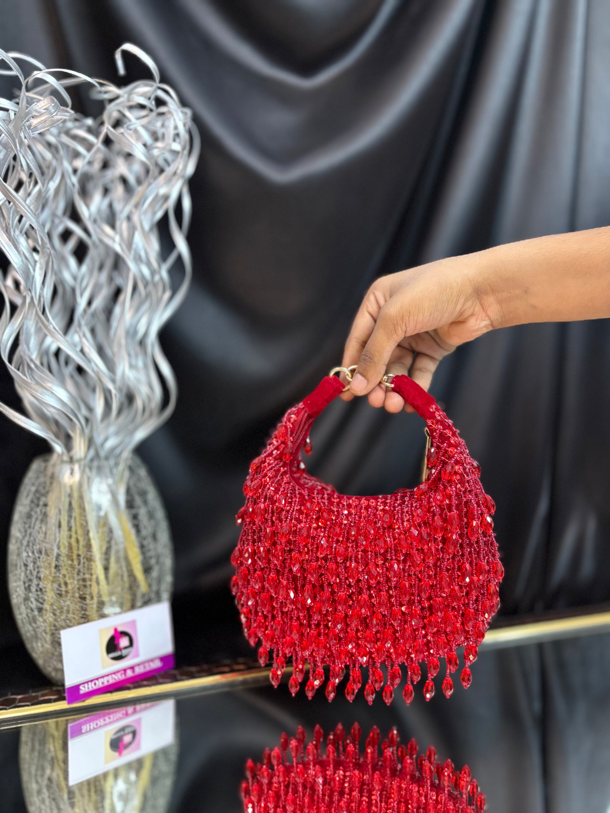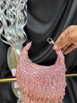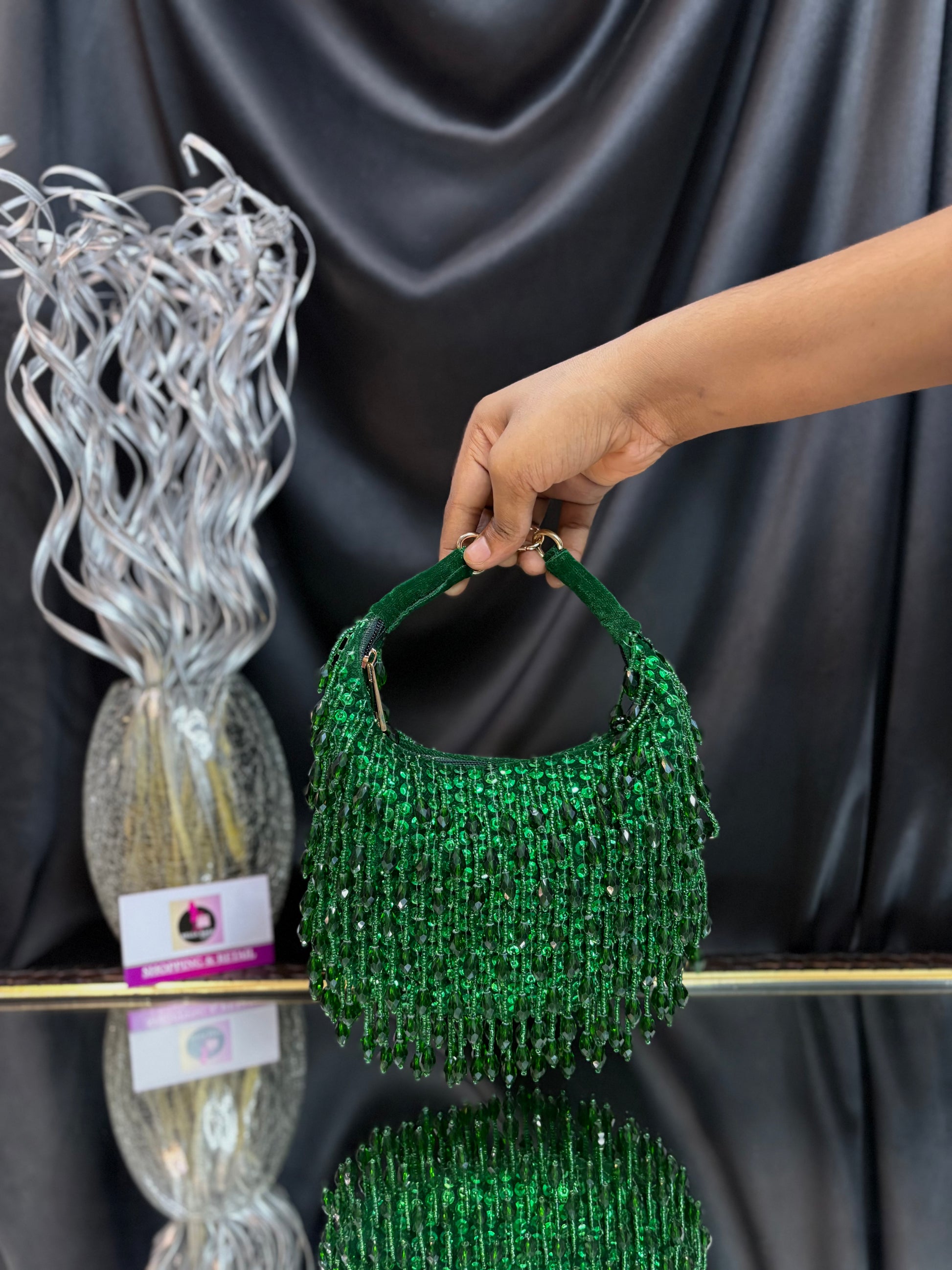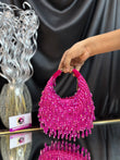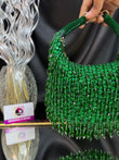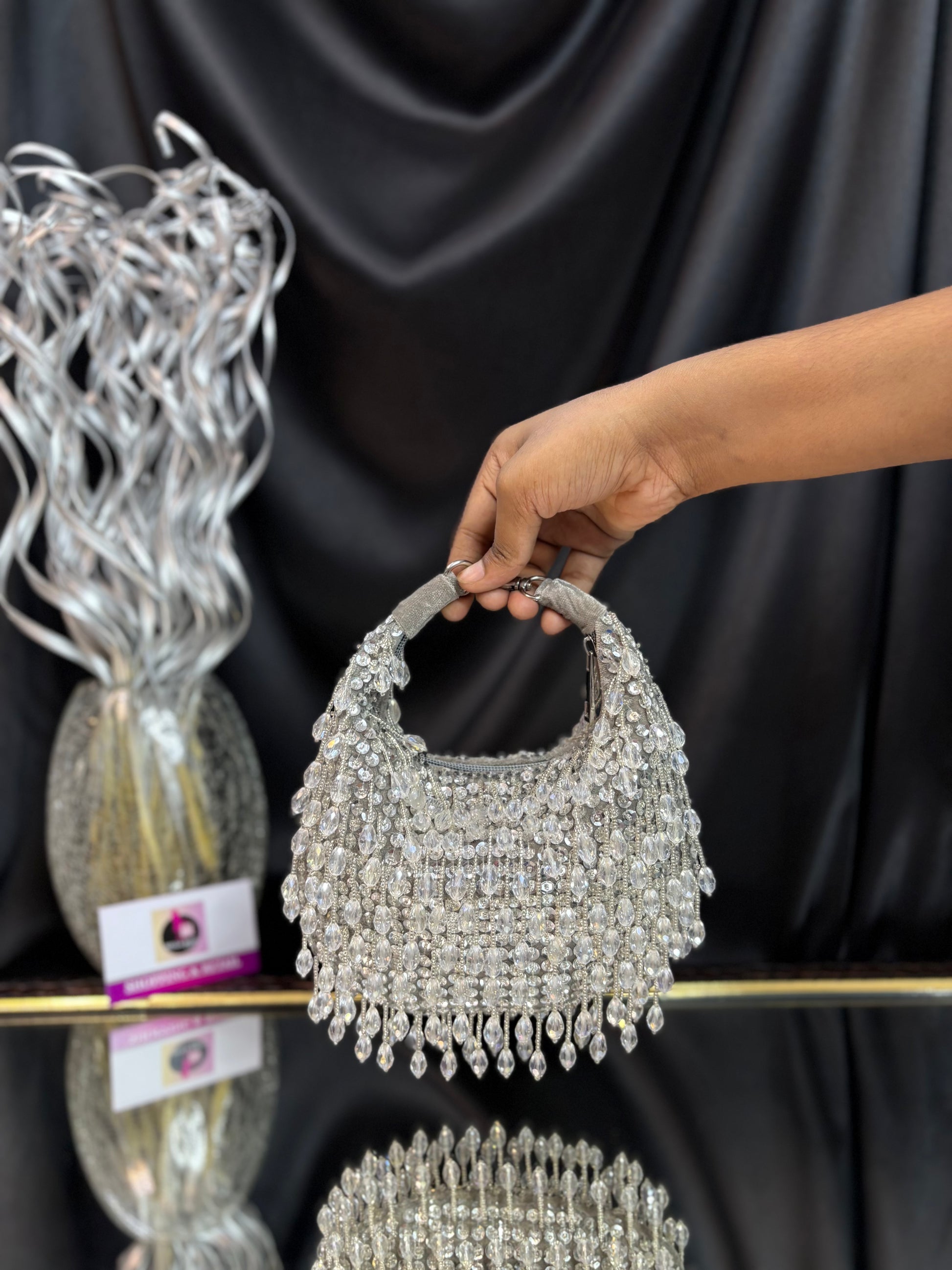 This dazzling moon bag is adorned with shimmering beads and sequins, making it a perfect statement piece for weddings or festive occasions. Available in 9 colours, its chic, curved shape and sparkling fringe detail add an elegant and glamorous touch to any ensemble. Outer Material: crystal beads and sequins. Phone Capacity: Phone will fit in (iPhone 11 shown). Sling: comes with an attached hook enclosure. Closure: zip enclosure. Pocket: No Pocket. Care Instructions: Keep it in a protective space when not in use and keep it away from moisture. Carry delicately!.