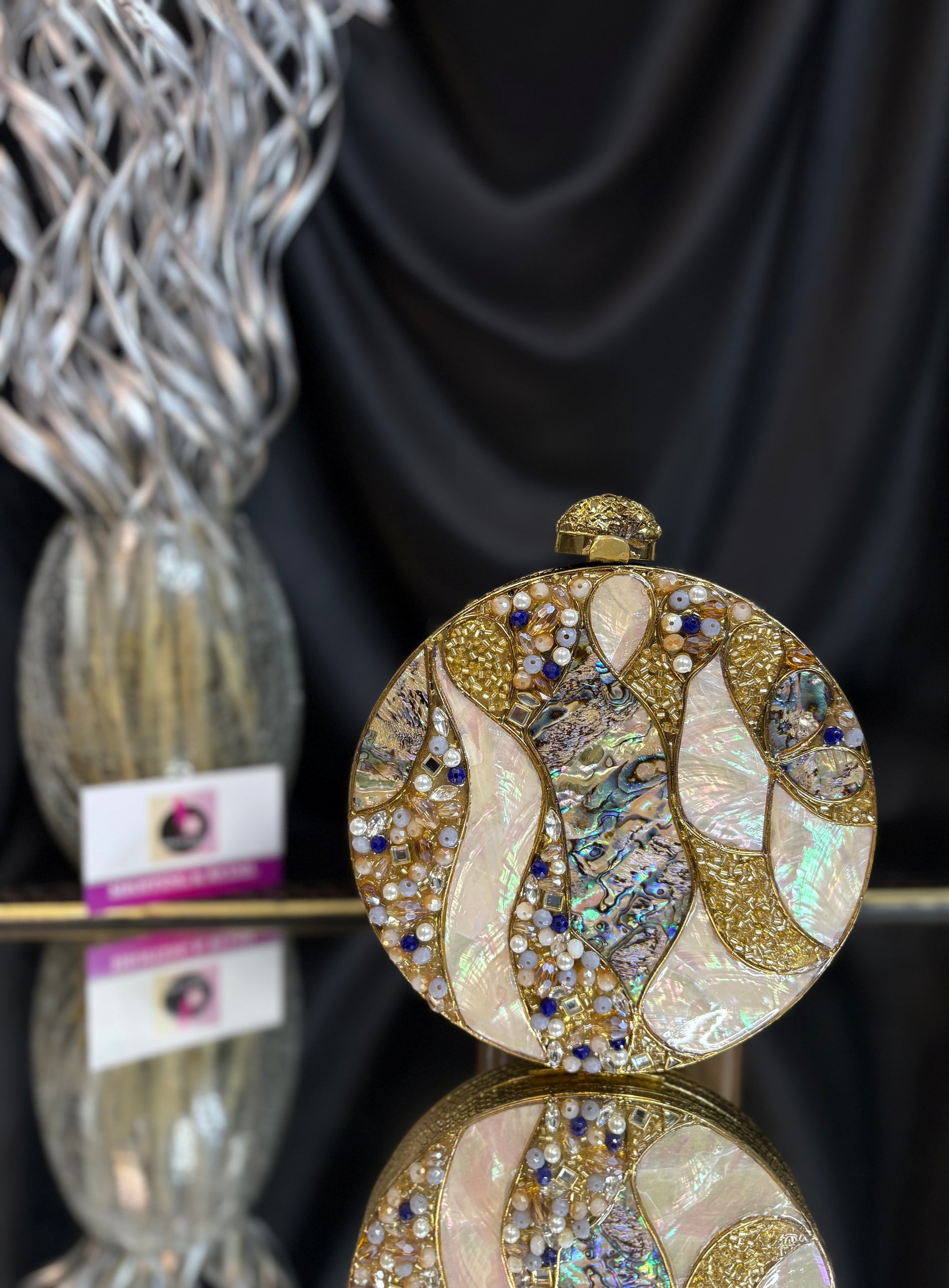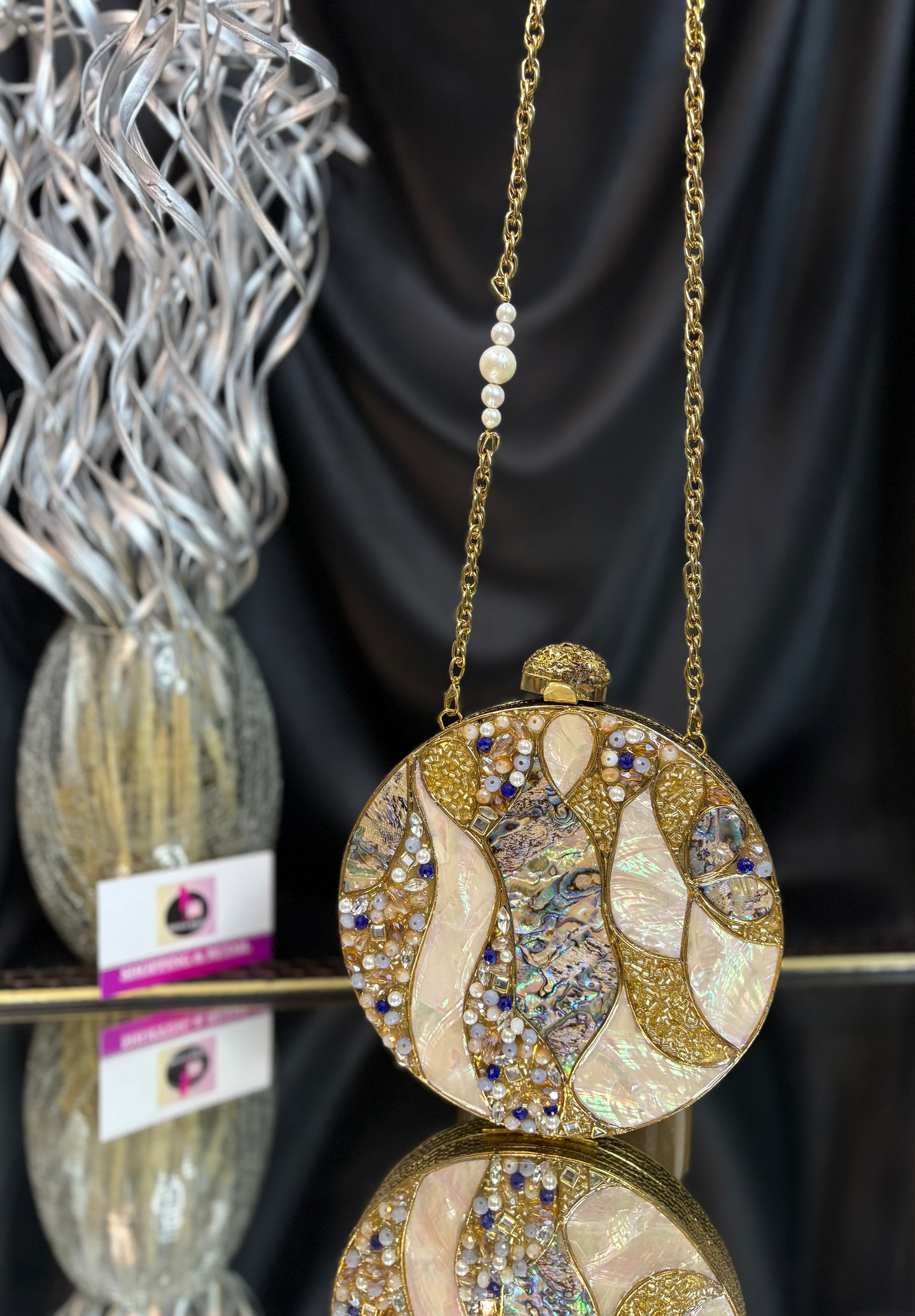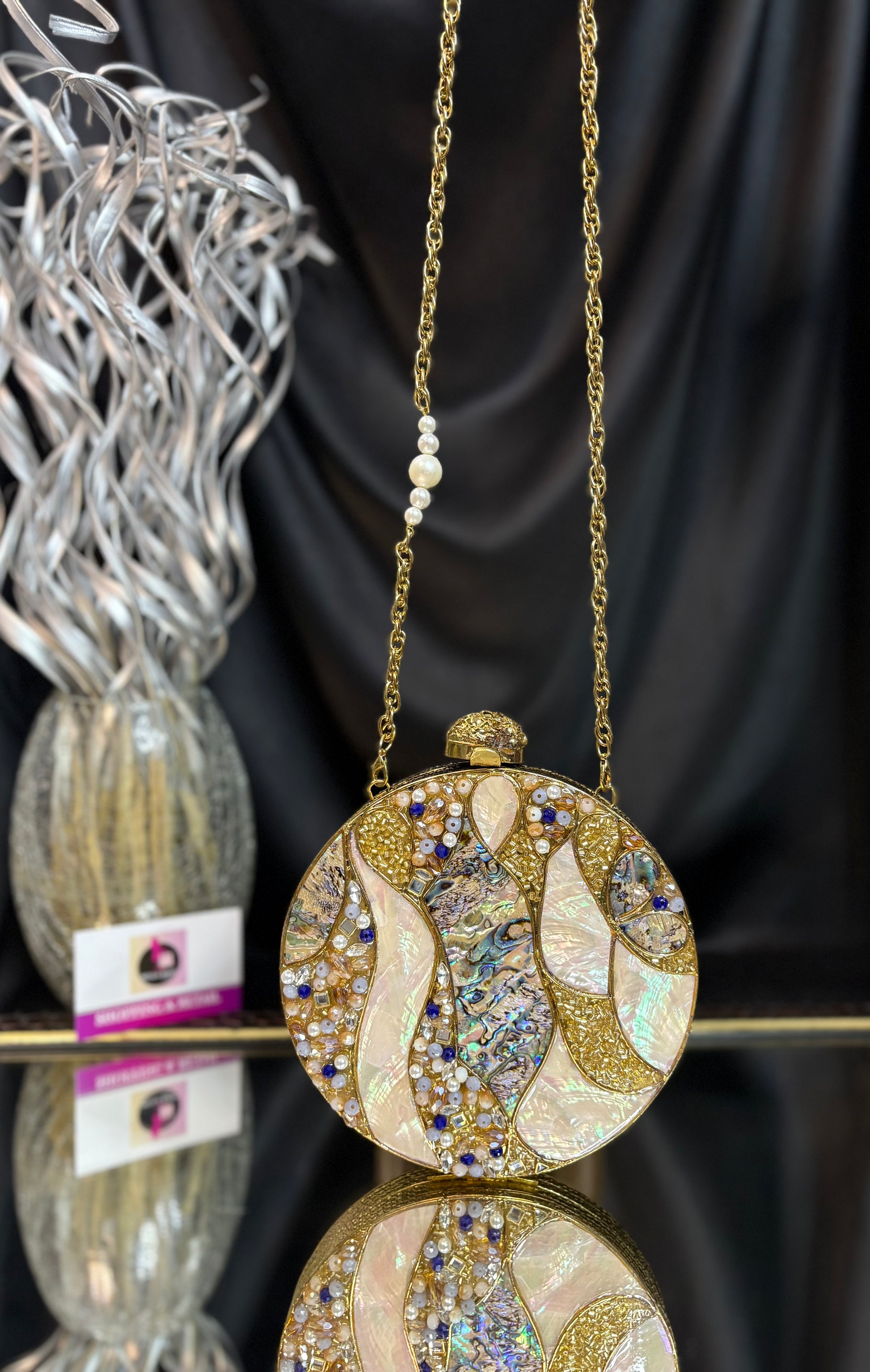 An elegant brass, mother-of-pearl clutch with a chain. Embellished with shimmering beads and stones,beautiful frame with rainbow holographic base featuring a luxurious finish.