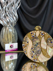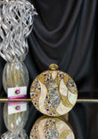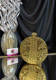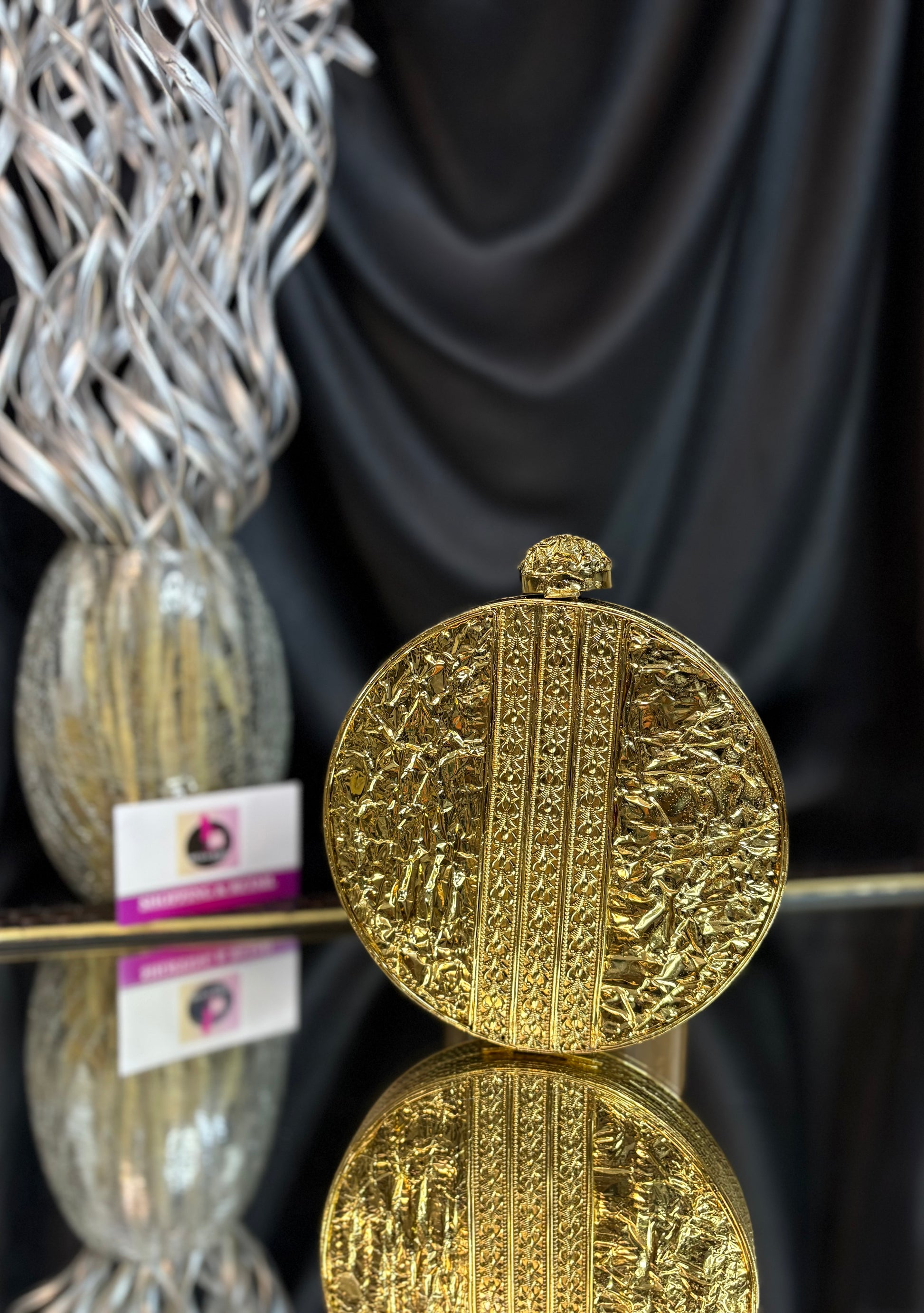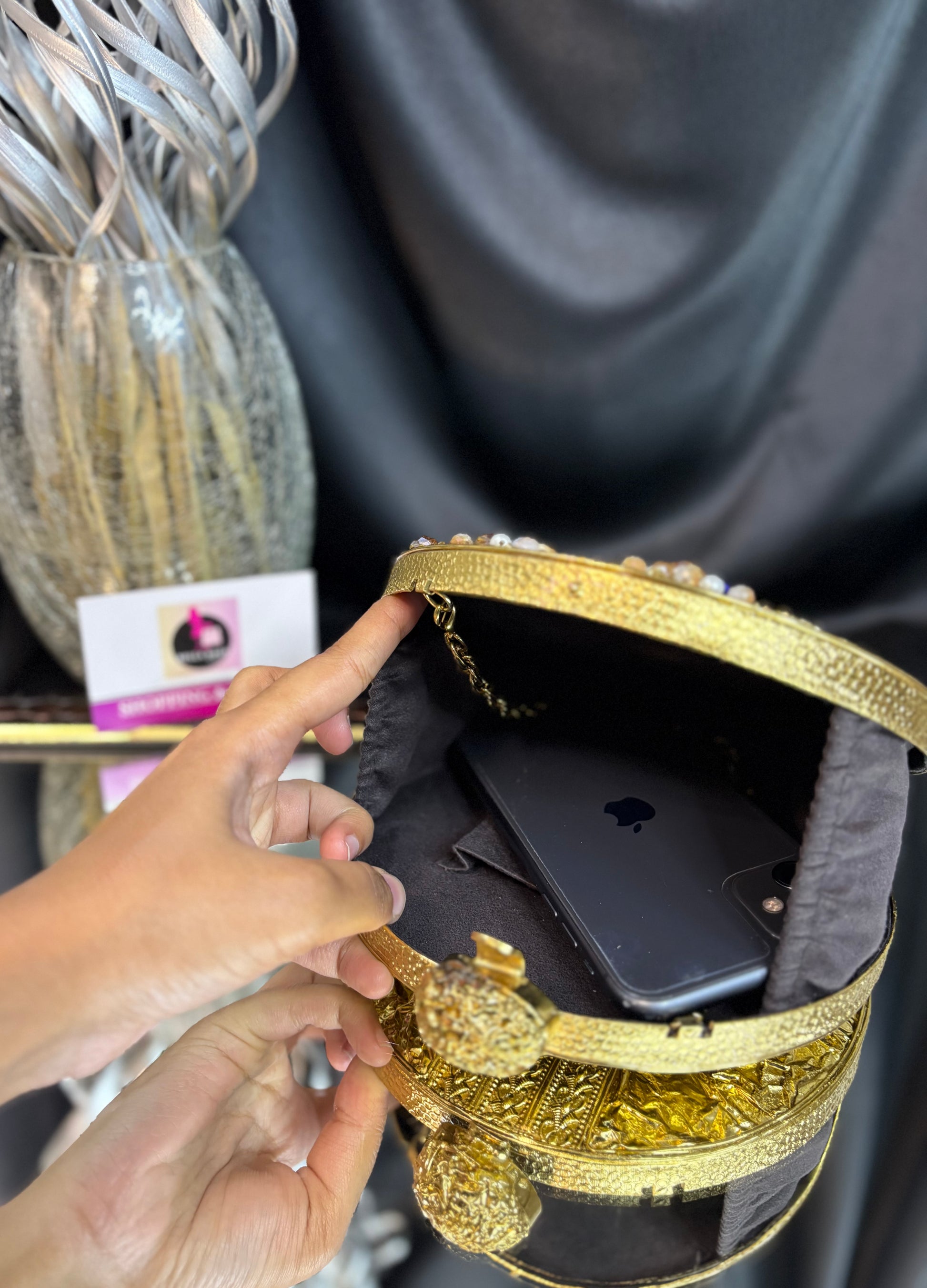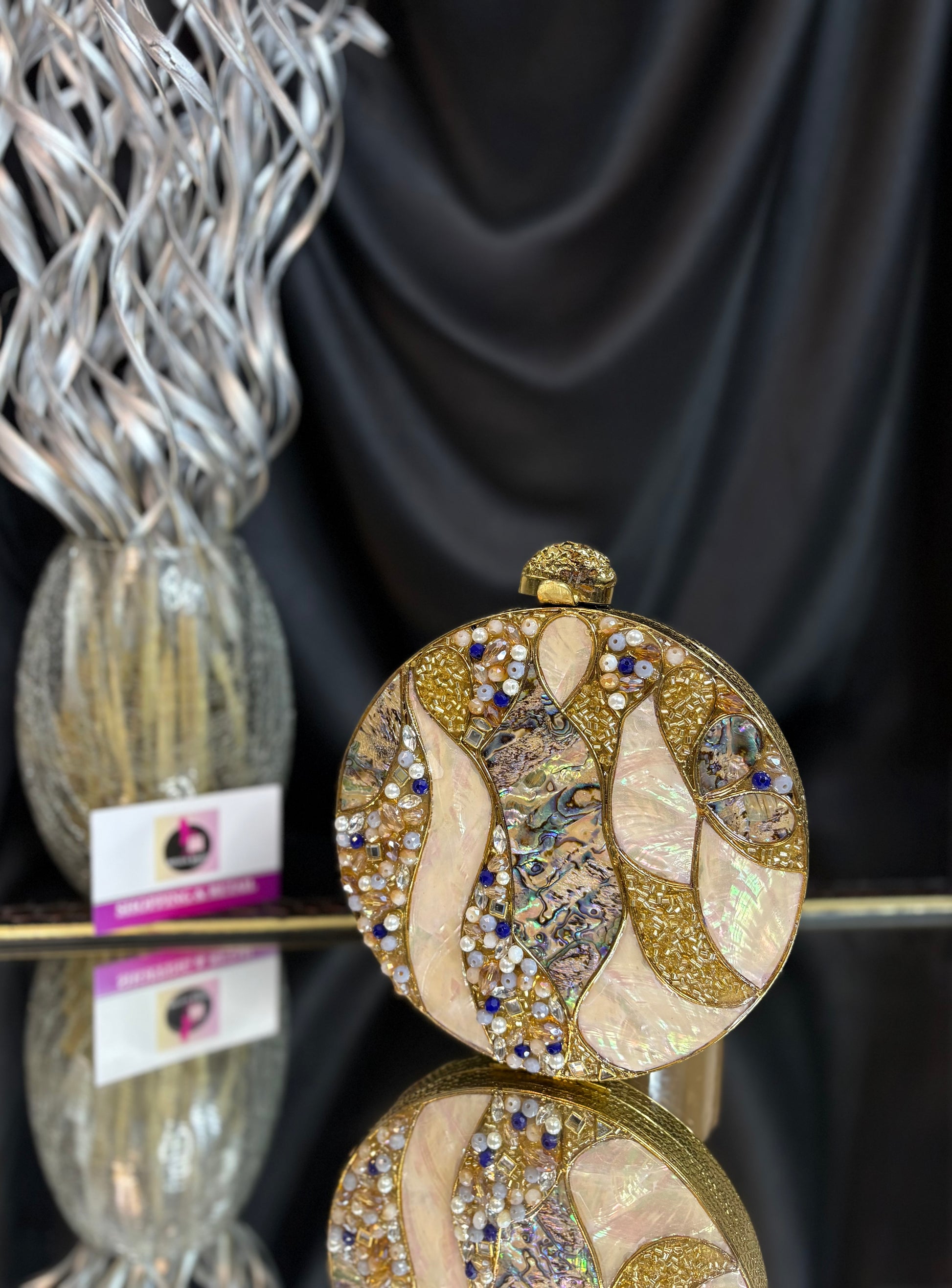 An elegant brass, mother-of-pearl clutch with a chain. Embellished with shimmering beads and stones,beautiful frame with rainbow holographic base featuring a luxurious finish.