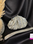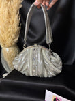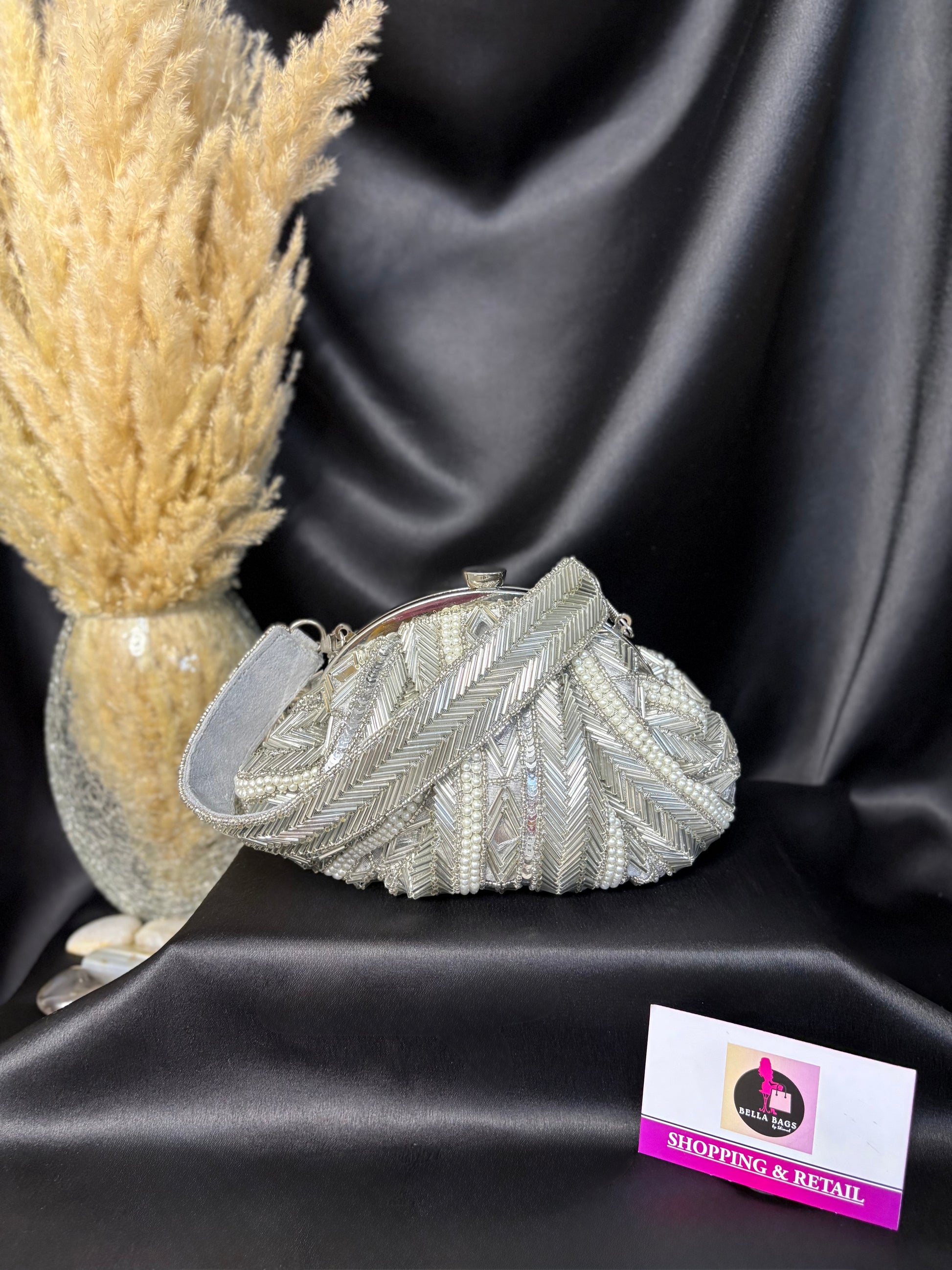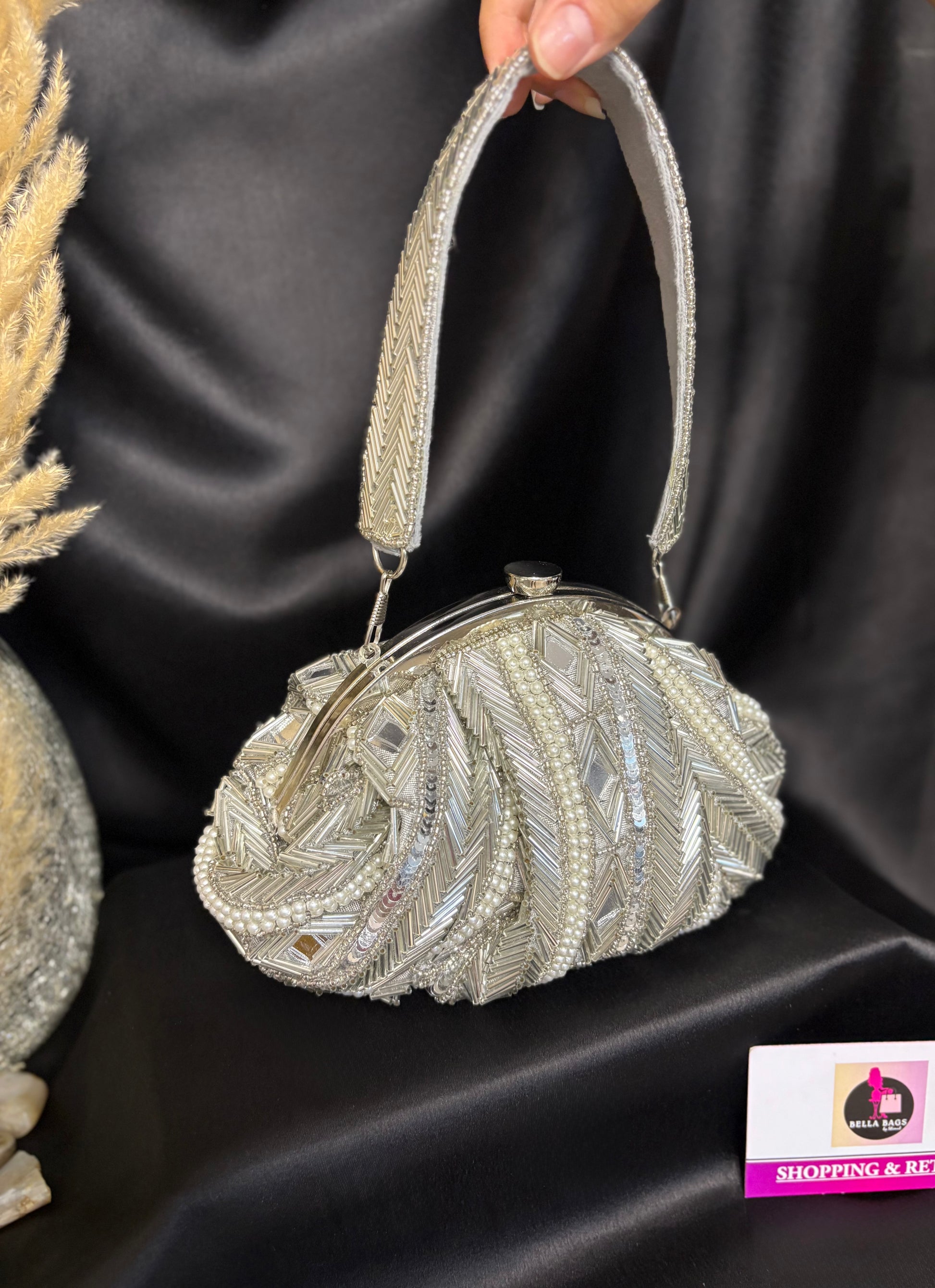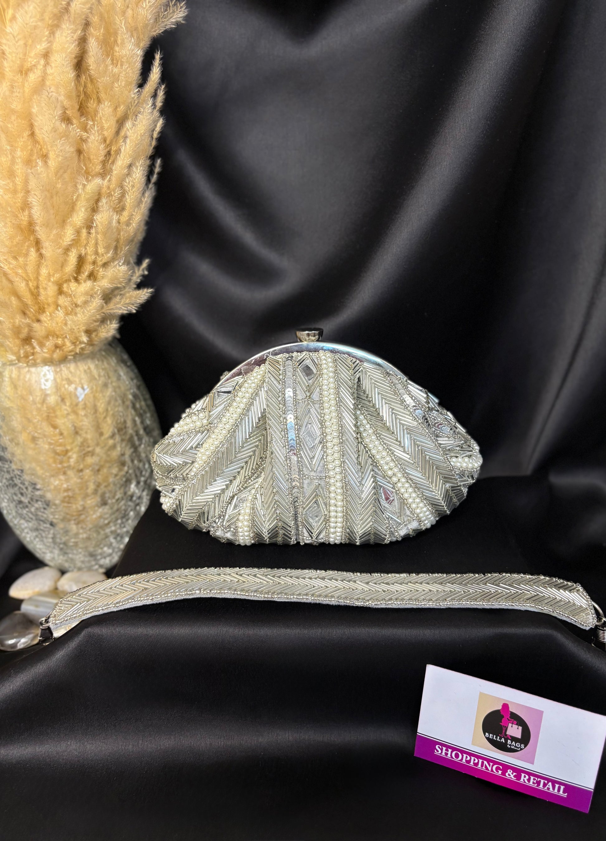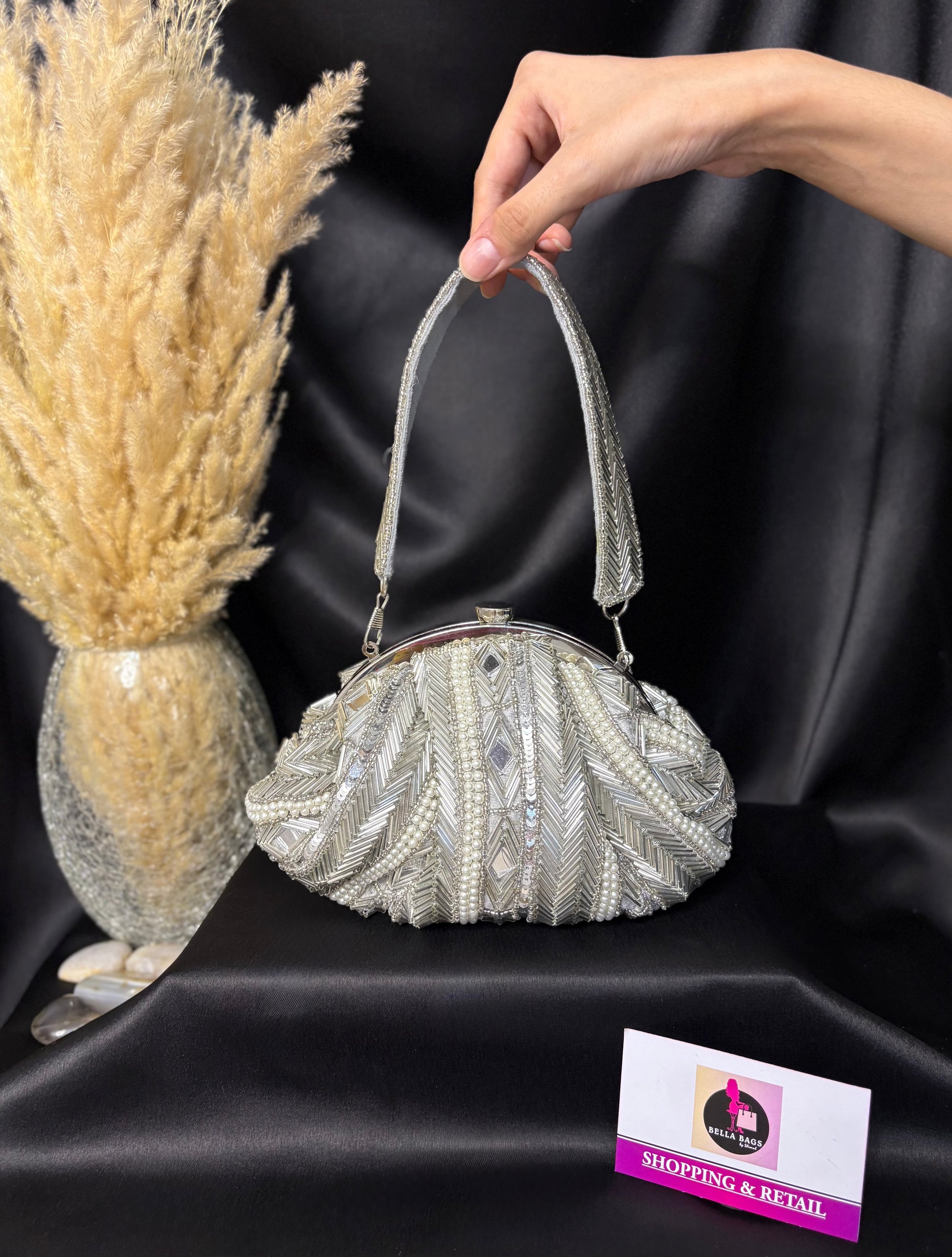 A vintage-inspired clutch intricately embellished with pearls and beads in chevron and mirror patterns. It features a sturdy embroidered handle and a classic metal clasp closure — an elegant blend of timeless style and modern shine. Outer Material: pearl and sequin. Phone Capacity: Phone will fit in. Sling: comes with a detachable handle. Closure: lock enclosure. Pocket: No Pocket. Care Instructions: Keep it in a protective space when not in use and keep it away from moisture. Carry delicately!. e.