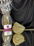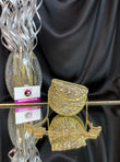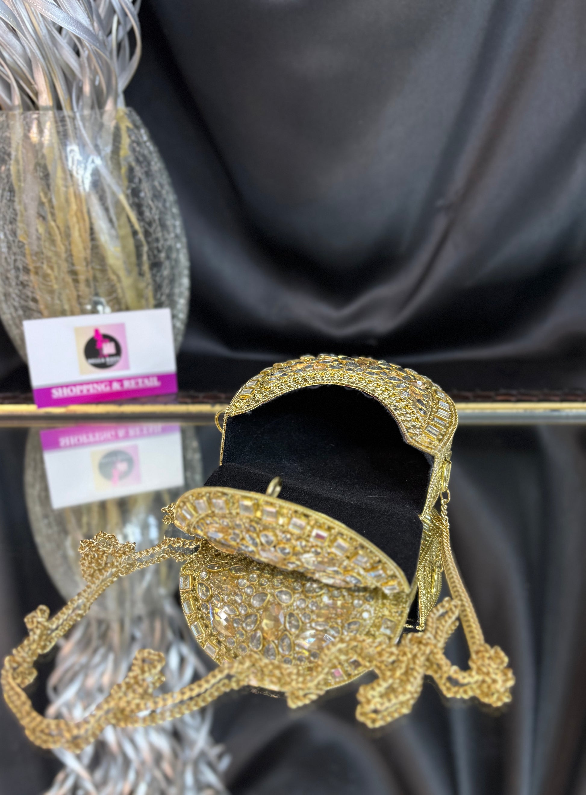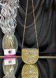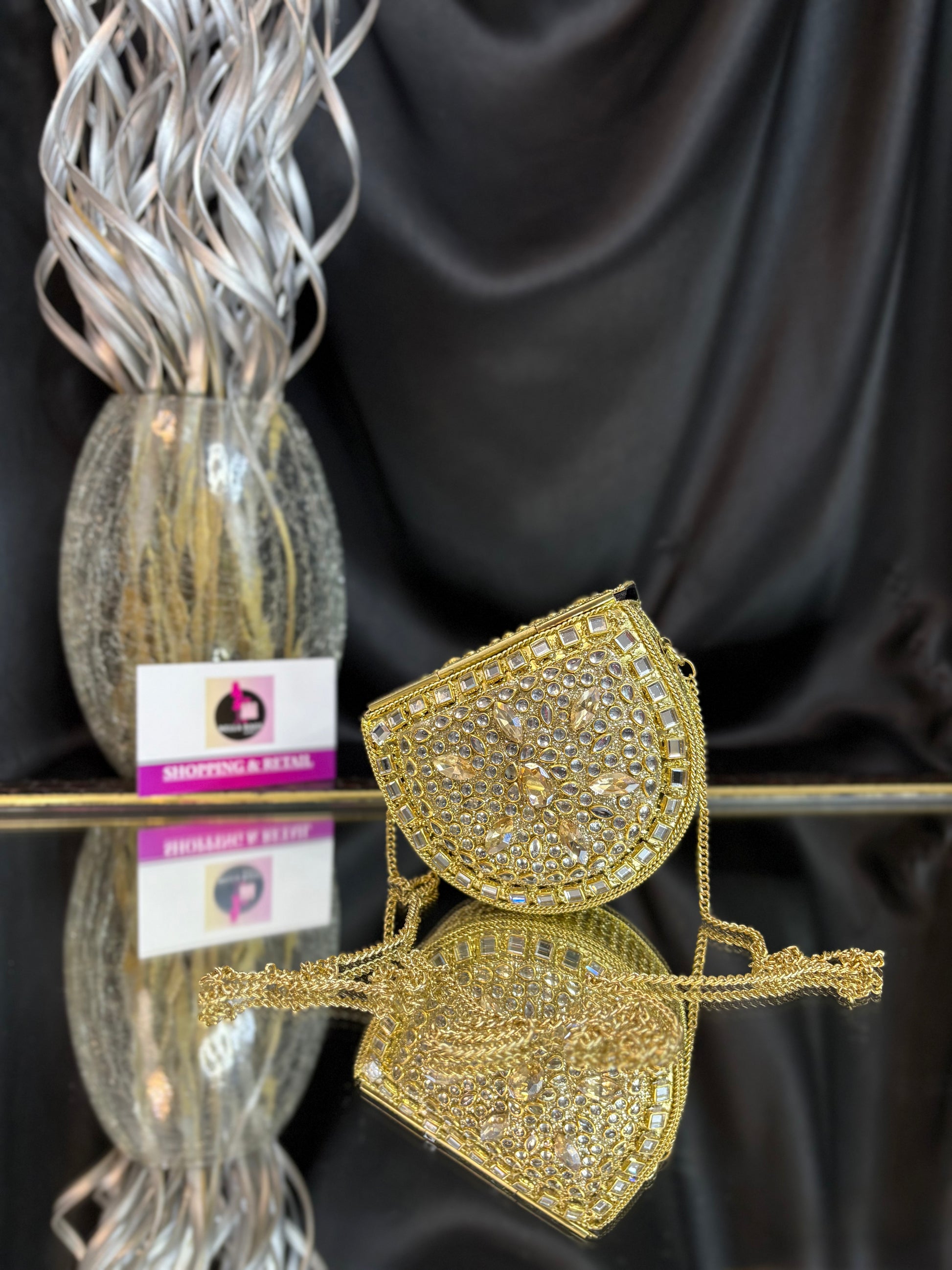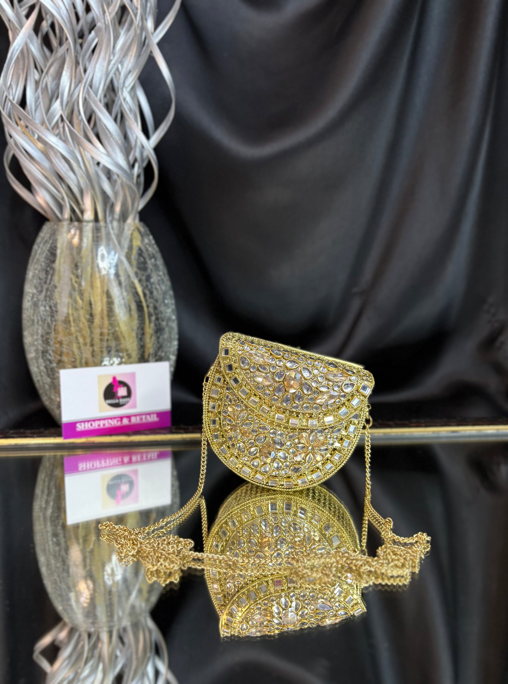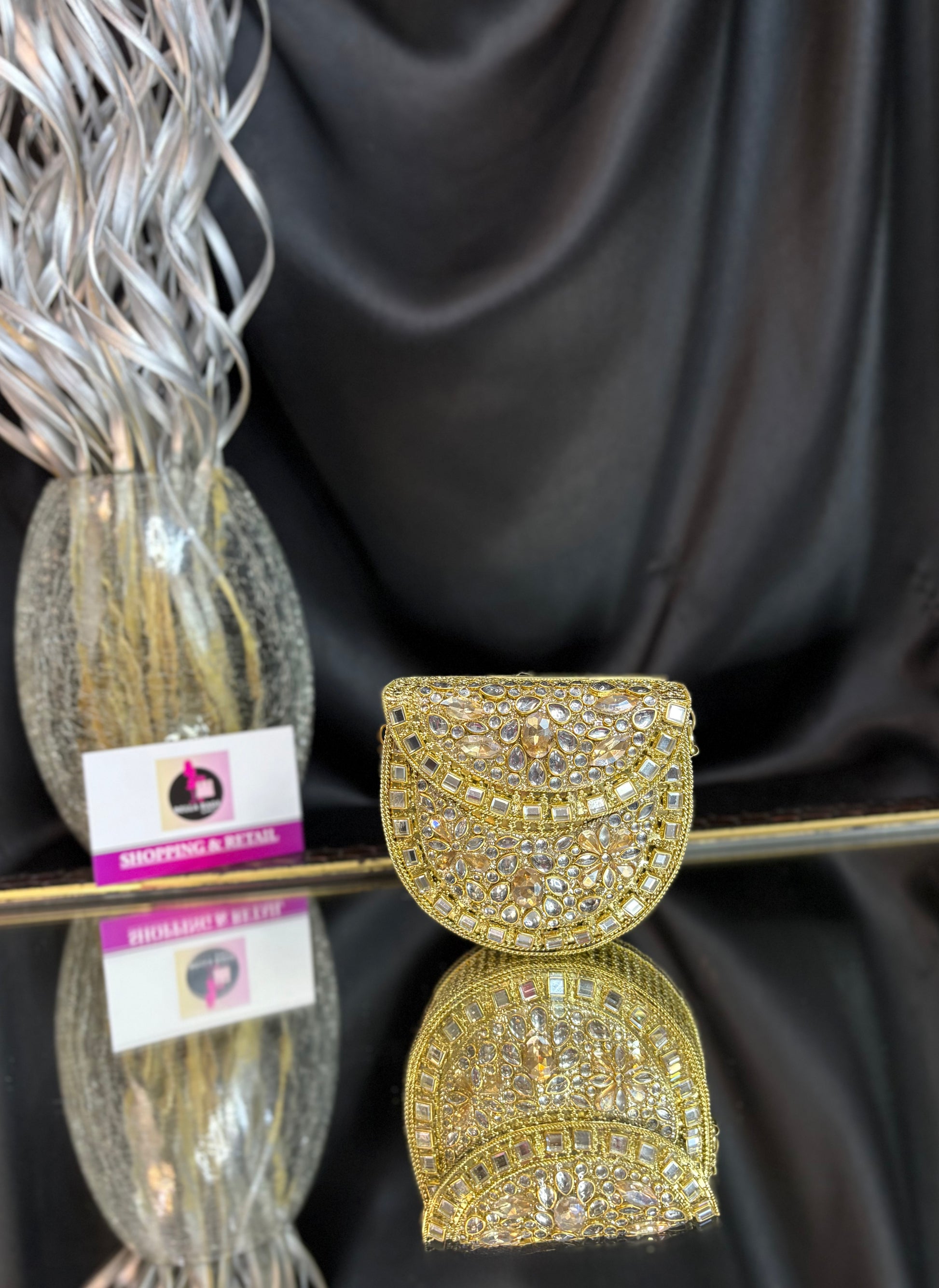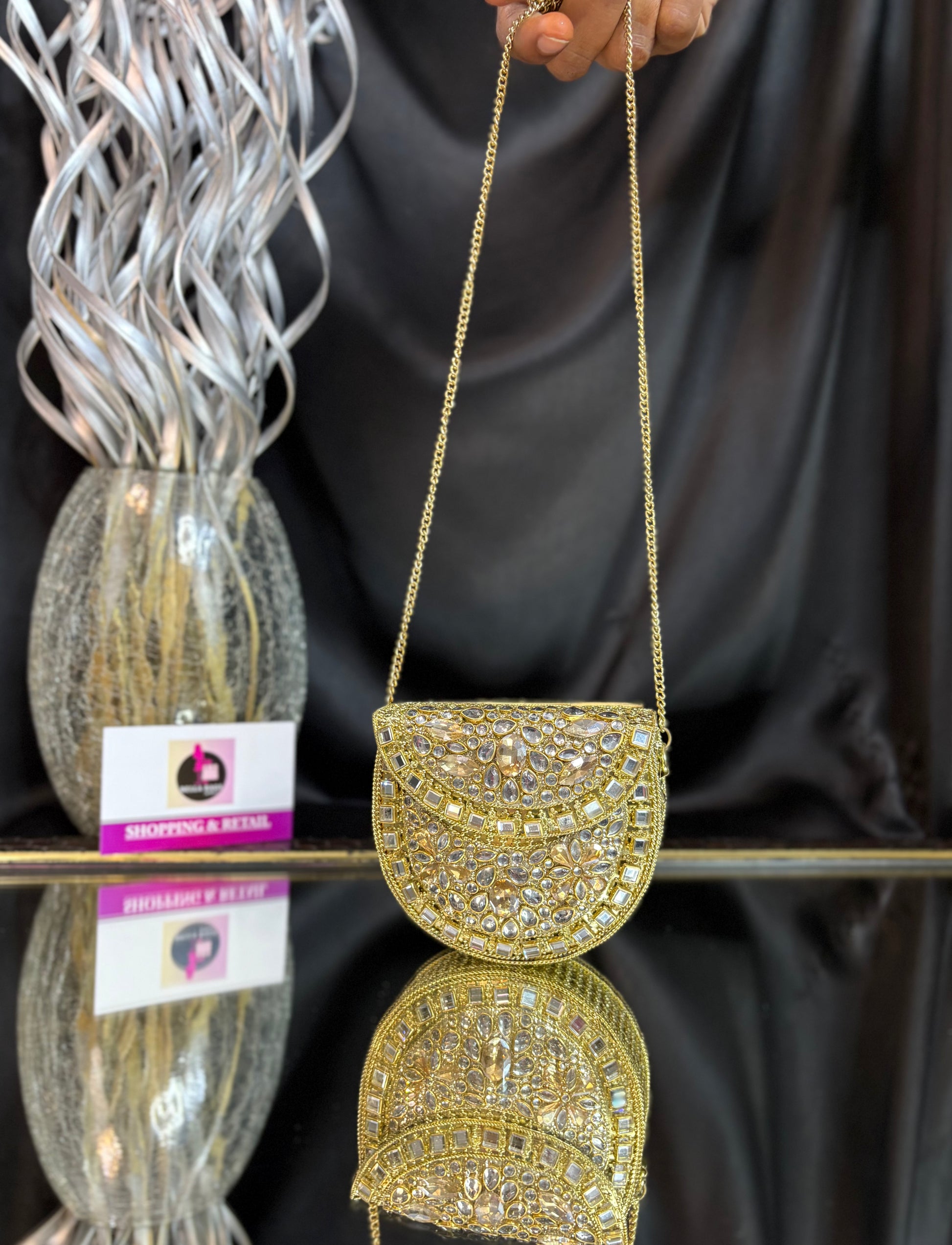 A luxe Kundan-studded mini clutch crafted to perfection. It features a gleaming gold chain and a half-moon silhouette that adds timeless charm to every outfit. Perfect for weddings, parties, and all things glam.