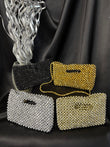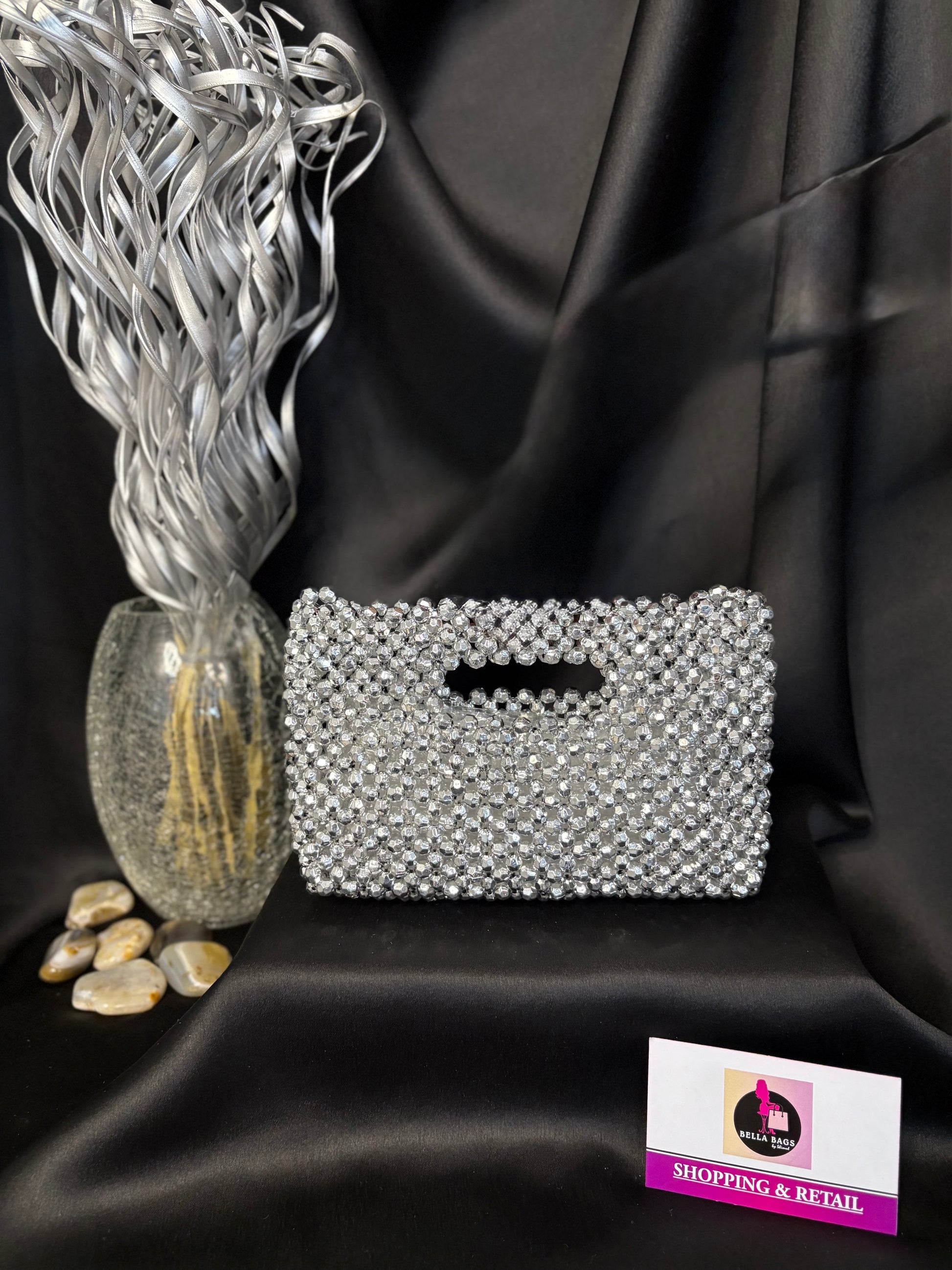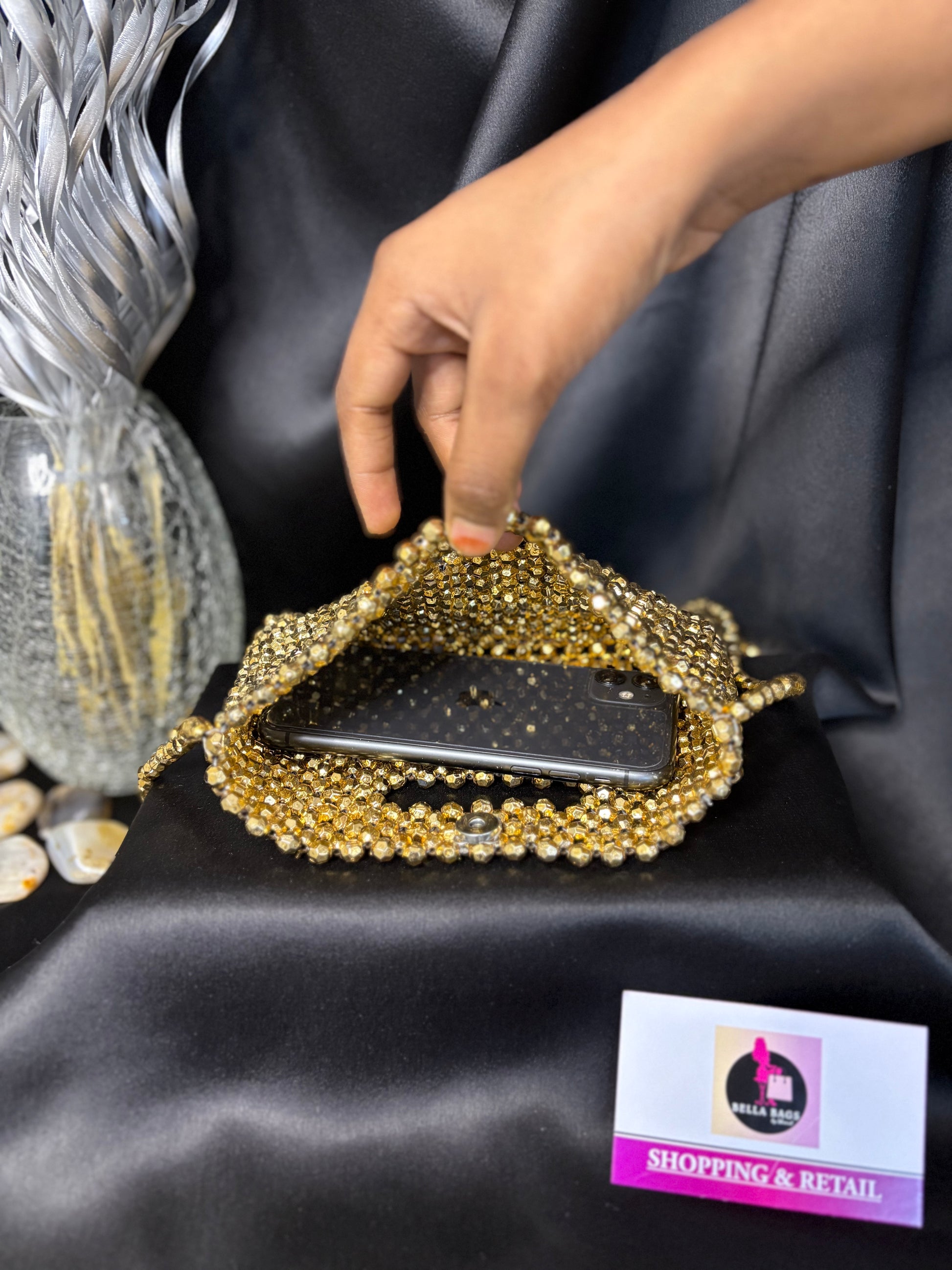 Elegant mini bead clutches perfect for parties, weddings, or evening events. Each piece has a sleek handle design and adds a sparkling touch to your outfit. Outer Material: premium beads. Phone Capacity: Phone fits in (iPhone 11 shown). Sling: attached sling chain. Closure: magnetic closure. Pocket: No Pocket. Care Instructions: Keep it in a protective space when not in use and keep it away from moisture. Carry delicately!