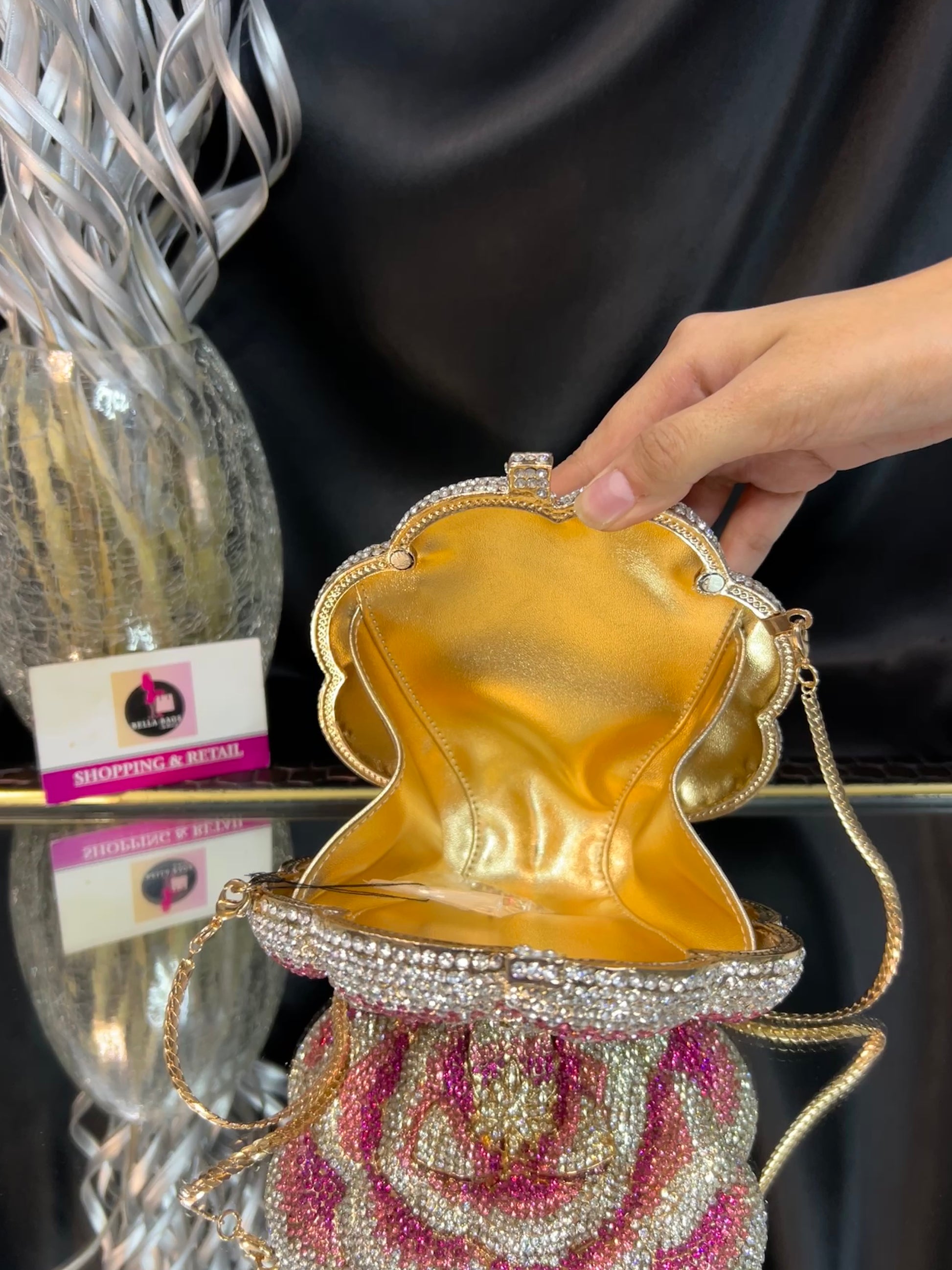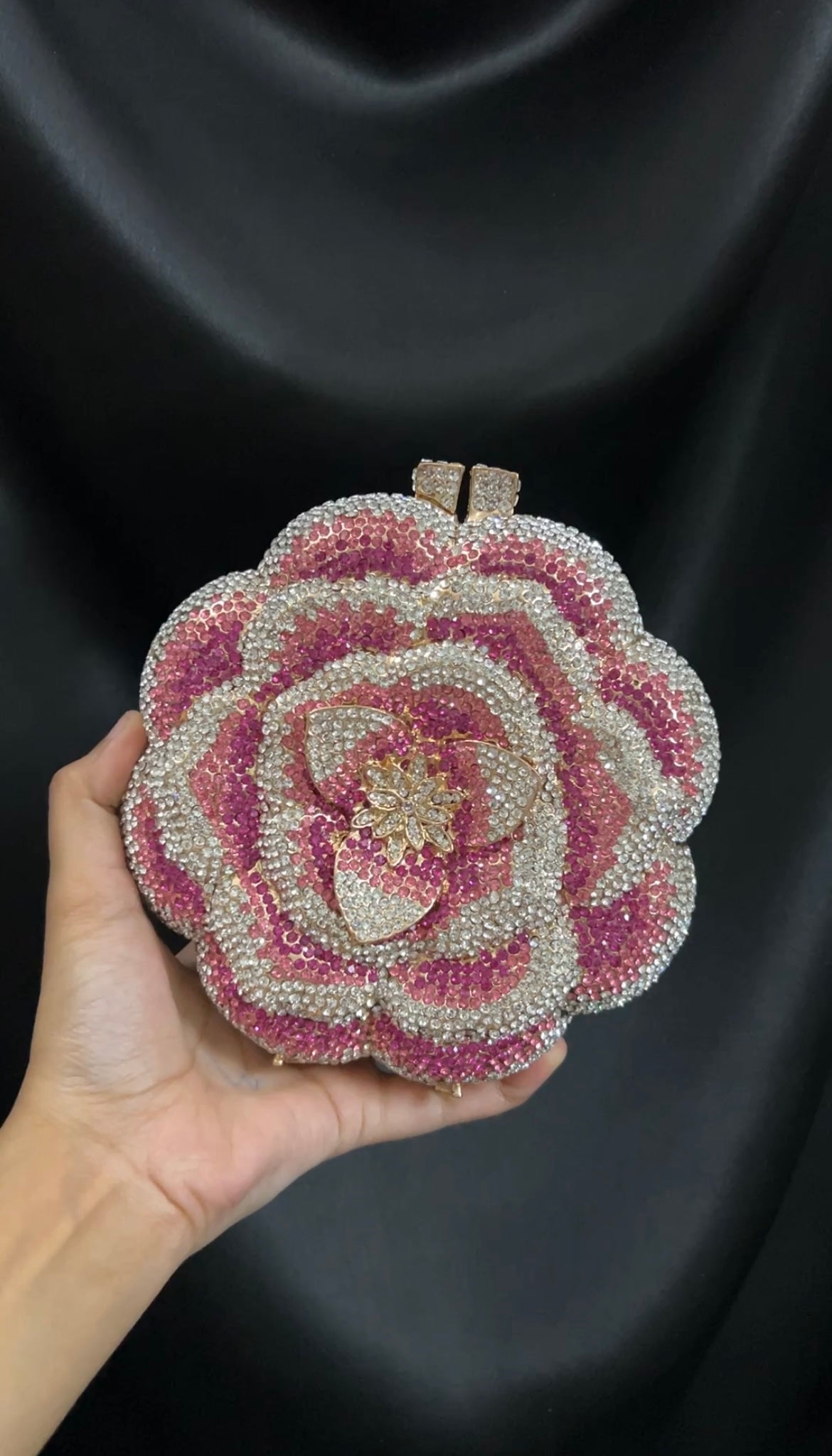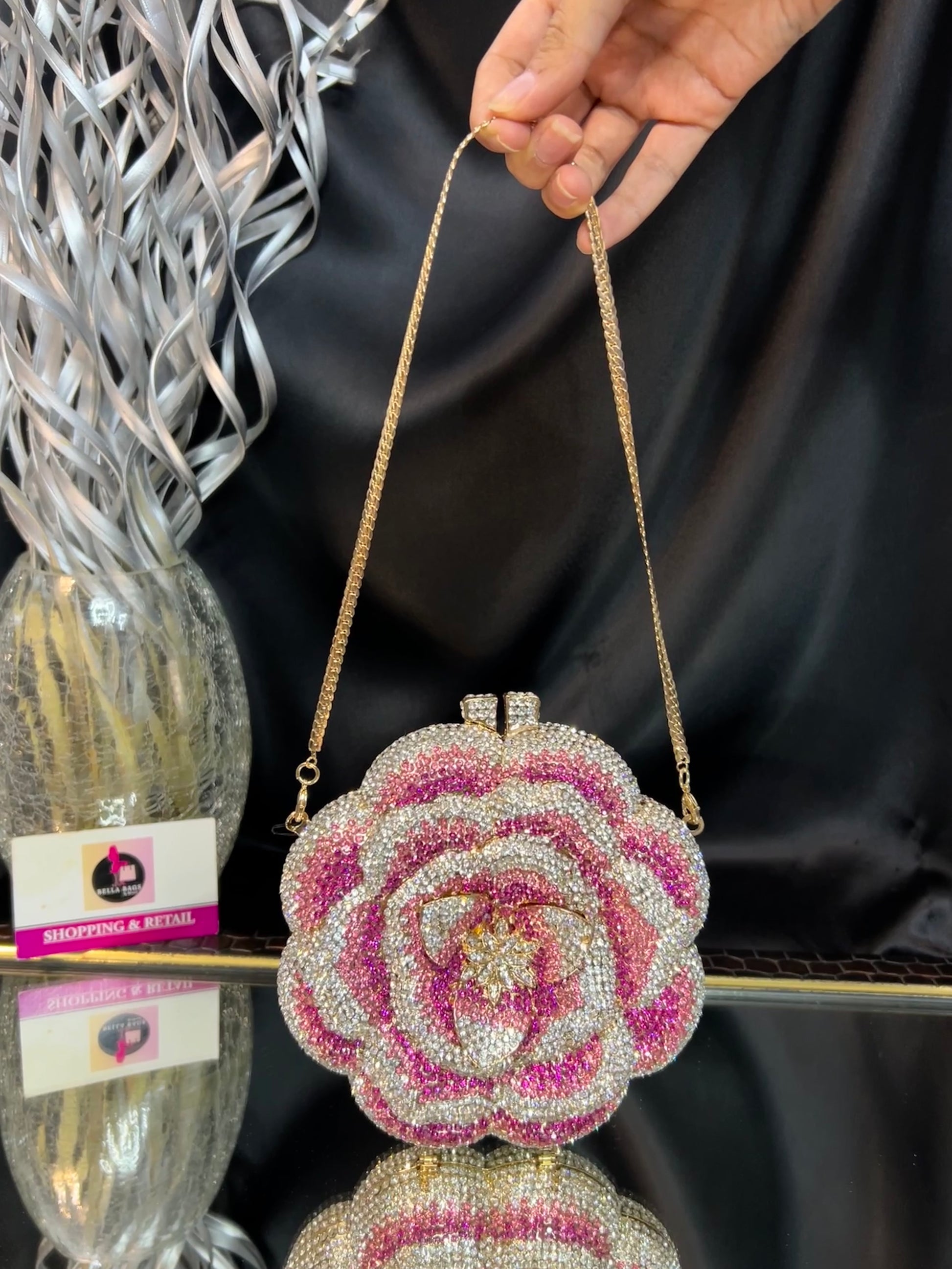 A stunning flower-shaped clutch adorned with shimmering silver and pink crystals, paired with a delicate gold chain strap — a perfect statement piece for elegant occasions.