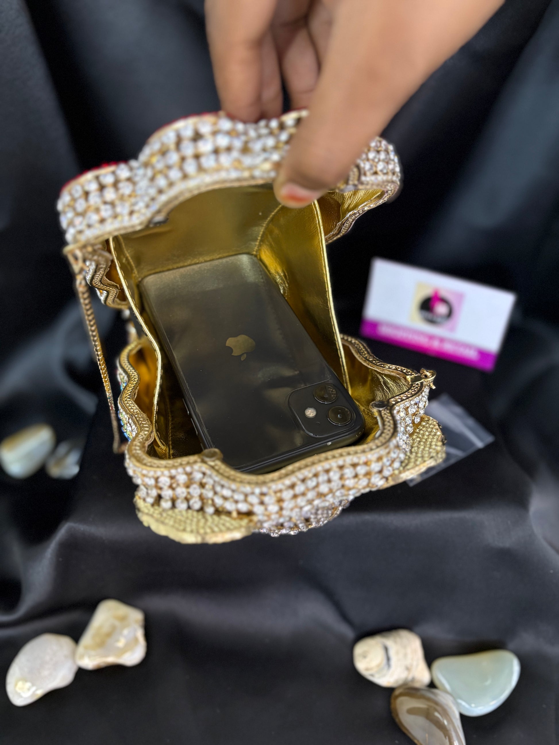 Carry your essentials in style with Ganesha Crystal Clutch. The beautiful shape and sparkling crystals make it an eye-catching accessory. This clutch is perfect for special occasions and will add a touch of elegance to any outfit. sling; comes with a sling chain. closure; magnetic closure, crystals; few extra crystals provided. space; fits in essentials, Phone will fit (approx 5.85 inches- Iphone 11 shown)