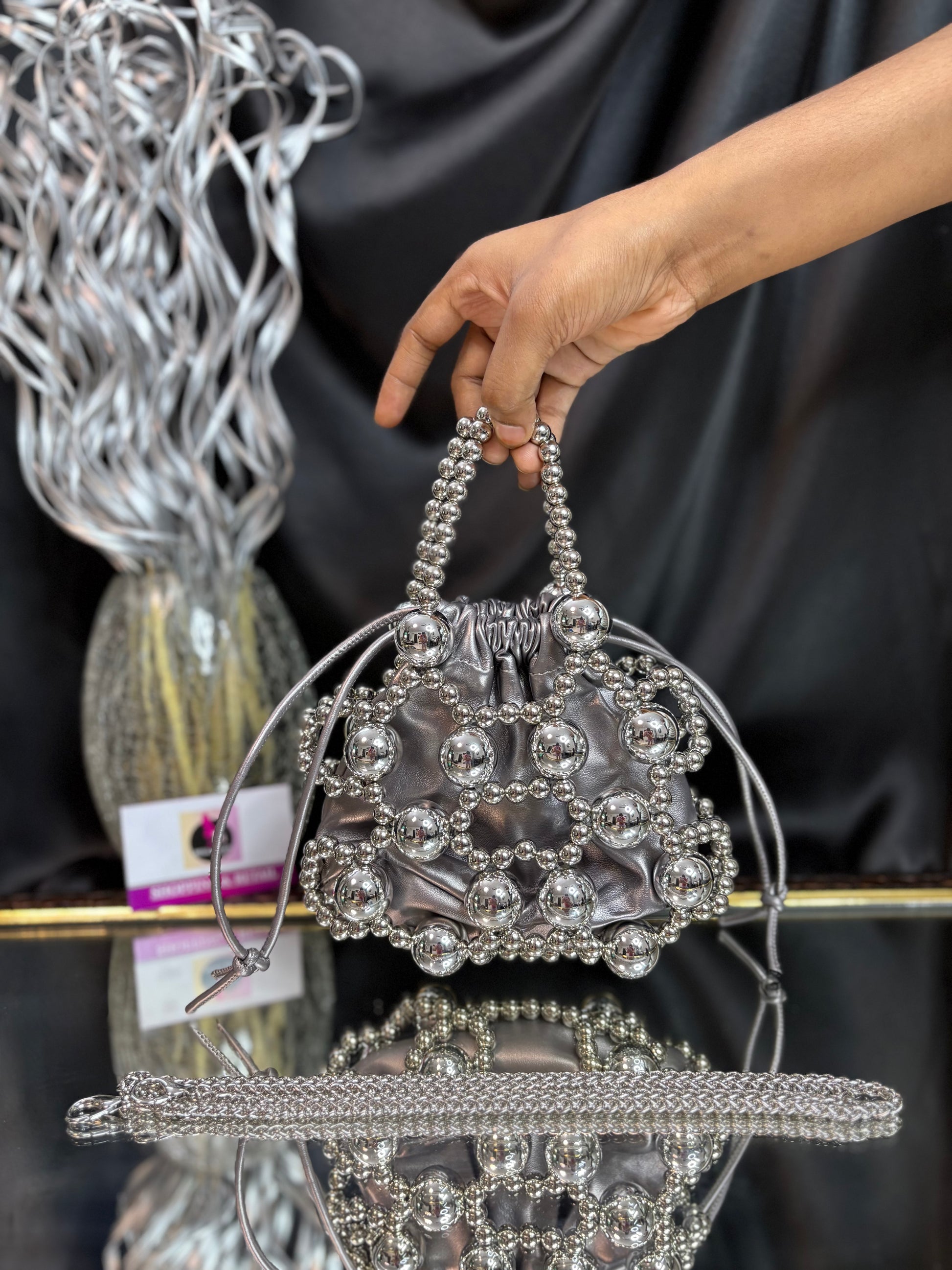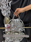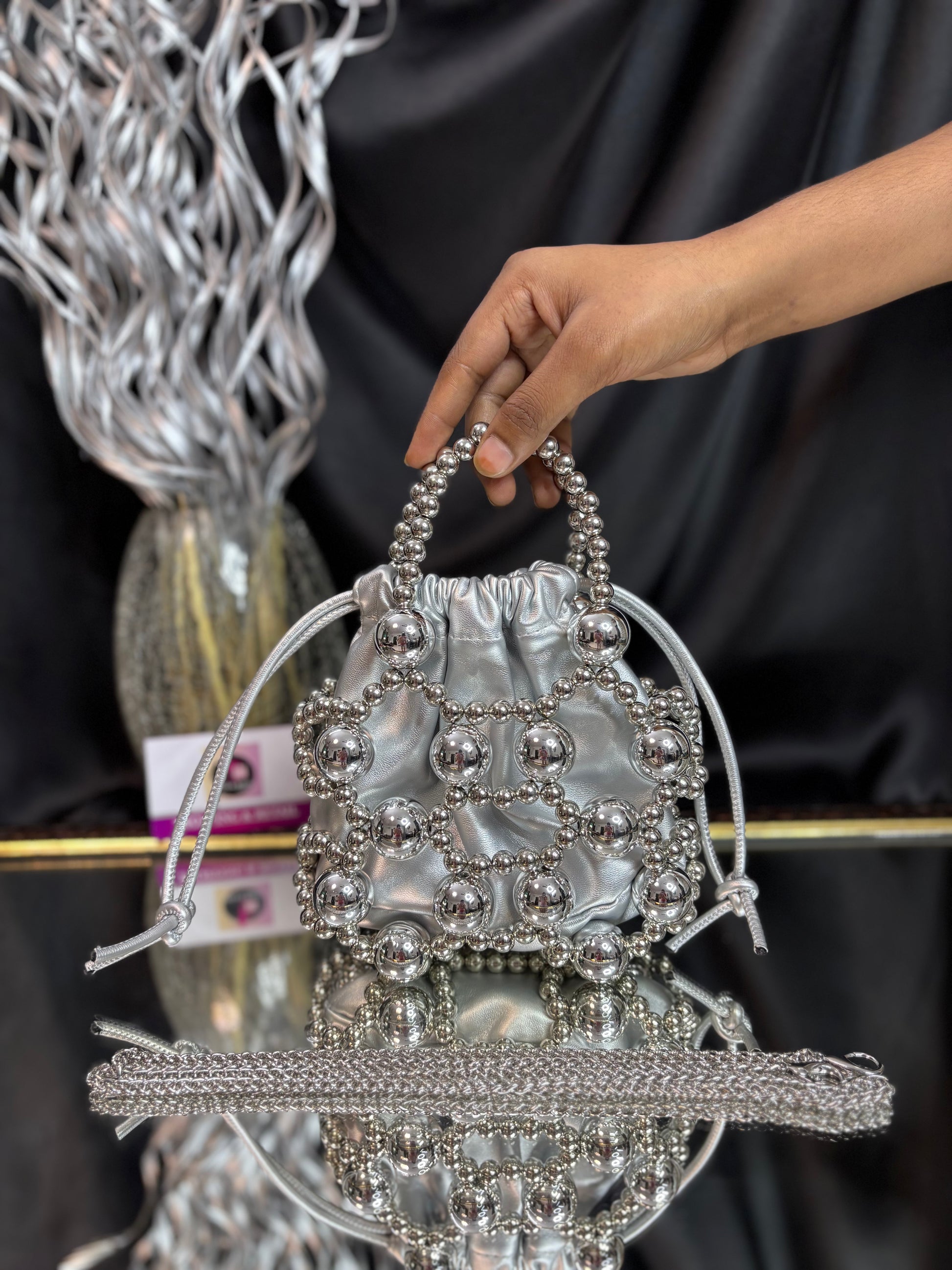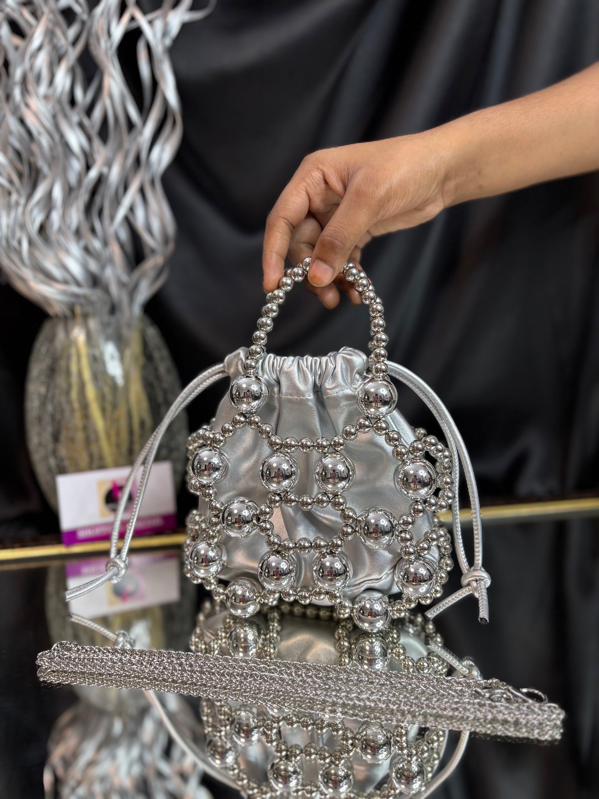 A contemporary potli bag wrapped in a bold silver bead cage, featuring a matching beaded handle and sling — a striking blend of modern edge and festive flair. Outer Material: metal and fabric. Phone Capacity: Phone will fit in. Sling: comes with a sling chain. Closure: Drawstrings. Pocket: No Pocket. Care Instructions: Keep it in a protective space when not in use and keep it away from moisture. Carry delicately!.