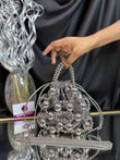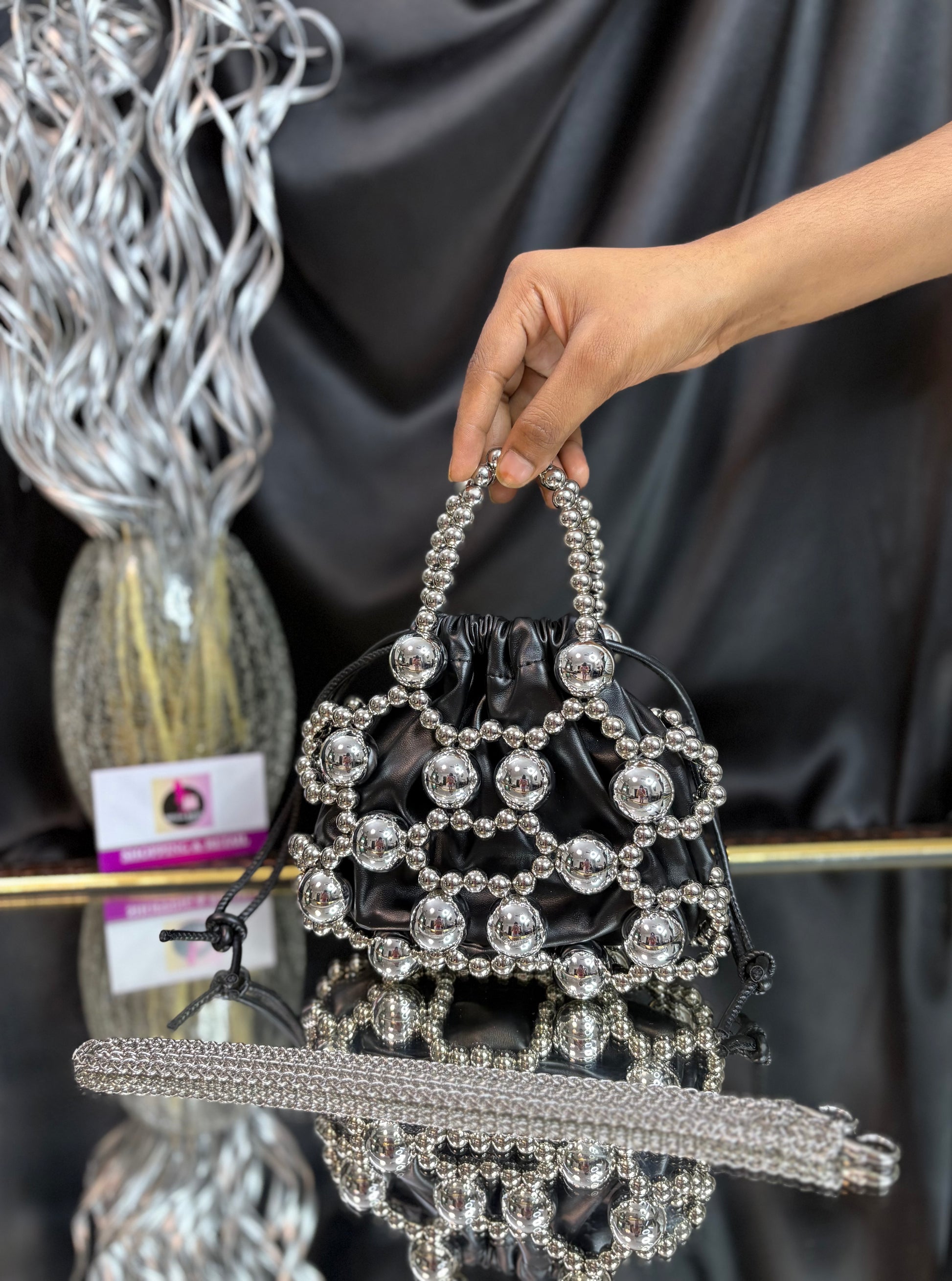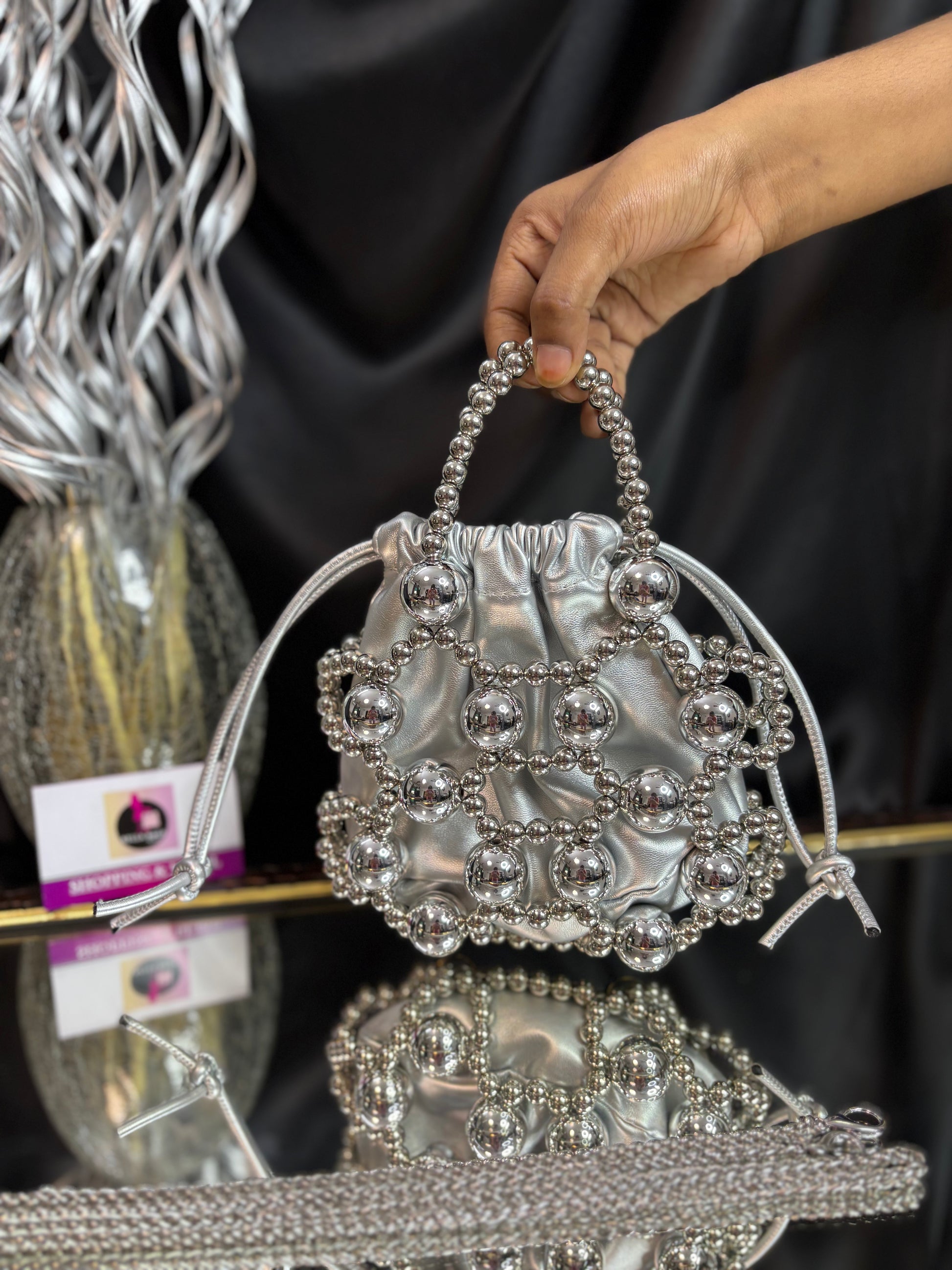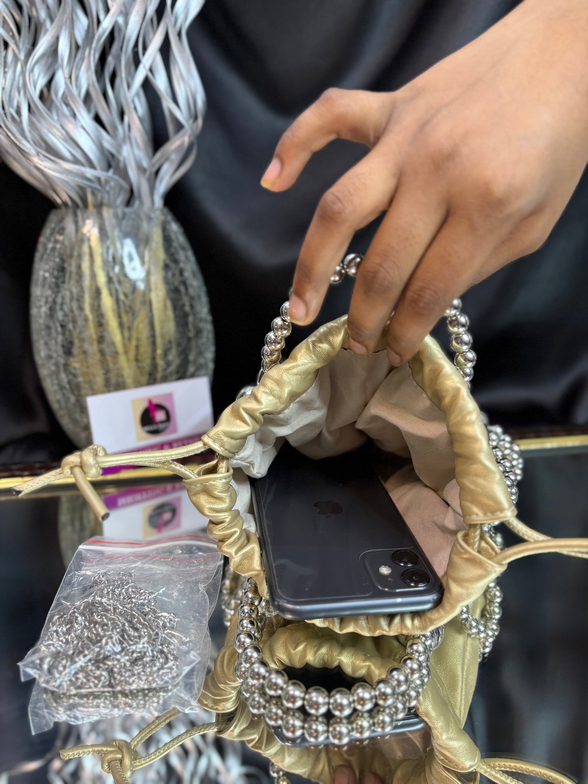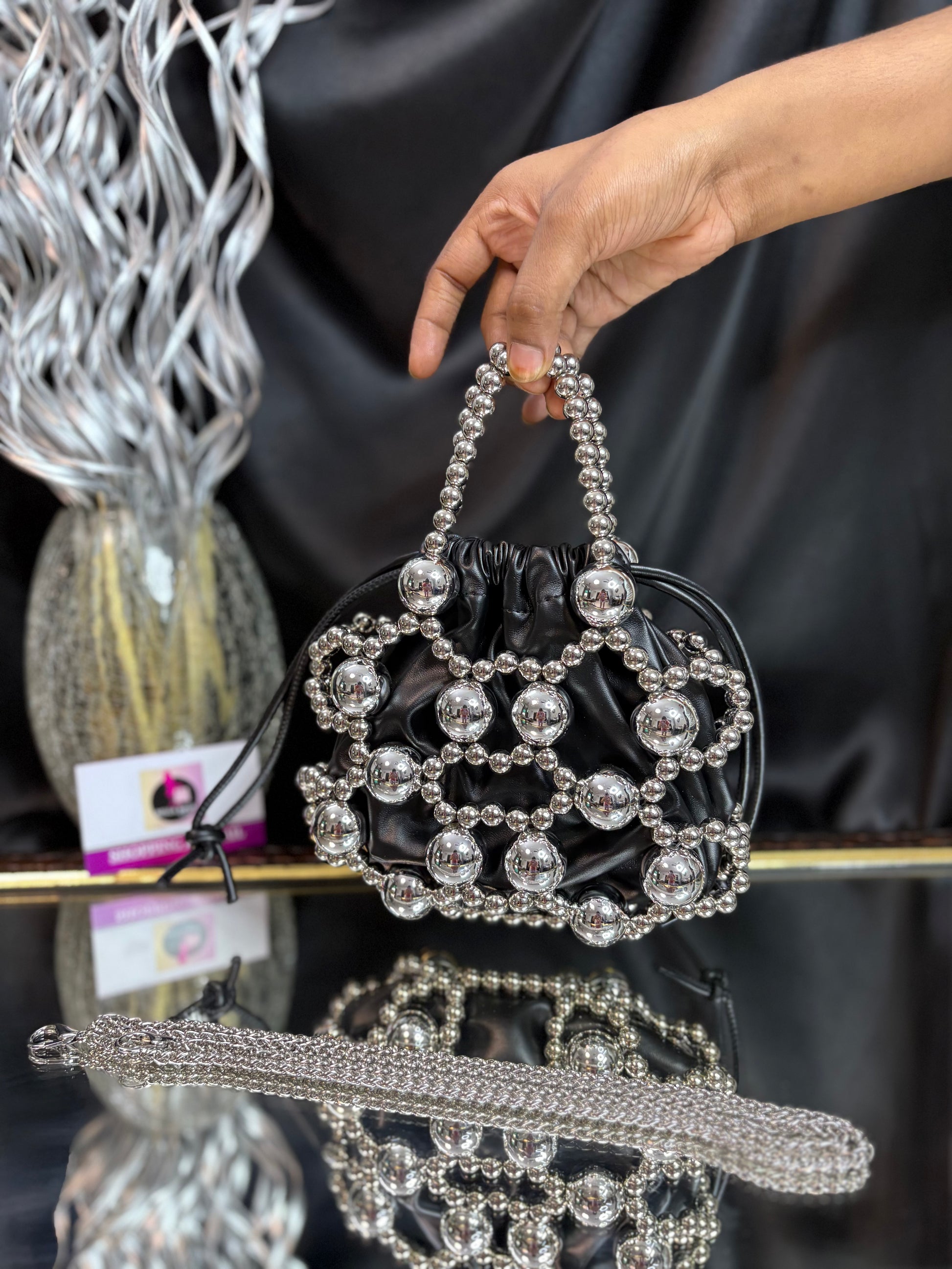 A contemporary potli bag wrapped in a bold silver bead cage, featuring a matching beaded handle and sling — a striking blend of modern edge and festive flair. Outer Material: metal and fabric. Phone Capacity: Phone will fit in. Sling: comes with a sling chain. Closure: Drawstrings. Pocket: No Pocket. Care Instructions: Keep it in a protective space when not in use and keep it away from moisture. Carry delicately!.