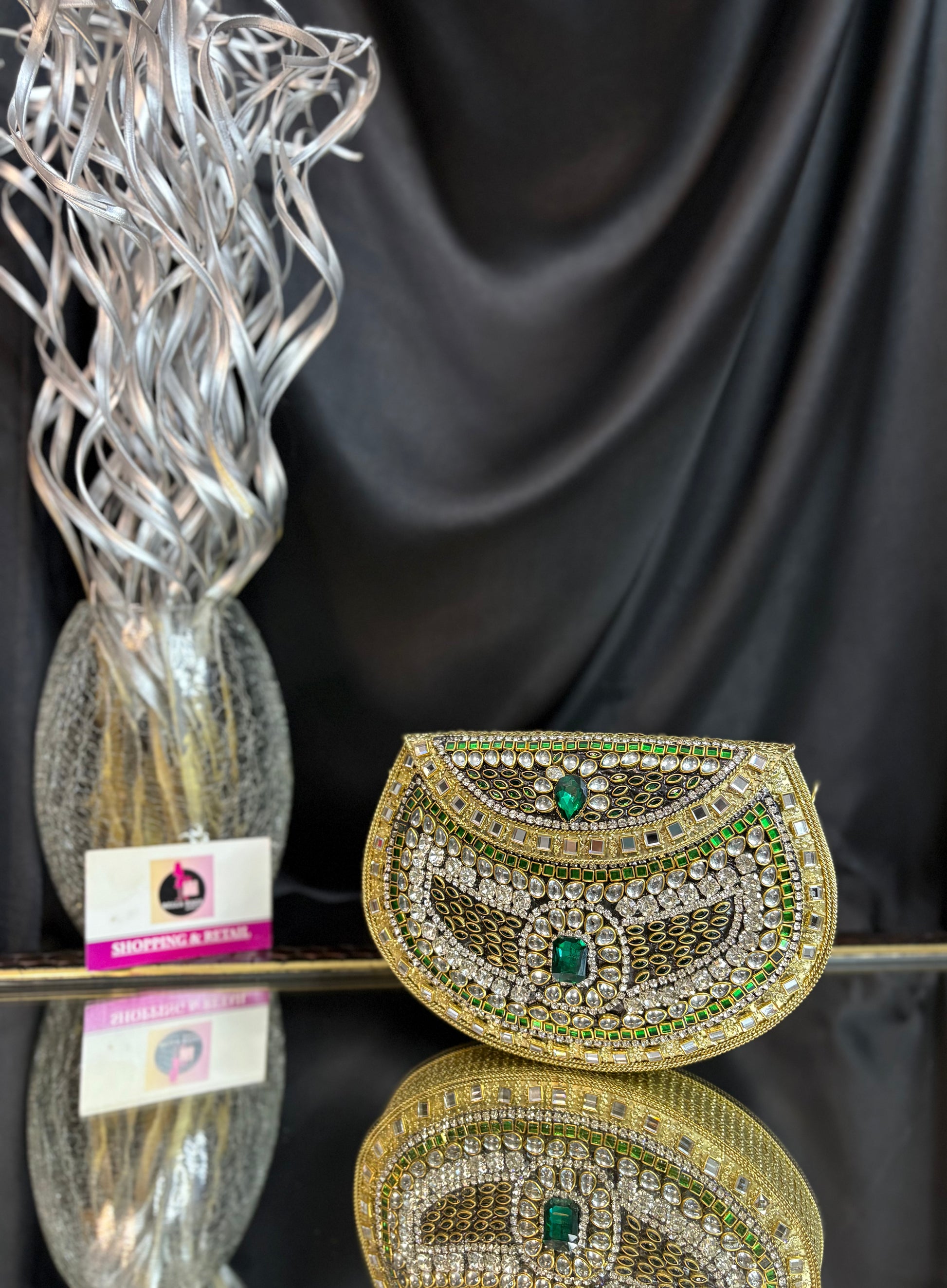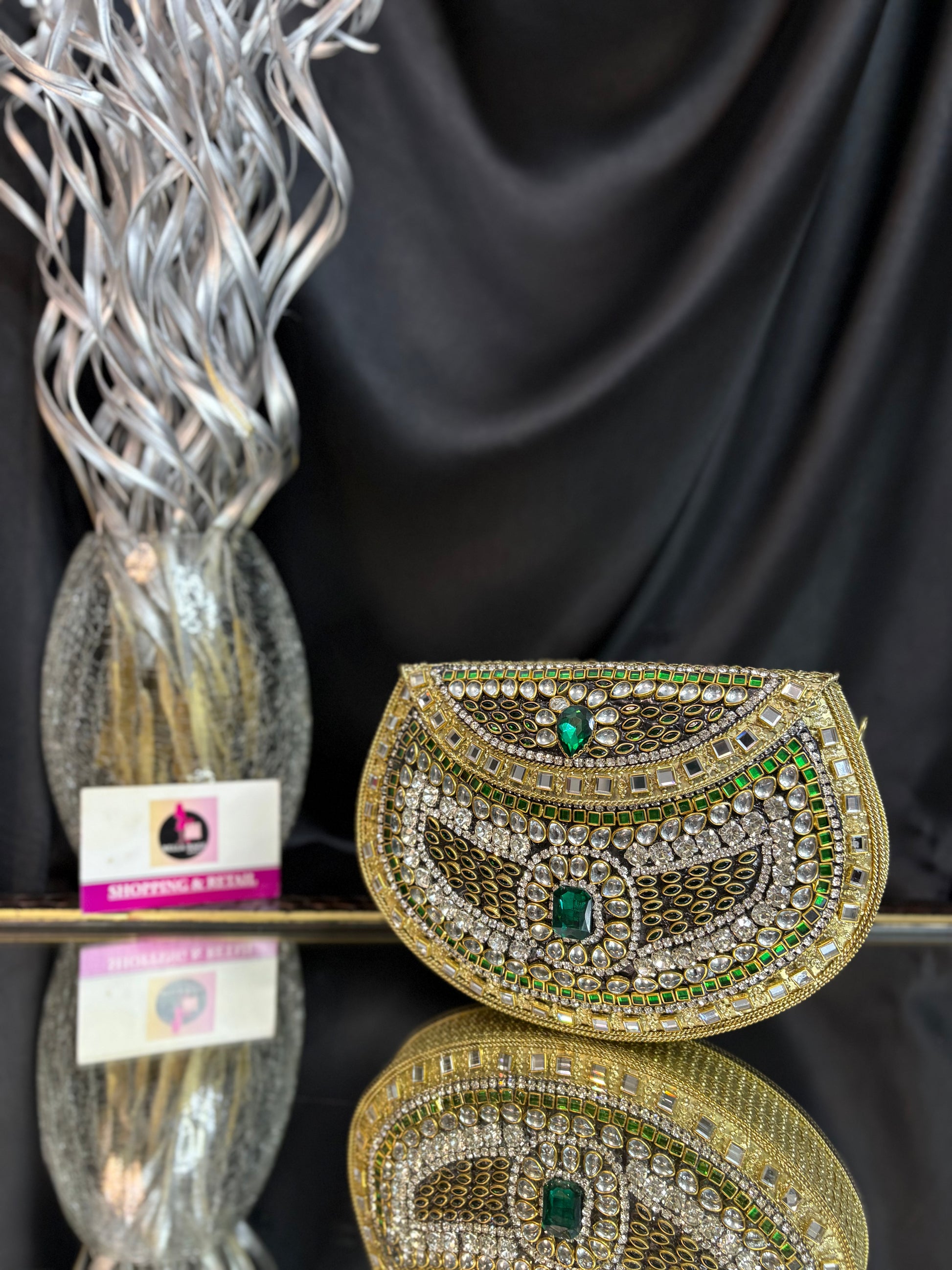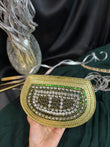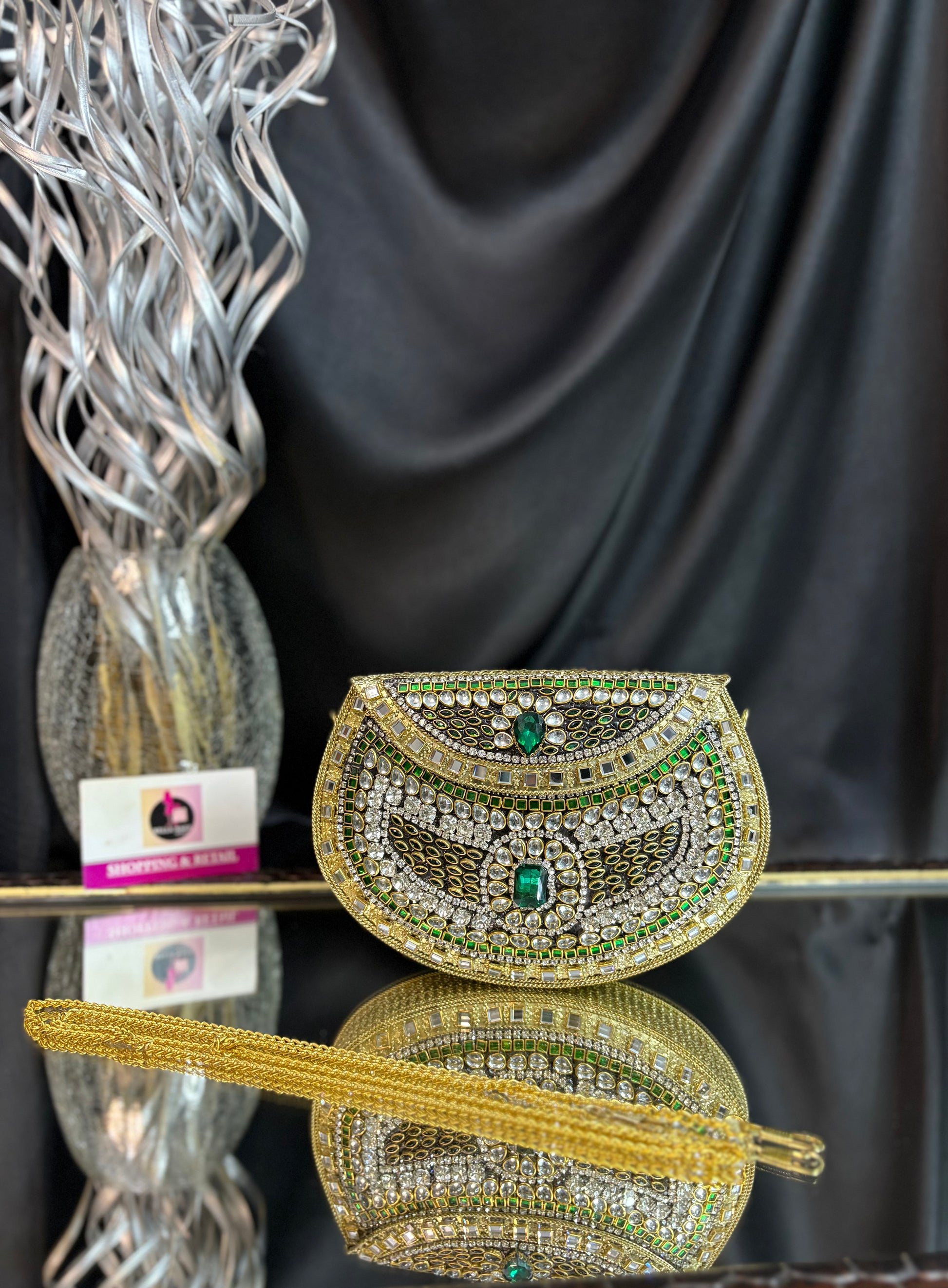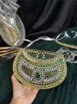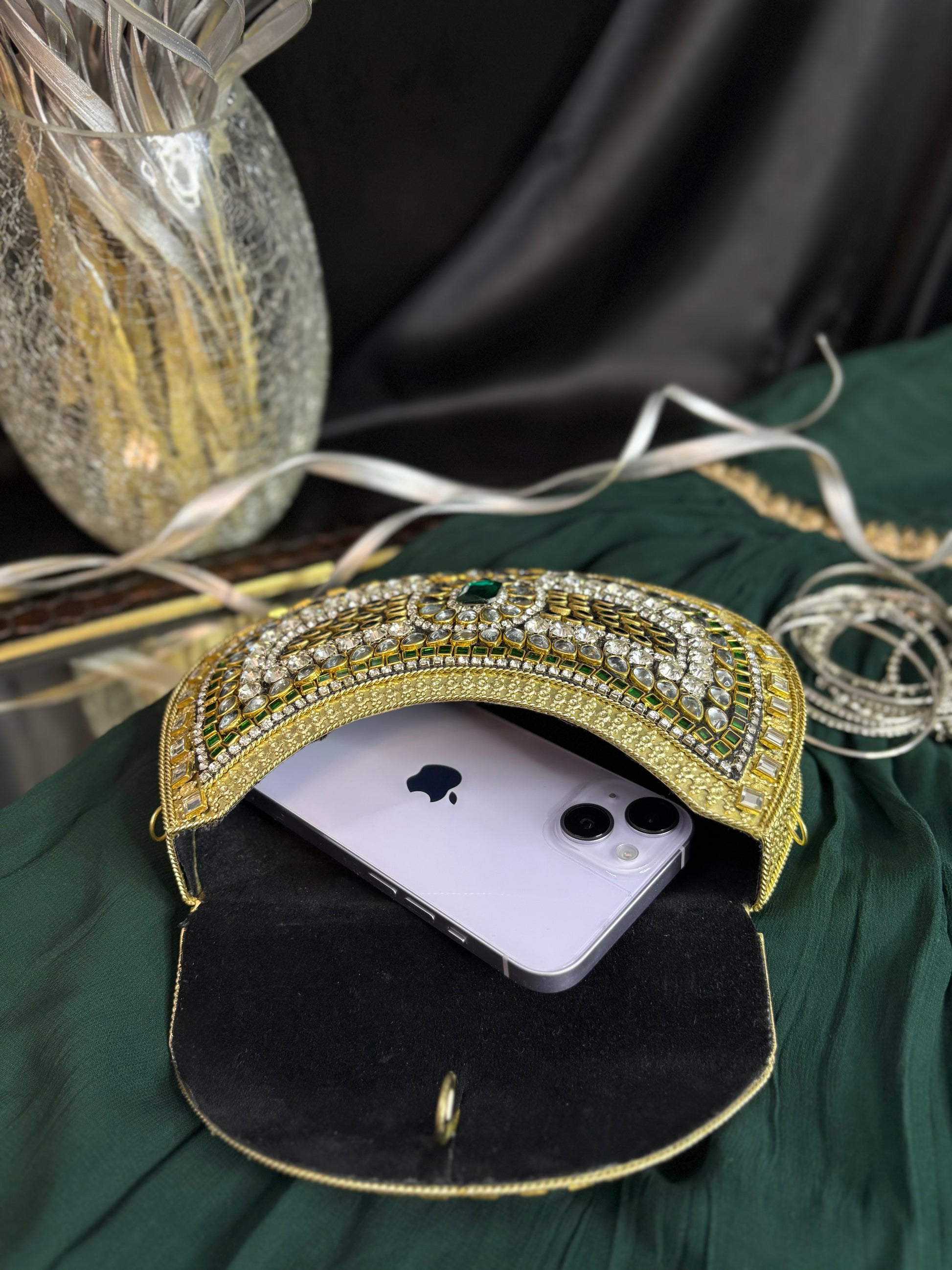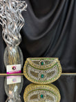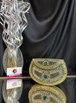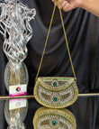 A stunning handcrafted Kundan clutch featuring intricate detailing in gold metalwork, embellished with dazzling white stones and emerald-green accents. Perfect for weddings, festive occasions, and evening parties, this statement piece adds a royal touch to any outfit.