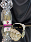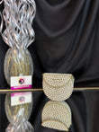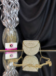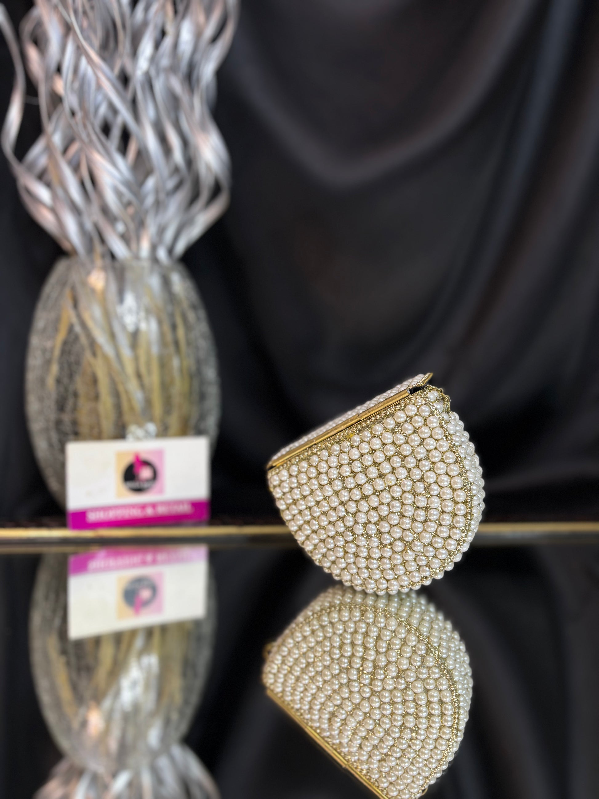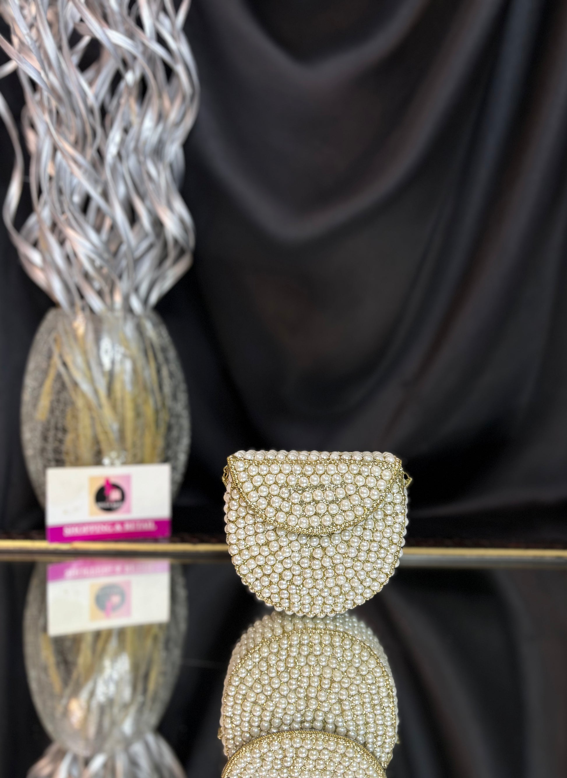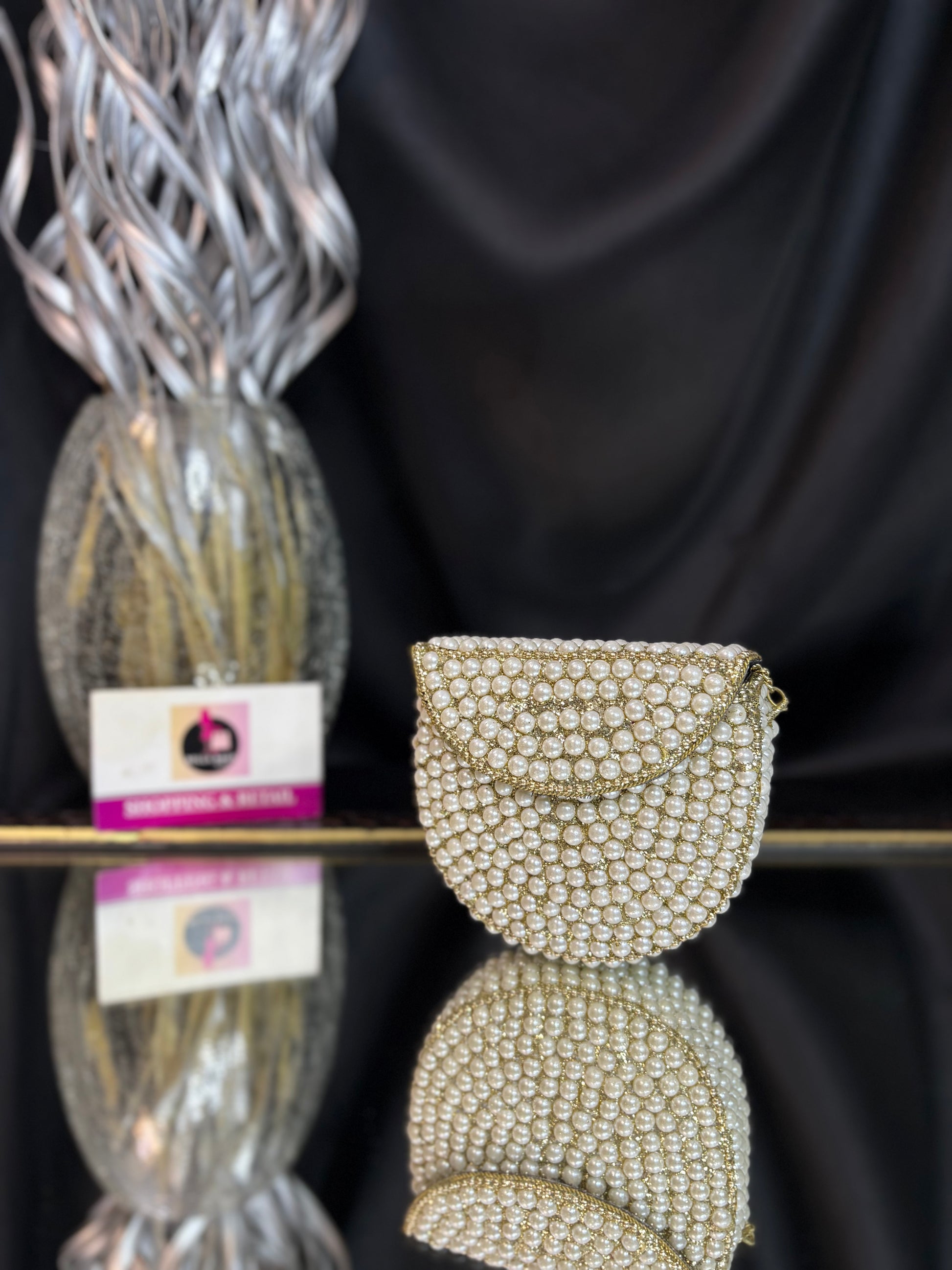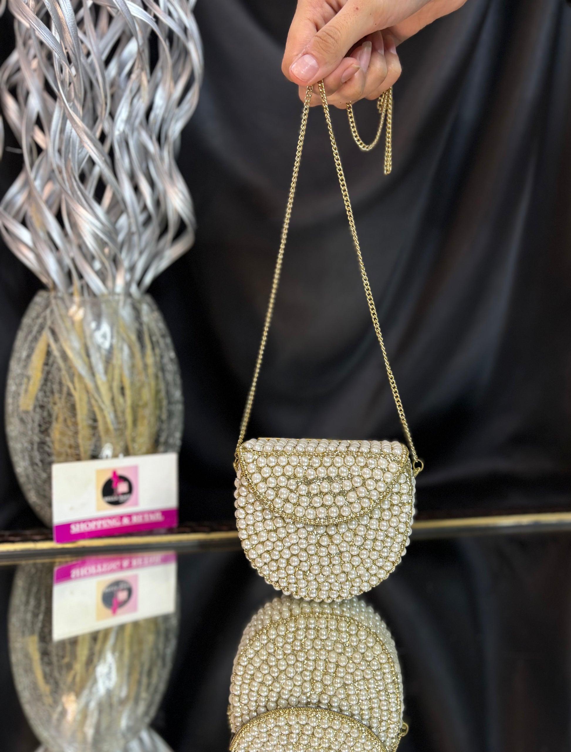 A luxe pearl-studded mini clutch crafted to perfection. It features a gleaming gold chain and a half-moon silhouette that adds timeless charm to every outfit. Perfect for weddings, parties, and all things glam.