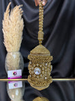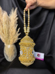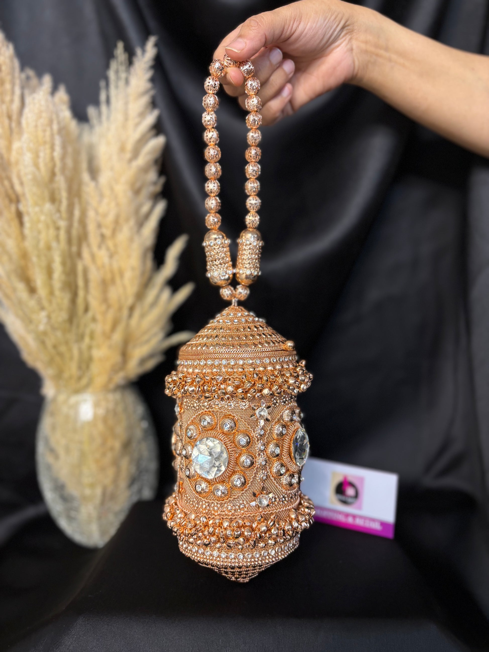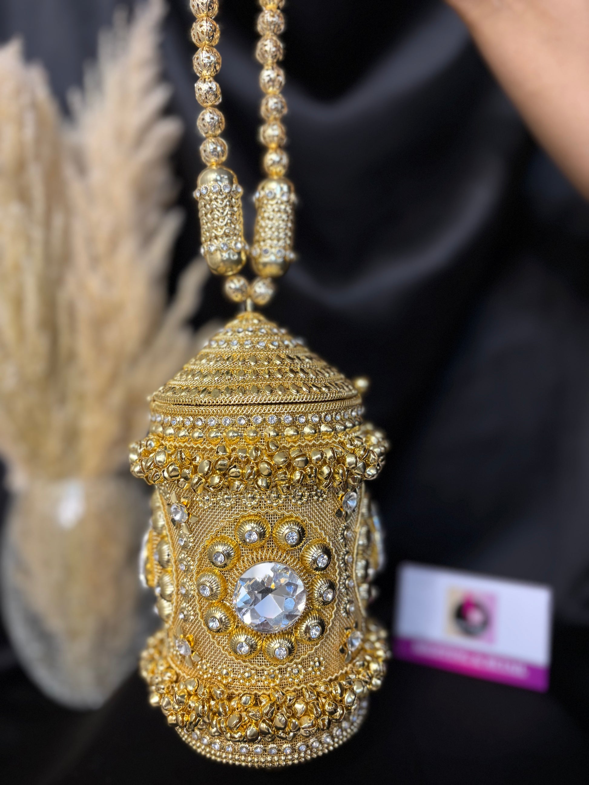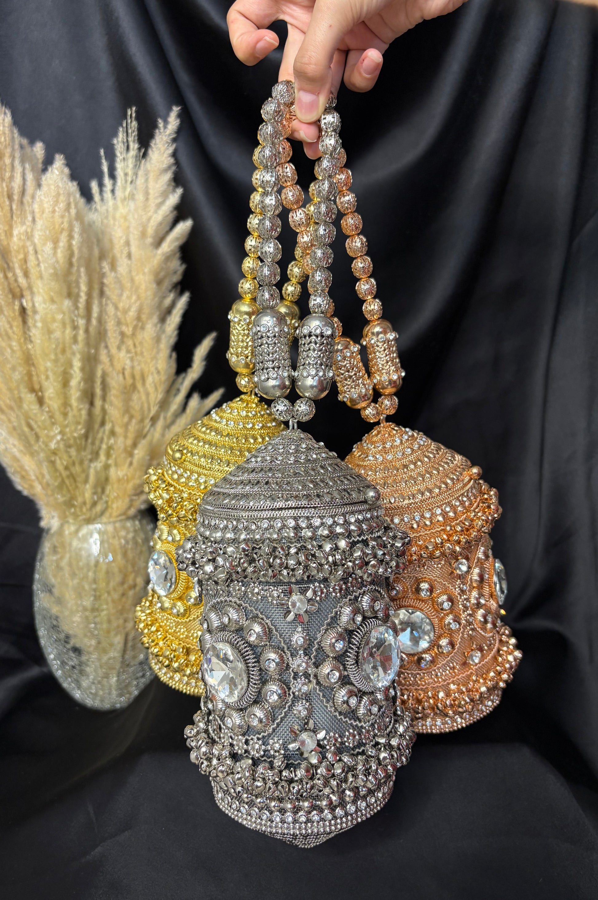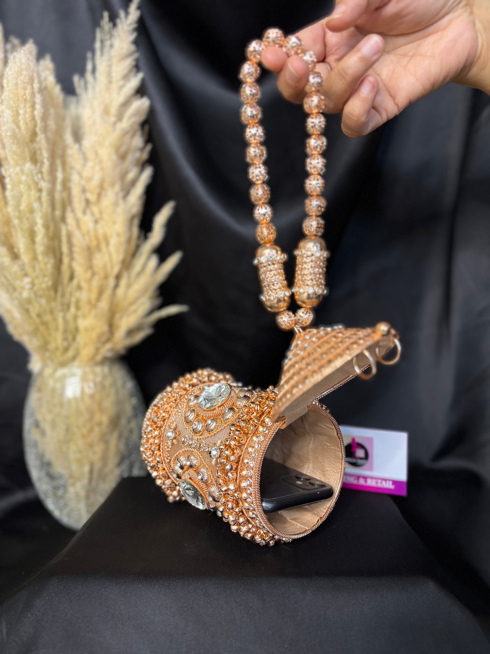 A dazzling metal potli bag, intricately embellished with stones and ghungroo. Perfect for weddings and festive season. the ghungroo and big stone work gives it a royal and unique look. Outer Material: stones and ghungroo. Phone Capacity: Phone will fit in (iPhone 11 shown). Sling: Attached handle. Closure: lock enclosure. Pocket: No Pocket. Care Instructions: Keep it in a protective space when not in use and keep it away from moisture. Carry delicately!