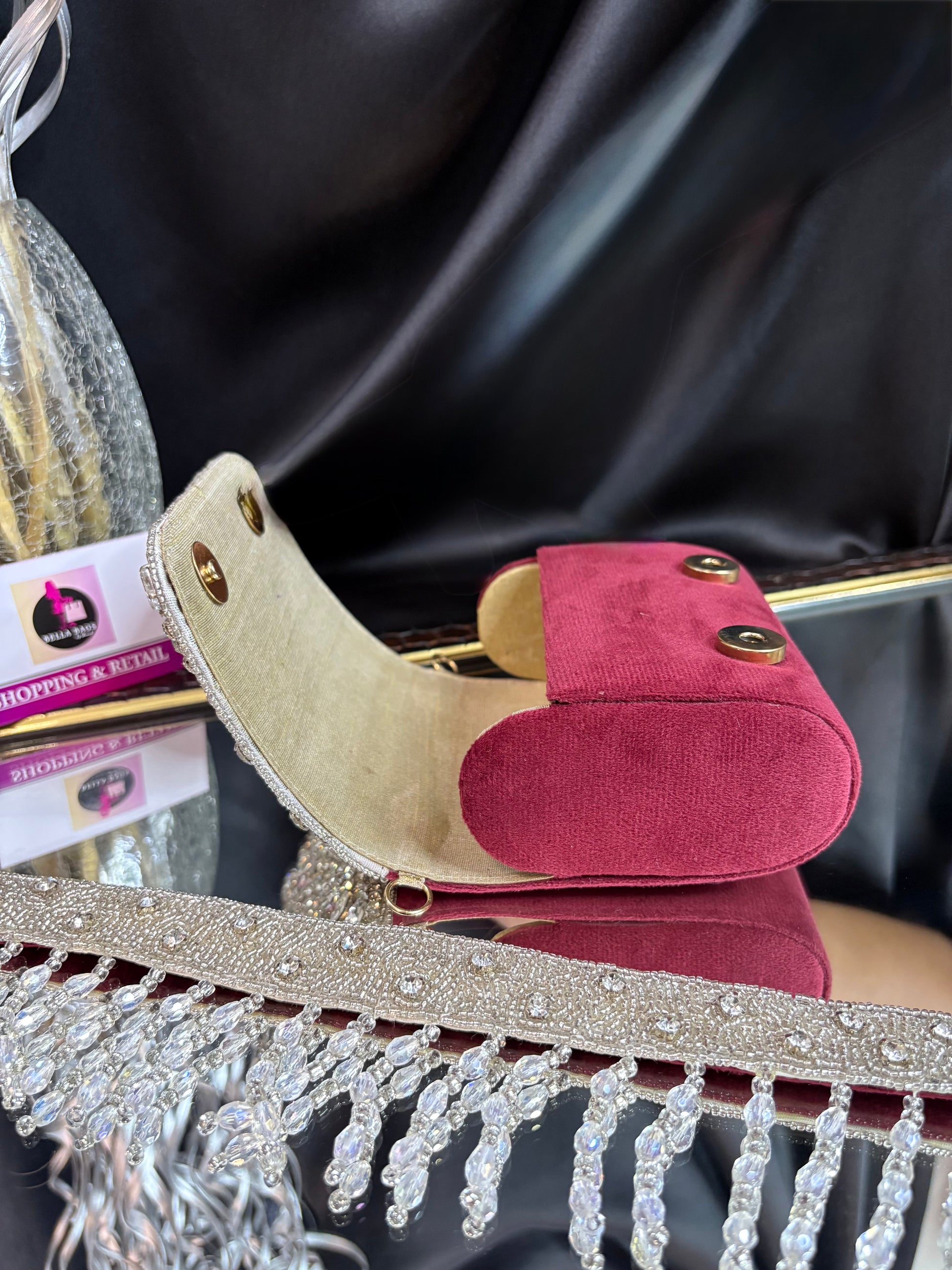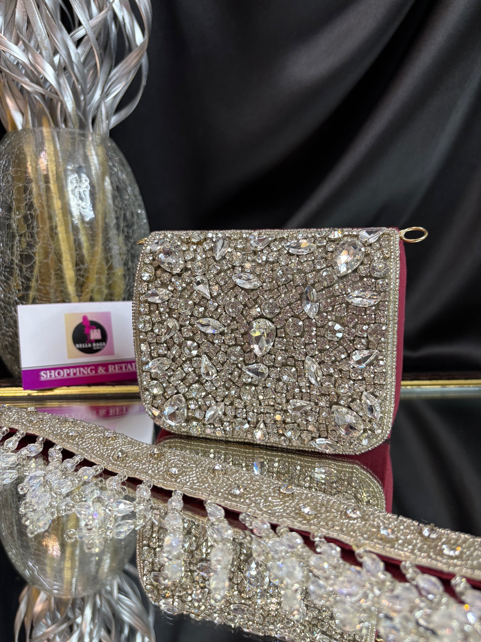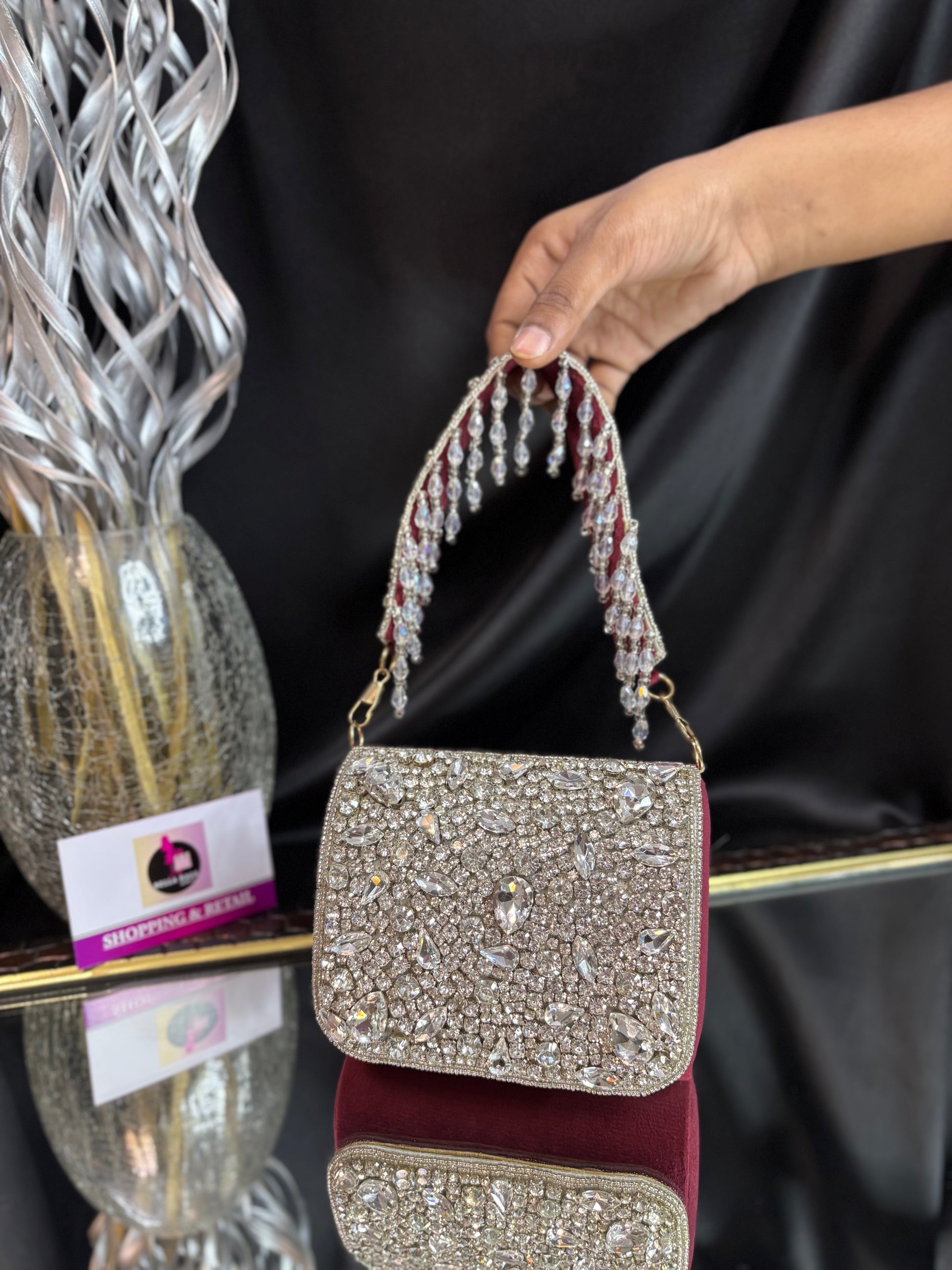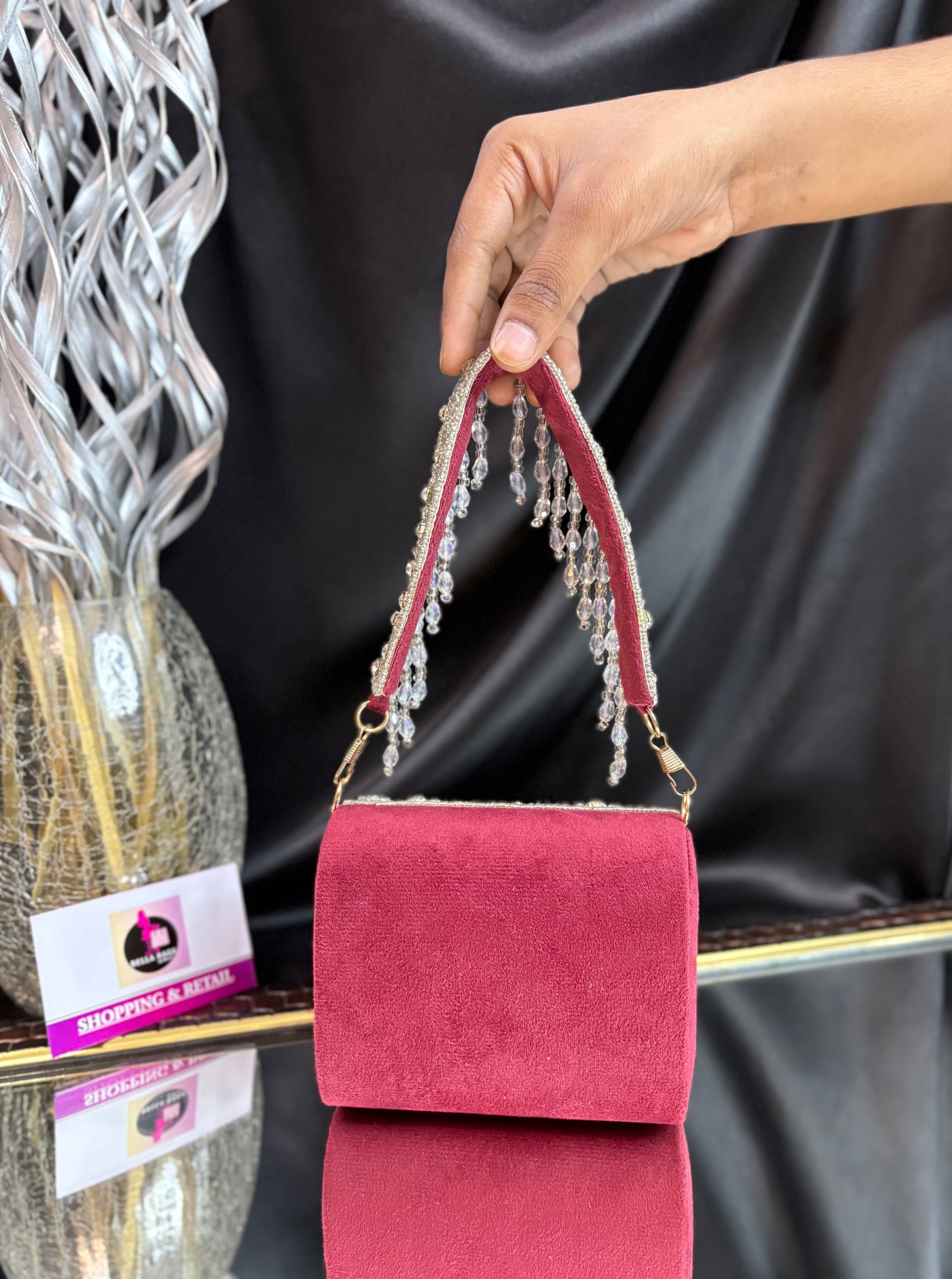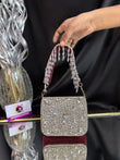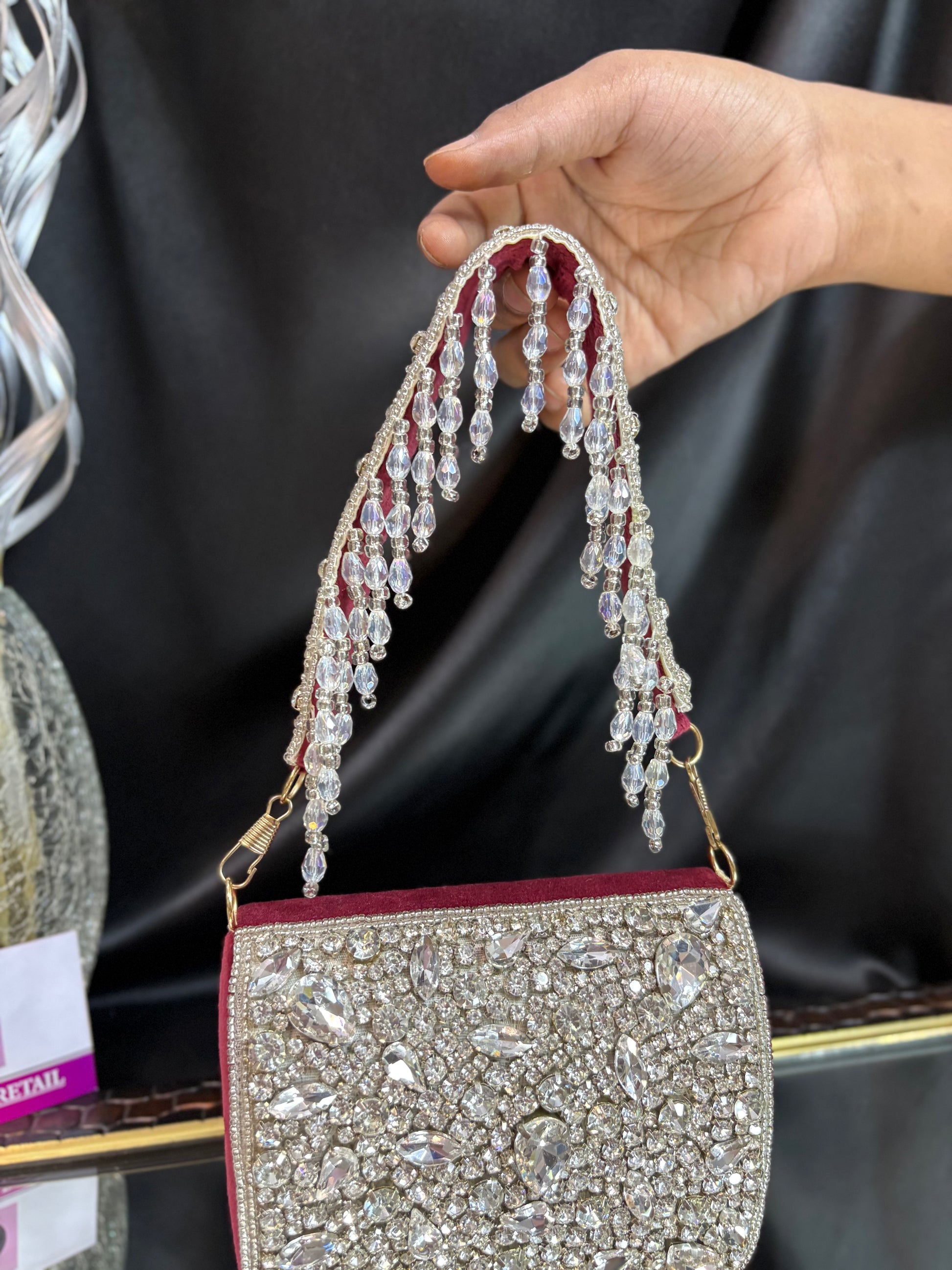 This is a stunning mini velvet flap bag, intricately embellished with shimmering crystal and stone work. The standout feature is its dazzling handle, adorned with cascading crystal droplets, adding a glamorous, statement-making touch that is perfect for weddings or festive occasions. Outer Material: crystal stones. Phone Capacity: Phone will not fit in. Sling: comes with a detachable handle. Closure: magnetic enclosure. Pocket: No Pocket. Care Instructions: Keep it in a protective space when not in use and keep it away from moisture. Carry delicately!.