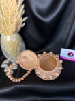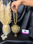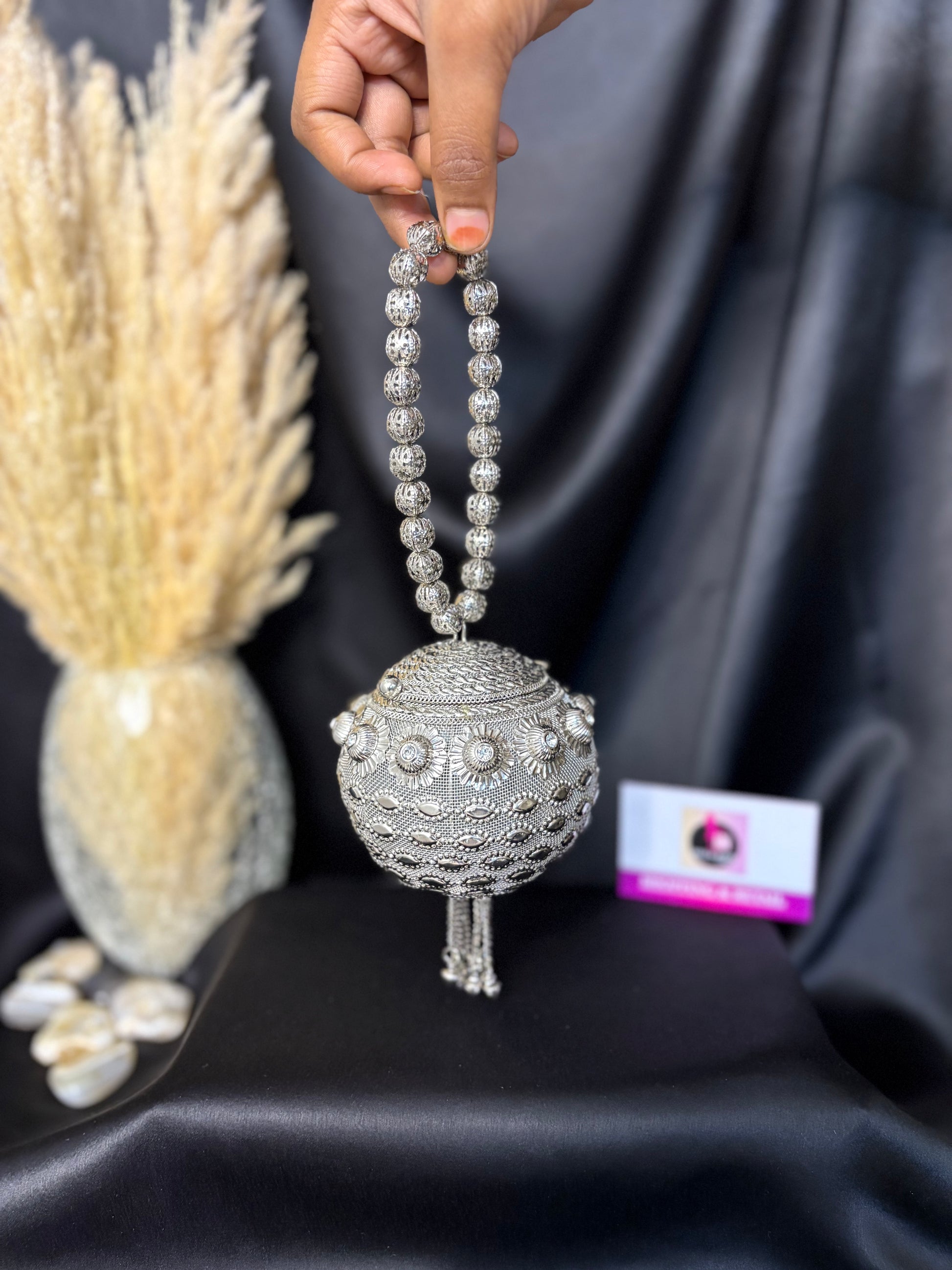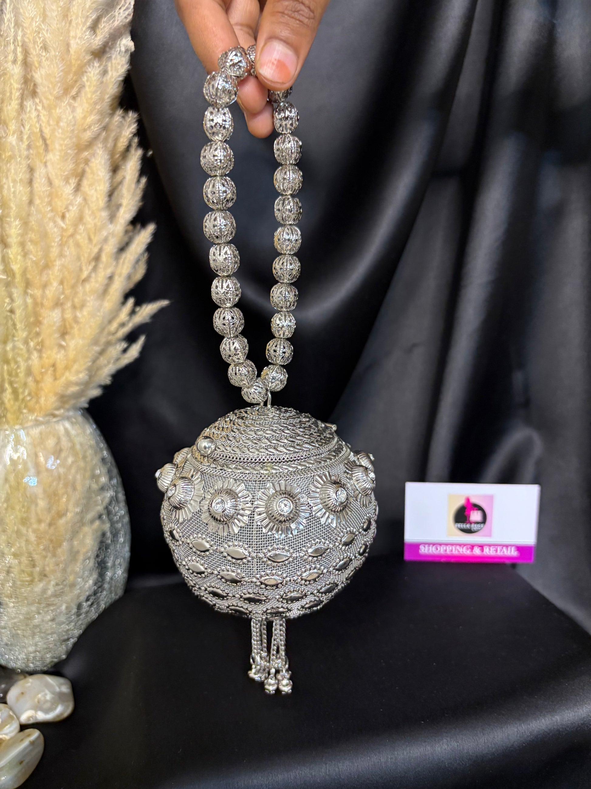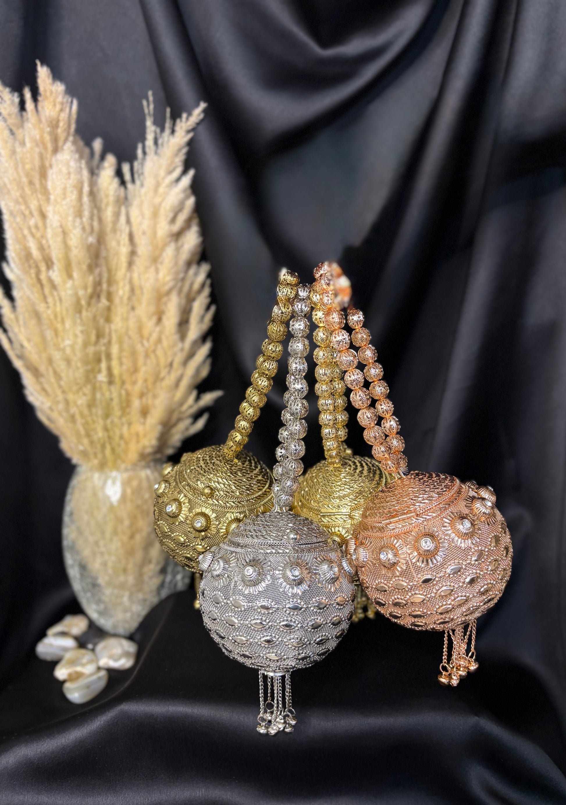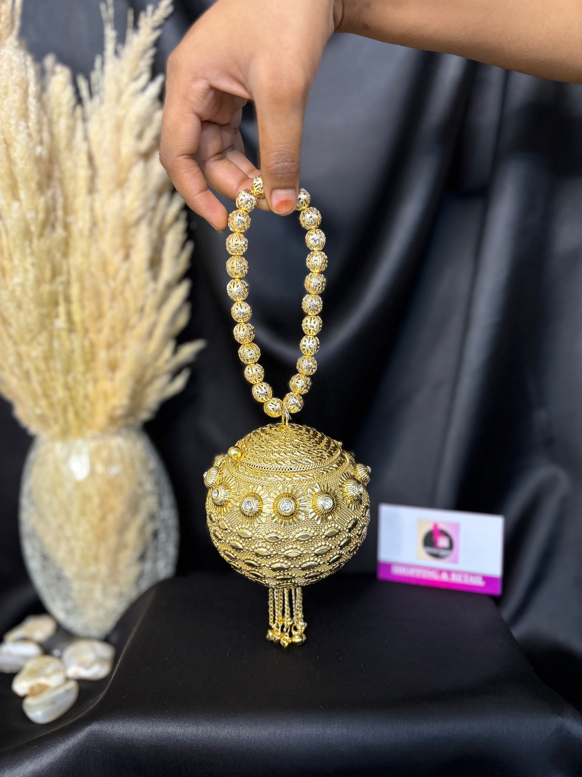 A stunning metal mini wristlet, featuring intricate stonework. A perfect blend of tradition, elegance and chicness, perfect for festive and bridal looks. Outer Material: stones and ghungroo. Phone Capacity: Phone will not fit in. Sling: Attached handle. Closure: lock enclosure. Pocket: No Pocket. Care Instructions: Keep it in a protective space when not in use and keep it away from moisture. Carry delicately!