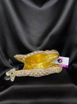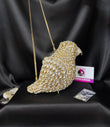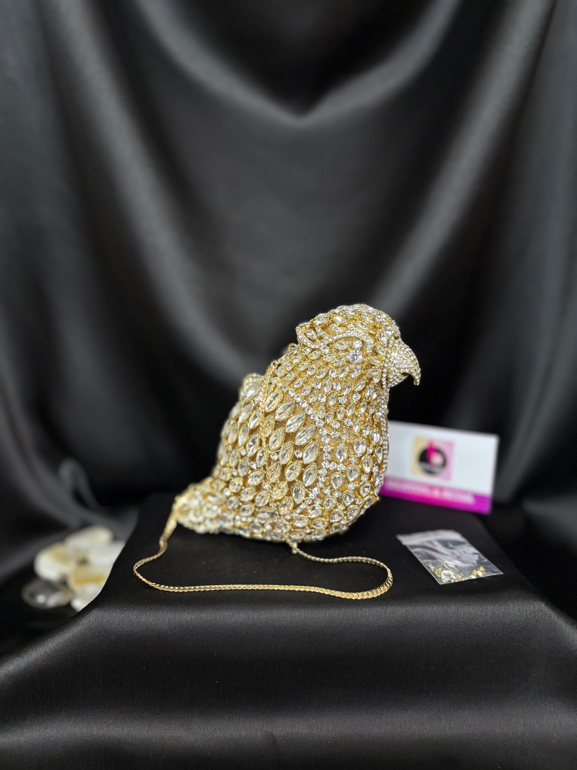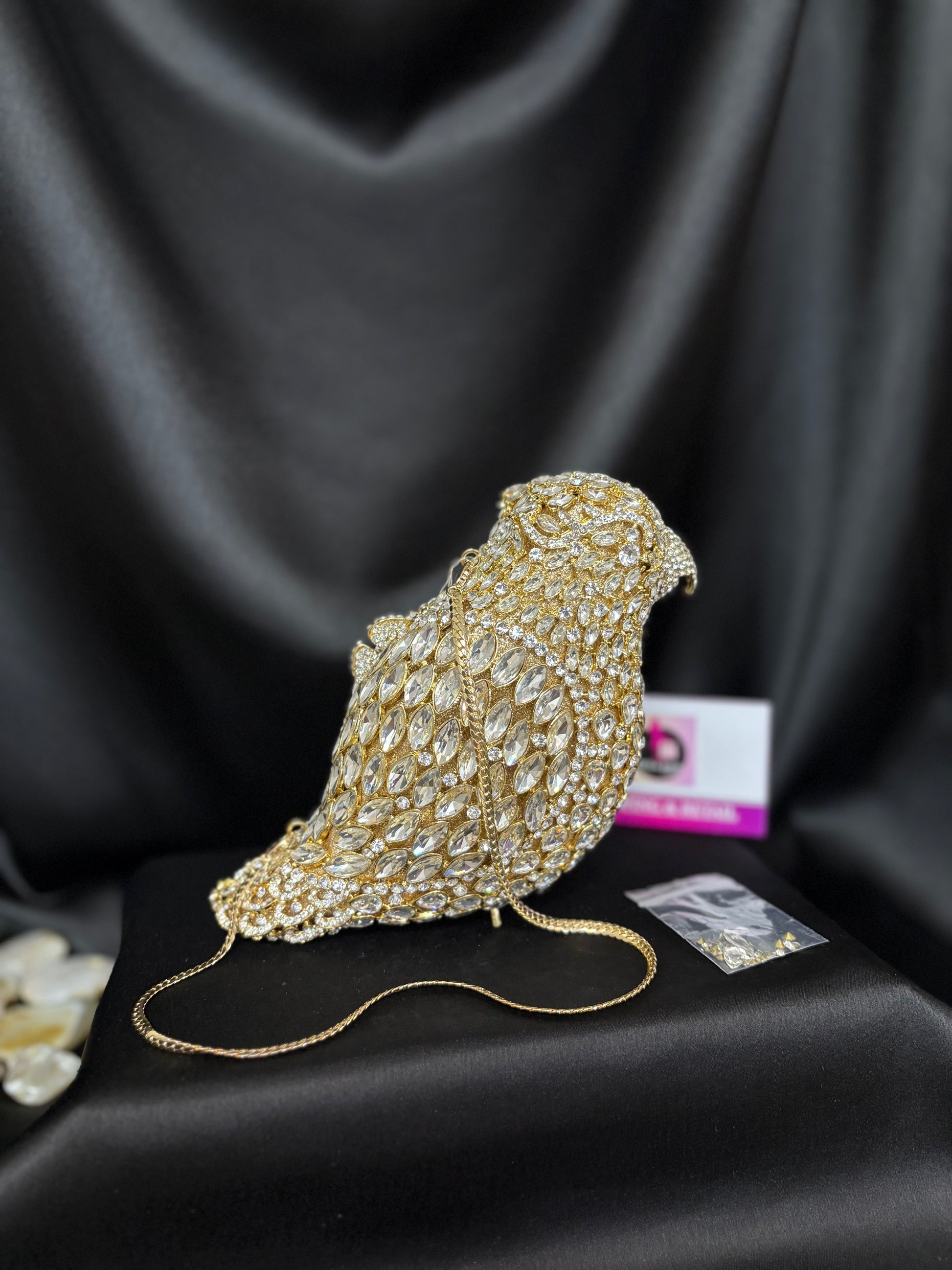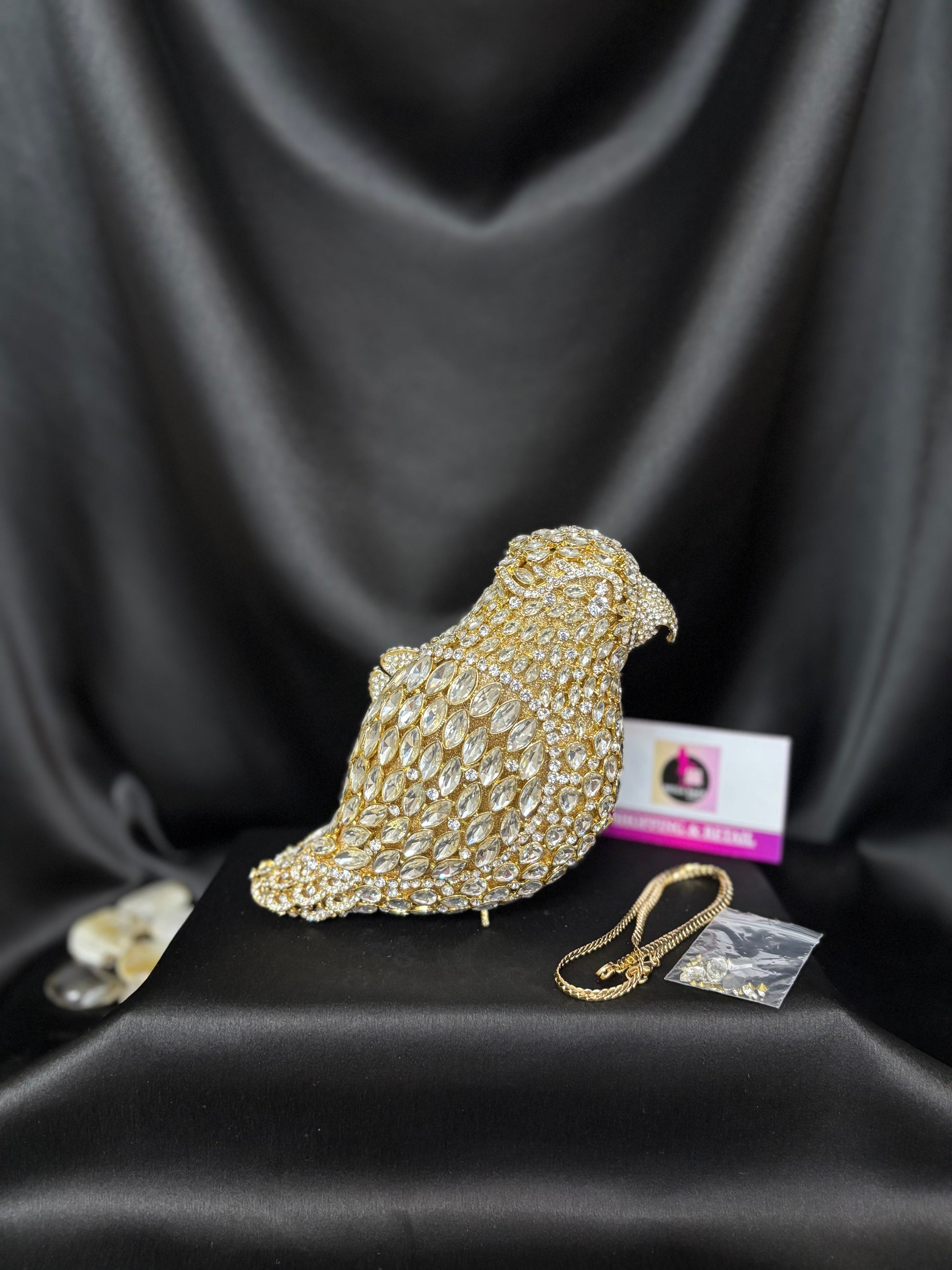Carry your evening essentials in style with our parrot Crystal Clutch. The beautiful shape and sparkling crystals make it an eye-catching accessory. This clutch is perfect for special occasions and will add a touch of elegance to any outfit. sling; comes with a sling chain. closure; magnetic closure, crystals; few extra crystals provided. space; fits in essentials, phone won't fit in