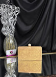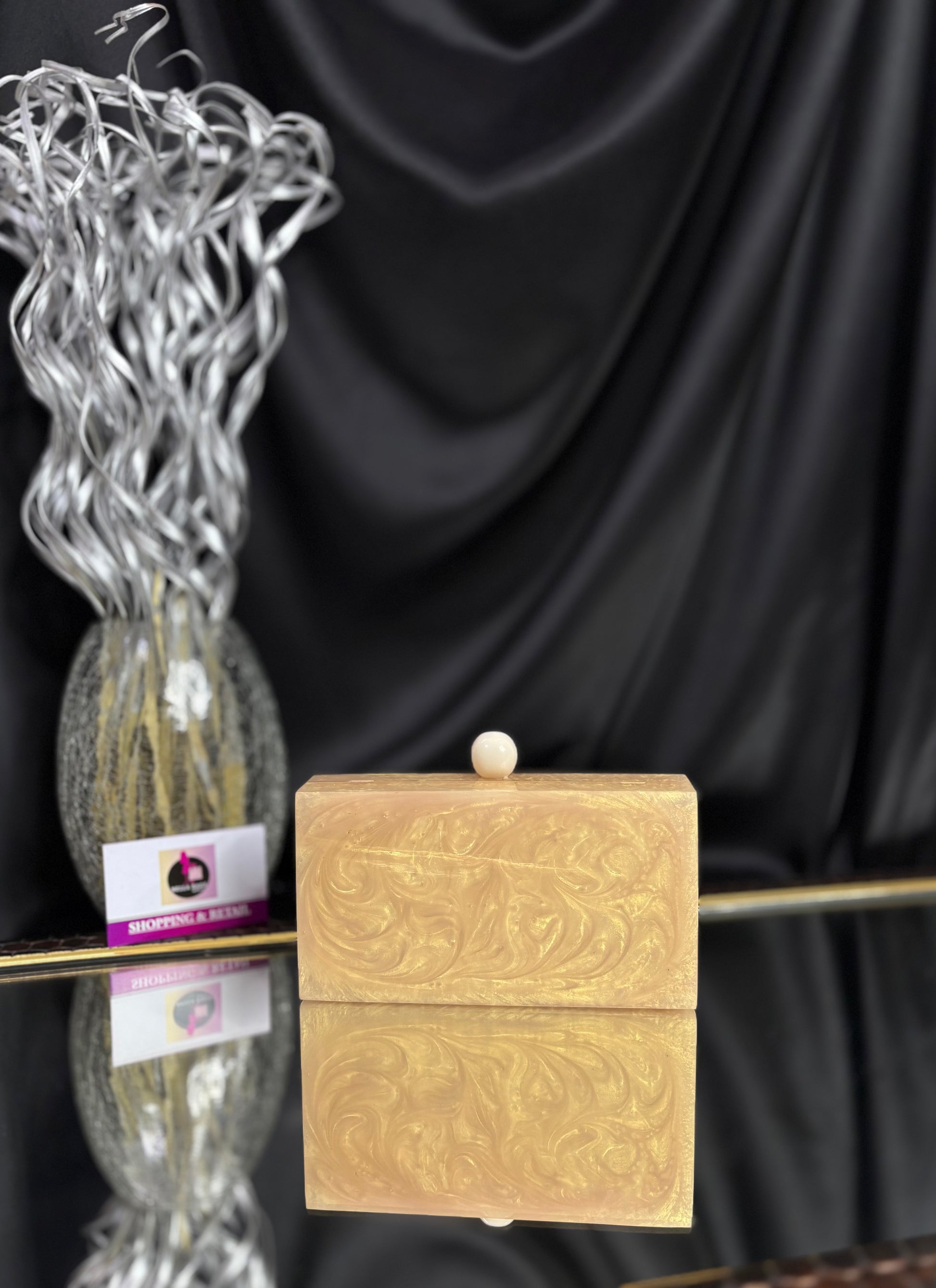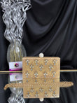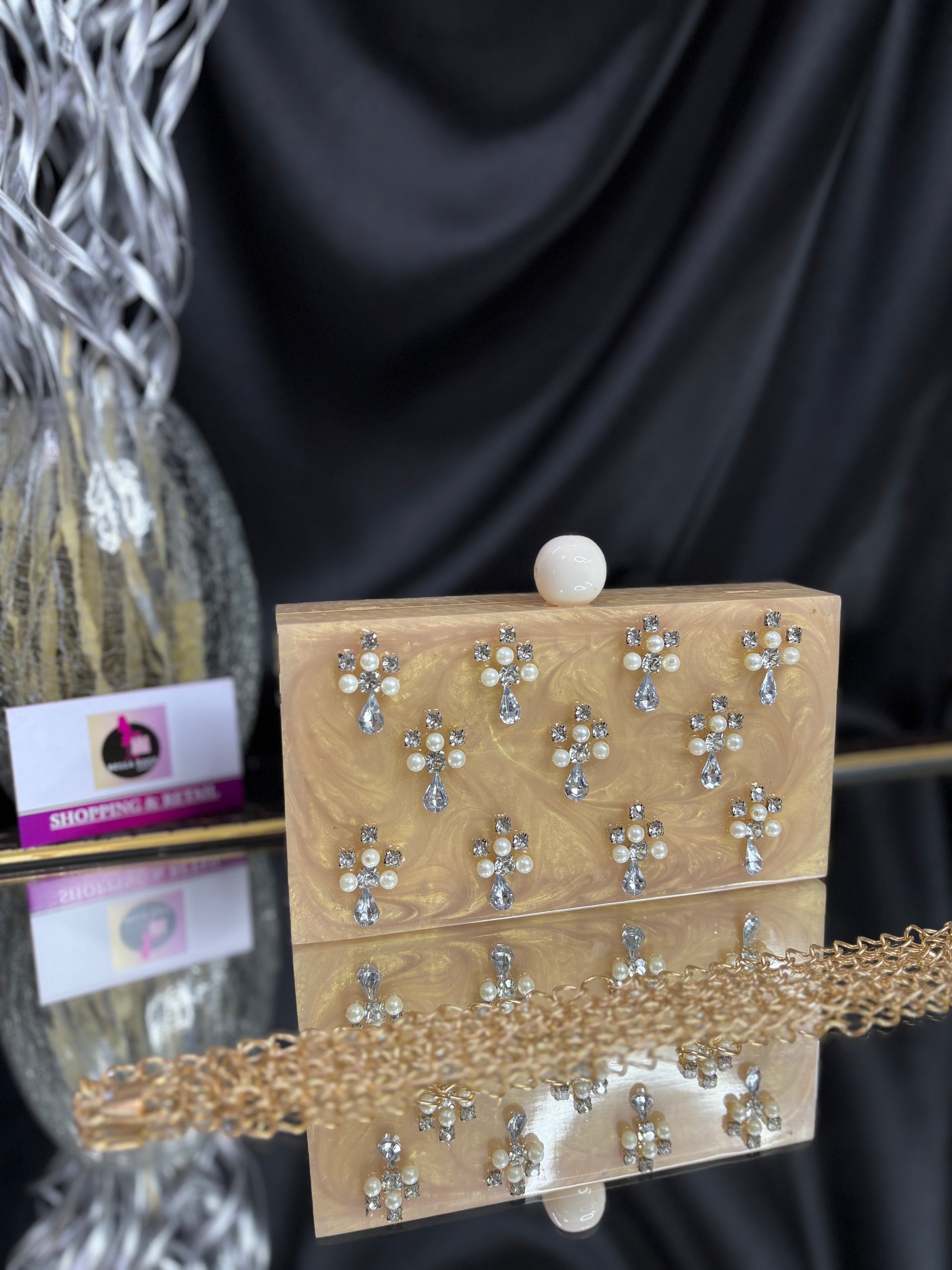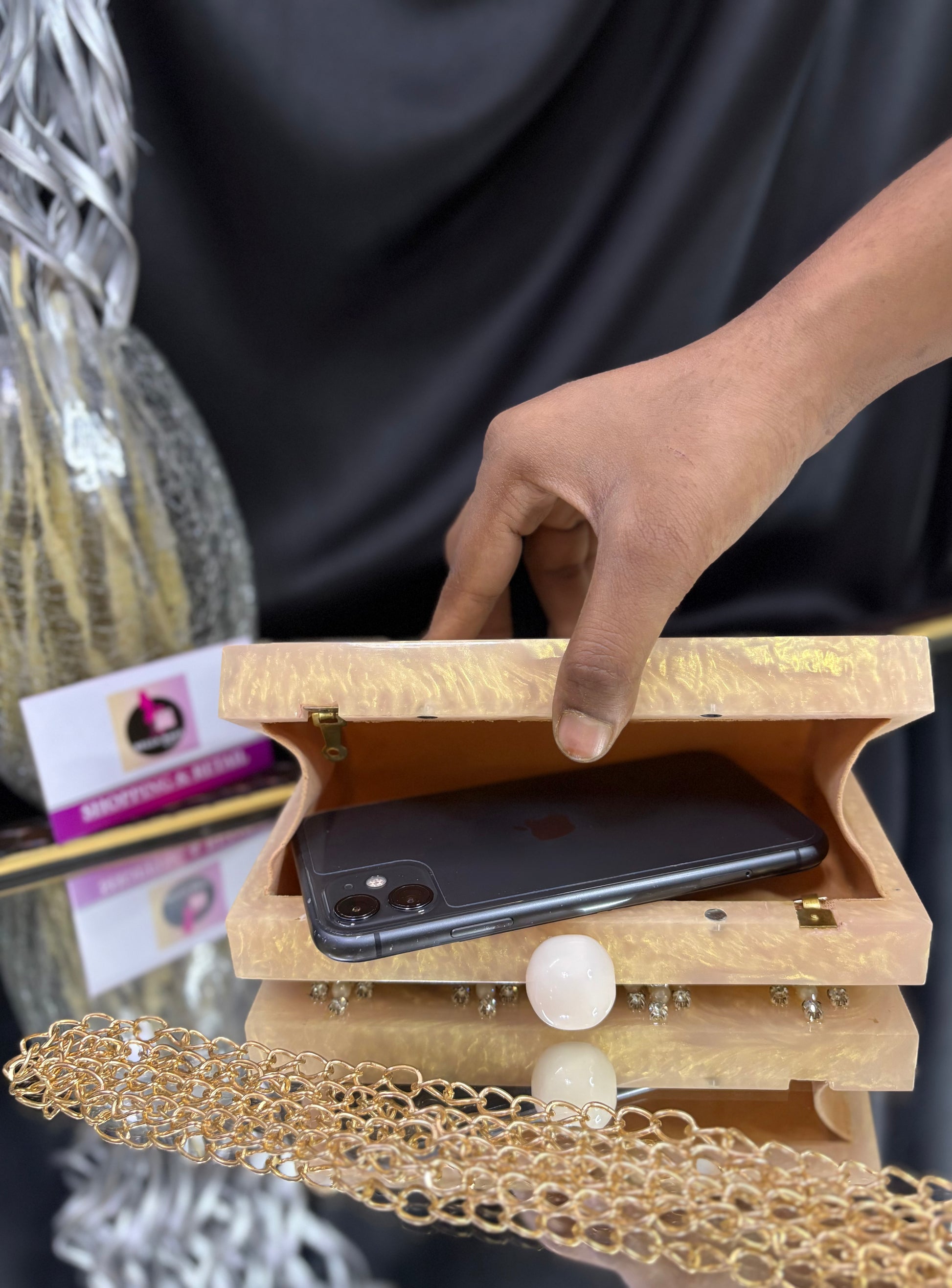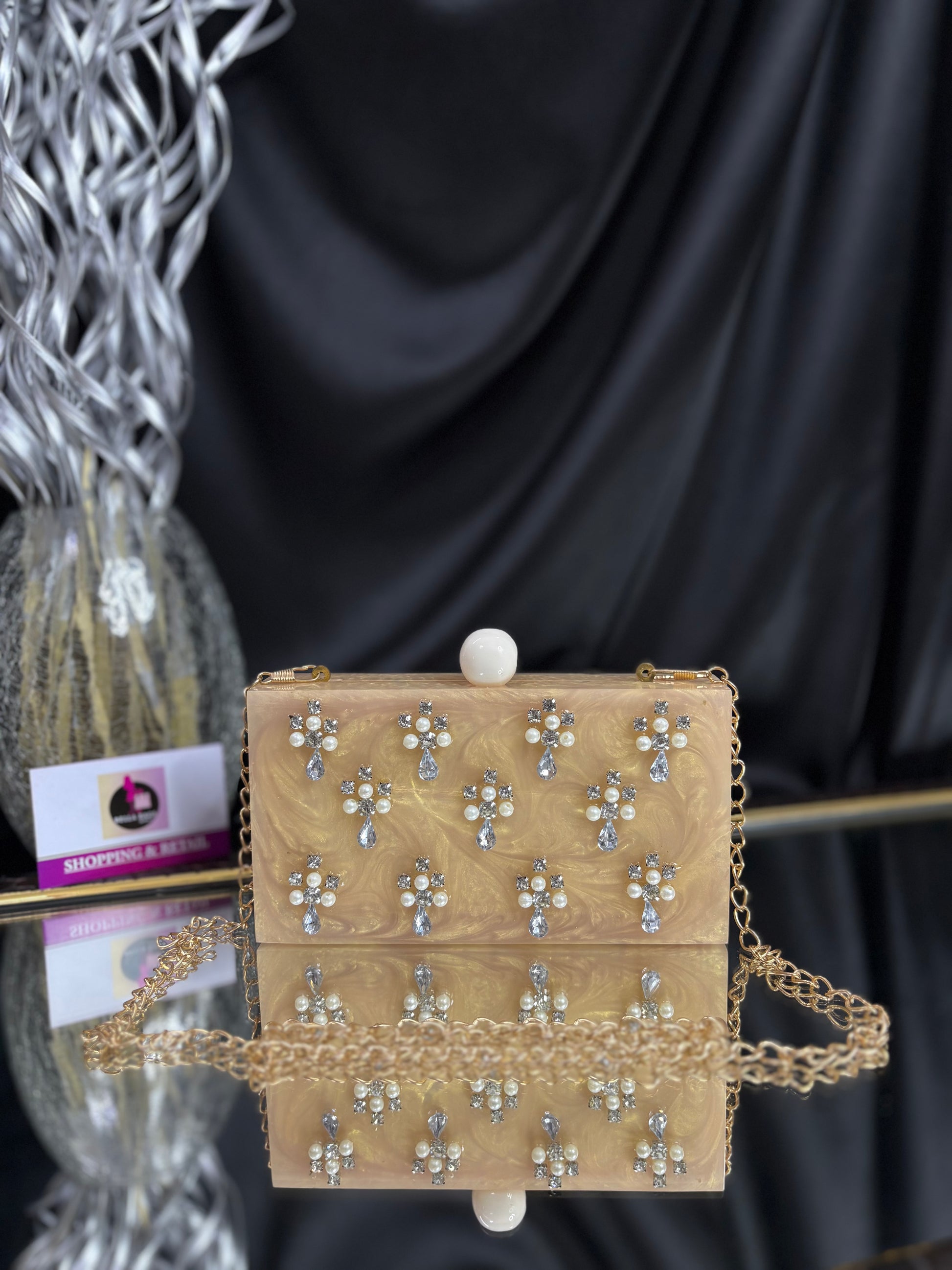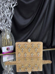 This is an elegant resin clutch featuring delicate floral embellishments made of pearls and stones. It has a glossy spherical clasp on top and comes with a gold-toned chain strap, adding a touch of elegance to any festive or evening ensemble. Outer Material: Resin. Inner Material: Raw Silk. Phone Capacity: Phone will fit (5.85 inches- iphone 11). Sling: comes with a long sling. enclosure: magnetic enclosure. no pocket. Care Instructions: Keep in protective space when not in use and keep away from Moisture. Carry delicately!