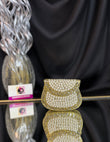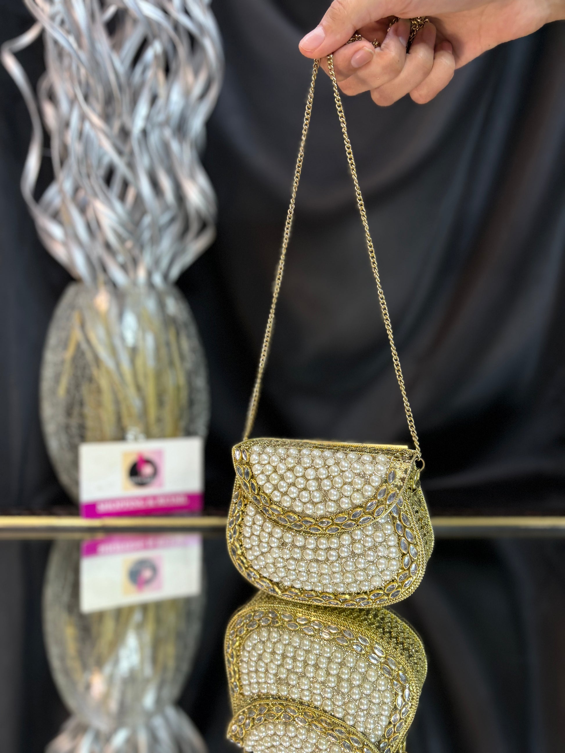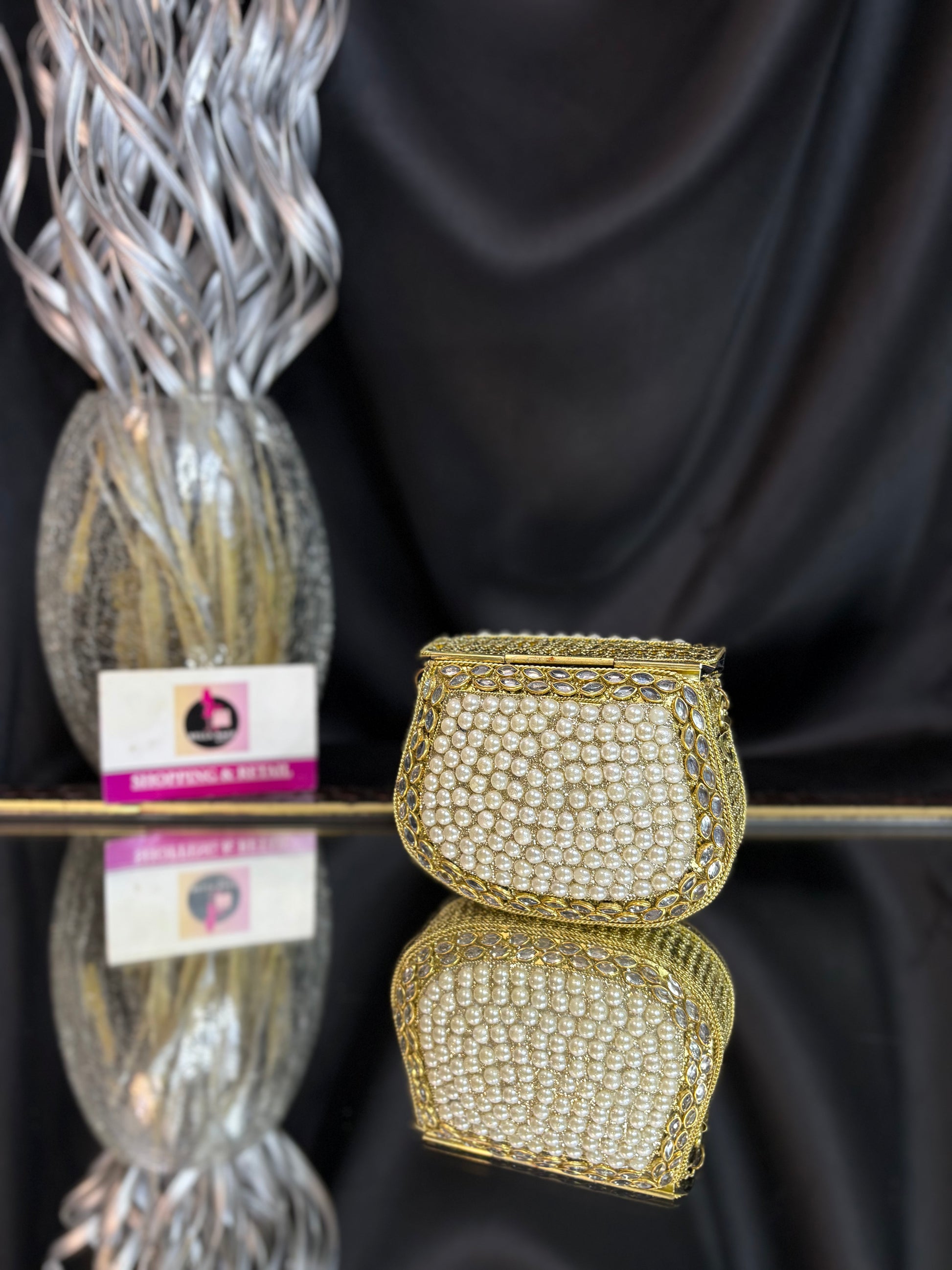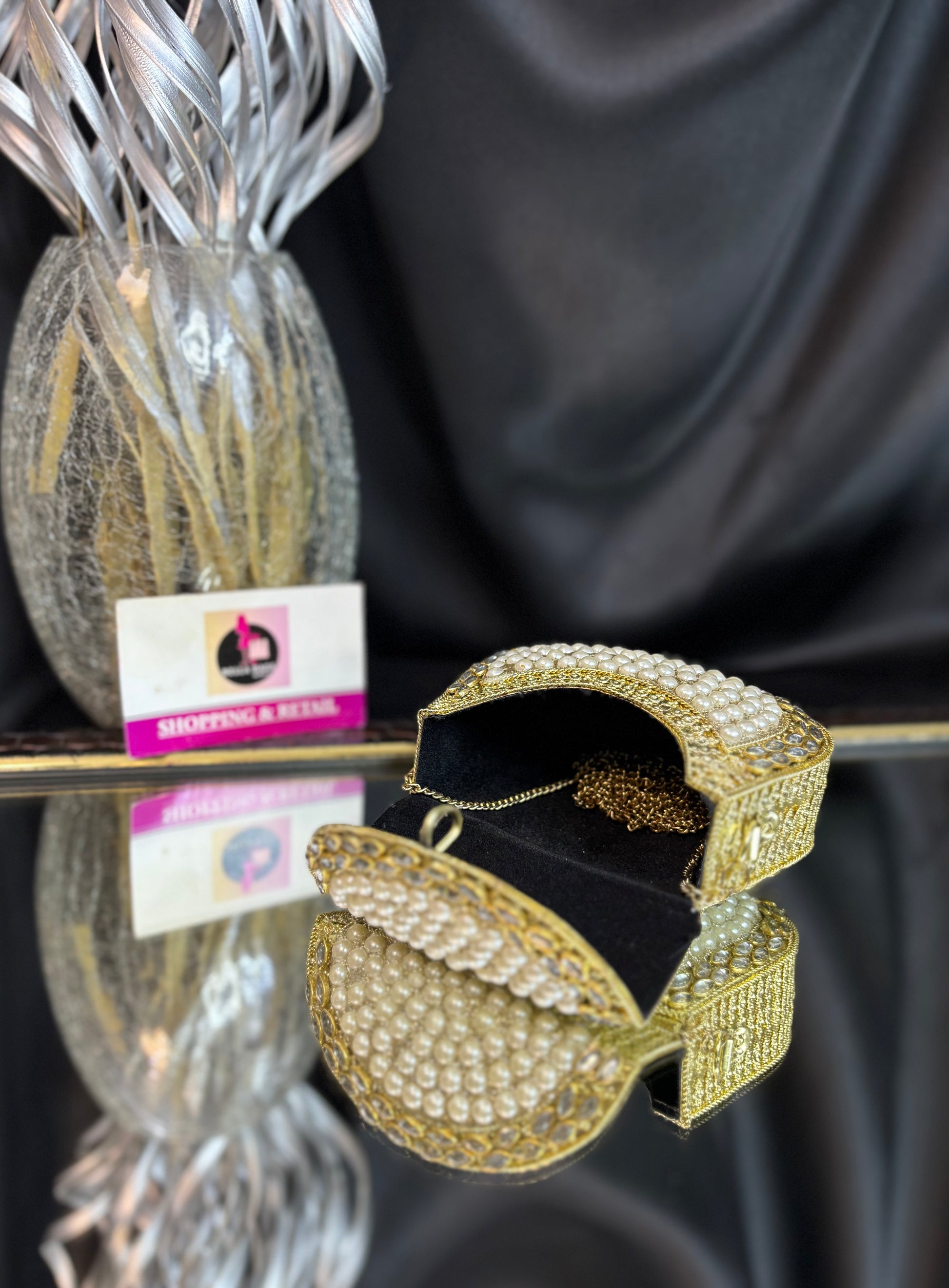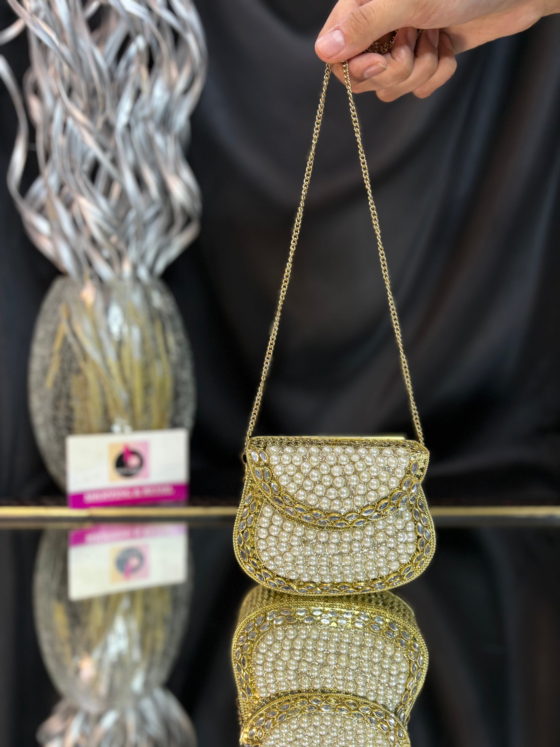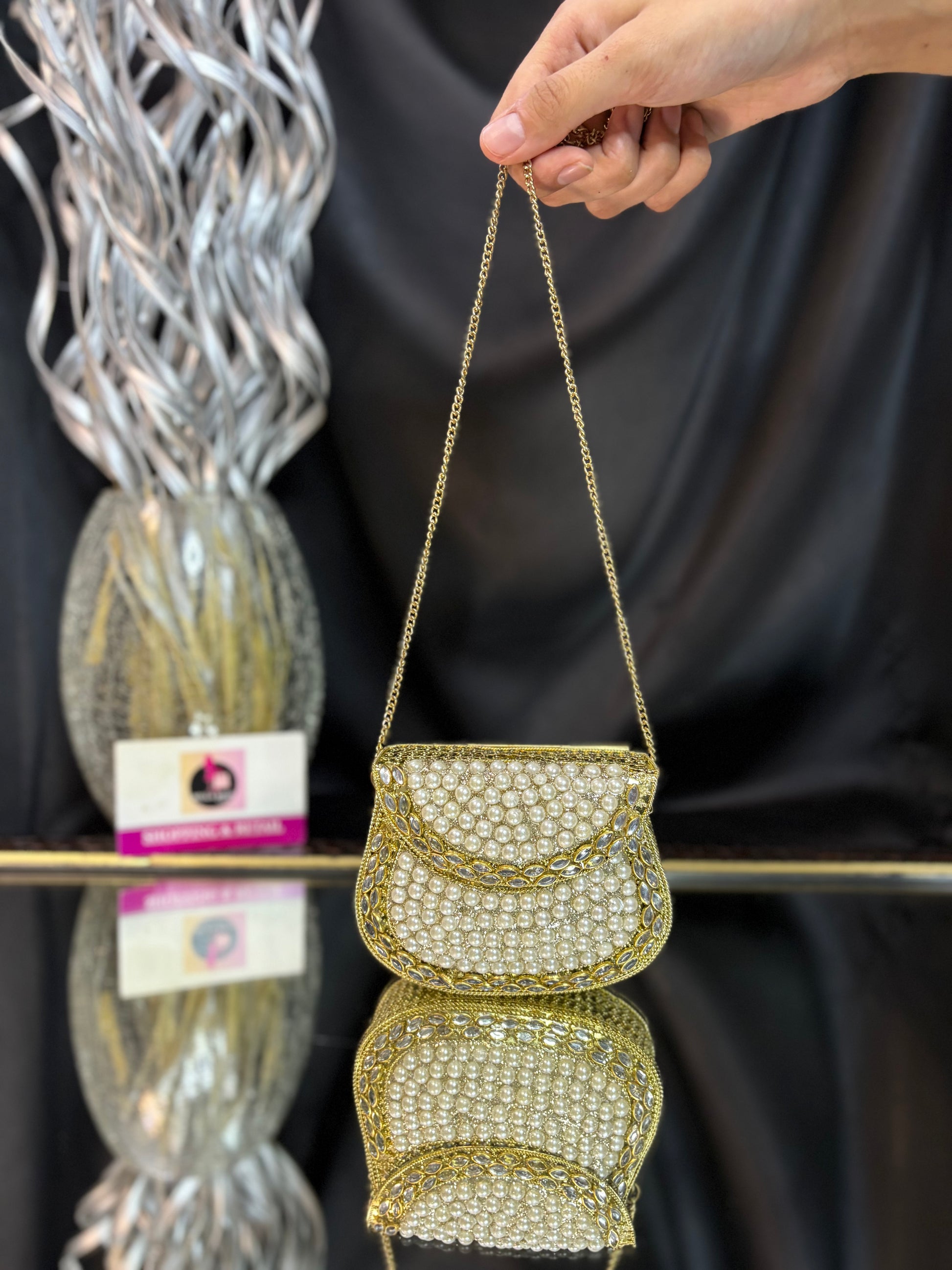 A stunning pearl-embellished clutch crafted with intricate gold detailing, perfect for weddings and festive occasions. Its luxurious finish, sparkling chain handle, and compact silhouette make it an effortless statement piece for any elegant look.