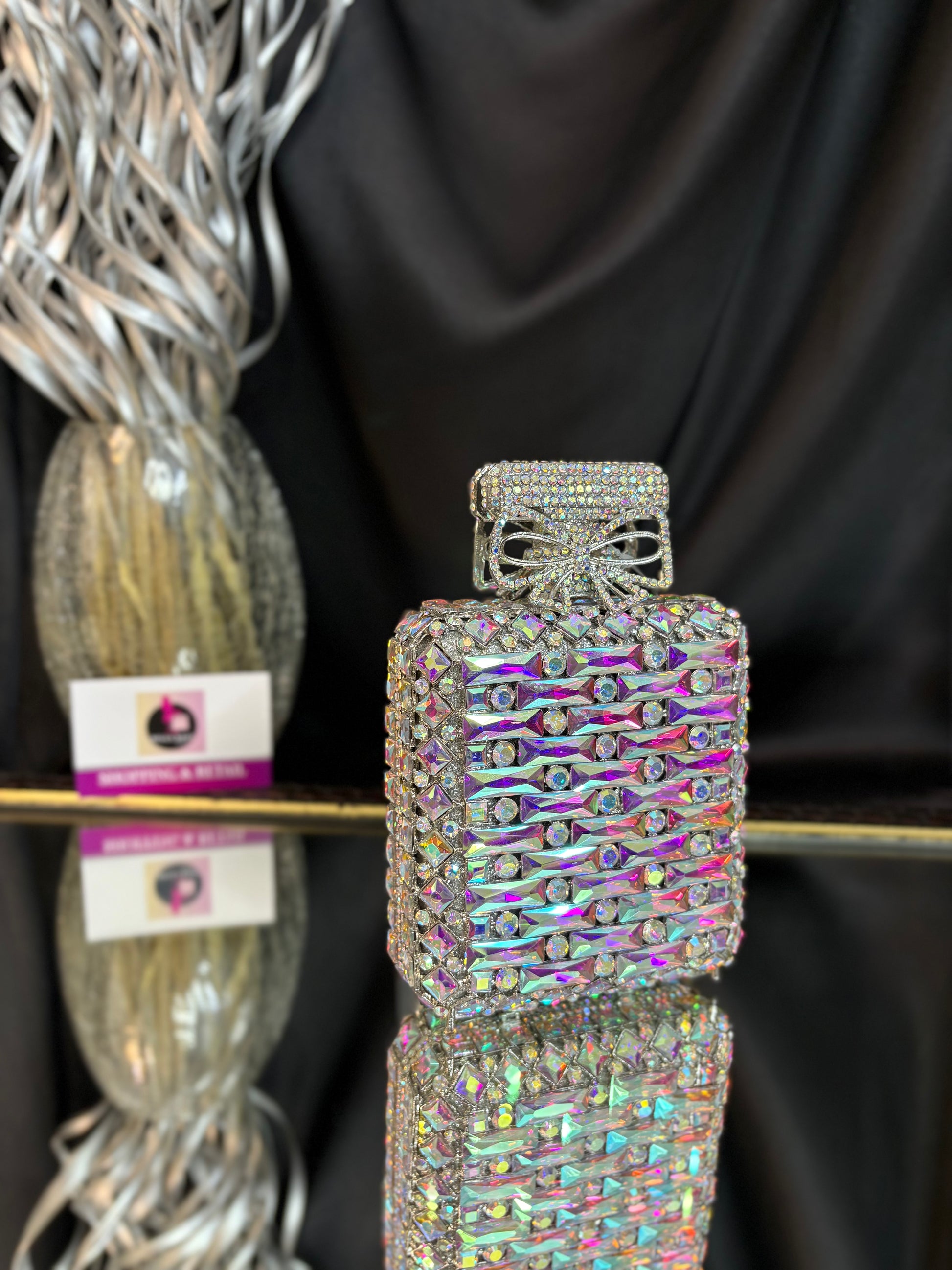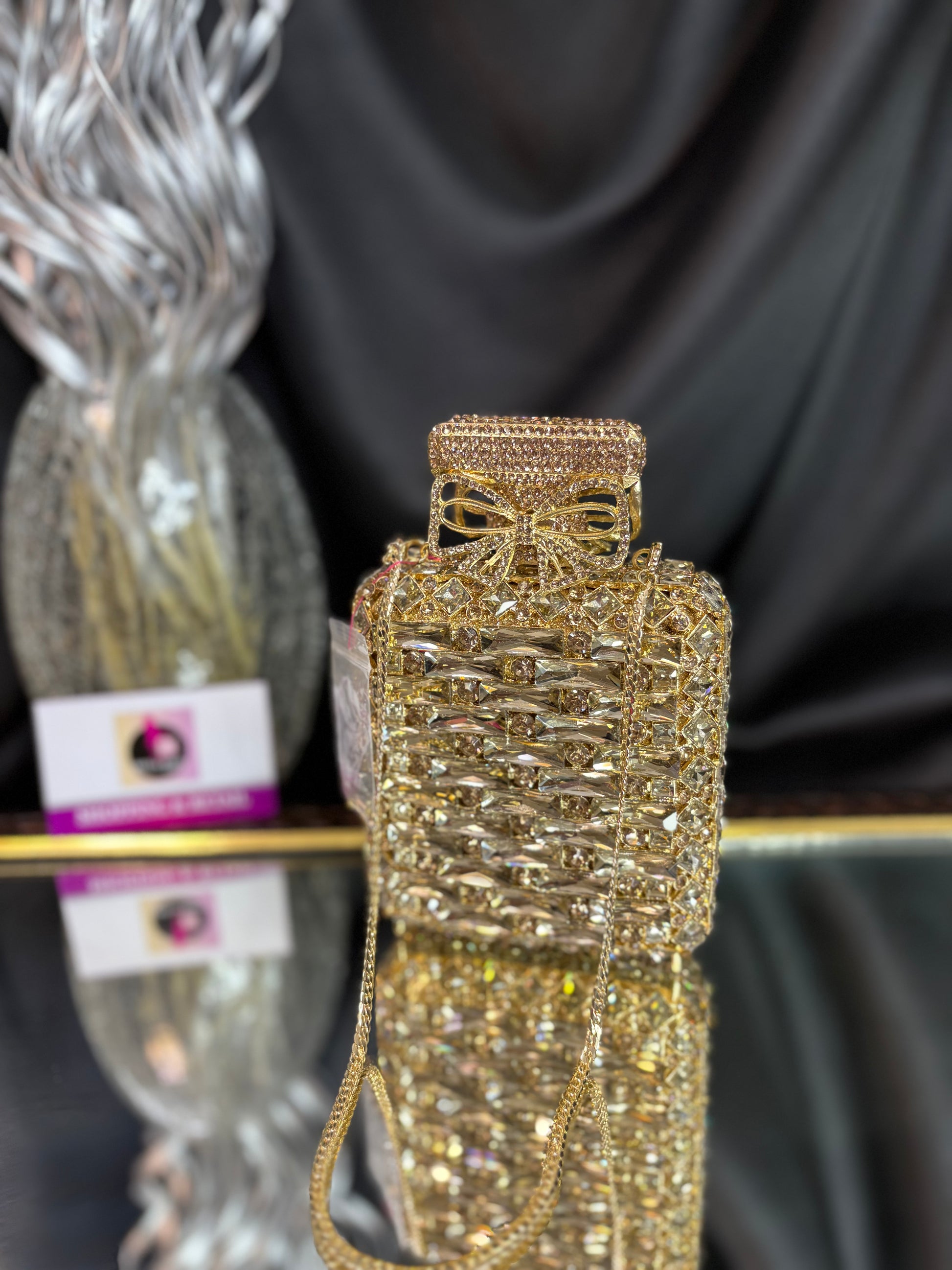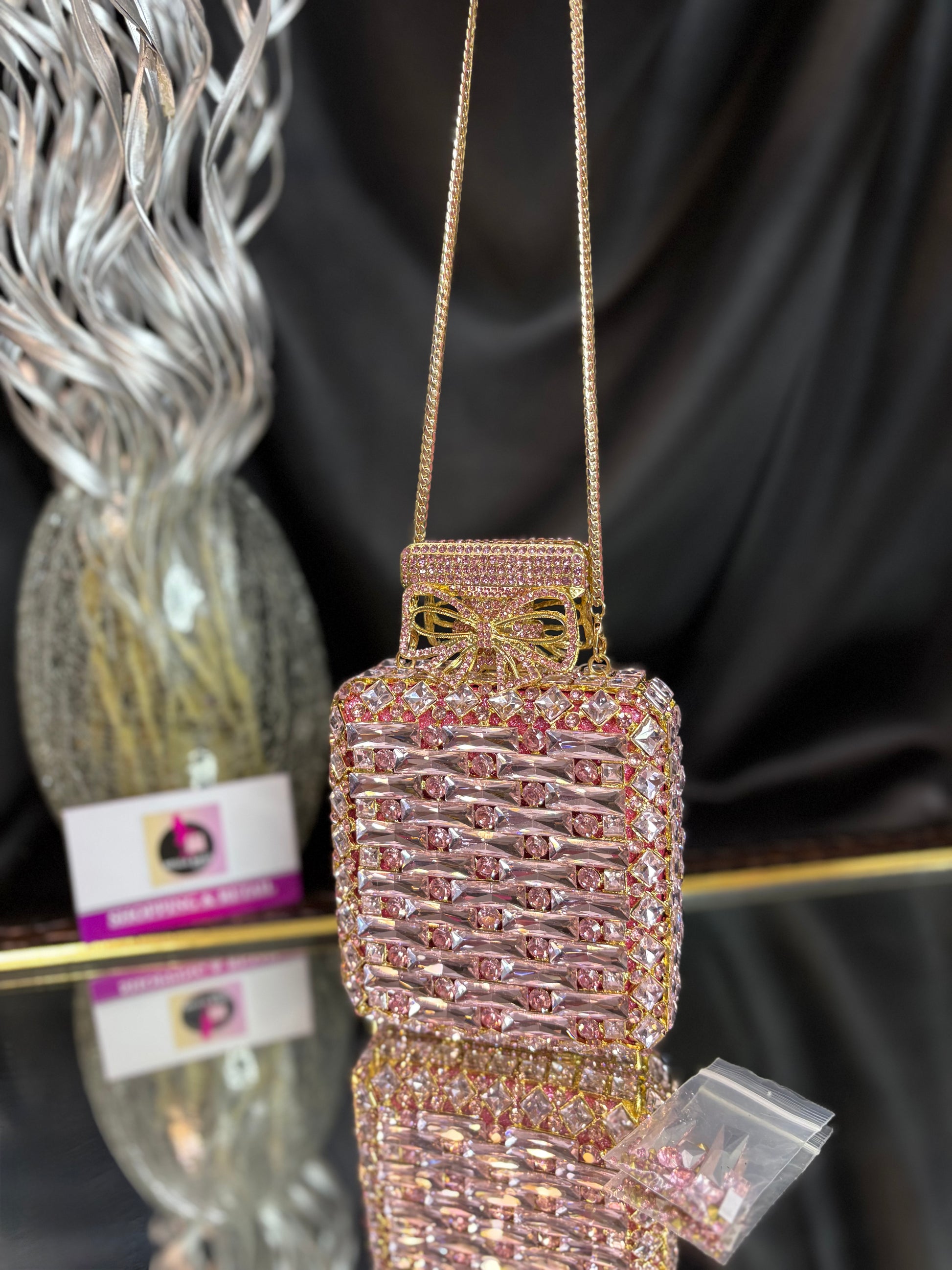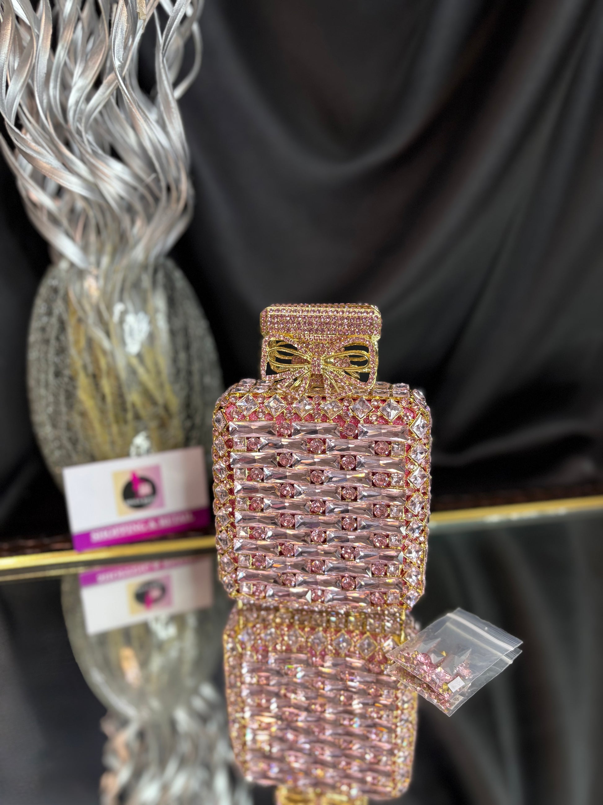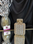 Carry your evening essentials in style with our perfume Crystal Clutch. The unique shape and sparkling crystals make it an eye-catching accessory. This clutch is perfect for special occasions and will add a touch of elegance to any outfit. sling; comes with a sling chain. closure; magnetic closure, crystals; few extra crystals provied. space; fits in essentials, phone won't fit in