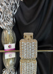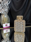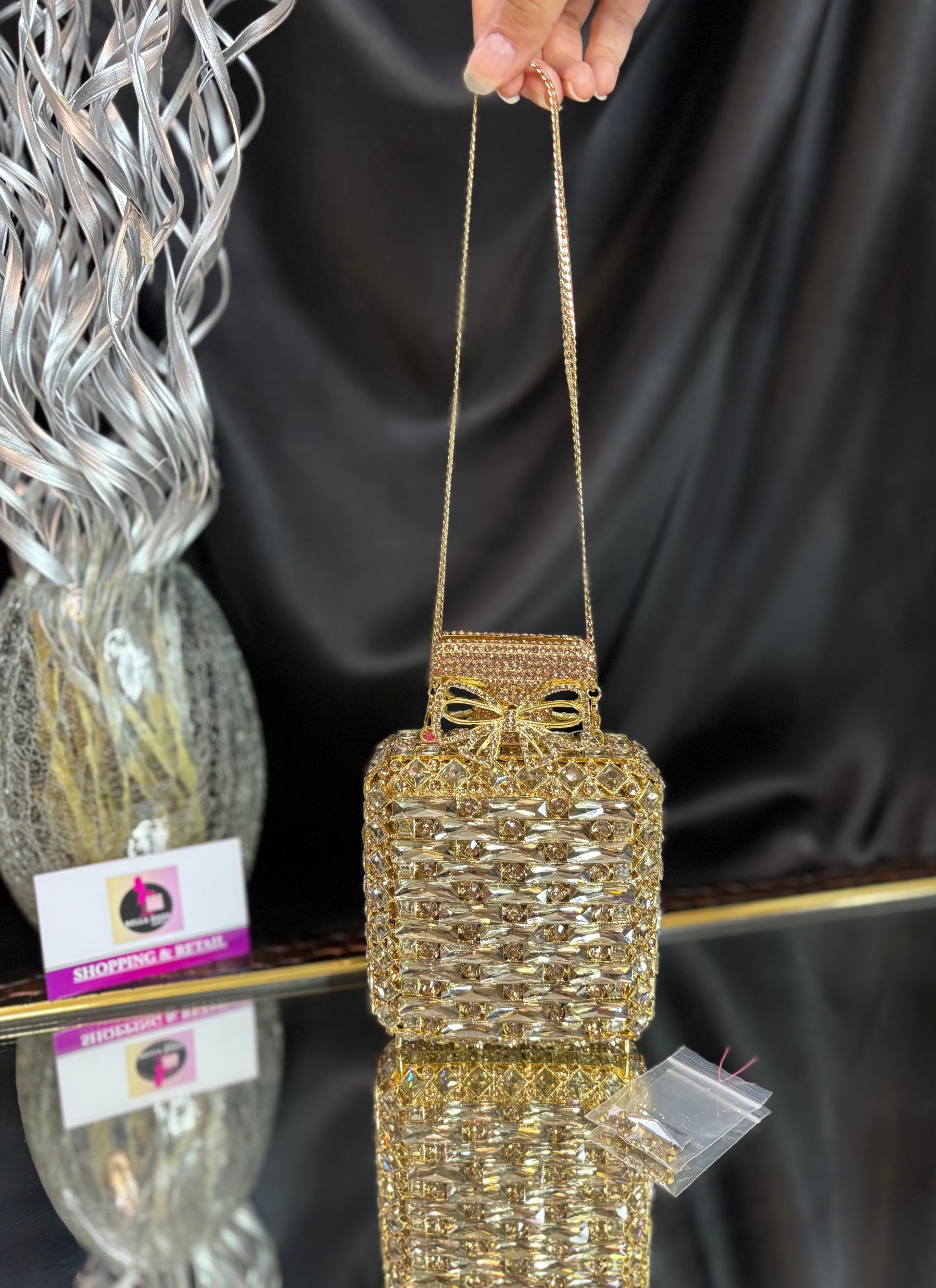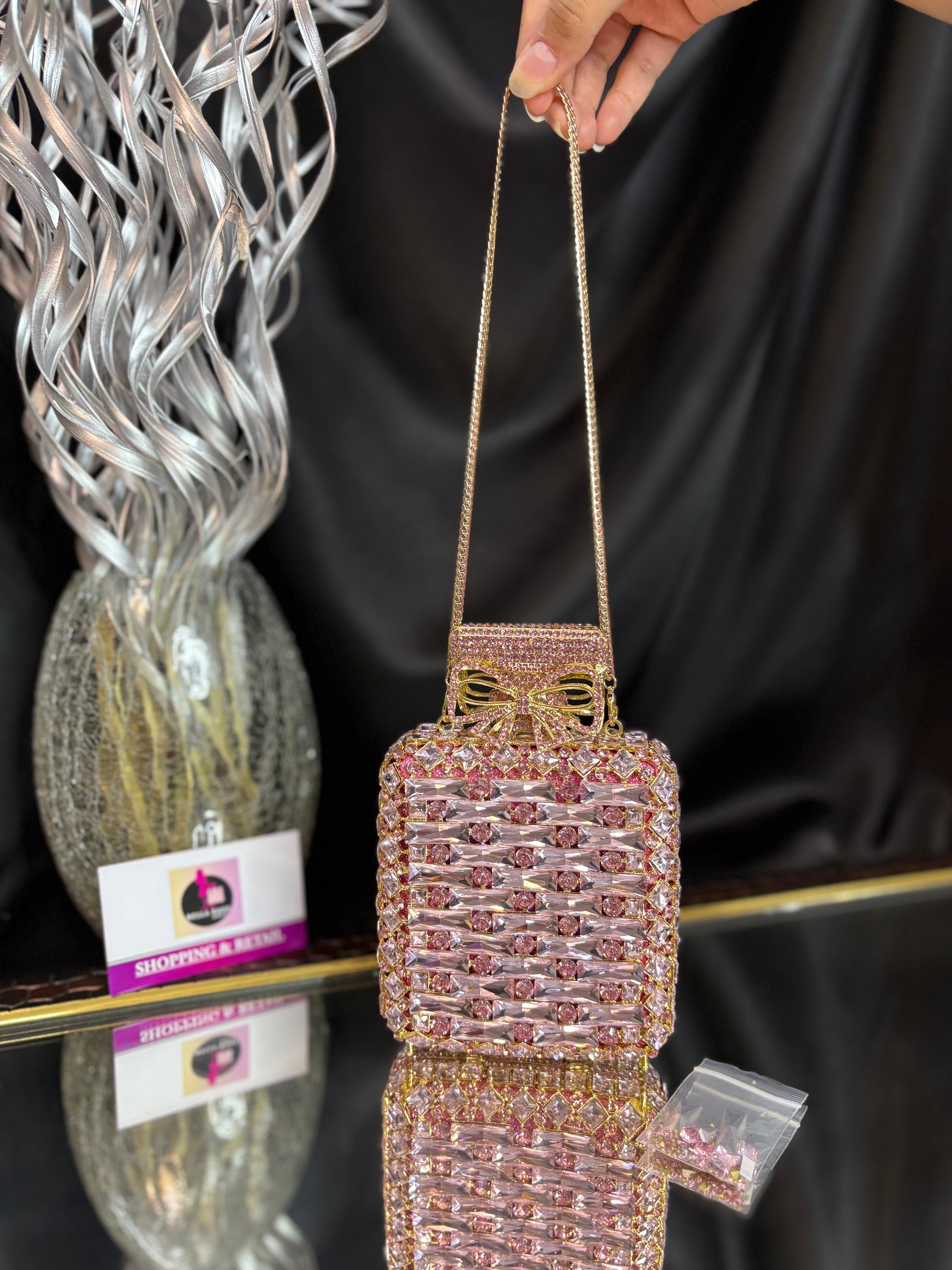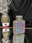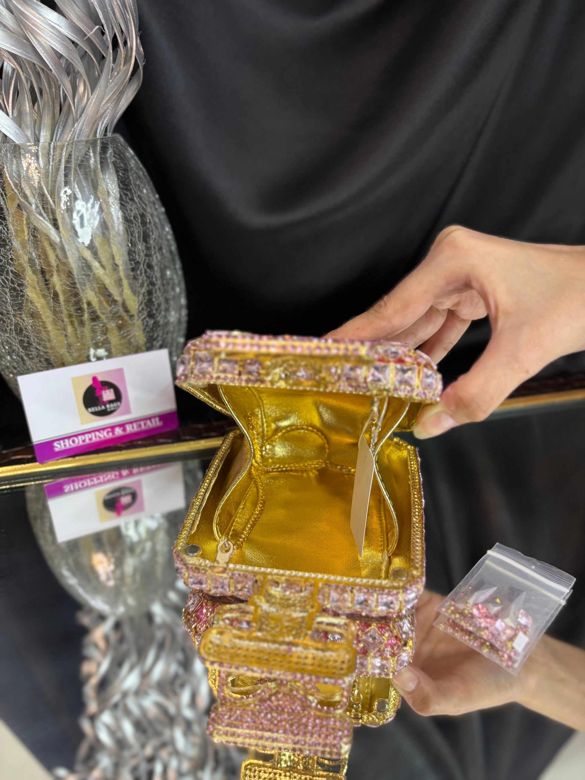 Carry your evening essentials in style with our perfume Crystal Clutch. The unique shape and sparkling crystals make it an eye-catching accessory. This clutch is perfect for special occasions and will add a touch of elegance to any outfit. sling; comes with a sling chain. closure; magnetic closure, crystals; few extra crystals provied. space; fits in essentials, phone won't fit in