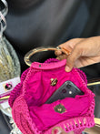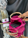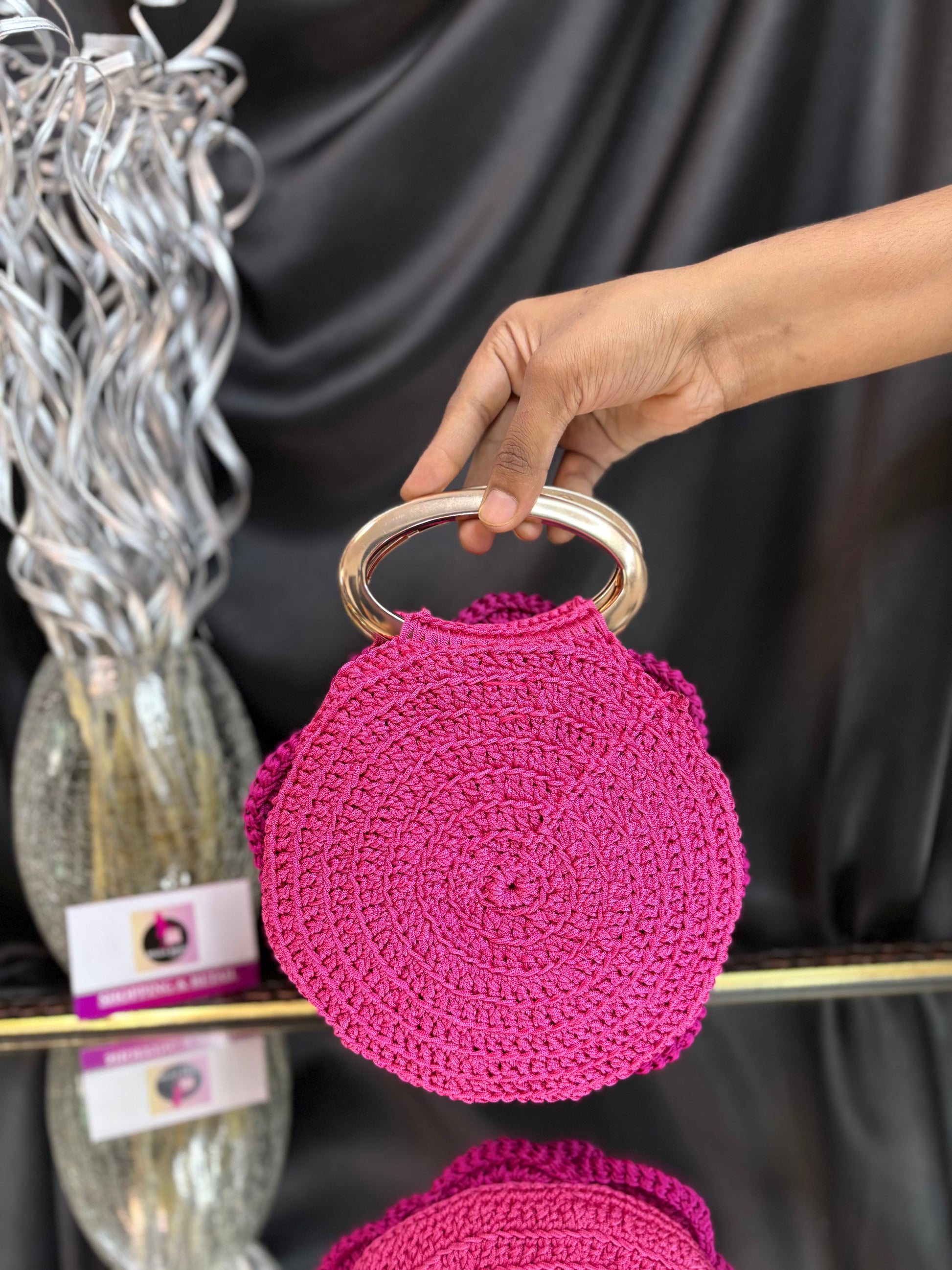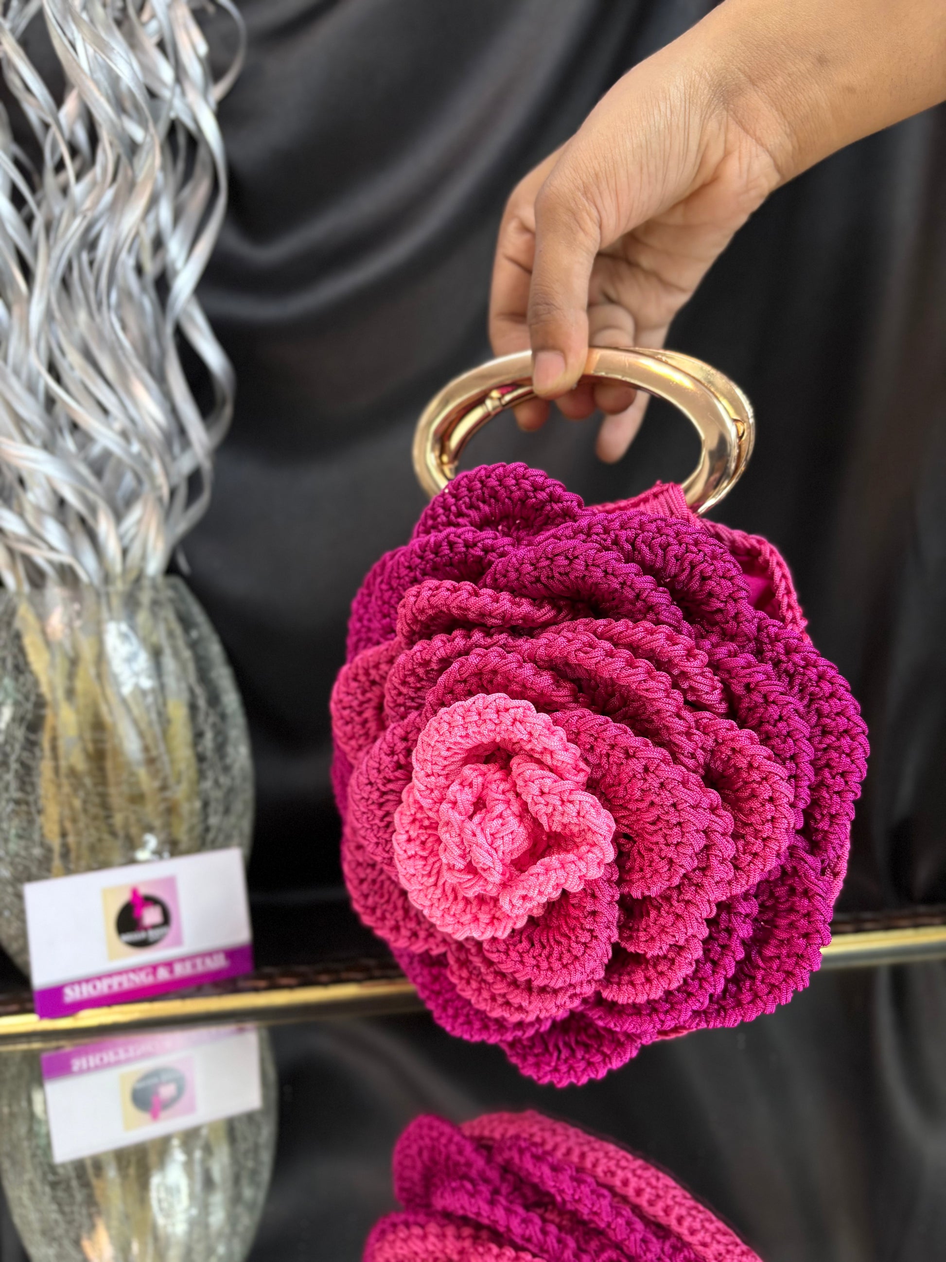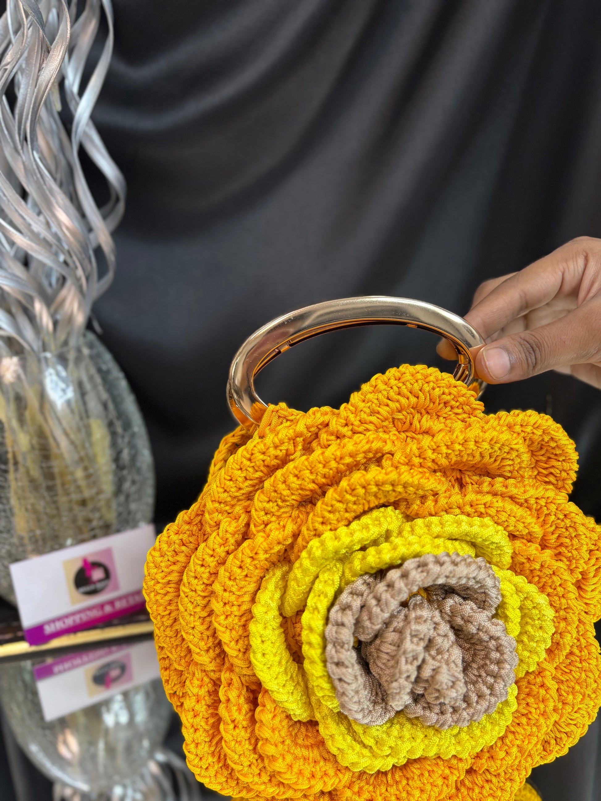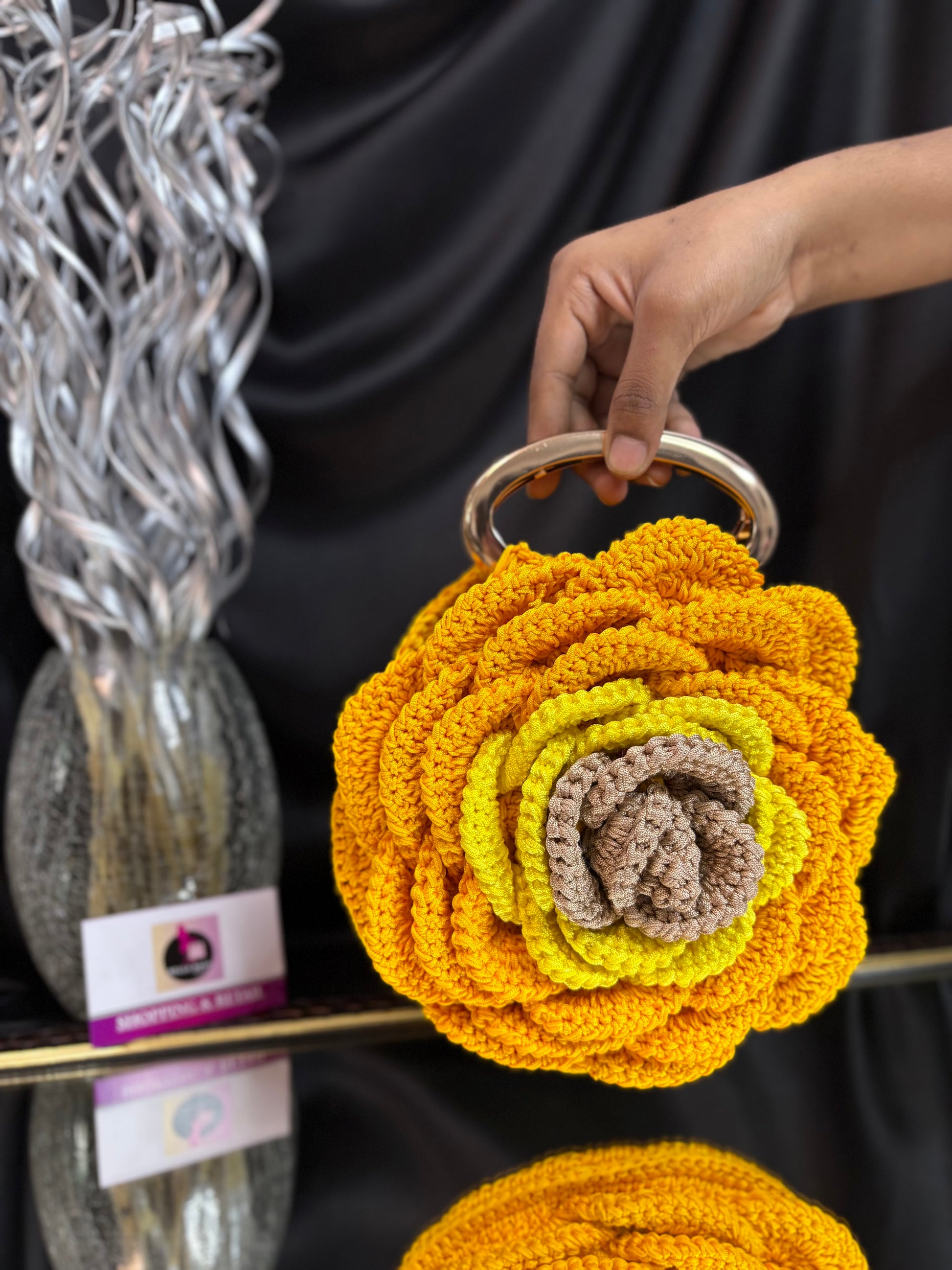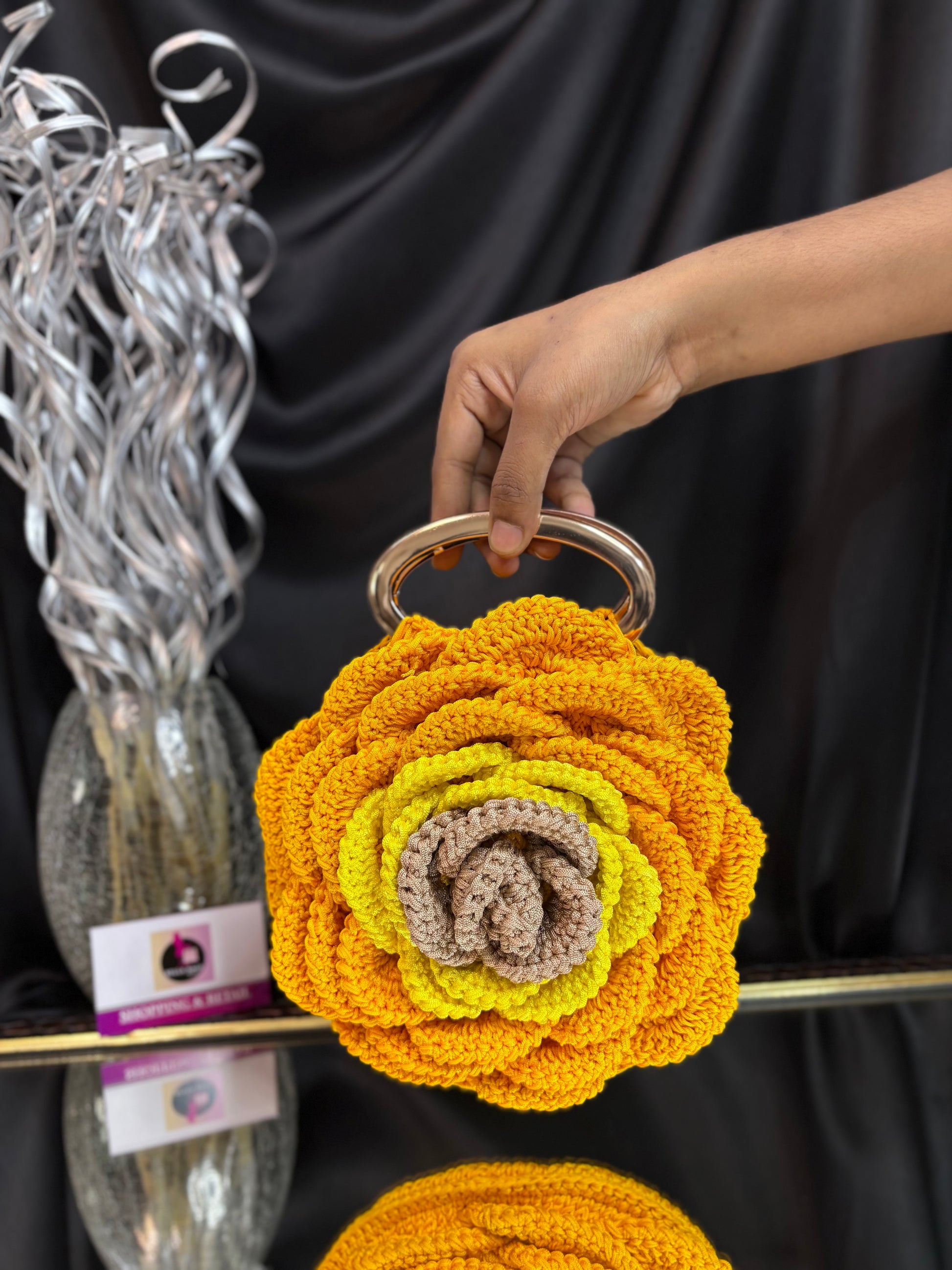 Bold and artistic floral handbag crafted with crochet petals in a rose motif, finished with a sleek metallic handle — a true statement accessory. Outer Material: crochet. Phone Capacity: Phone will fit in. Sling: comes with an attached handle. Closure: magnetic enclosure. Pocket: No Pocket. Care Instructions: Keep it in a protective space when not in use and keep it away from moisture. Carry delicately!.