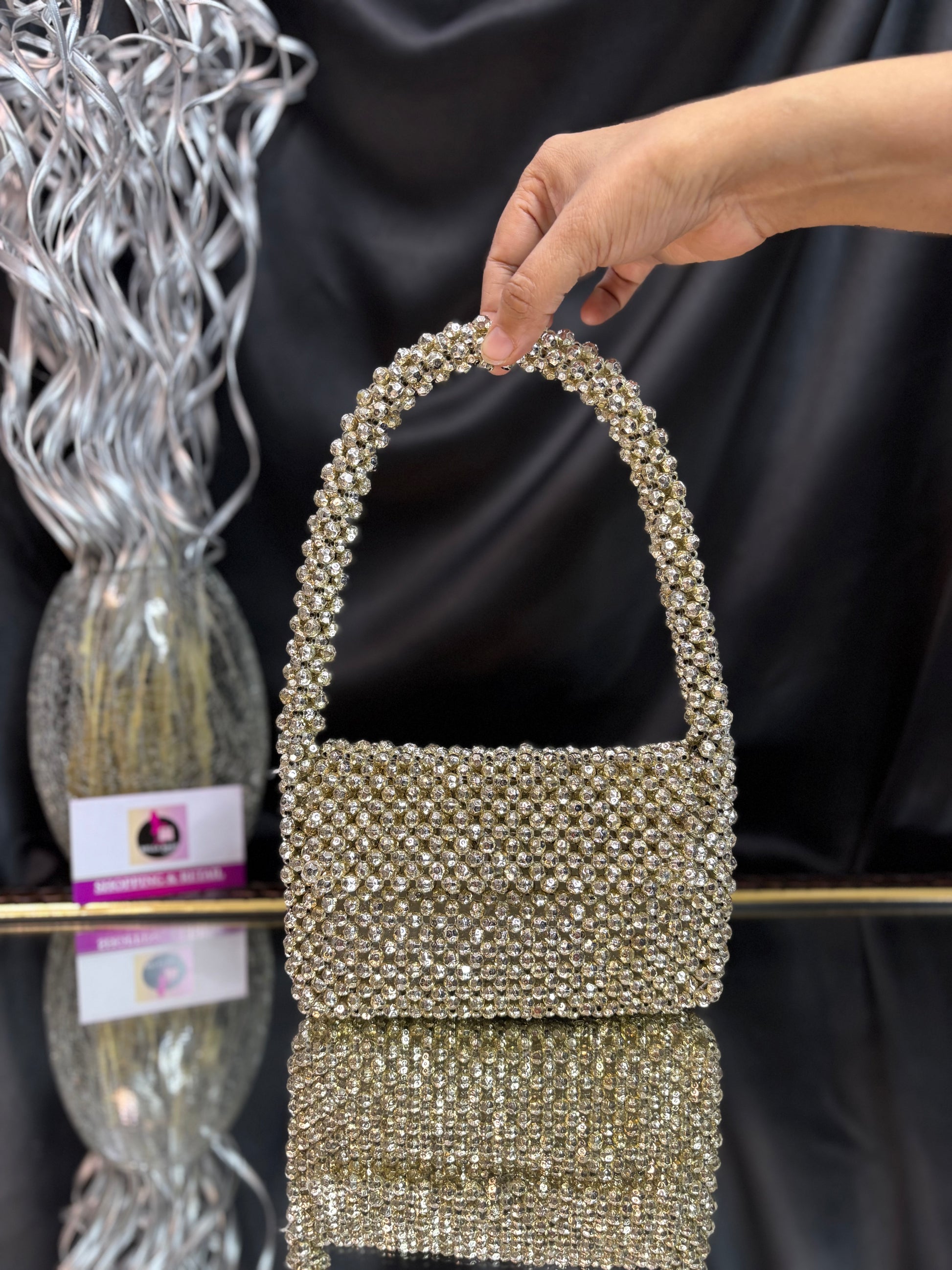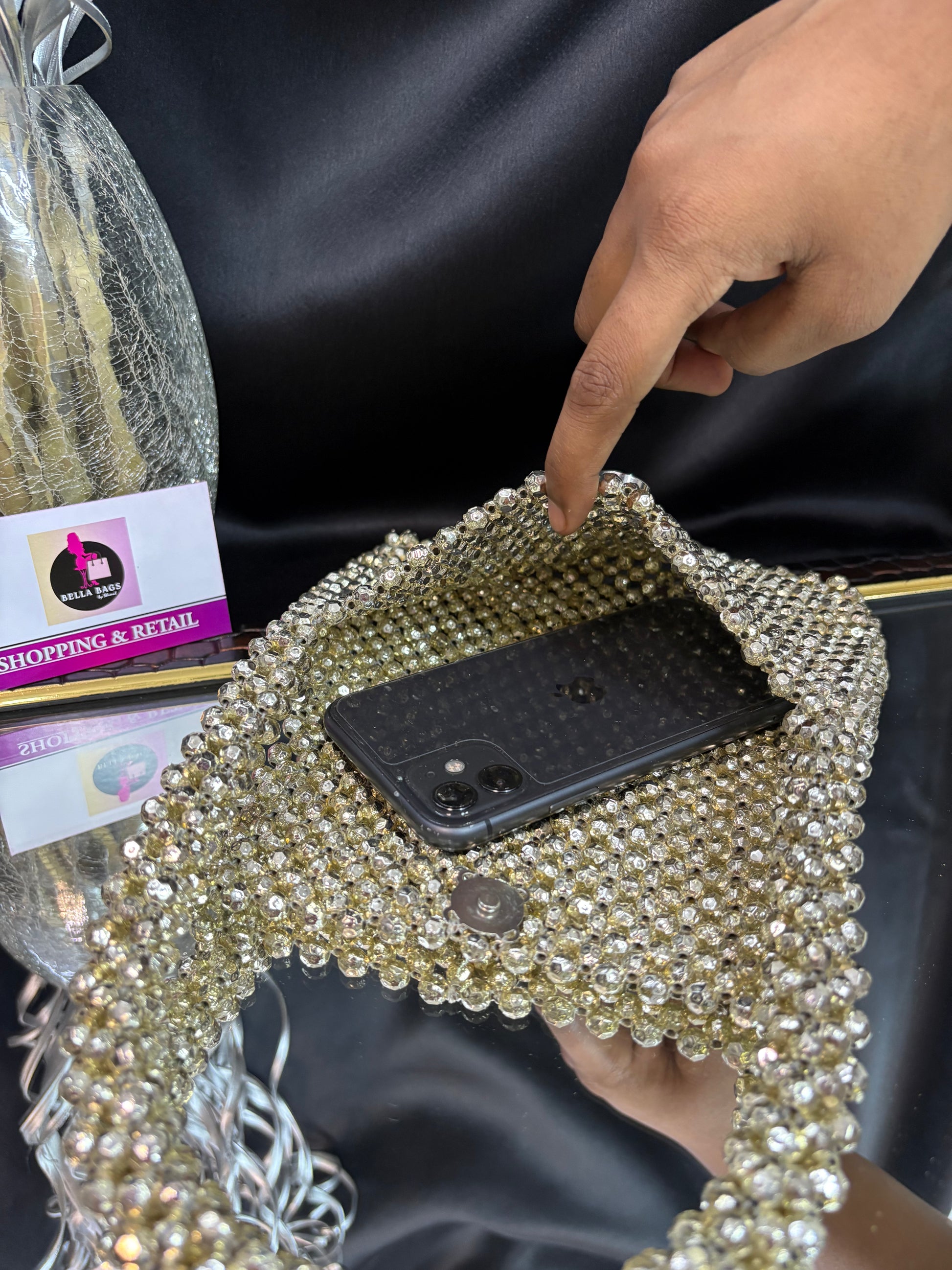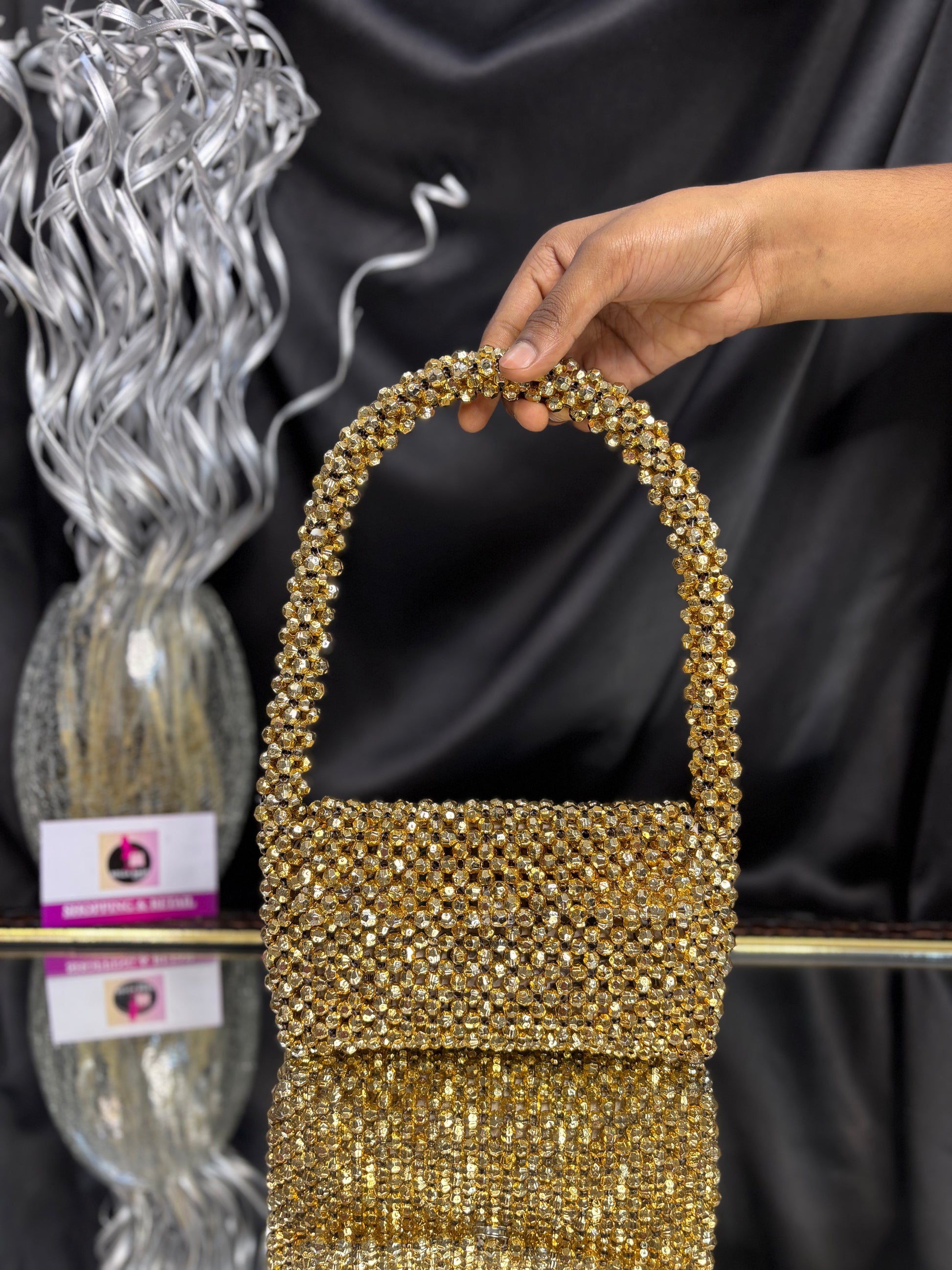 This sparkly beaded bag with hand-stitched beads is perfect for weddings and parties. It has a magnetic closure and fits your phone and small essentials. It can also be carried on your shoulder. Outer Material: premium beads. Phone Capacity: Phone fits in. Sling: no sling chain. Closure: magnetic closure. Pocket: No Pocket. Care Instructions: Keep it in a protective space when not in use and keep it away from moisture. Carry delicately!