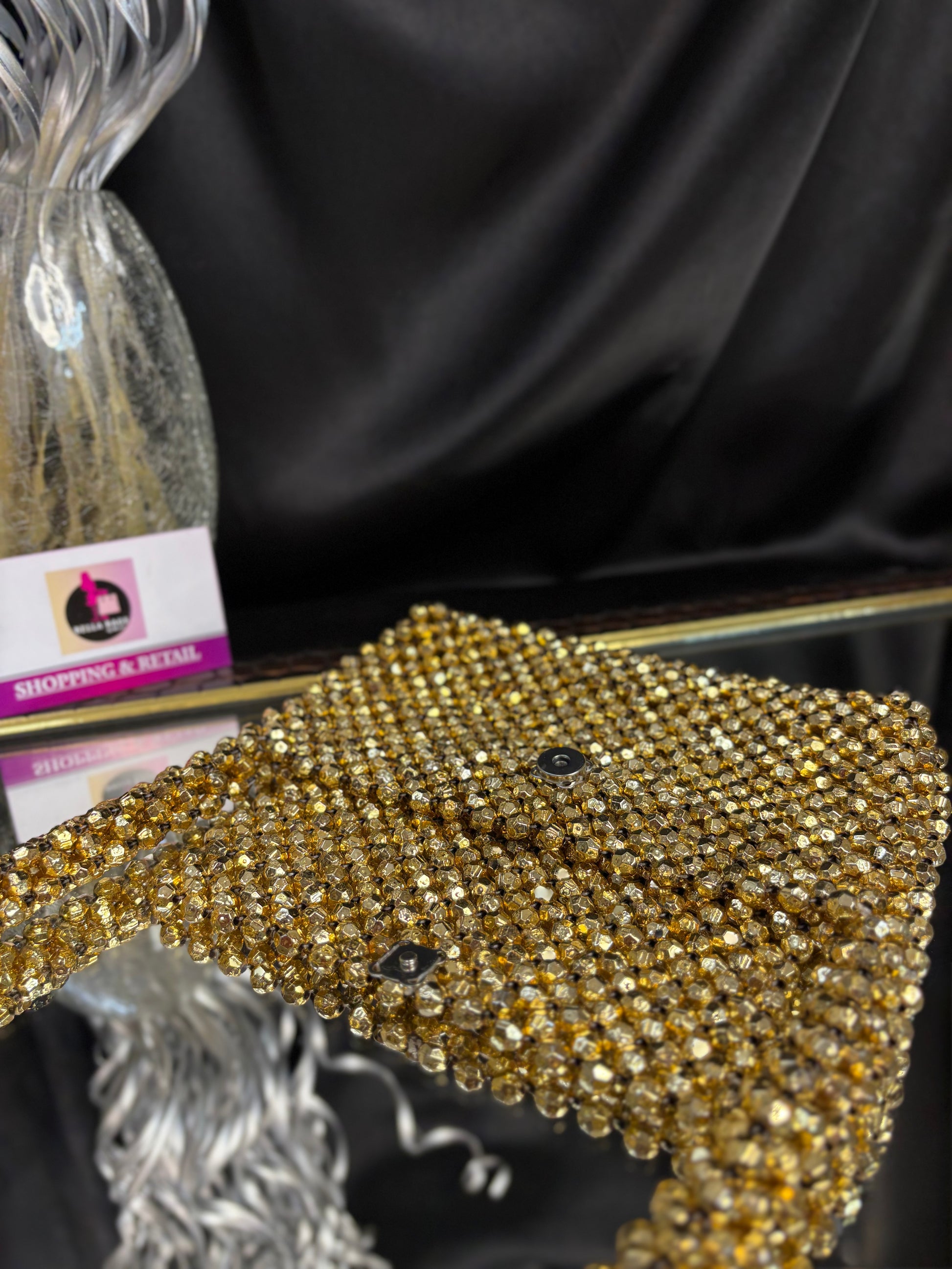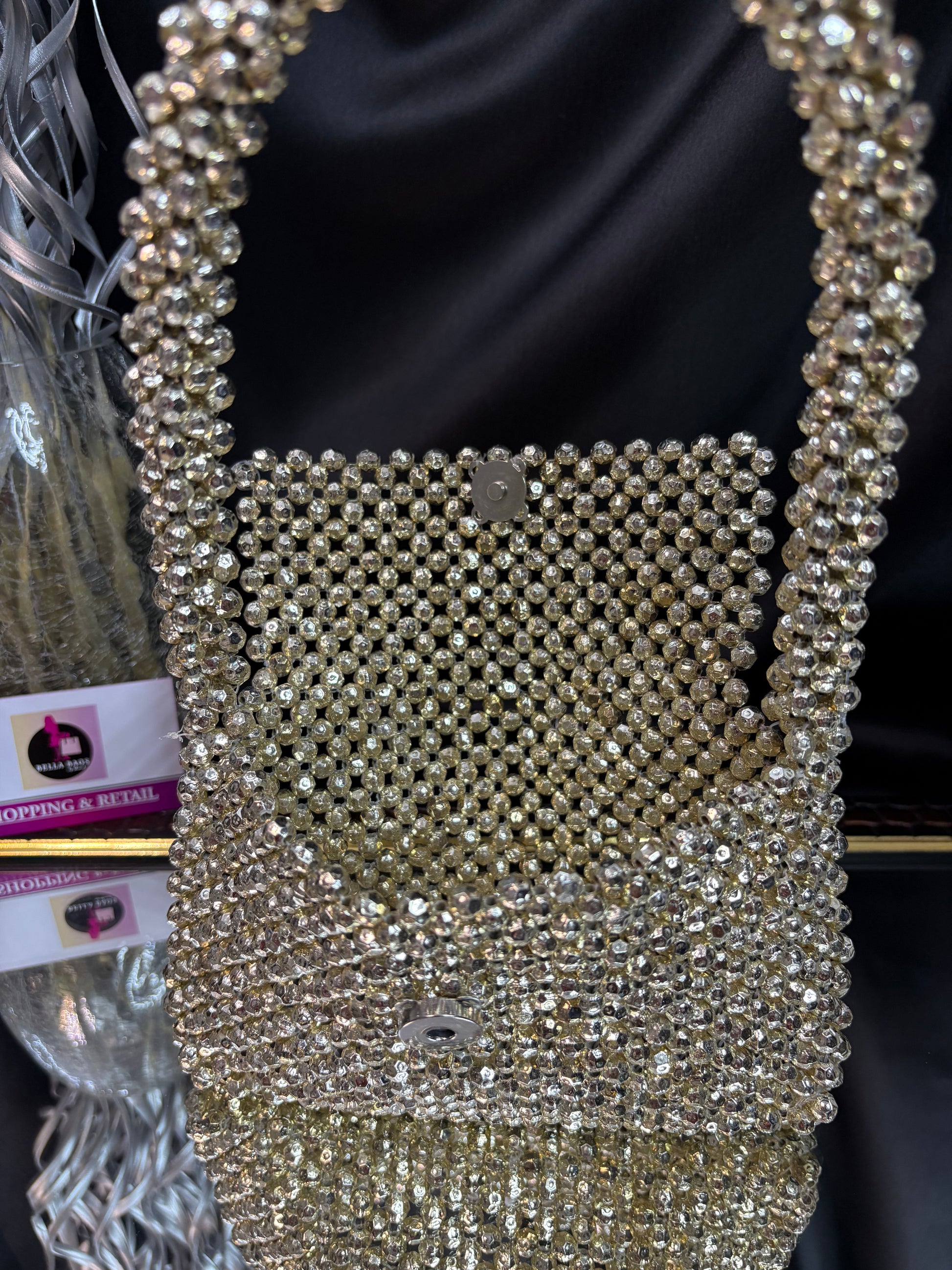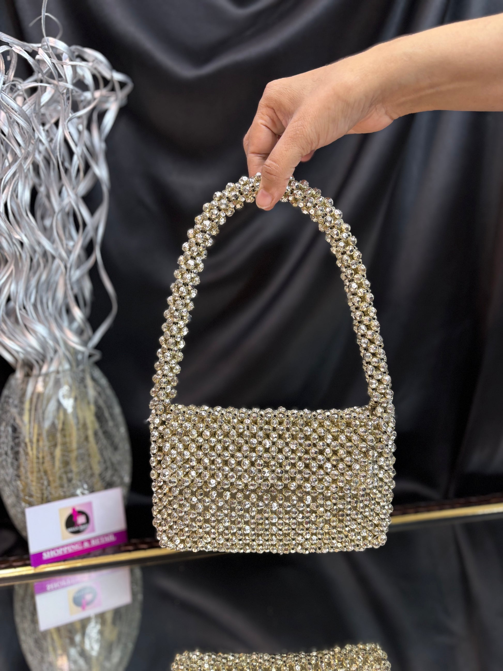 This sparkly beaded bag with hand-stitched beads is perfect for weddings and parties. It has a magnetic closure and fits your phone and small essentials. It can also be carried on your shoulder. Outer Material: premium beads. Phone Capacity: Phone fits in. Sling: no sling chain. Closure: magnetic closure. Pocket: No Pocket. Care Instructions: Keep it in a protective space when not in use and keep it away from moisture. Carry delicately!