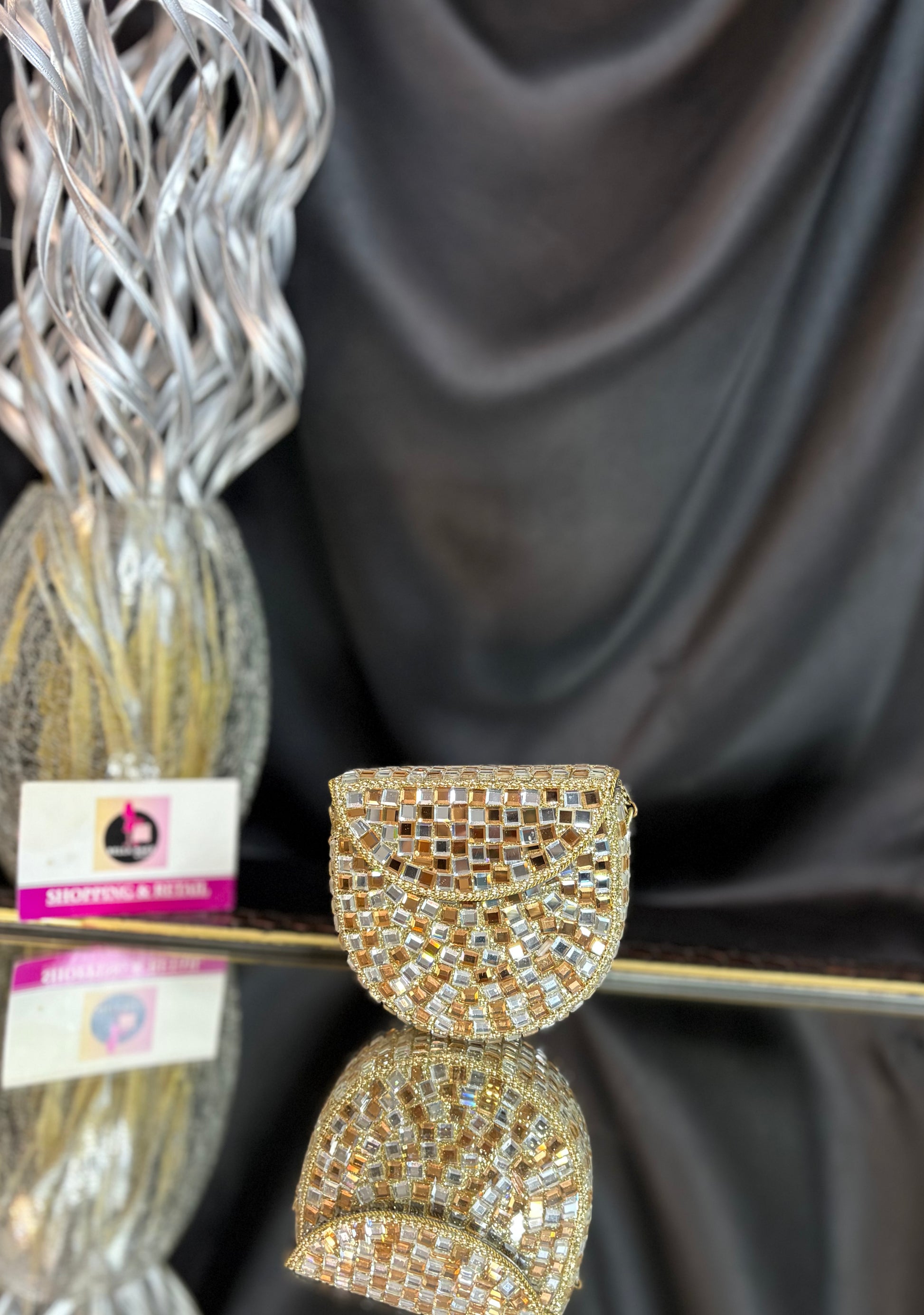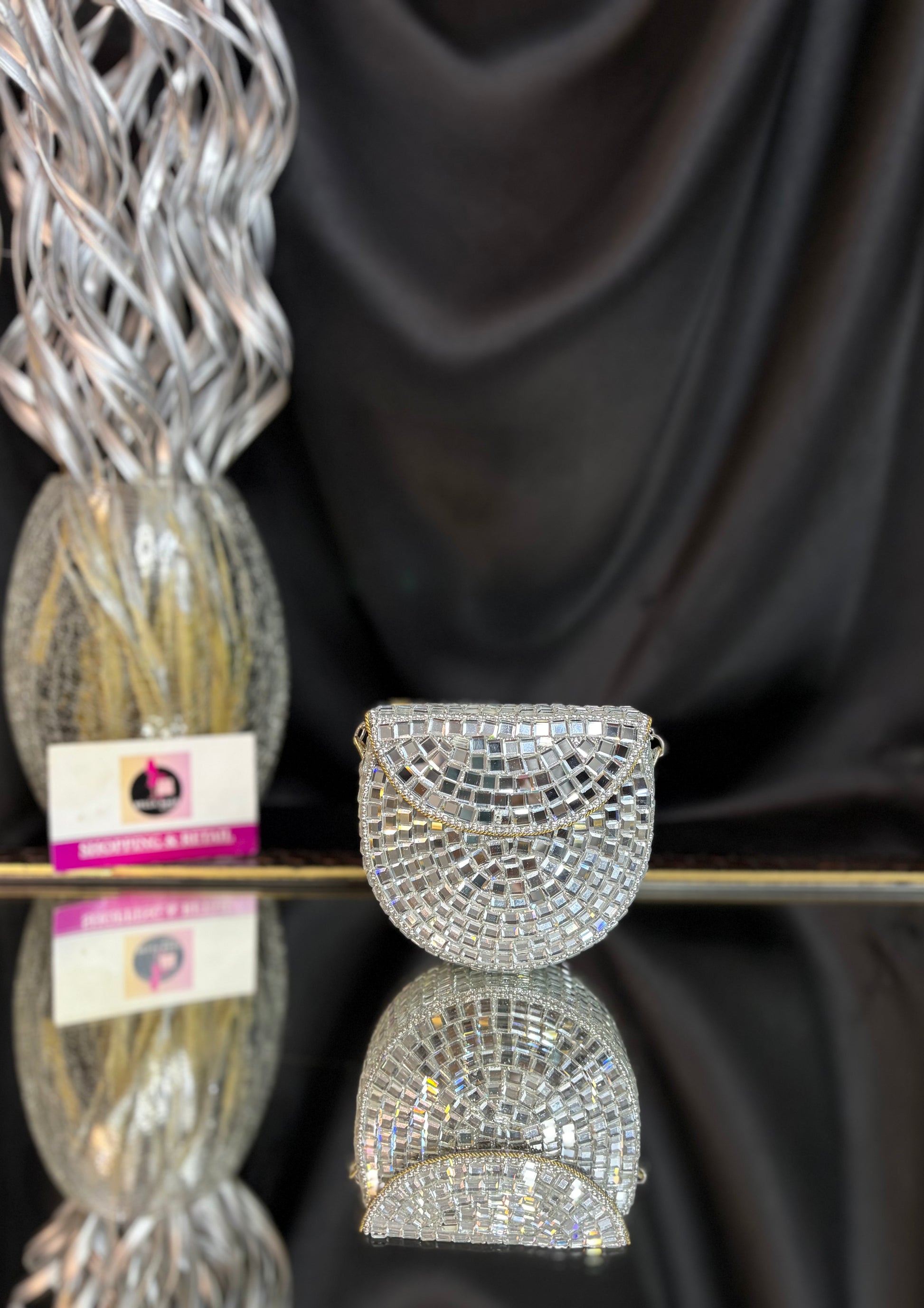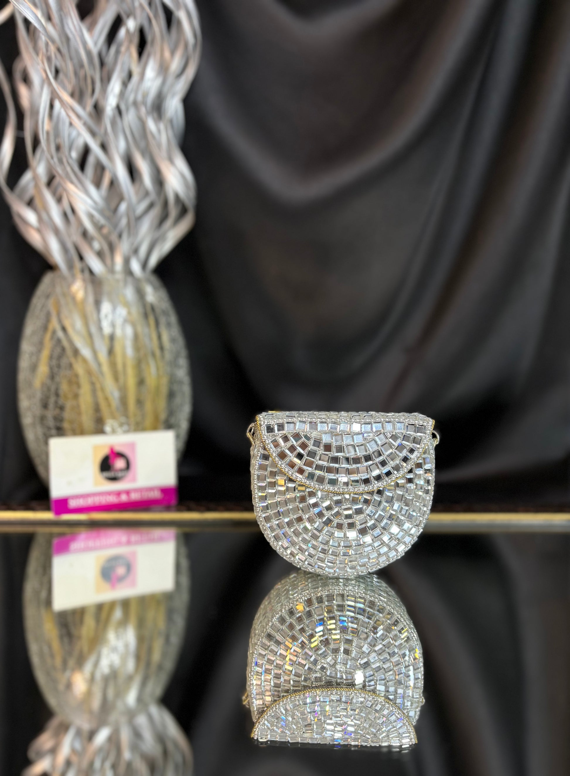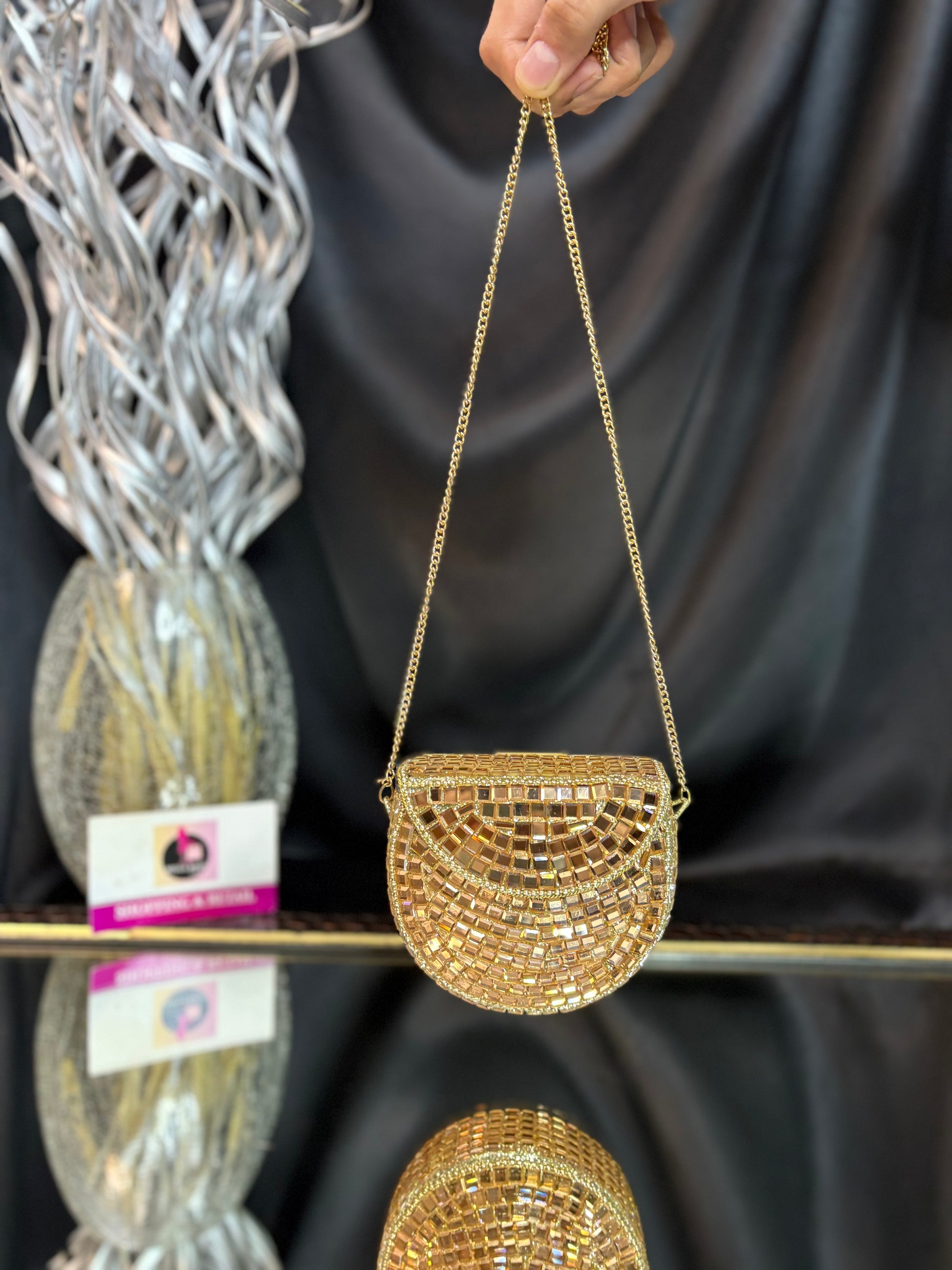 Shimmer queen energy only -this clutch does the talking, so you don’t have to. Delicate mosaic detailing and a graceful shape, perfect for modern festive elegance.