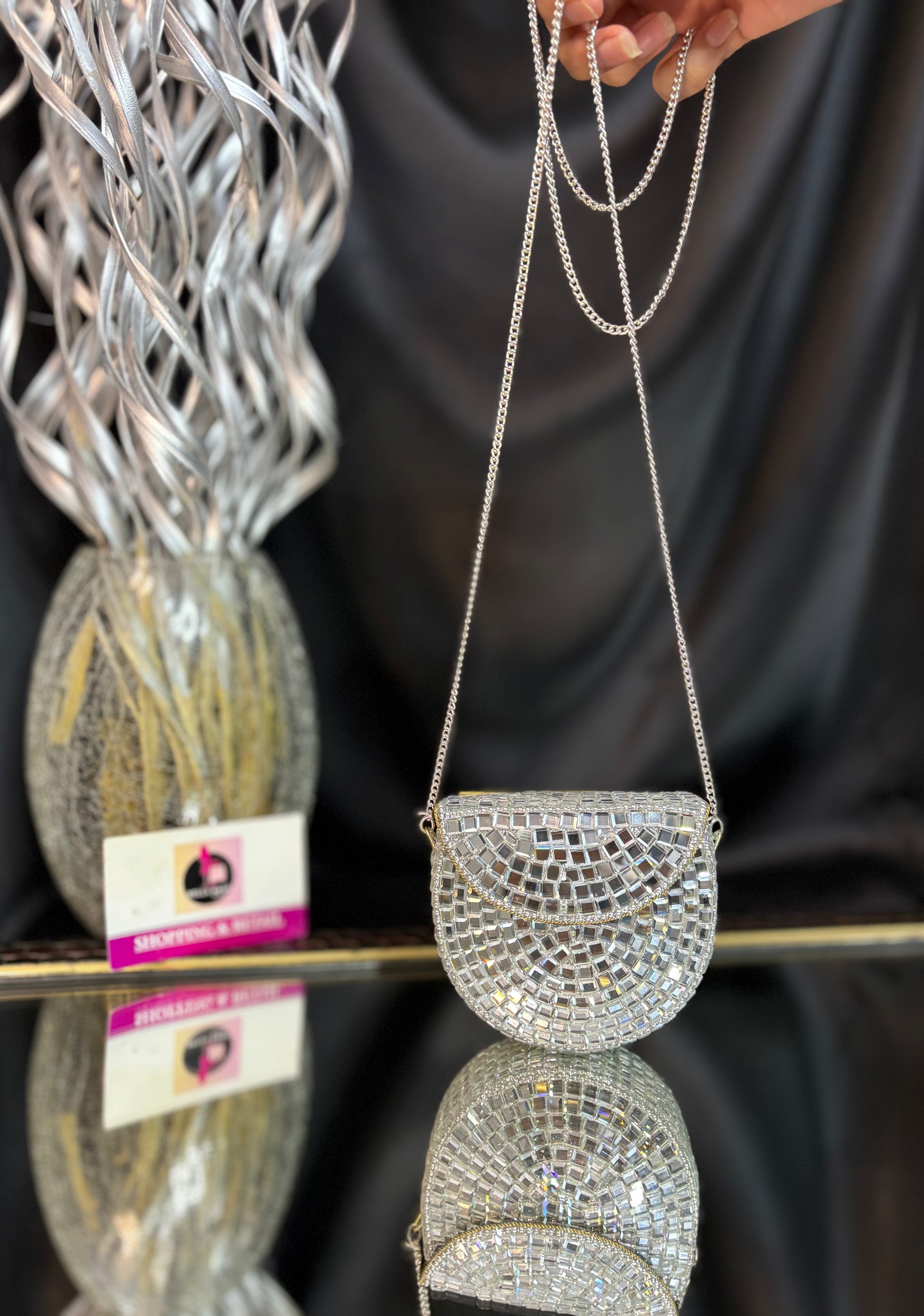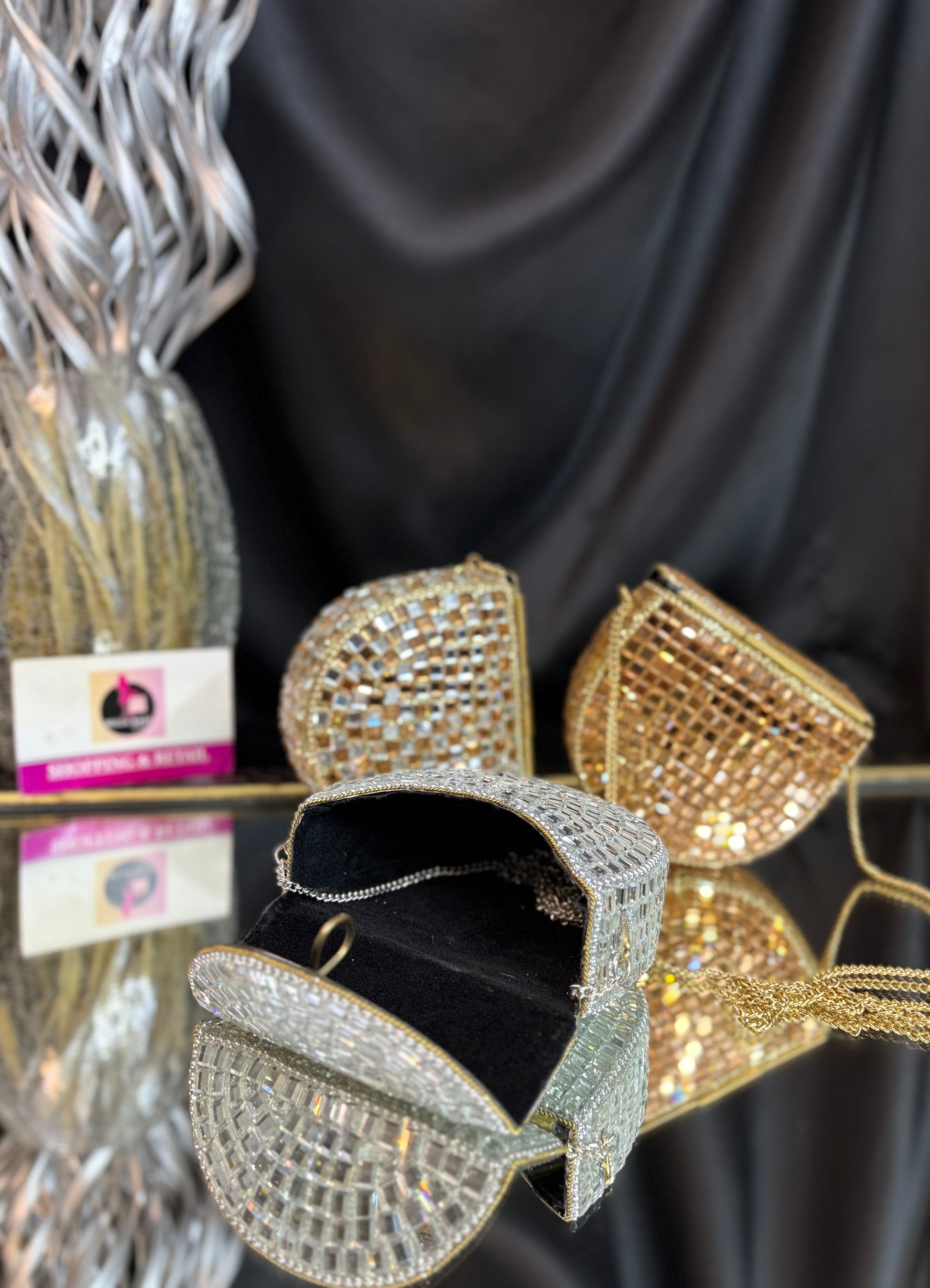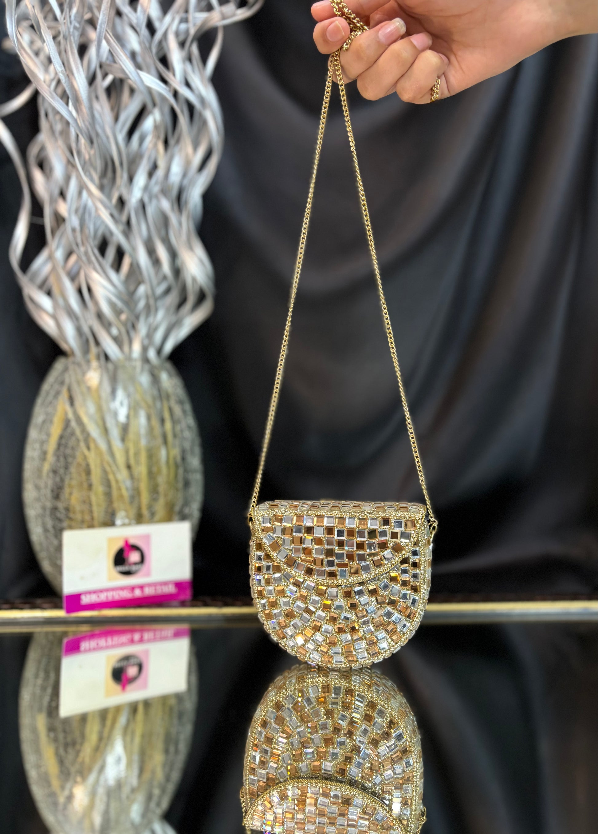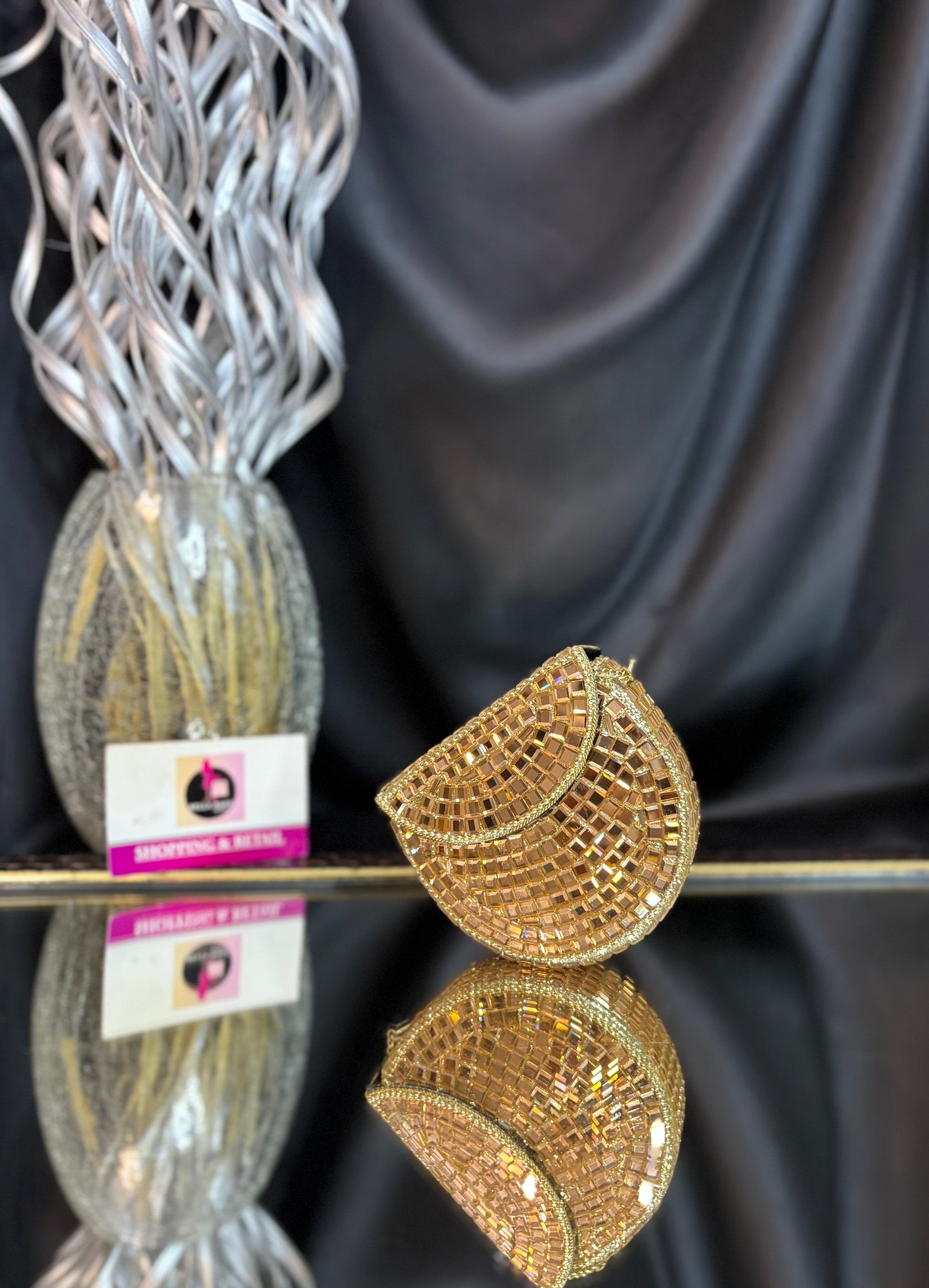 Shimmer queen energy only -this clutch does the talking, so you don’t have to. Delicate mosaic detailing and a graceful shape, perfect for modern festive elegance.