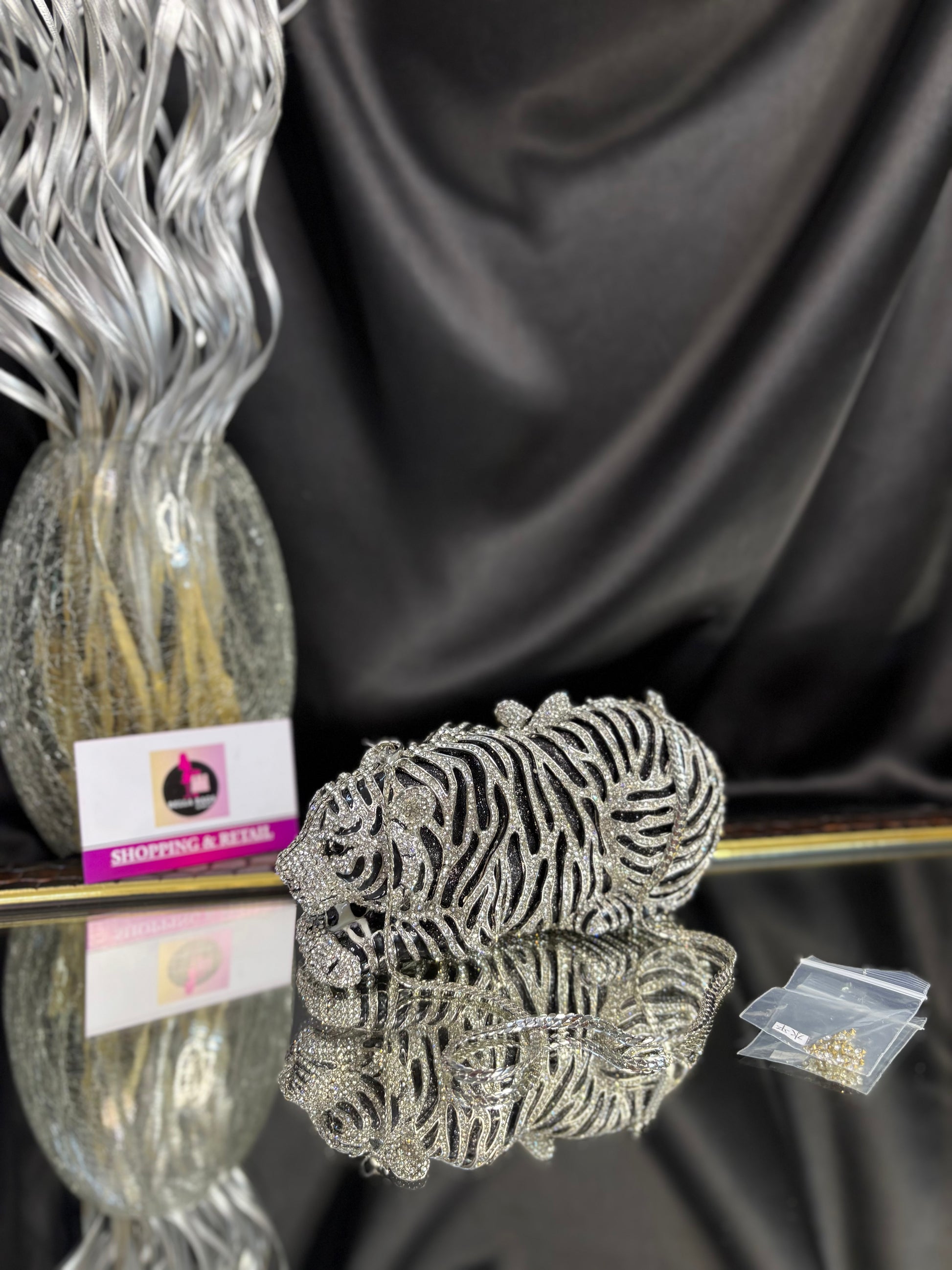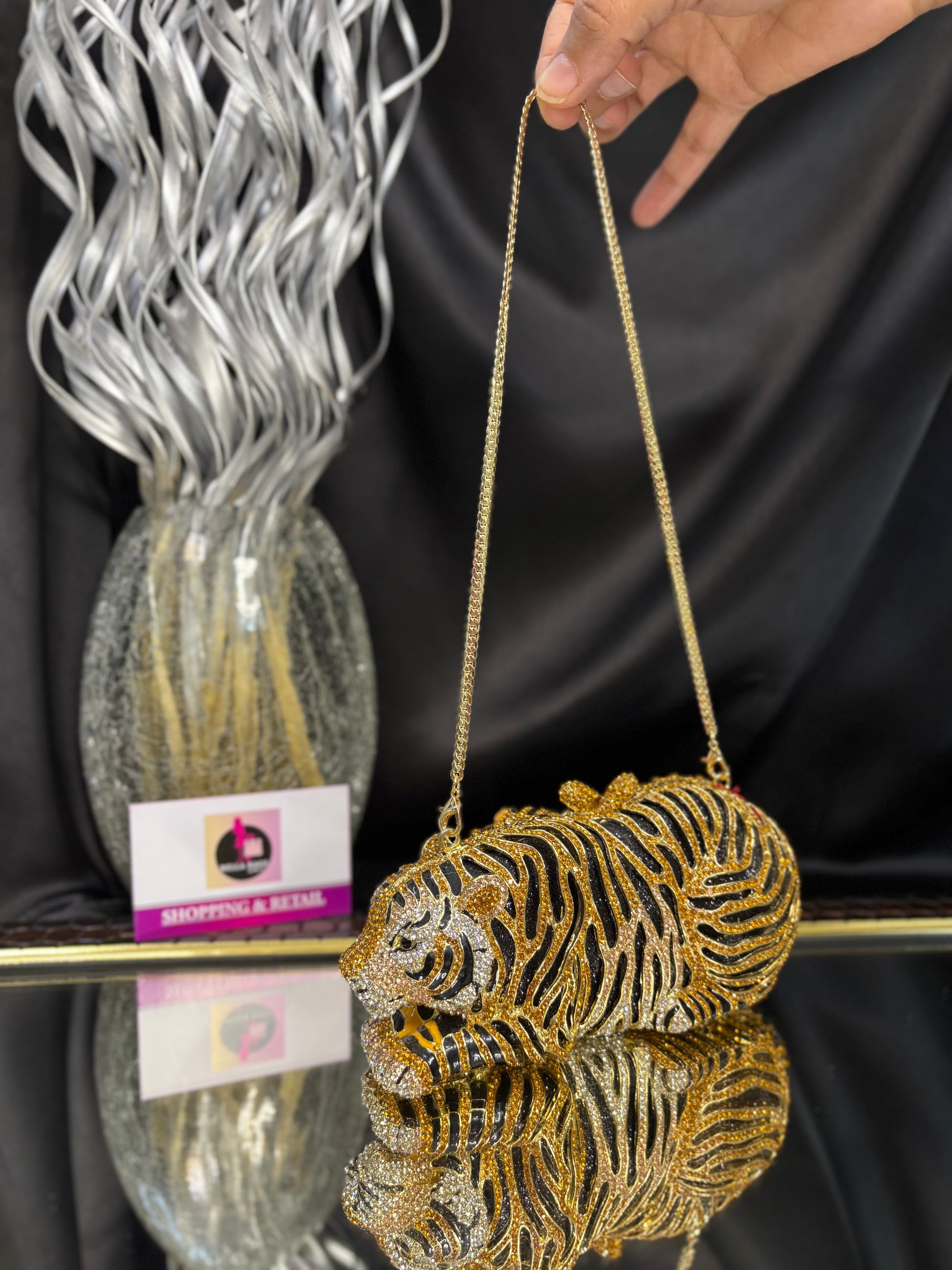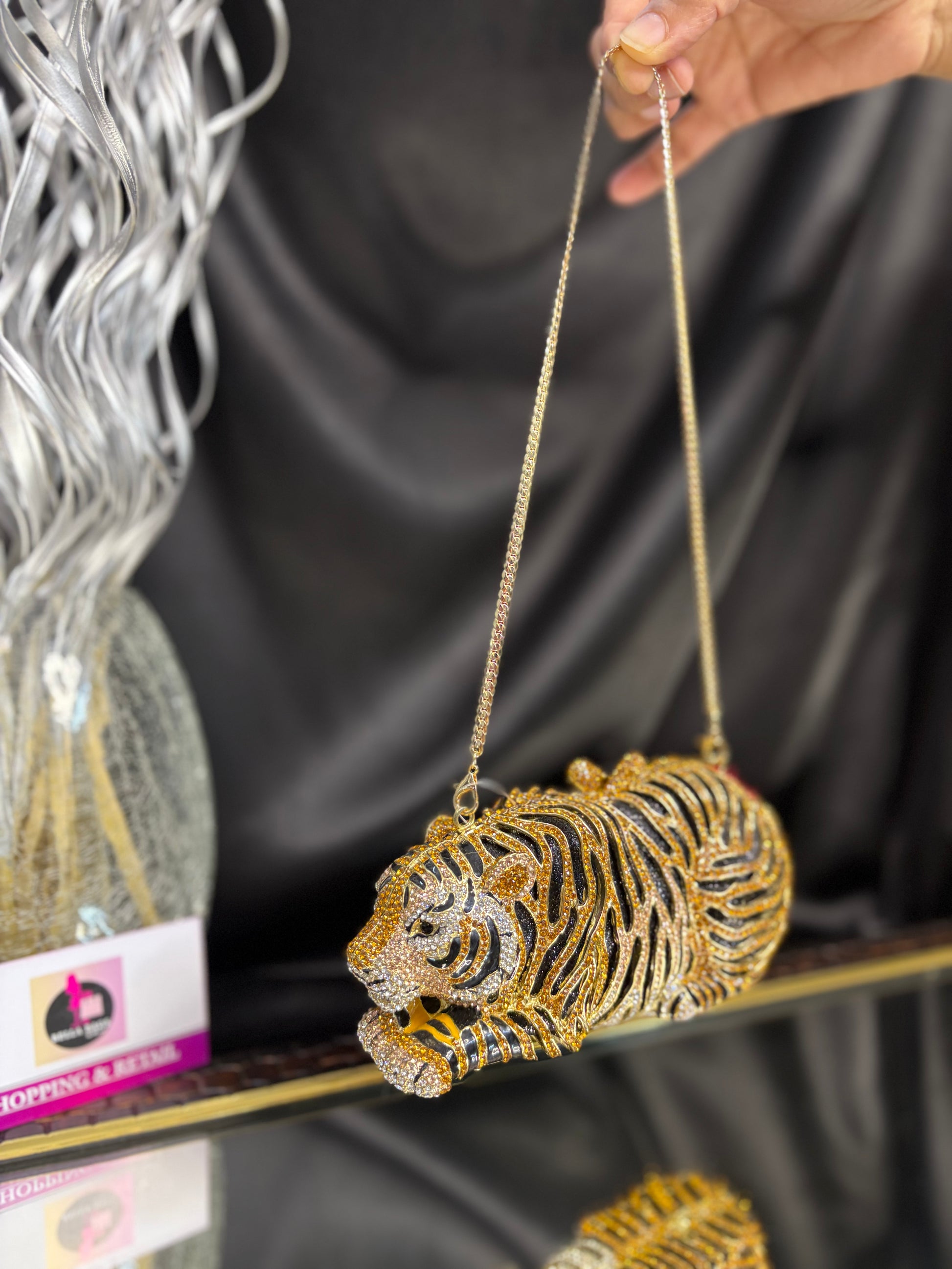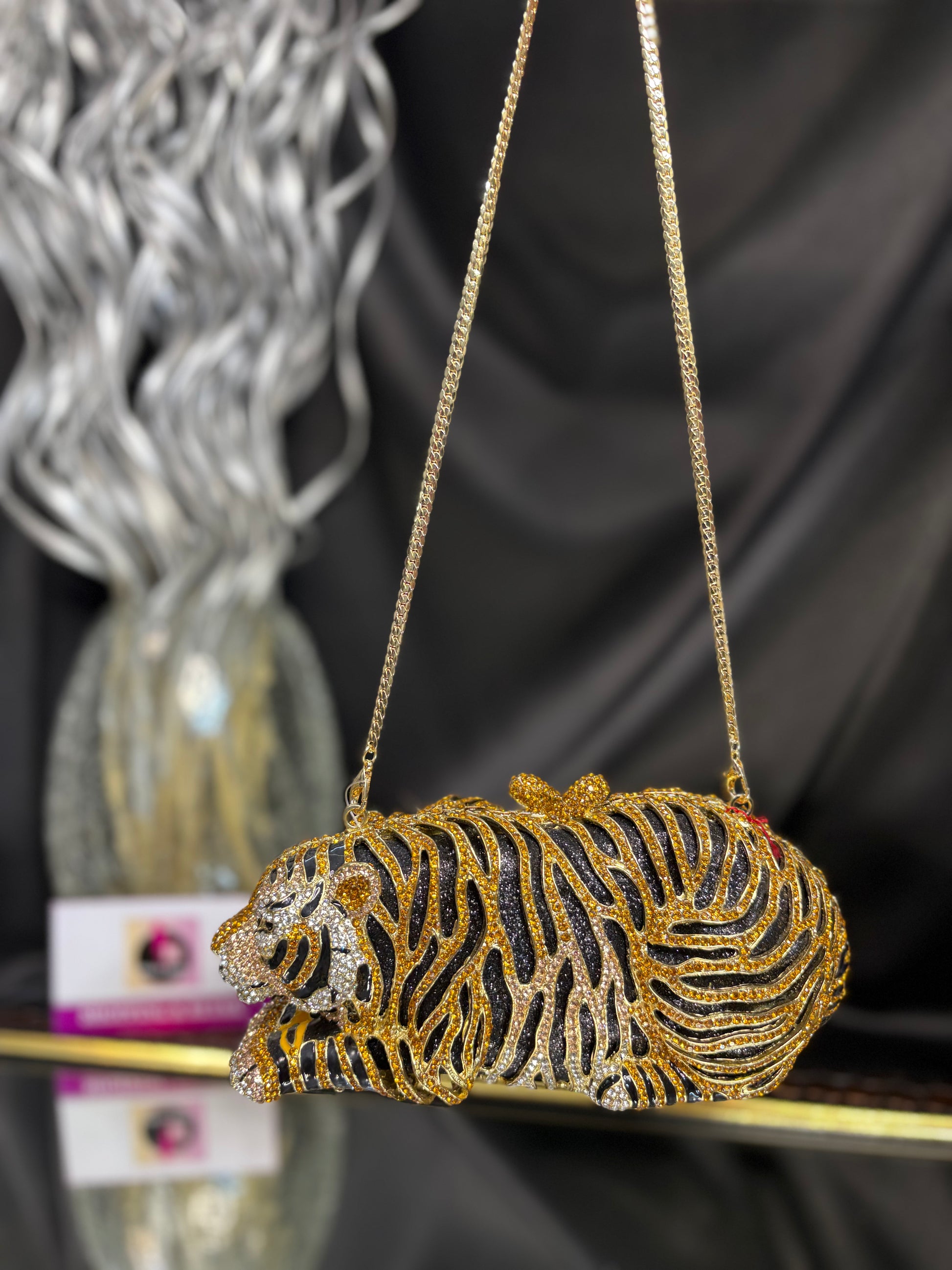 Carry your evening essentials in style with our sitting tiger Crystal Clutch. The bold shape and sparkling crystals make it an eye-catching accessory. This clutch is perfect for special occasions and will add a touch of elegance to any outfit. sling; comes with a sling chain. closure; magnetic closure, crystals; few extra crystals provided. space; fits in essentials, phone won't fit in