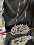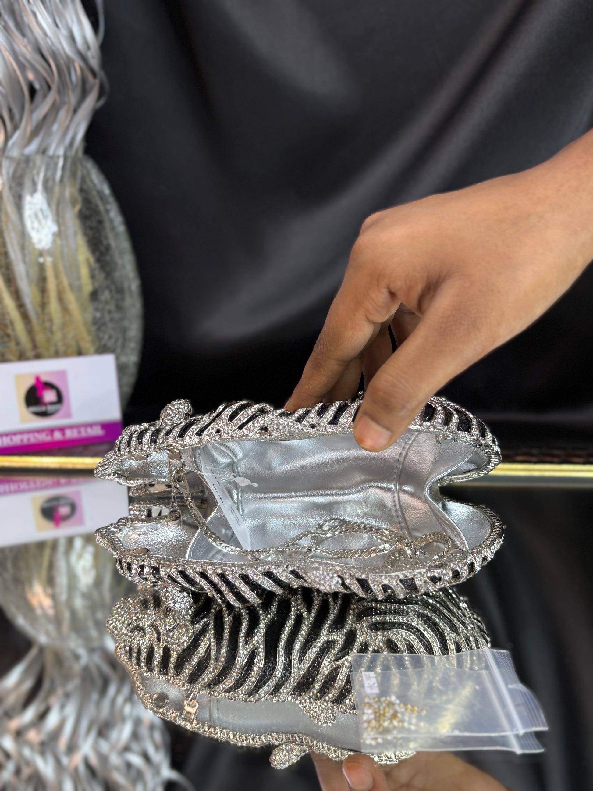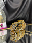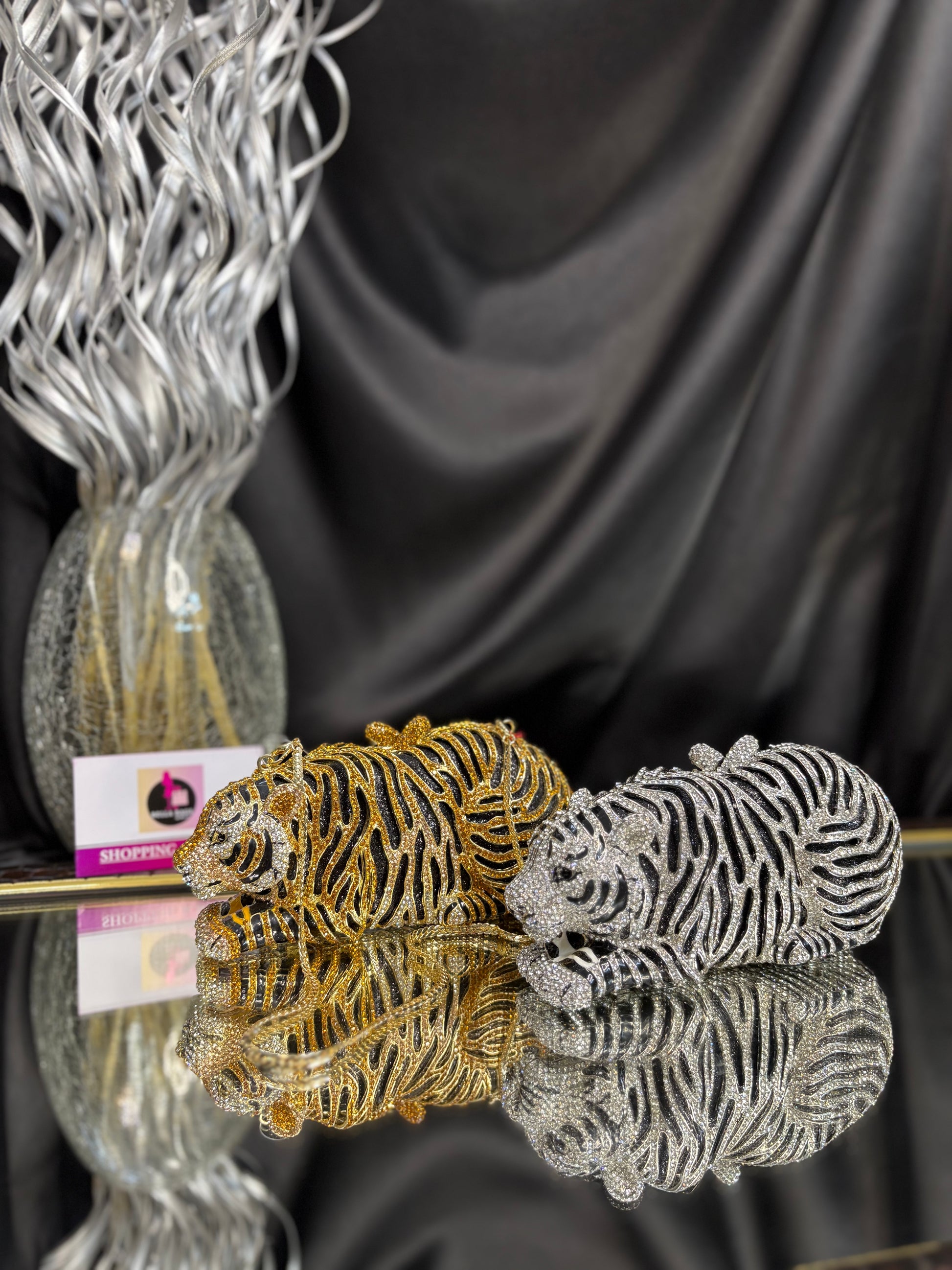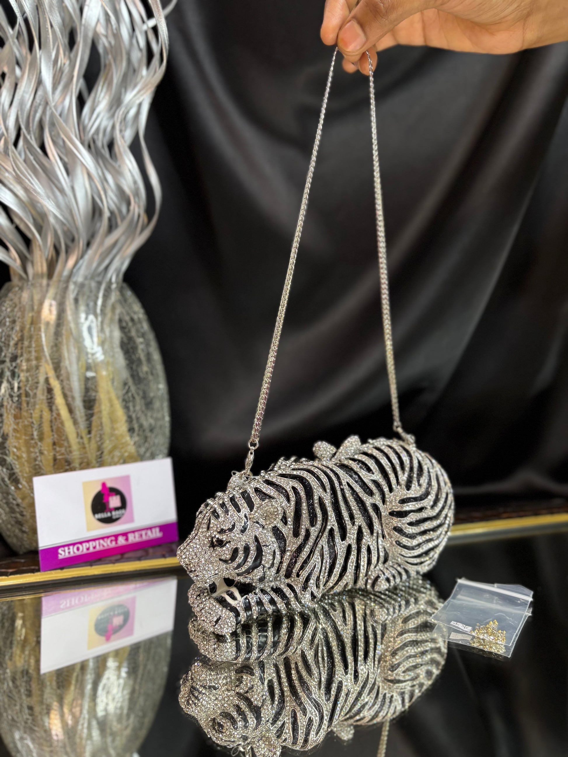 Carry your evening essentials in style with our sitting tiger Crystal Clutch. The bold shape and sparkling crystals make it an eye-catching accessory. This clutch is perfect for special occasions and will add a touch of elegance to any outfit. sling; comes with a sling chain. closure; magnetic closure, crystals; few extra crystals provided. space; fits in essentials, phone won't fit in