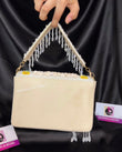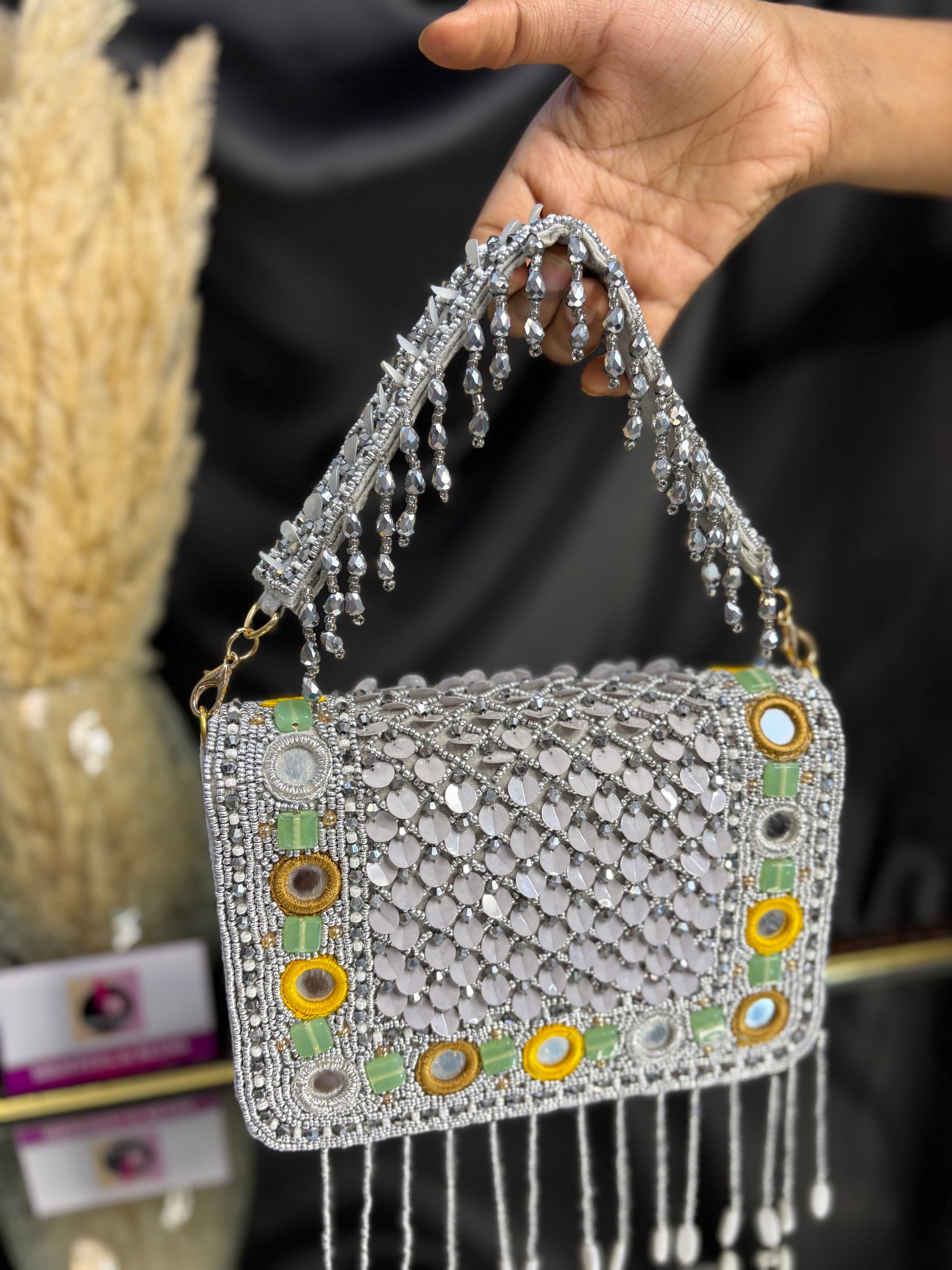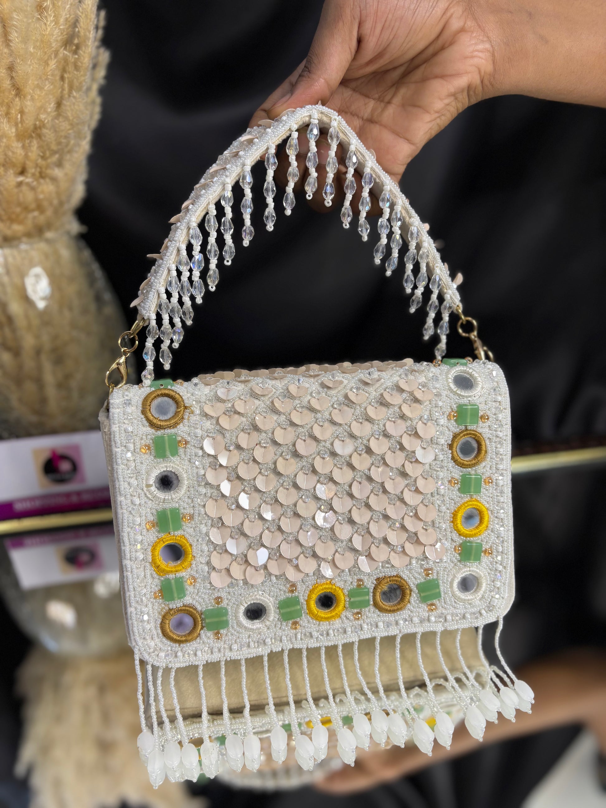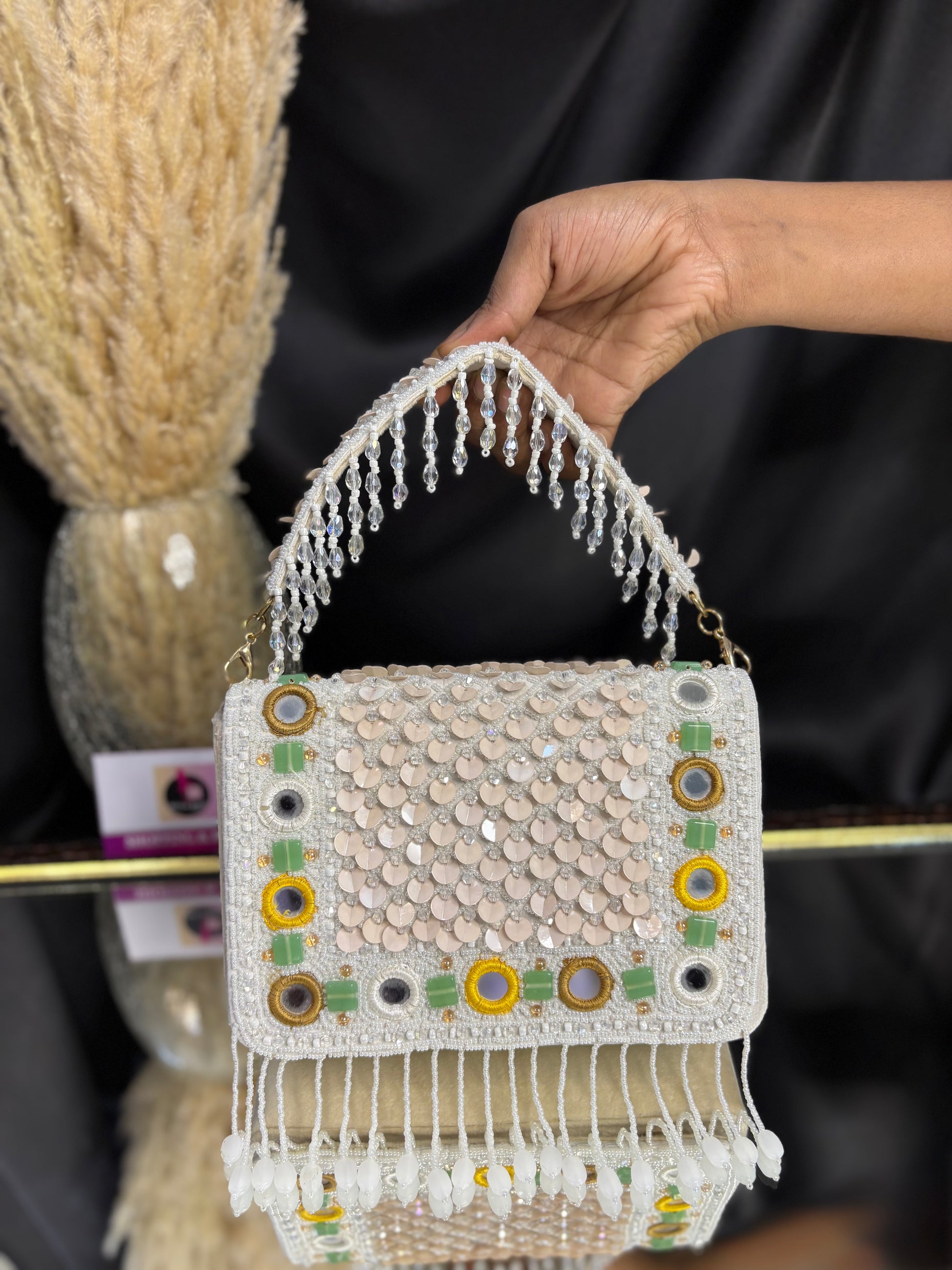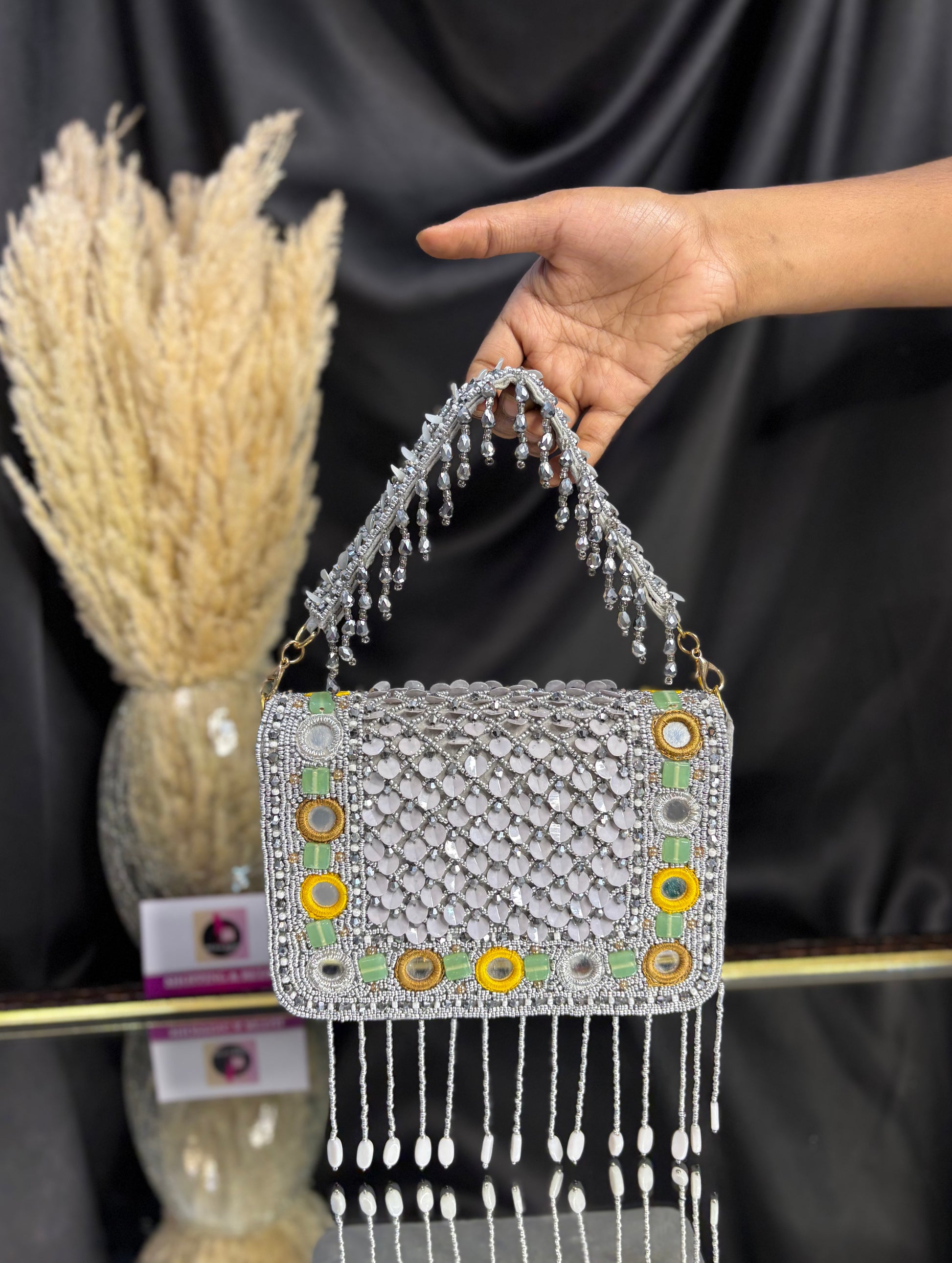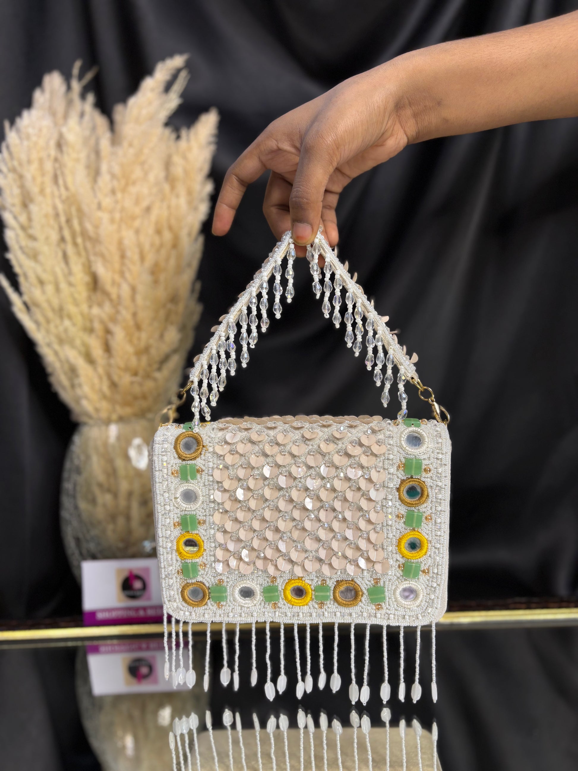 This handcrafted flap bag features intricate beadwork with colourful accents, mirror detailing, and elegant hanging tassels. Its festive and ethnic vibe makes it perfect for weddings, traditional outfits, and special celebrations. Outer Material: beadwork, mirror detailing, and elegant hanging tassels. Phone Capacity: Phone will fit in. Sling: Comes with a detachable handle. Closure: magnetic flap closure. Pocket: No Pocket. Care Instructions: Keep it in a protective space when not in use and keep it away from moisture. Carry delicately!