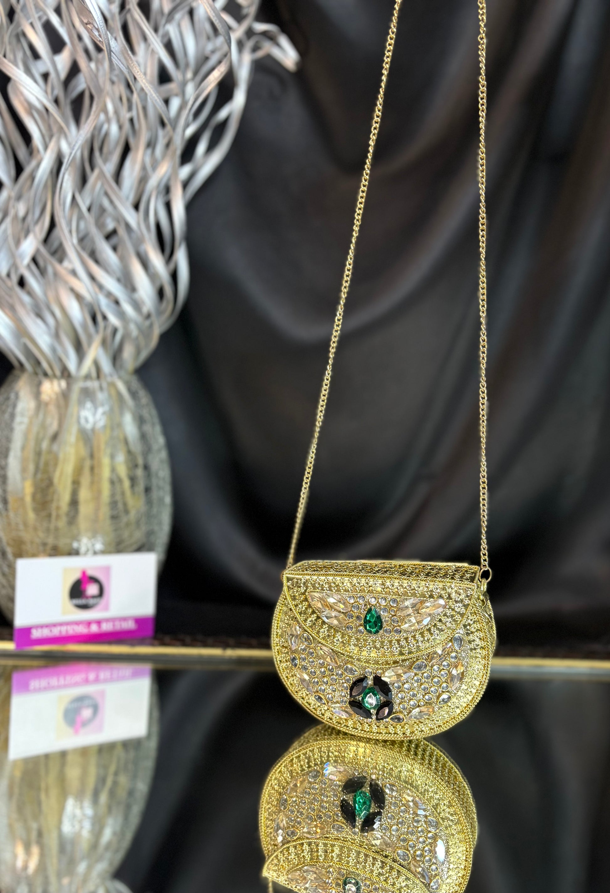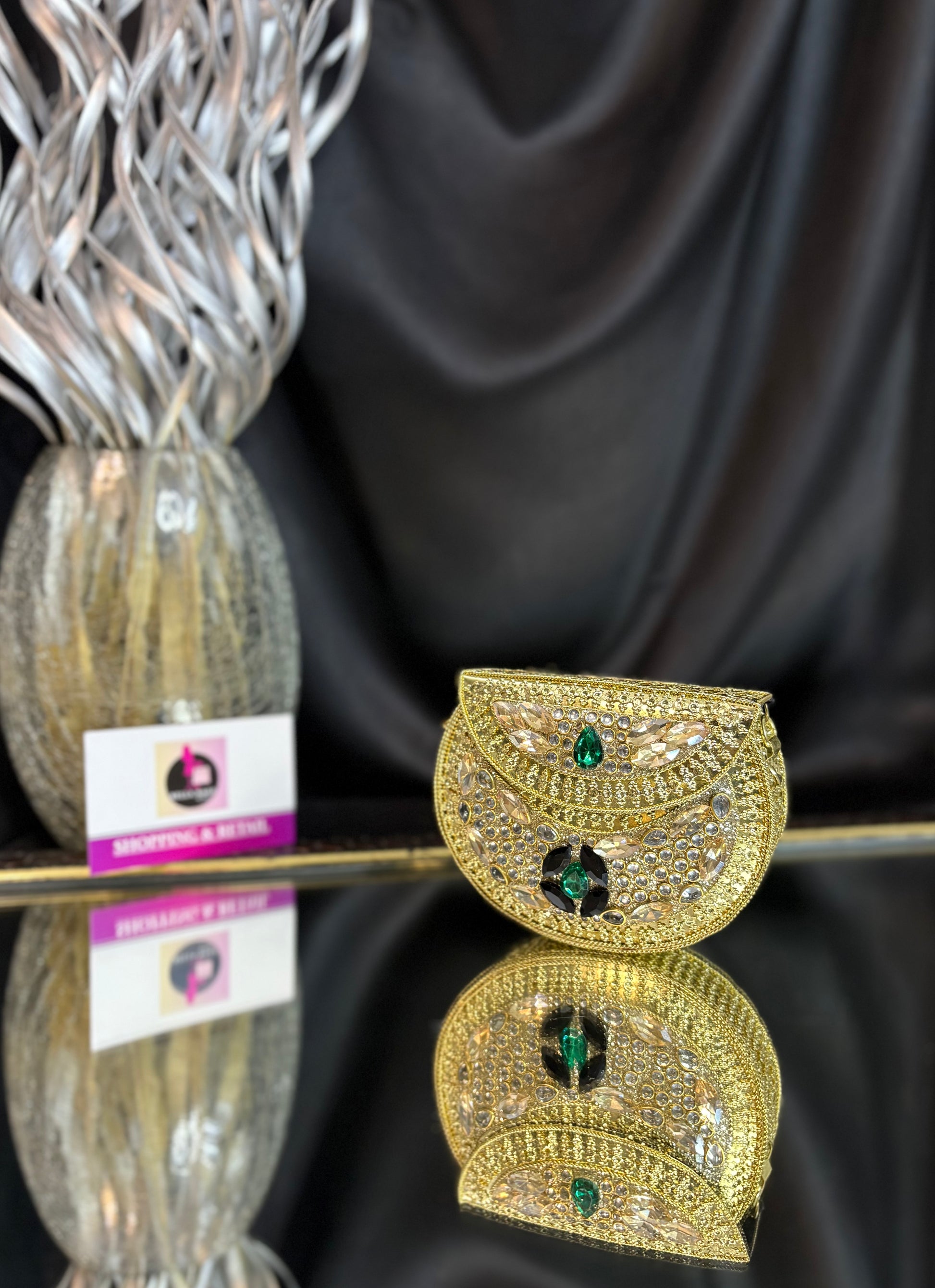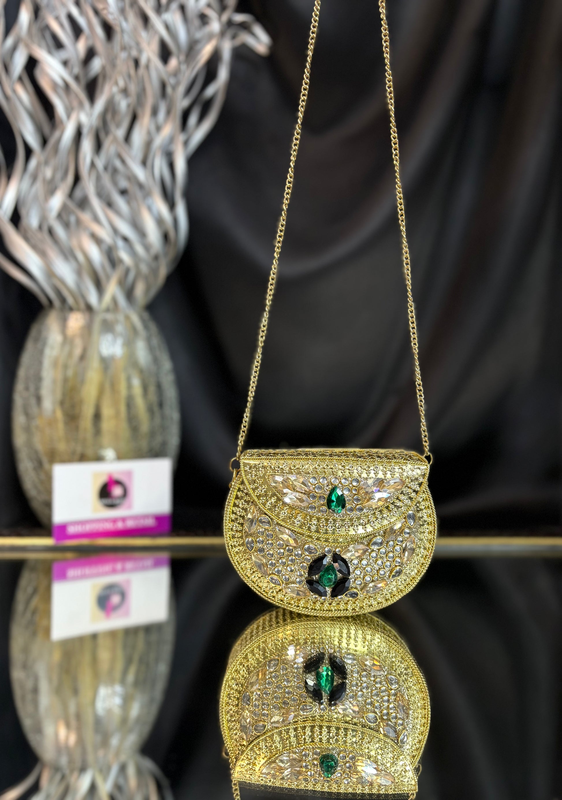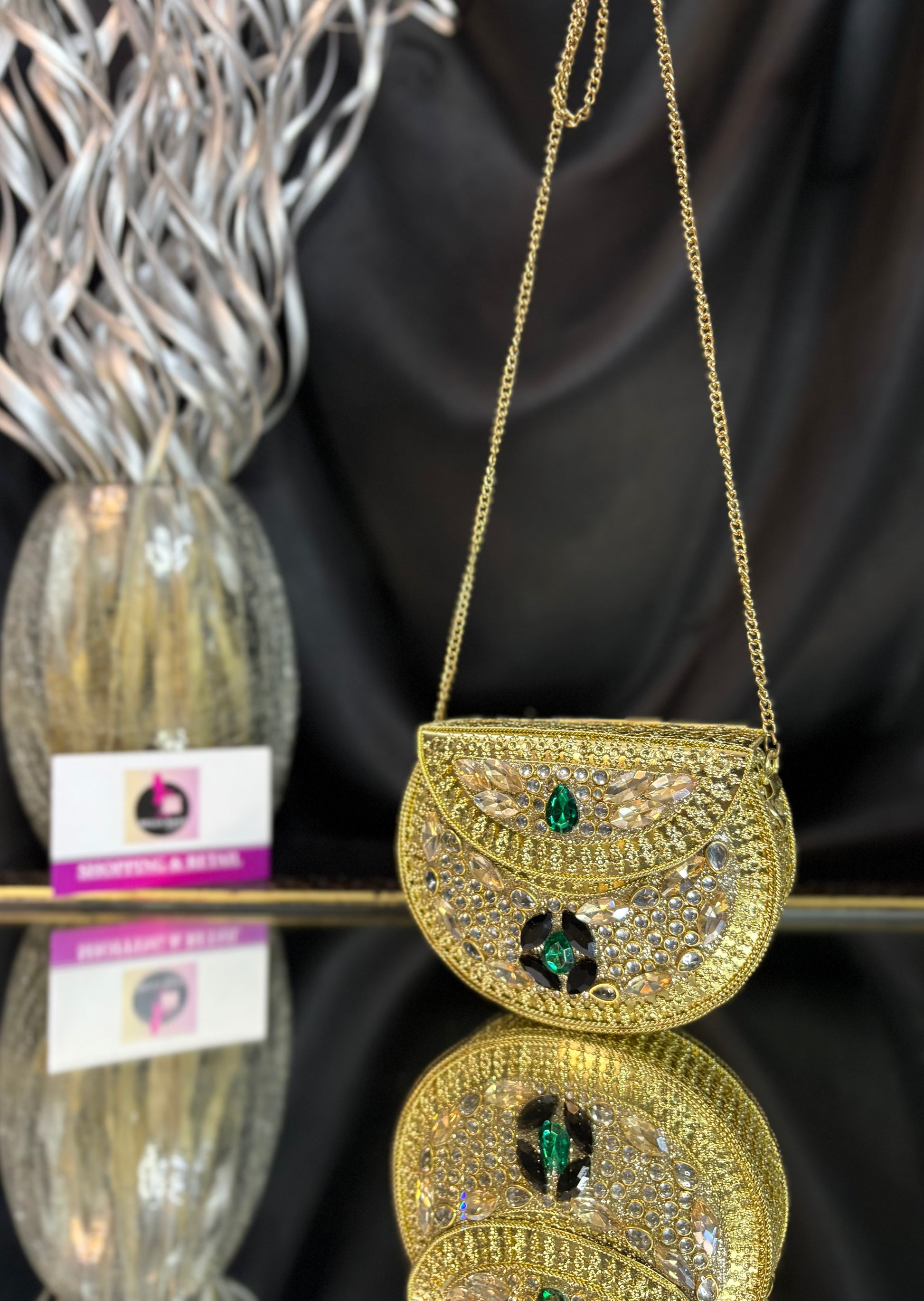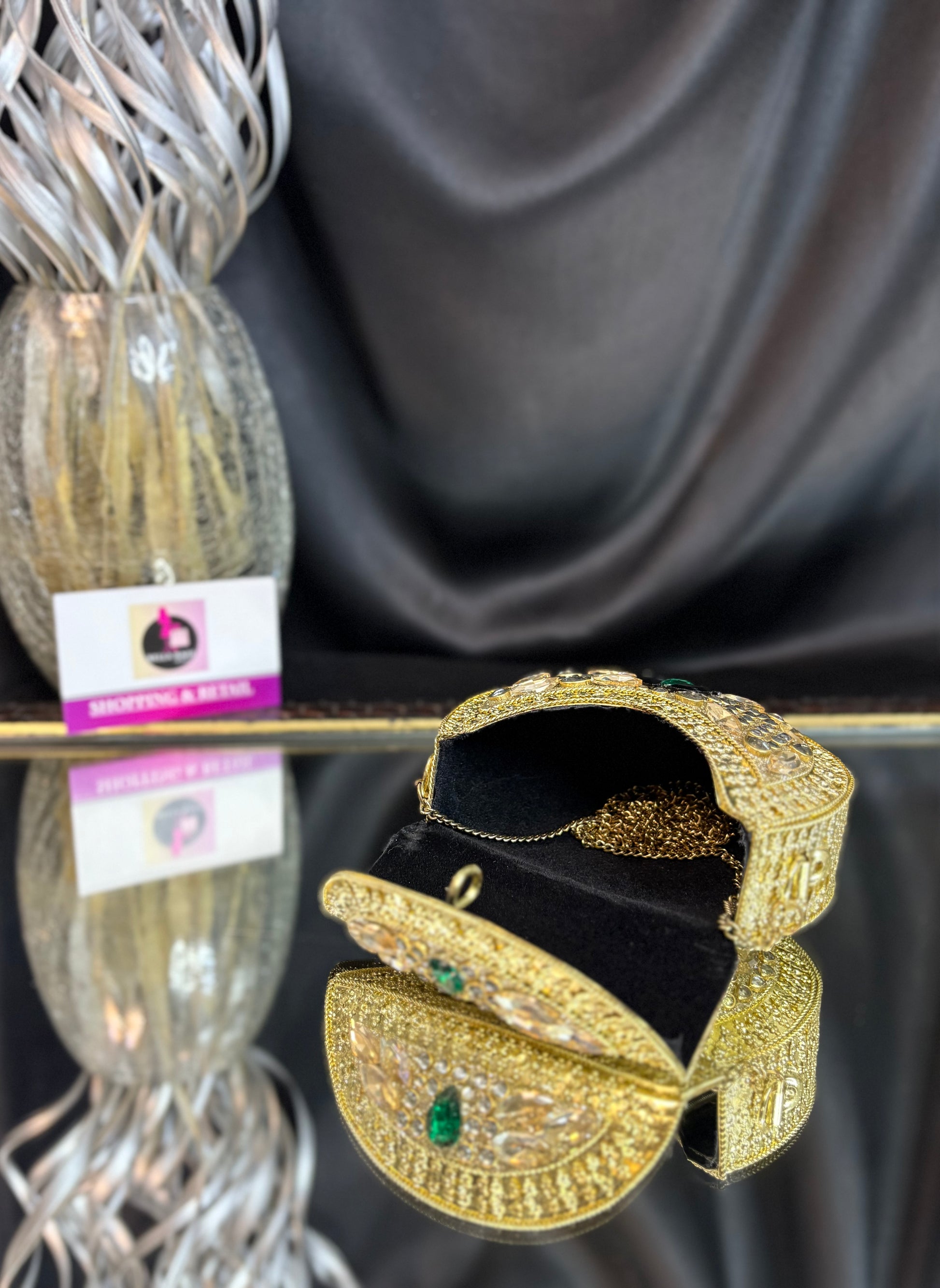 A luxe Kundan-studded mini clutch crafted to perfection. It features a gleaming gold chain that adds timeless charm to every outfit. Perfect for weddings, parties, and all things glam.